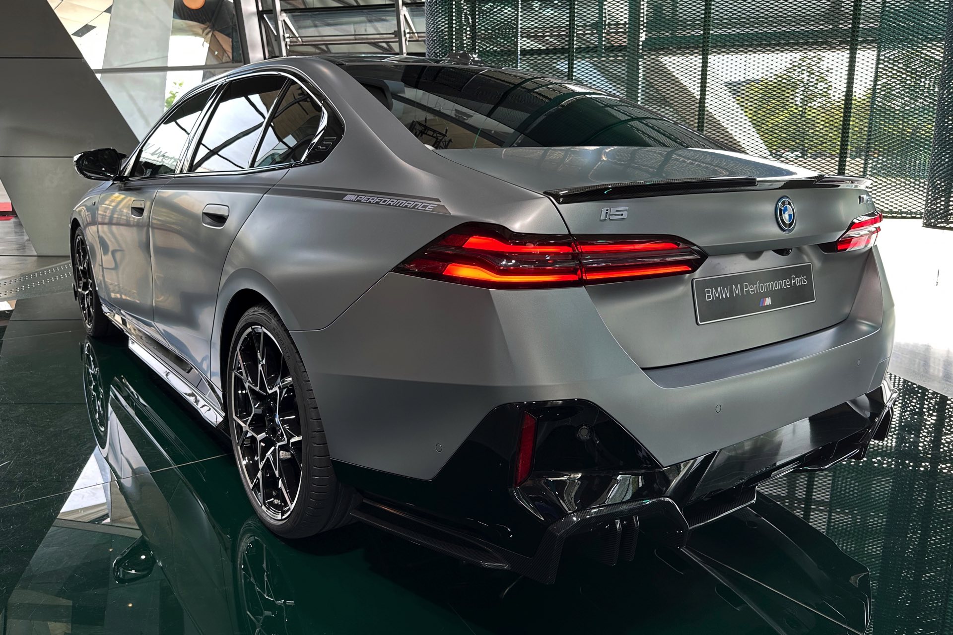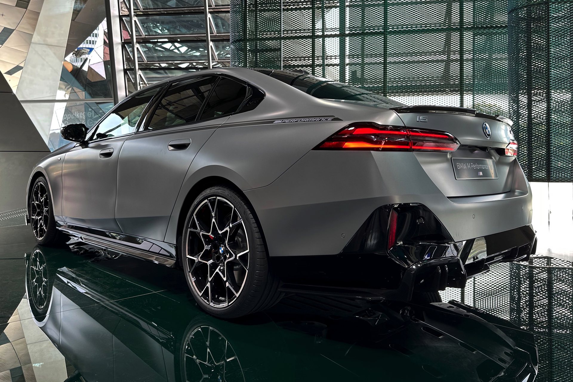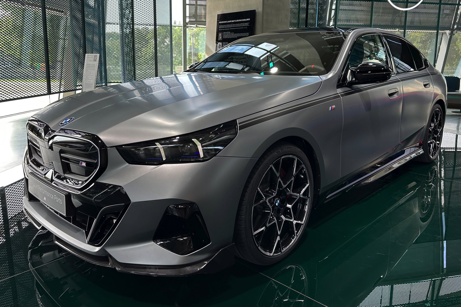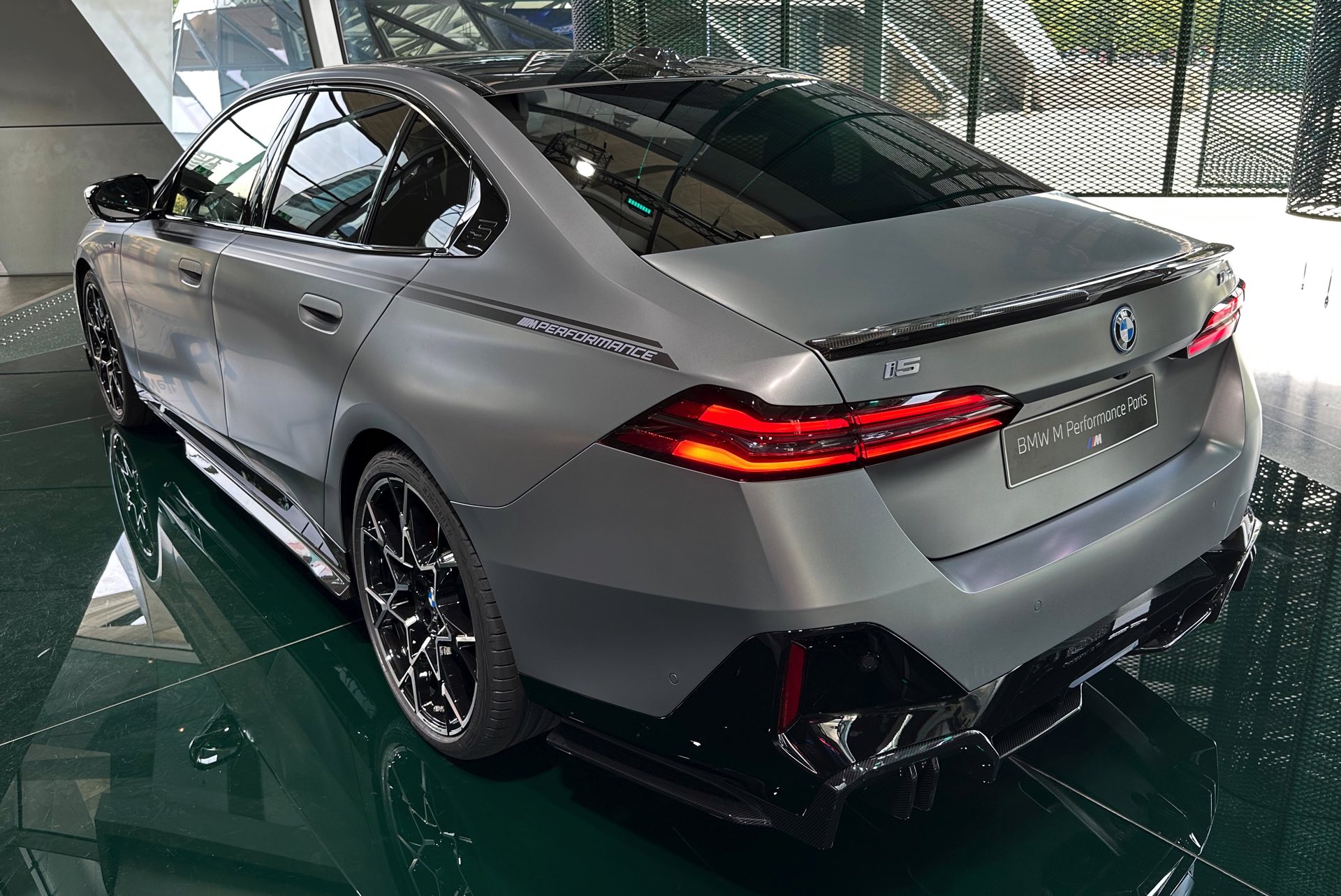 Das Highlight im aktuellen Aufgebot der BMW Welt München verzichtet auf glänzenden Lack: Der neue BMW i5 M60 mit M Sport Pro-Paket und M Performance Parts zeigt das werkseigene Tuning-Programm erstmals in Verbindung mit einer Lackierung in Frozen Pure Grey. Das matte Hellgrau sorgt dabei für scharfe Kontraste zu den in Hochglanz-Schwarz gehaltenen Elementen der erweiterten Shadow Line, die für alle Varianten der neuen 5er-Generation (G60) nur noch in Verbindung mit dem M Sport Pro-Paket erhältlich ist, sowie den zahlreichen Carbon-Anbauteilen aus dem Tuning-Programm von BMW M Performance.