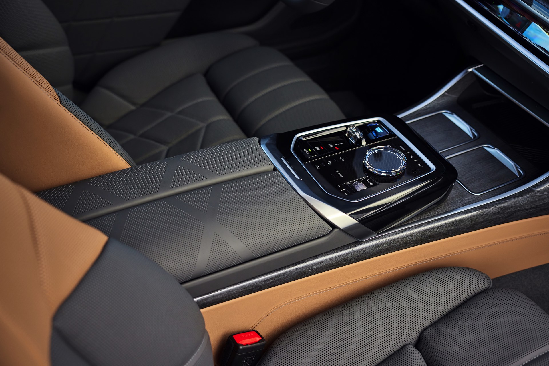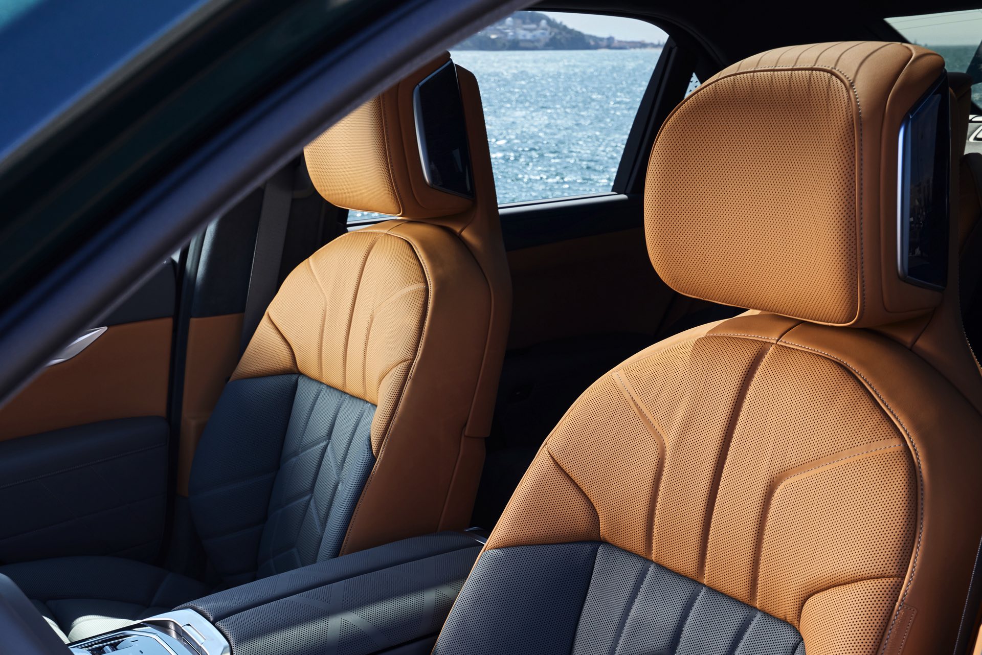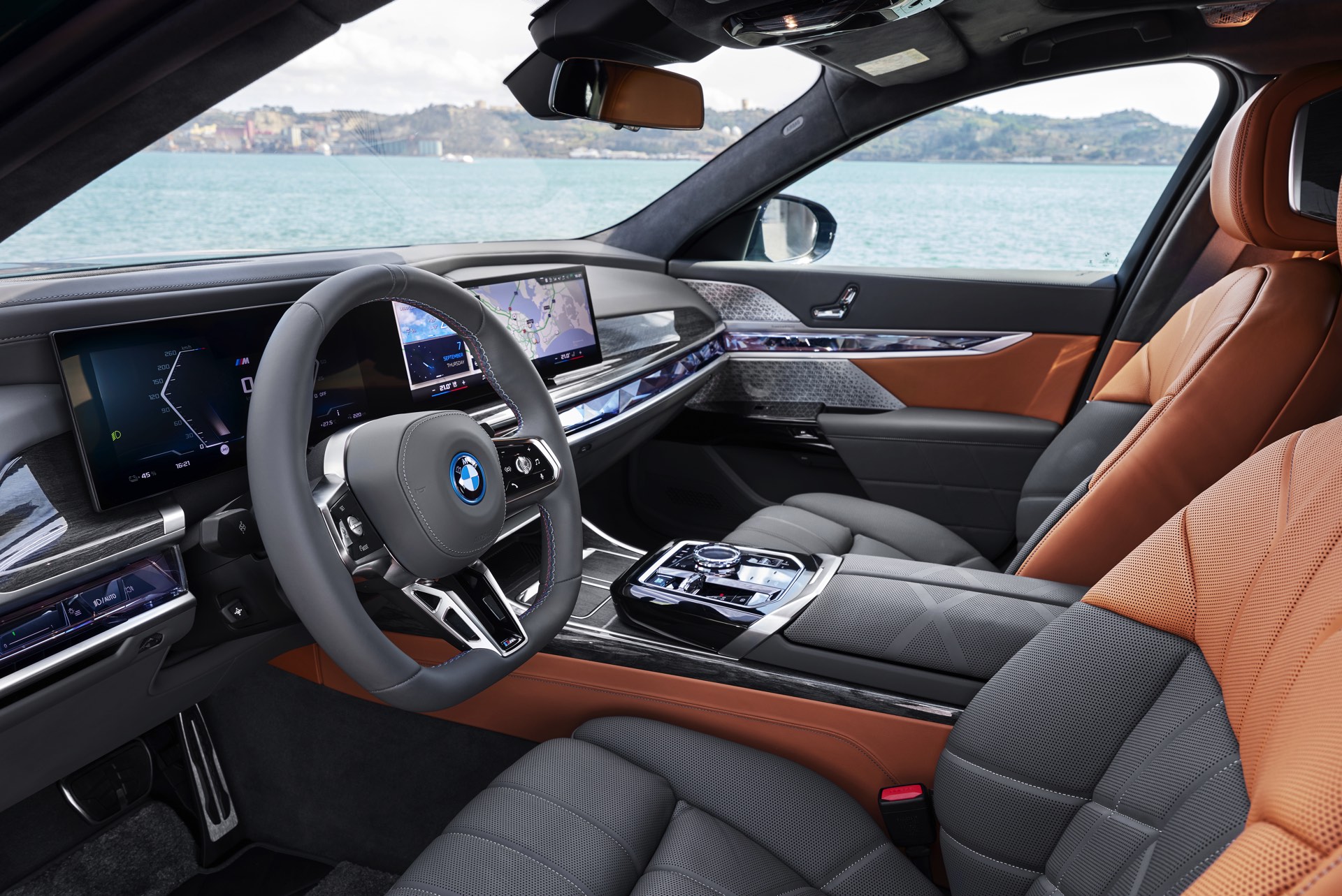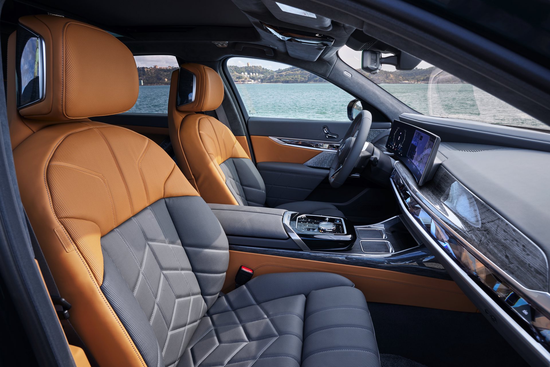 Neben der Außenhaut verdient auch der Innenraum des individuellen i7 einen genaueren Blick, denn hier sehen wir die BMW Individual Leder-Ausstattung ‘Merino’ mit Exklusivumfängen in den Farben Caramel und Atlas Grey. Das Bicolor-Interieur wird mit glänzenden Holzleisten kombiniert und rundet den Look des 660 PS starken Elektro-7ers elegant ab.