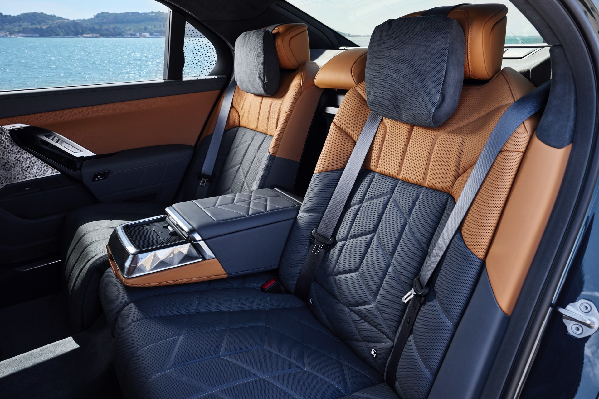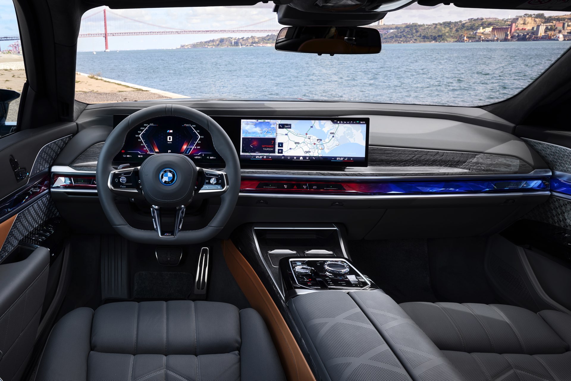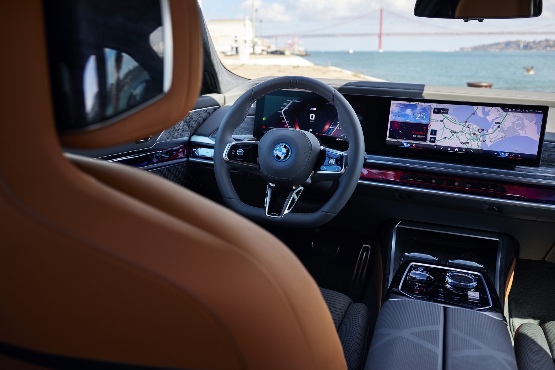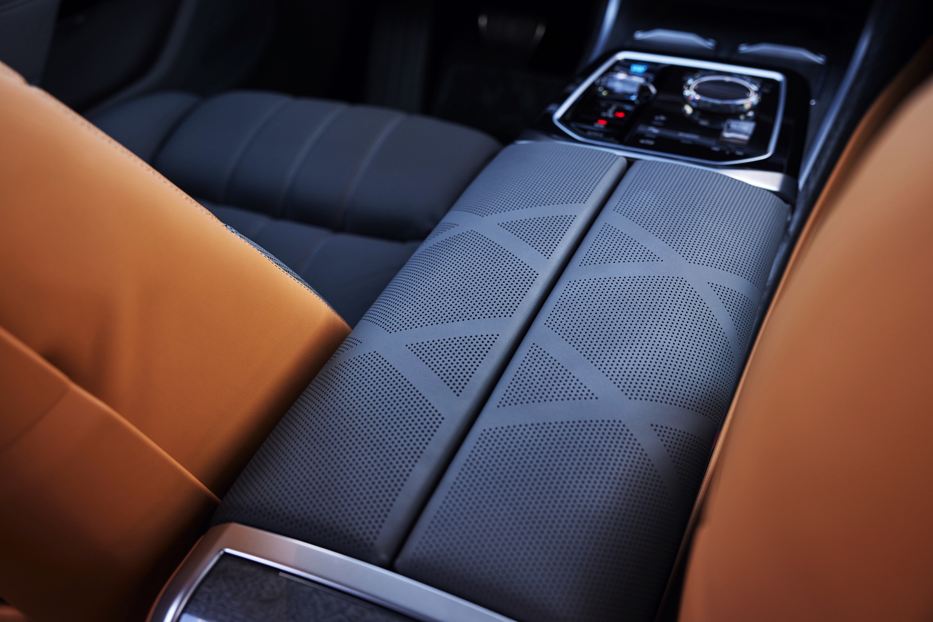 Neben der Außenhaut verdient auch der Innenraum des individuellen i7 einen genaueren Blick, denn hier sehen wir die BMW Individual Leder-Ausstattung ‘Merino’ mit Exklusivumfängen in den Farben Caramel und Atlas Grey. Das Bicolor-Interieur wird mit glänzenden Holzleisten kombiniert und rundet den Look des 660 PS starken Elektro-7ers elegant ab.