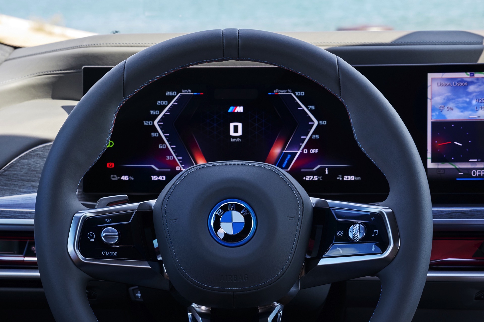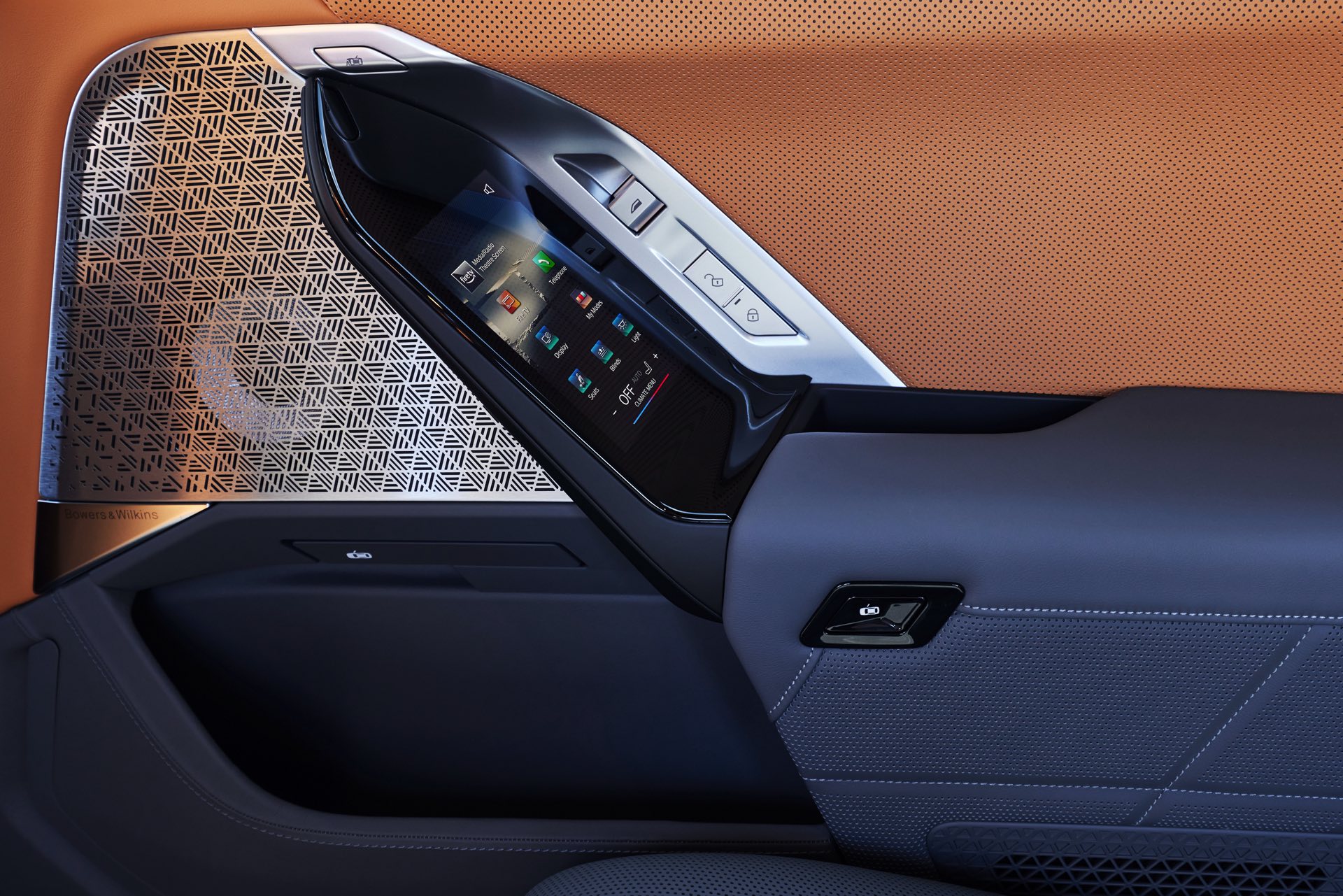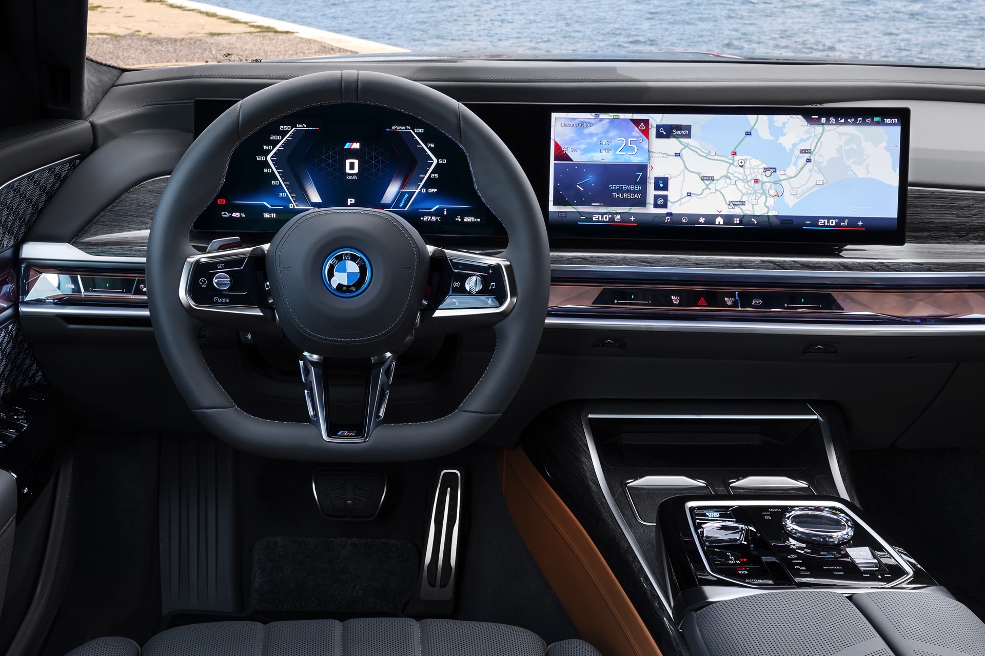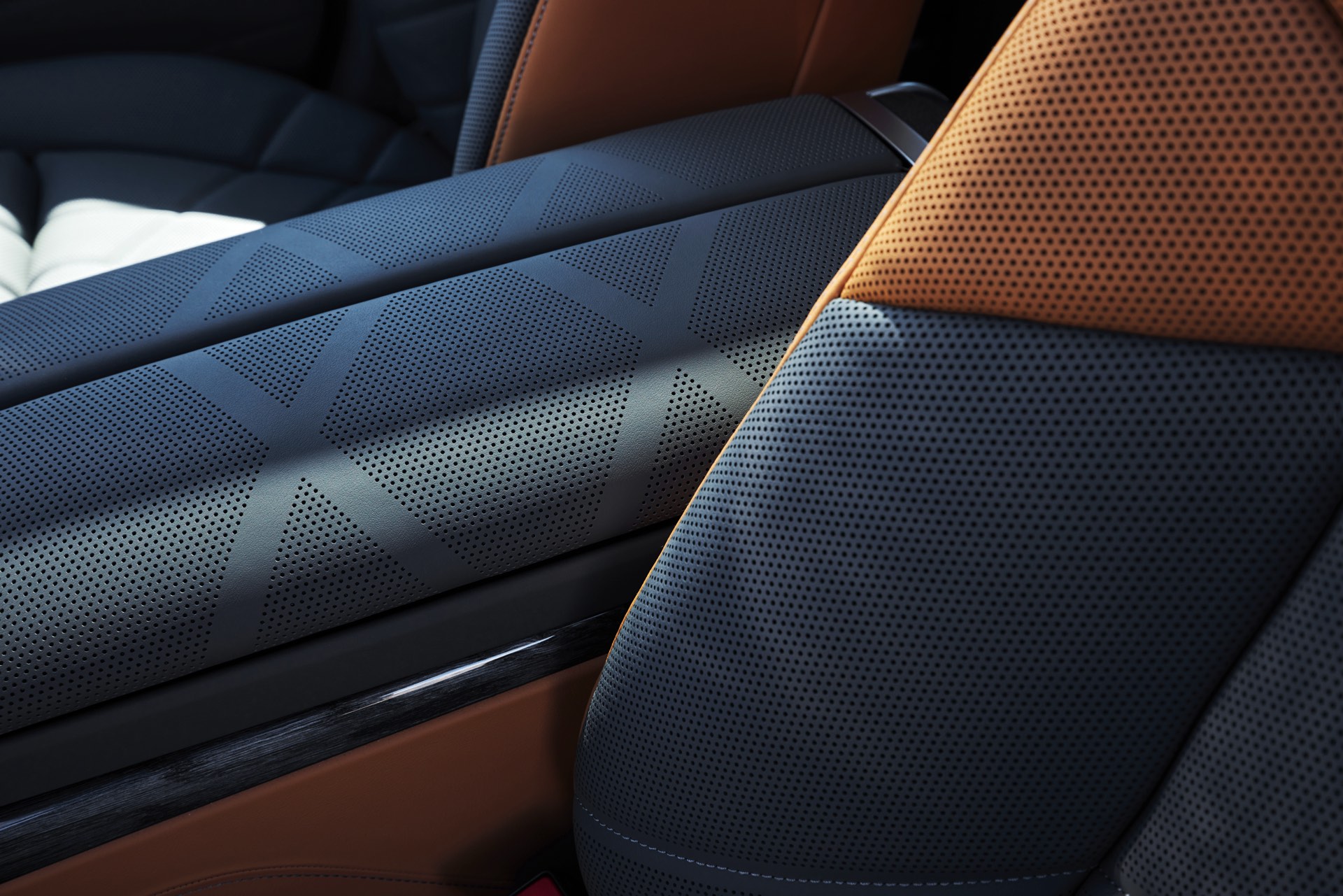 Neben der Außenhaut verdient auch der Innenraum des individuellen i7 einen genaueren Blick, denn hier sehen wir die BMW Individual Leder-Ausstattung ‘Merino’ mit Exklusivumfängen in den Farben Caramel und Atlas Grey. Das Bicolor-Interieur wird mit glänzenden Holzleisten kombiniert und rundet den Look des 660 PS starken Elektro-7ers elegant ab.
