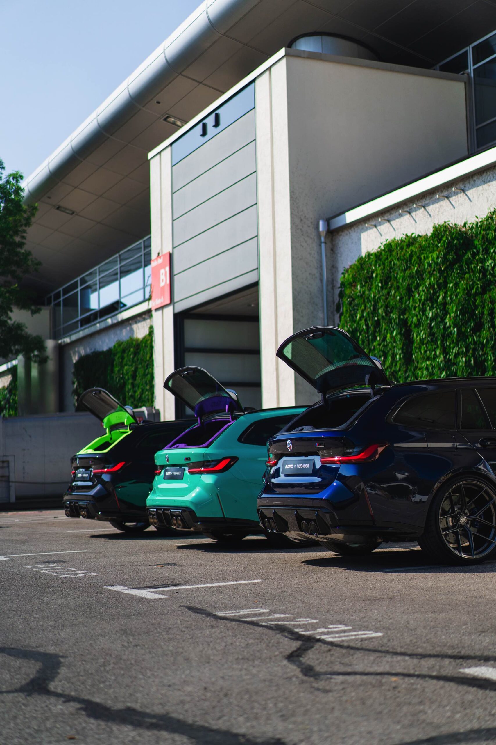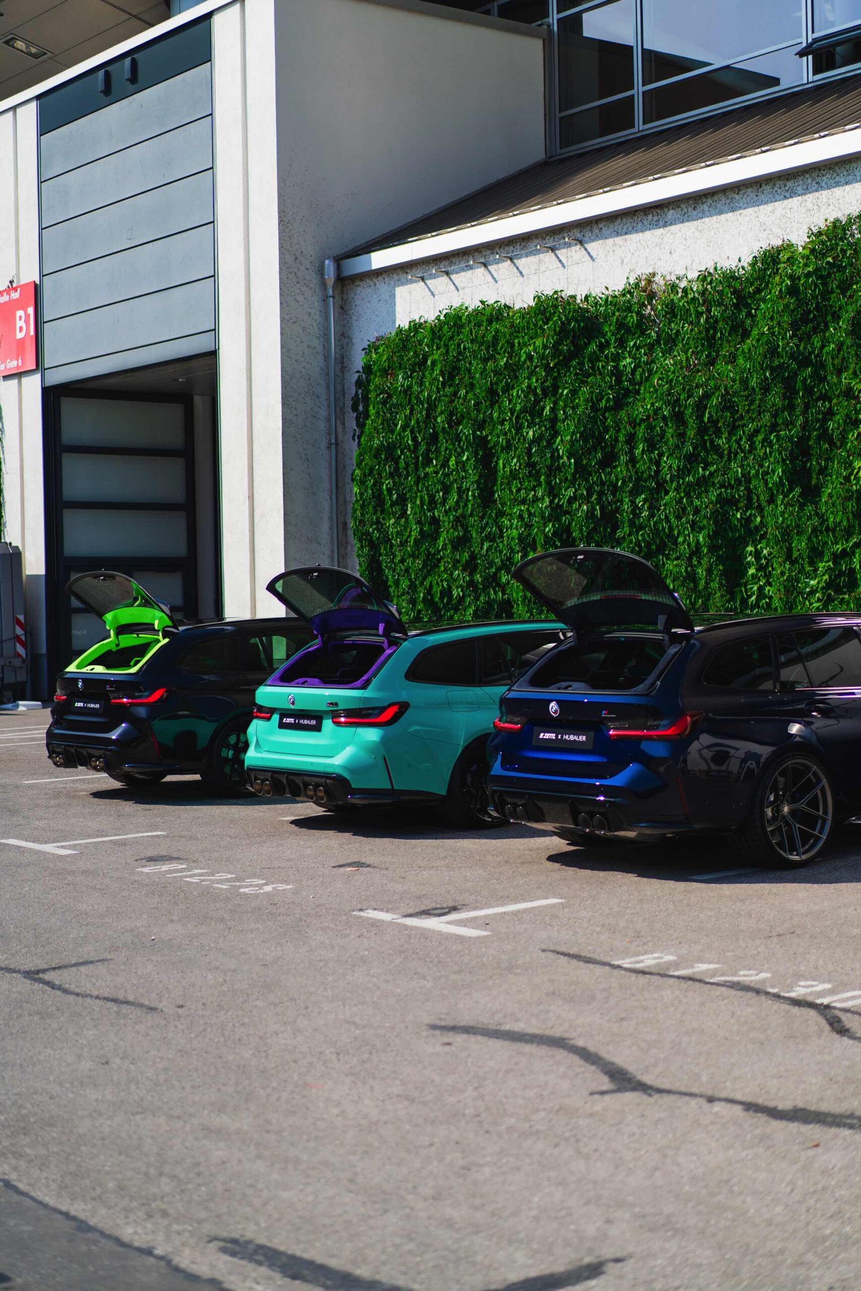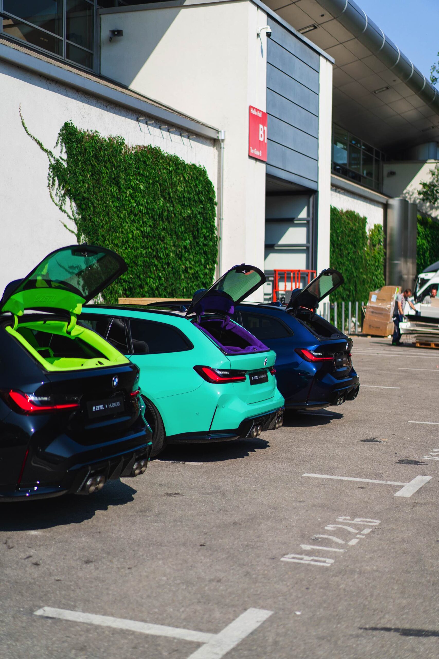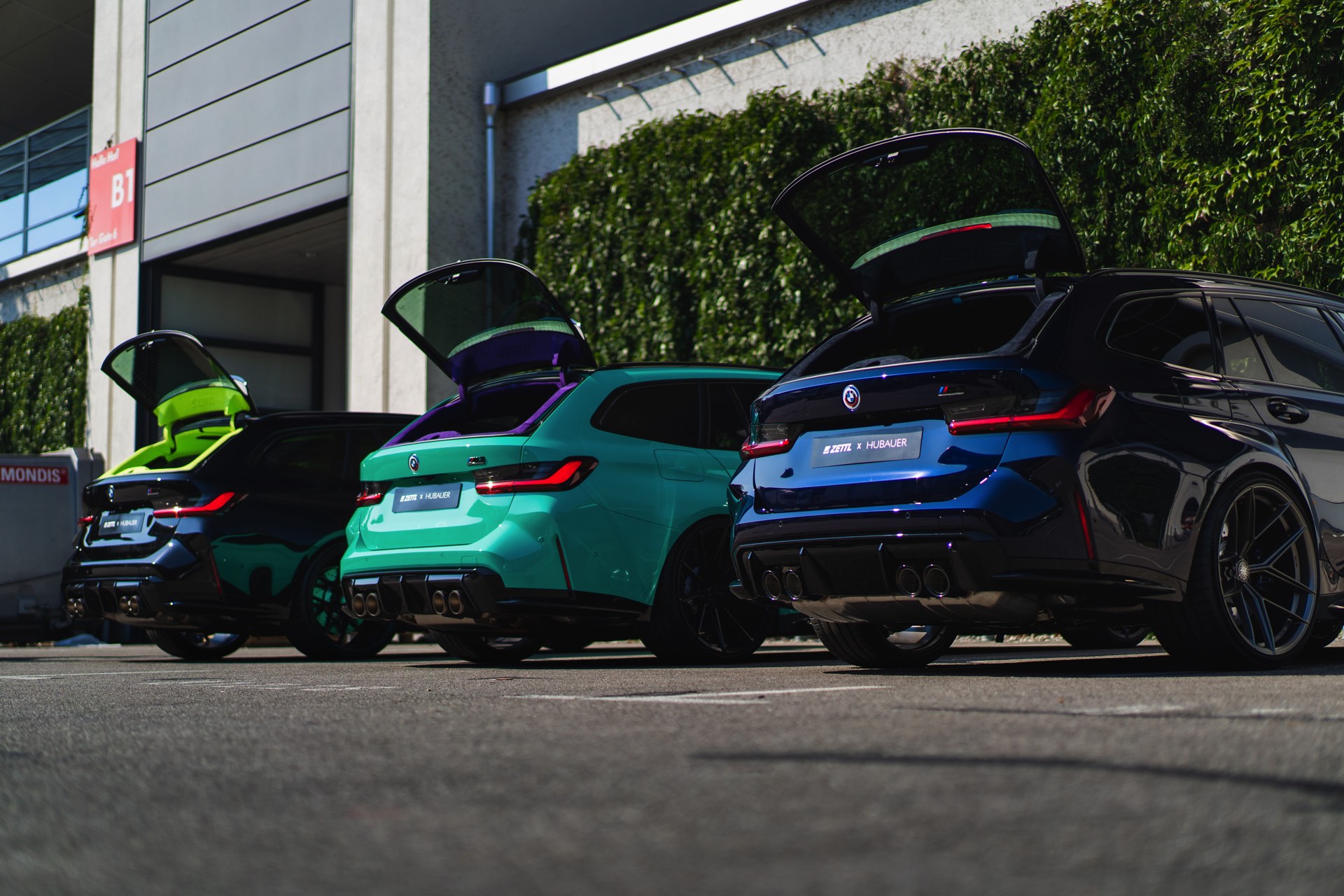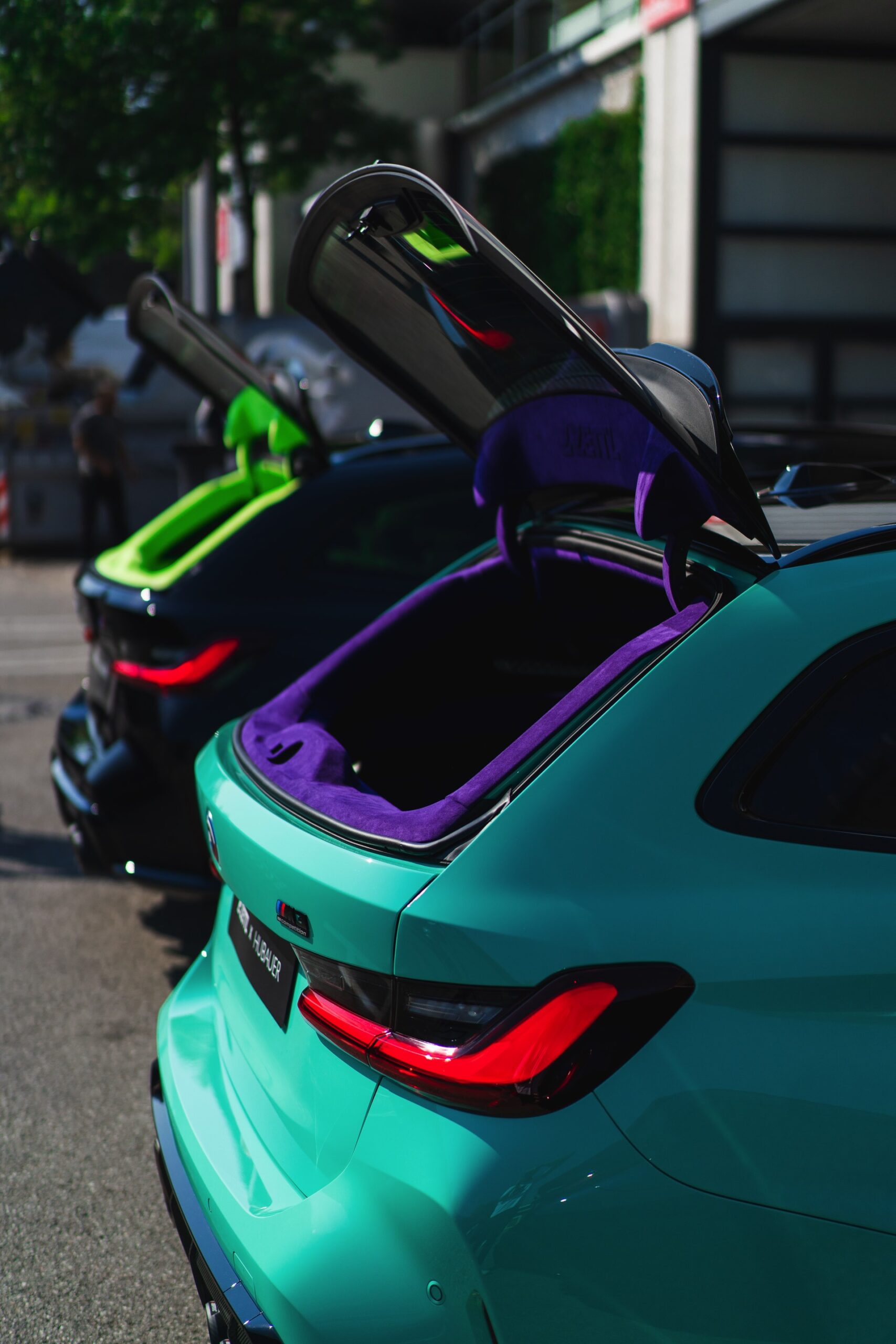 Bei den aktuellen Exterieur-Aufnahmen zeigt sich, dass der Innenraum mit in einer markanten Farbe wie ‘verde scandal’ auch zufällig vorbeilaufende Betrachter erreicht, sobald sich eine Tür oder auch nur die separat zu öffnende Heckscheibe des M3 Touring öffnet. Außerdem wird klar, wie speziell die drei bereits ab Werk 510 PS starken Kombis auch äußerlich auftreten – wobei der G81 von JP Performance mit seiner Individual-Lackierung in Mint zweifellos die meiste Aufmerksamkeit erregen dürfte.