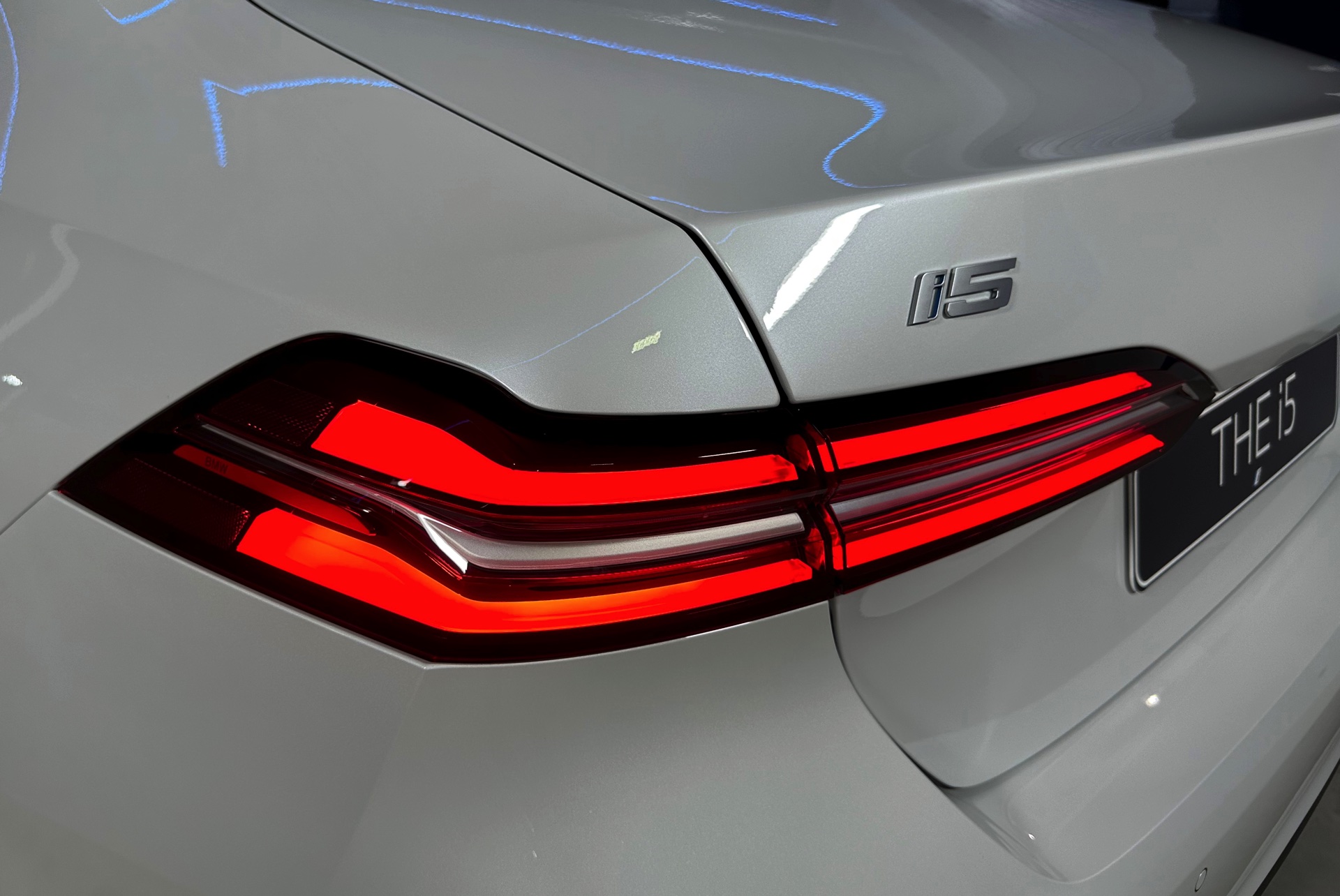 In der Seitenansicht werten die 20 Zoll großen Aerodynamikräder 937 Multicolor Silber den 5er auf. Die Felgen kosten im Fall des BMW i5 eDrive40, der serienmäßig auf 19-Zöllern steht, 1.890 Euro Aufpreis. Ein sehenswertes Detail ist die ins Aluminium geprägte 5 im Bereich des Hofmeister-Knicks.