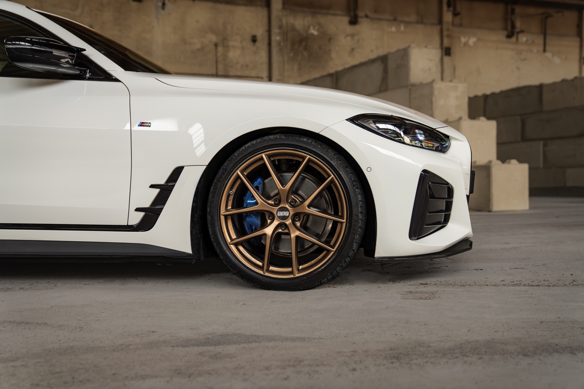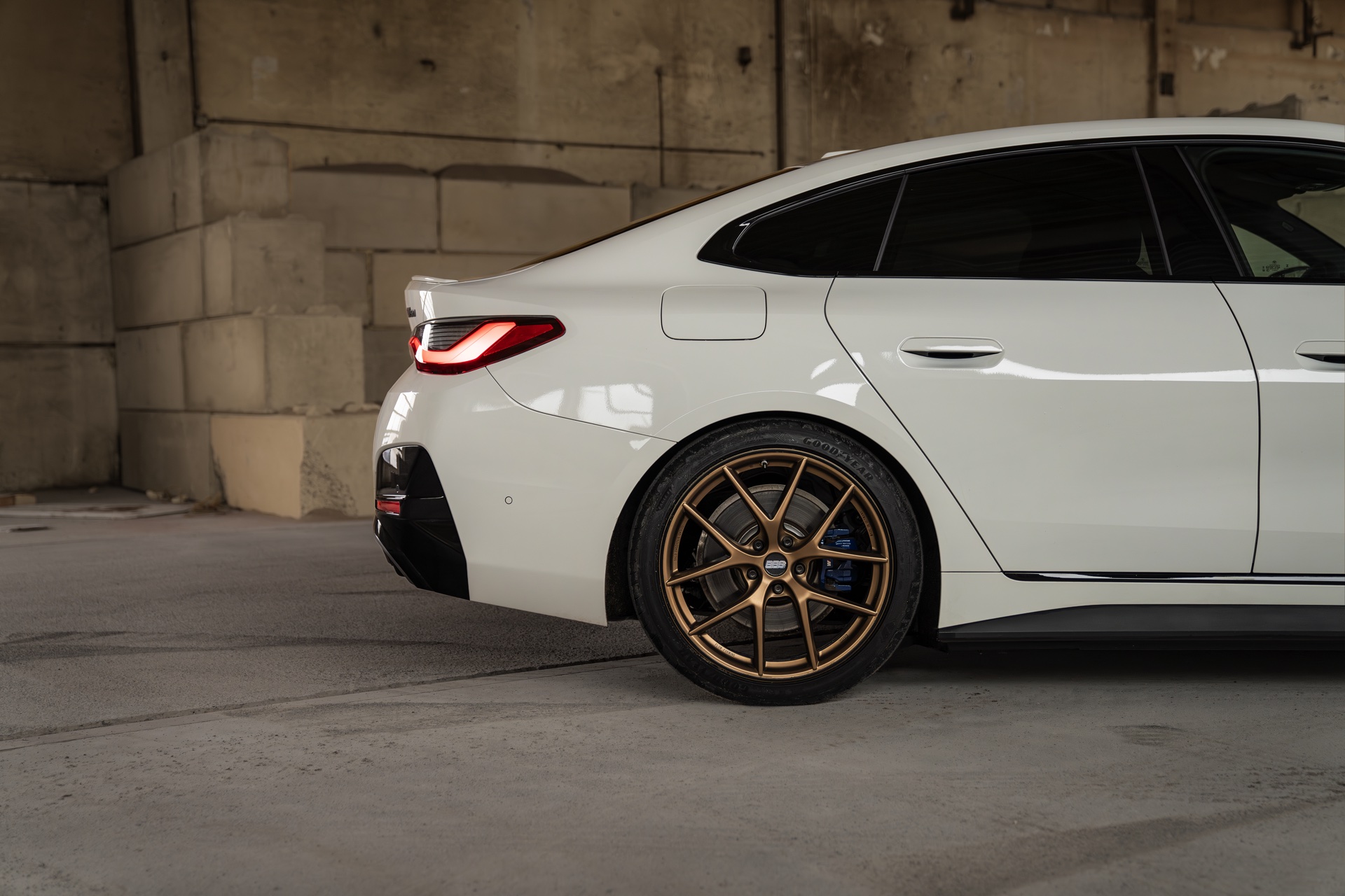 Auf den Fotos von KW sehen wir den BMW i4 mit vorne wie hinten 20 Zoll großen Felgen vom Typ BBS CI-R Unlimited, die für eine Vielzahl von Fahrzeugen verfügbar sind. Wer einmal die Räder wechselt, kann mit einigen weiteren Handgriffen auch gleich das Plug & Play-Fahrwerk tauschen (lassen): Serien-Federbeine und -Dämpfer können einfach gegen die KW-Komponenten getauscht werden, danach muss nur noch der Stecker zur Regelung der Fahrwerkssysteme verbunden, die Leuchtweitenregulierung neu eingestellt und eine Achsvermessung durchgeführt werden.