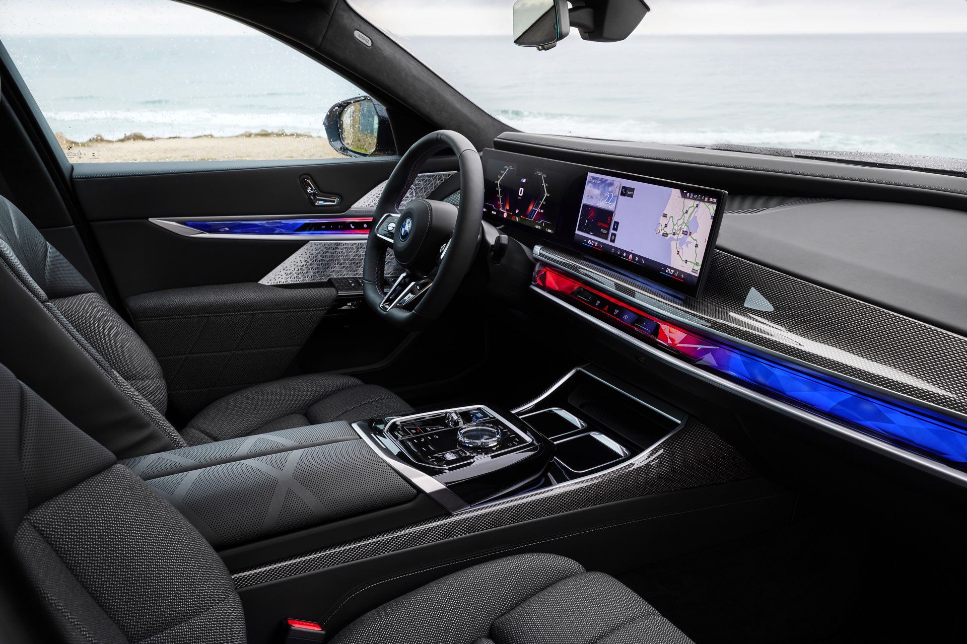 Wie beim Antrieb geht der von uns gefahrene BMW i7 M70 auch im Innenraum einen neuen Weg: Statt klarem Fokus auf Leder gibt es eine edle Kombination mit Kaschmir-Wolle, statt schweren Hölzern kommt leichtes Carbon zum Einsatz. Aller Kraft zum Trotz bleibt auch dieser G70 klar dem Luxus verpflichtet, was sich besonders im Fond zeigt: Wer gerade nicht selbst fahren will, kann es sich hinten rechts in Liegeposition bequem machen und dabei das Entertainment-Programm auf dem 31 Zoll großen Theatre-Screen genießen.