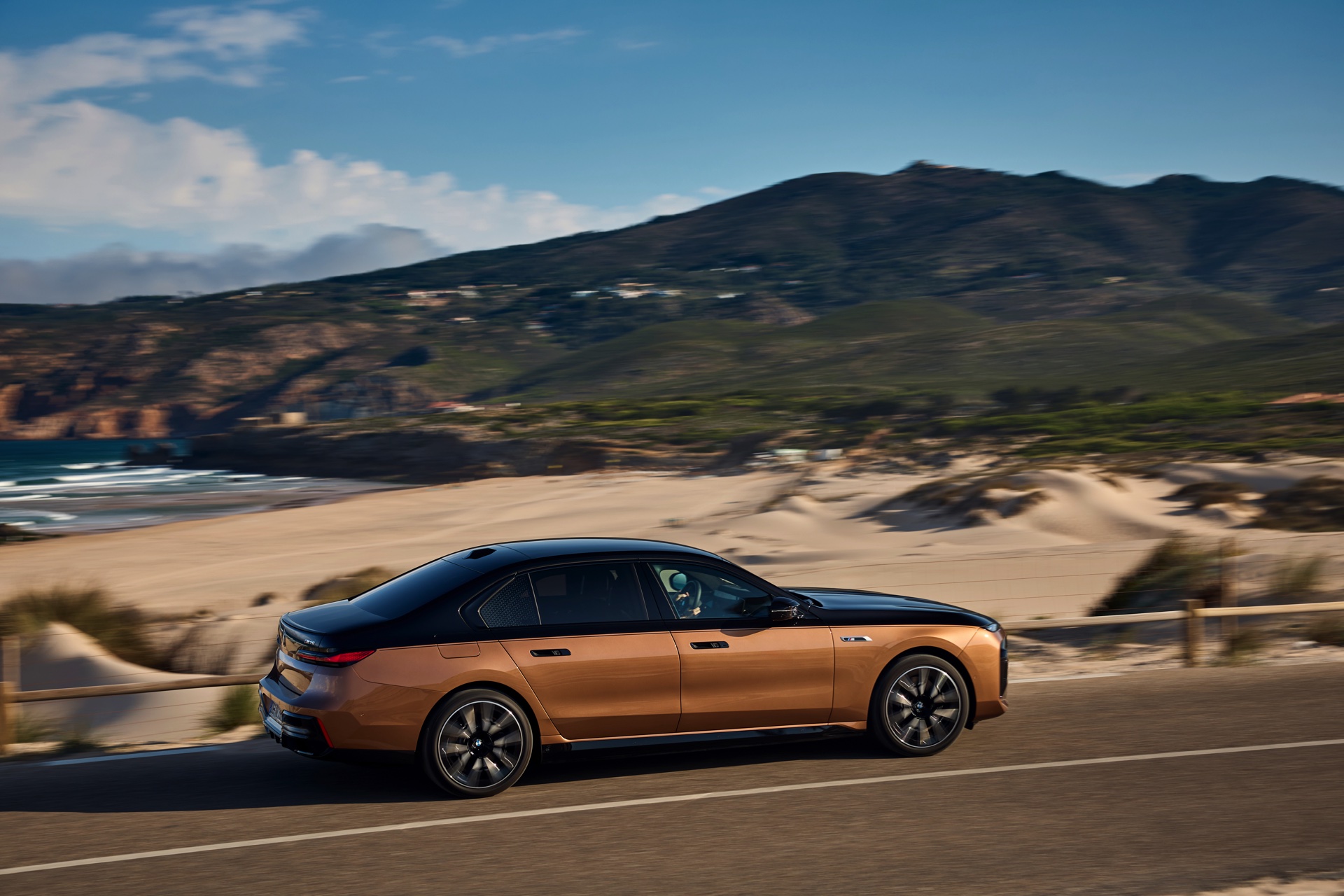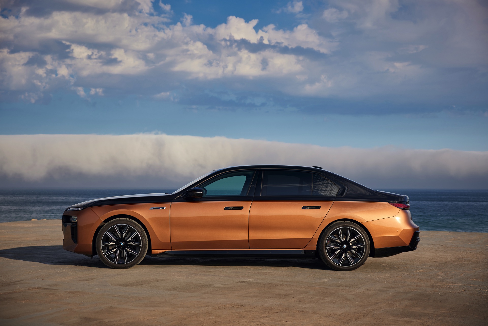 Der feine Zwirn täuscht: Auch wenn der Auftritt des neuen BMW i7 M70 den Luxus in den Vordergrund stellt und er sich scheinbar eher als Meister der leisen Töne denn als Krawallbruder versteht, kann er jederzeit und ganz ohne laut zu werden einen mächtigen Punch setzen. Dabei kennt er auf gerader Strecke so gut wie keine Gegner, obwohl er keinen einzigen Kubikzentimeter Hubraum ins Rennen wirft: Der Elektro-7er zeigt mit seiner enormen Leistung und seiner selbstbewussten Optik, dass ein automobiles Statussymbol im Jahr 2023 keinen einzigen Zylinder mehr haben muss. Wir durften für einen ersten Fahrbericht ans Steuer eines i7 M70 mit exklusiver Two-Tone-Lackierung: Schwarz in der oberen Hälfte wird mit Liquid Copper darunter kombiniert und dürfte auch dem Letzten klar machen, dass hier ein wahrlich besonderes Fahrzeug unterwegs ist.