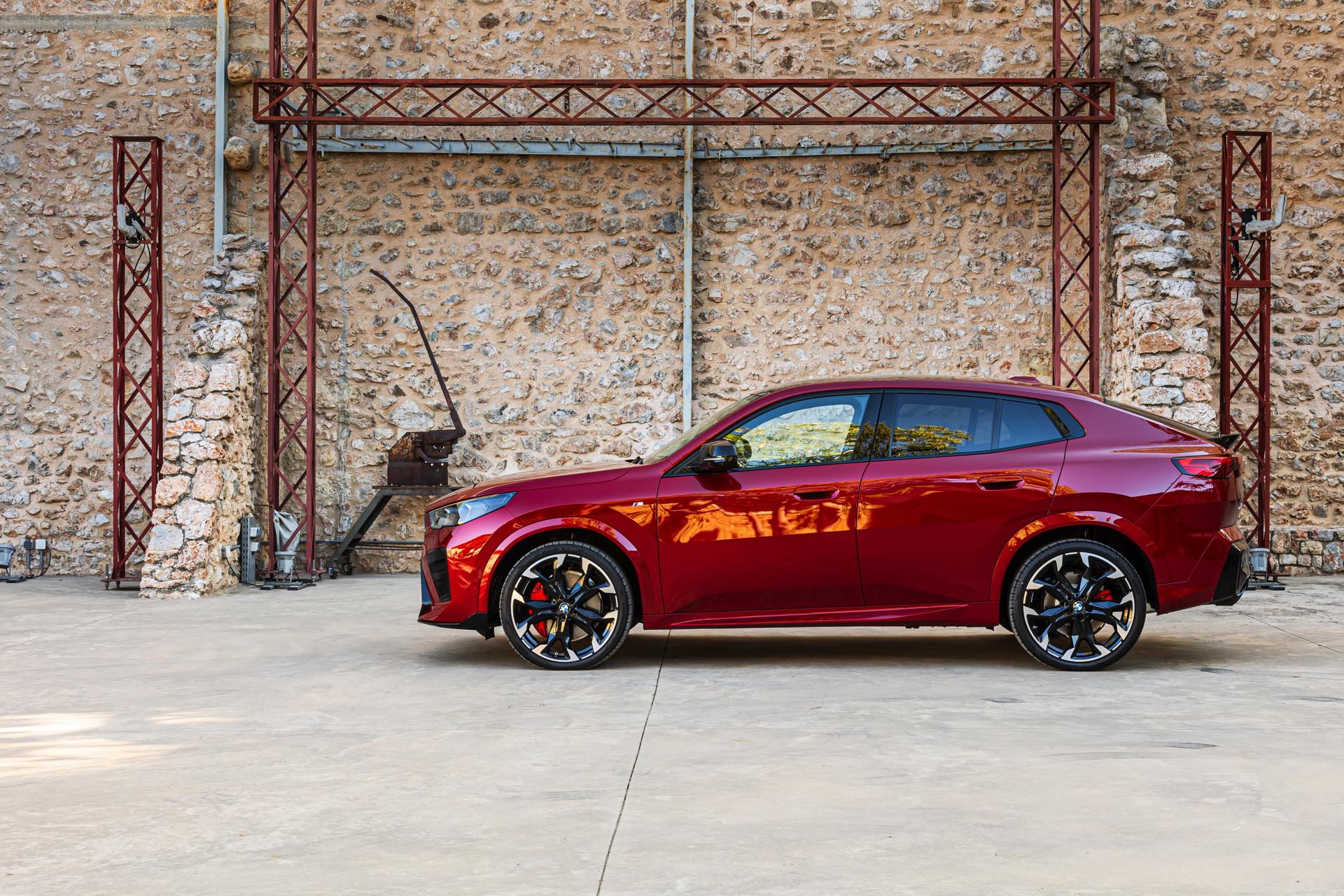 In der Seitenansicht sehen wir die 21 Zoll großen Leichtmetallräder Y-Speiche 874 M Bicolor, die auf Wunsch auch für alle anderen X2 und iX2 erhältlich sind. Dahinter glänzen die roten Bremssättel der M Sportbremse, die ihrerseits Bestandteil des M Sport Pro-Pakets ist. Alternativ ist die gleiche Bremsanlage auch mit blauen Sätteln erhältlich, die Top-Option in dieser Hinsicht ist aber die auch für den X1 M35i (U11) erhältliche M Compound-Bremse mit grauen Sätteln und Bremsscheiben im 19-Zoll-Format.