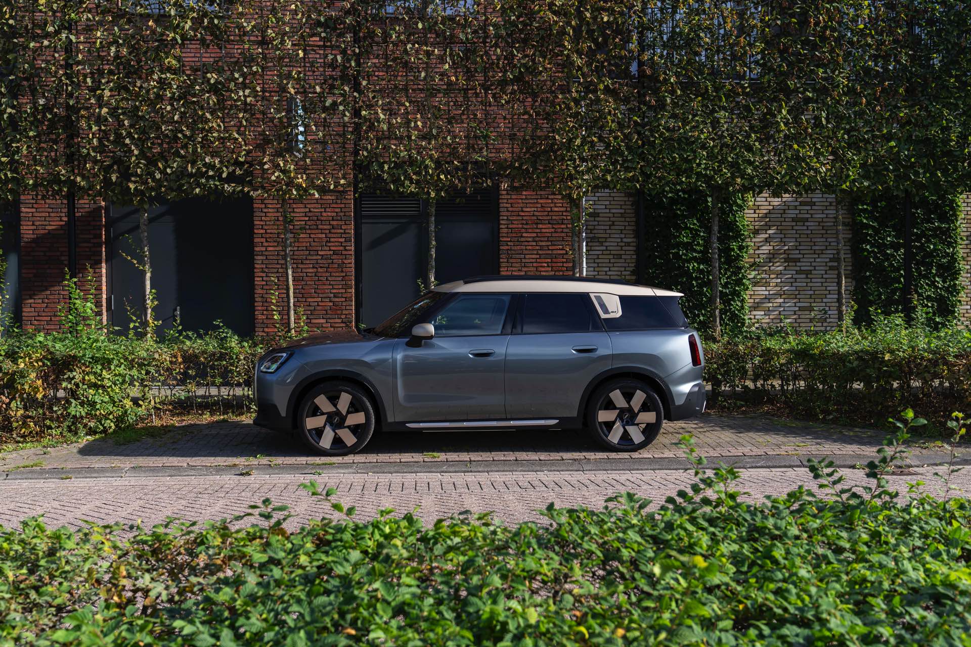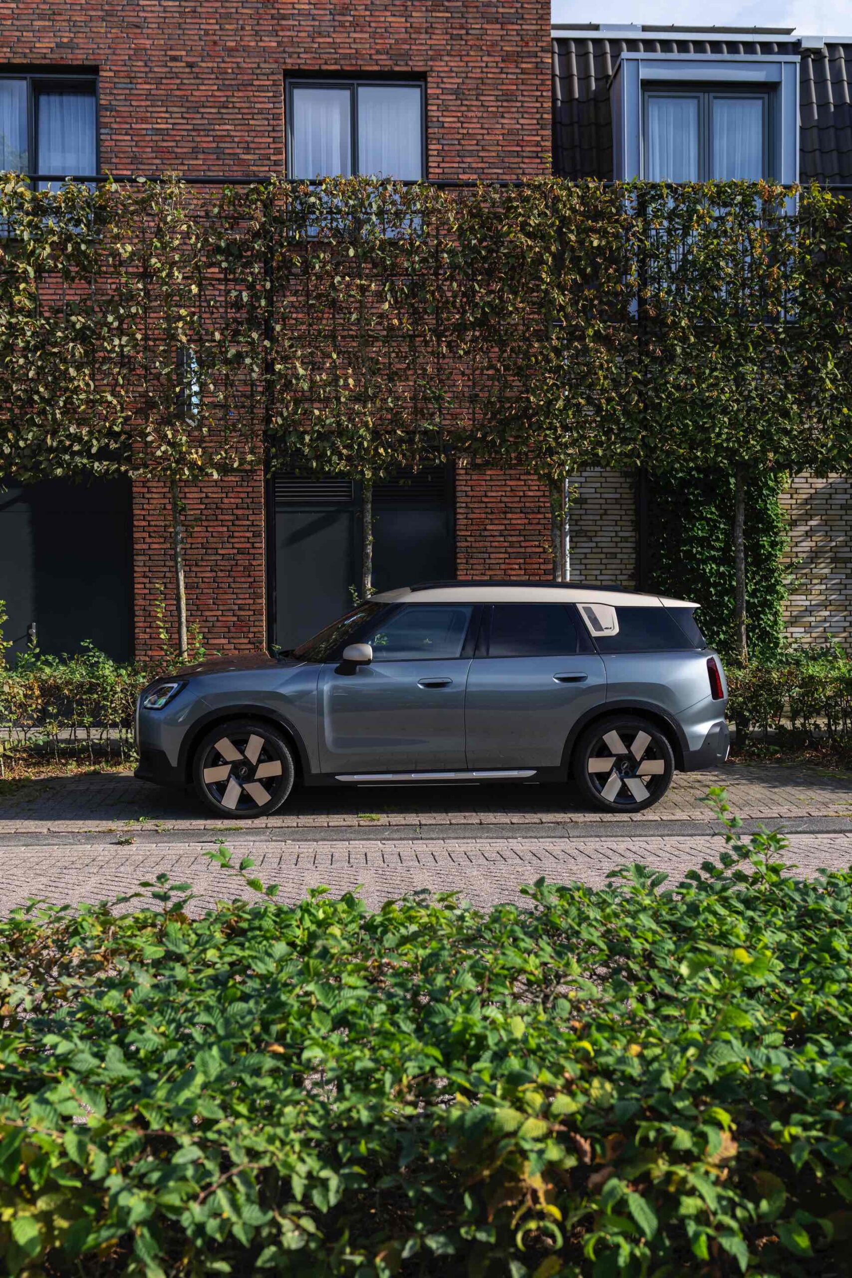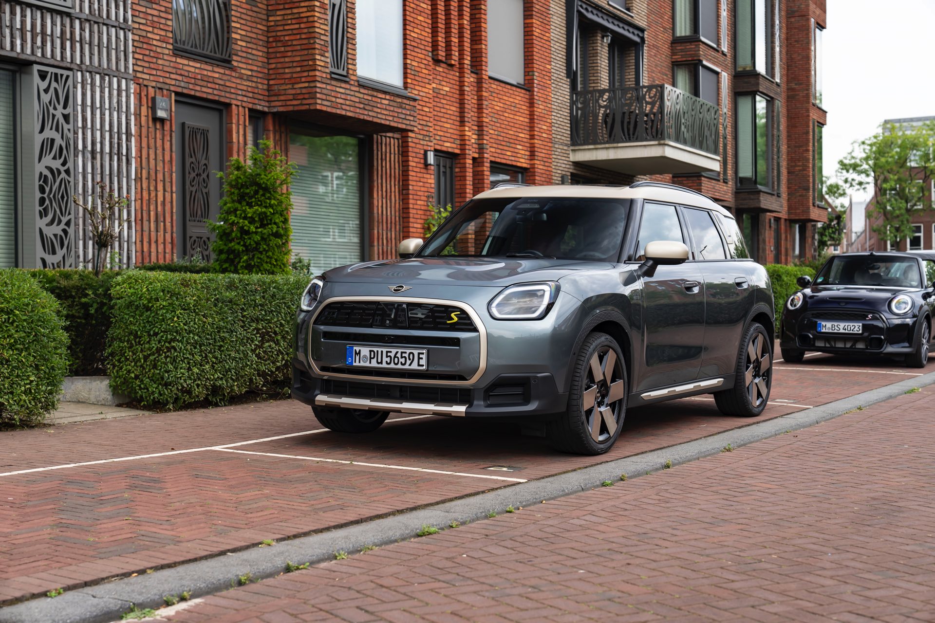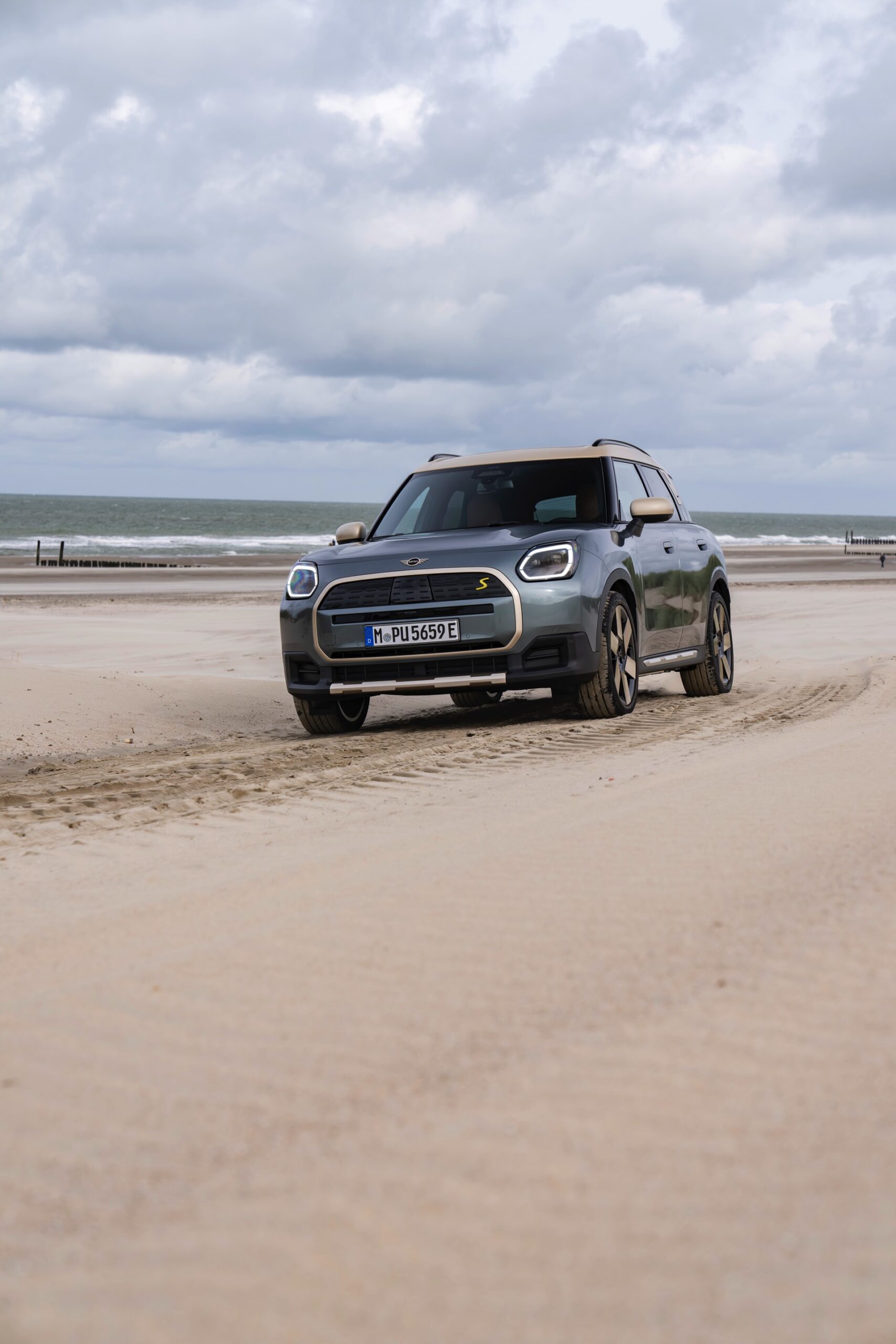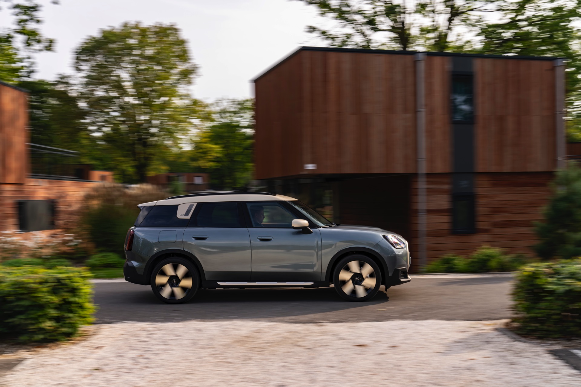 Wie sehr sich mit dem über 300 PS starken Elektro-SUV die elegante Seite betonen lässt, zeigt nun auch ein weiteres Foto-Set vom MINI Countryman in seiner Launch-Farbe Smokey Green. Das Dach, die Außenspiegel, die Einfassung des Kühlergrills und einige weitere Details sind in Vibrant Silver ausgeführt, das seidenmatt glänzt und je nach Lichteinfall durchaus an sanftes Gold erinnern kann. Auch die 20 Zoll großen Felgen greifen den eleganten Farbton auf und tragen zum edlen Gesamtlook bei.