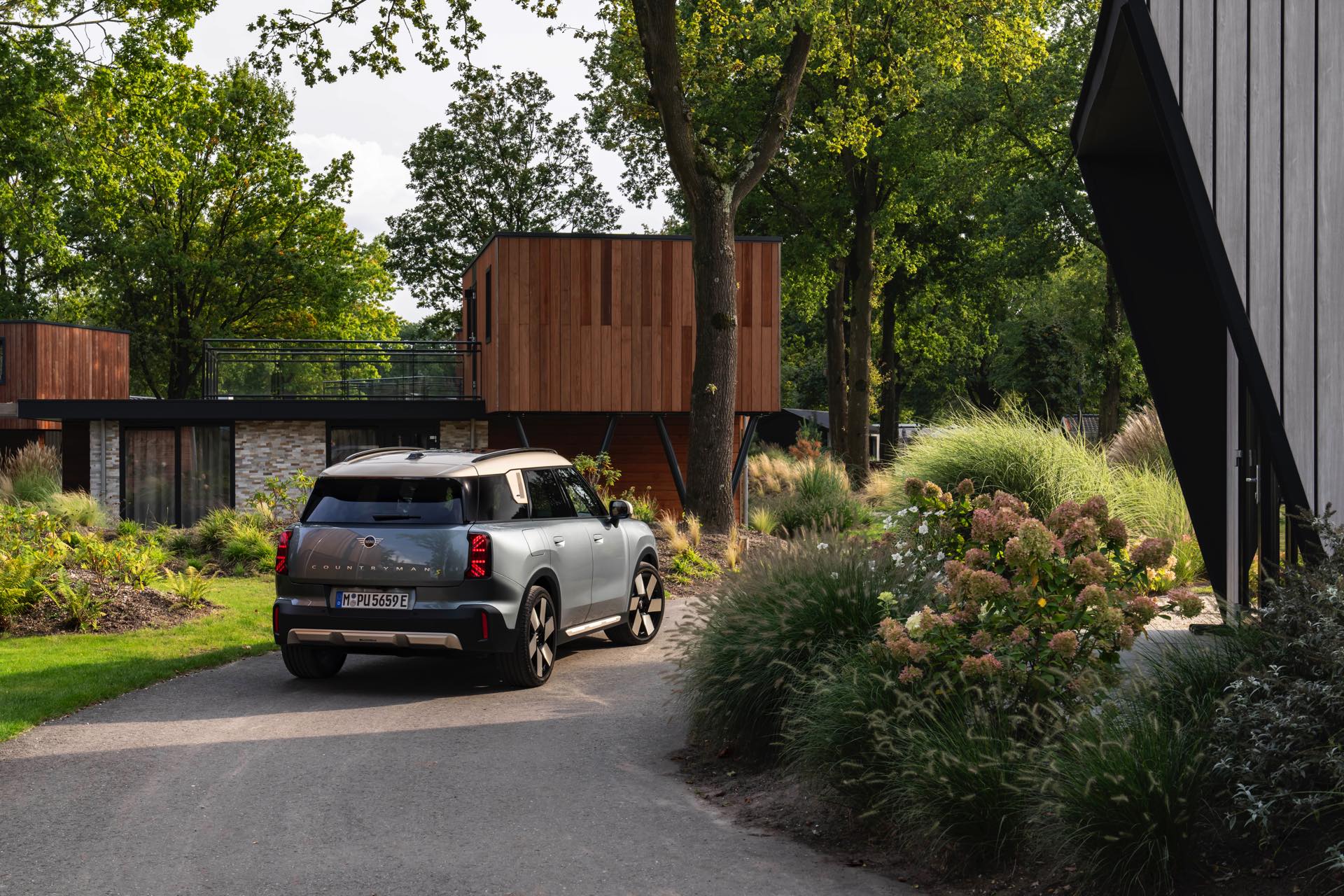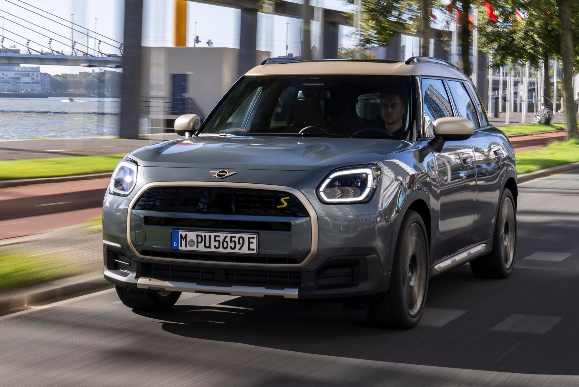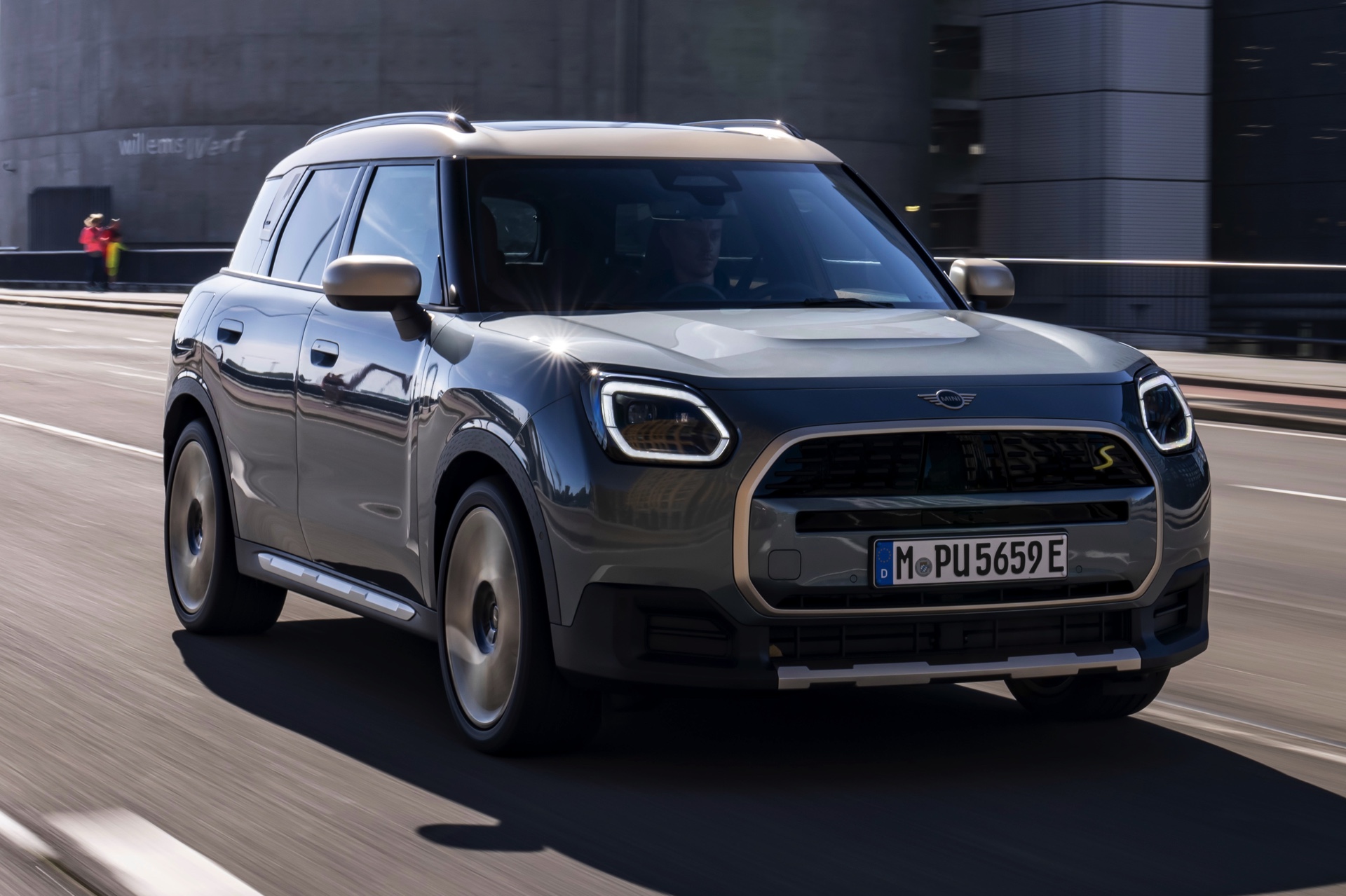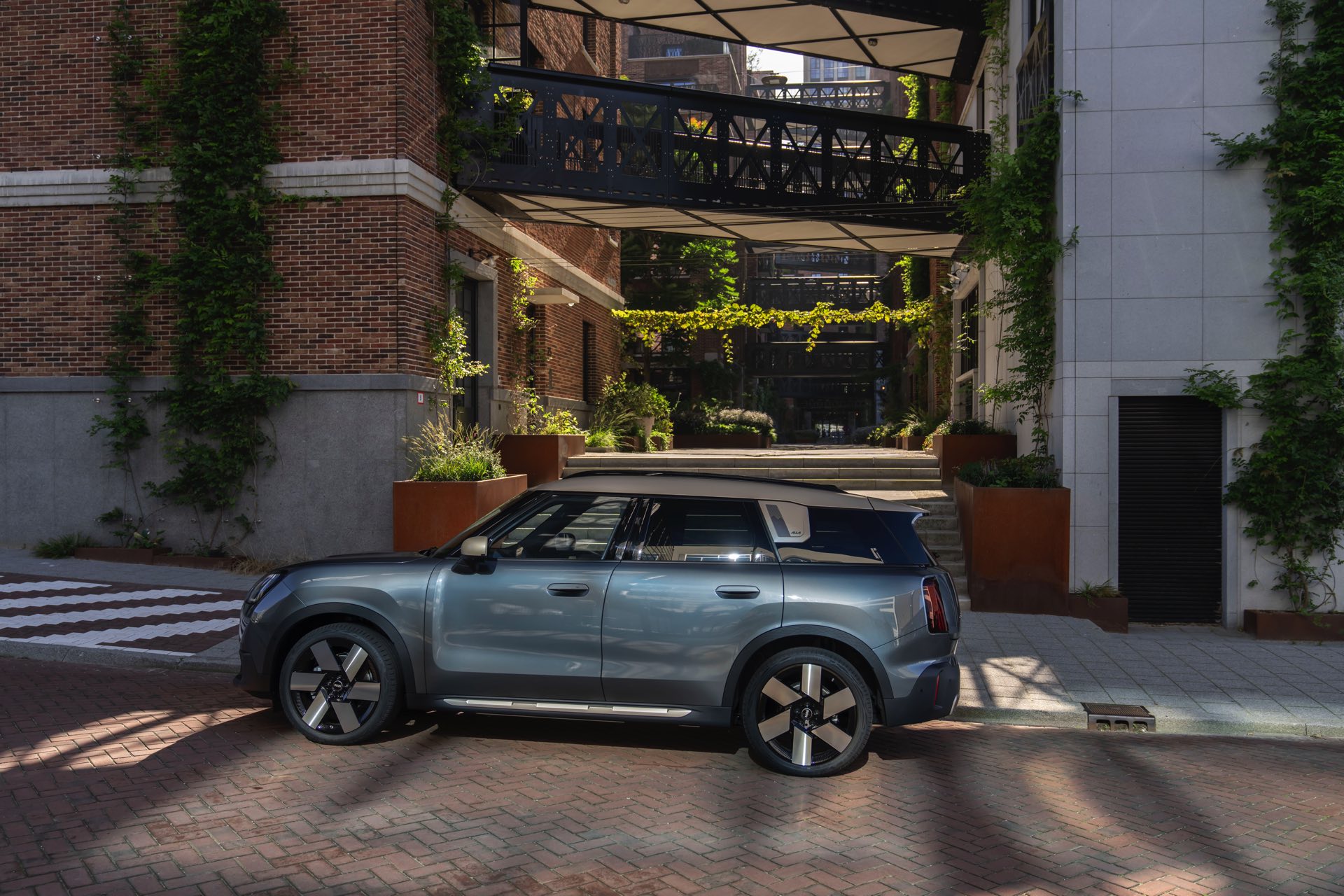 Wie sehr sich mit dem über 300 PS starken Elektro-SUV die elegante Seite betonen lässt, zeigt nun auch ein weiteres Foto-Set vom MINI Countryman in seiner Launch-Farbe Smokey Green. Das Dach, die Außenspiegel, die Einfassung des Kühlergrills und einige weitere Details sind in Vibrant Silver ausgeführt, das seidenmatt glänzt und je nach Lichteinfall durchaus an sanftes Gold erinnern kann. Auch die 20 Zoll großen Felgen greifen den eleganten Farbton auf und tragen zum edlen Gesamtlook bei.