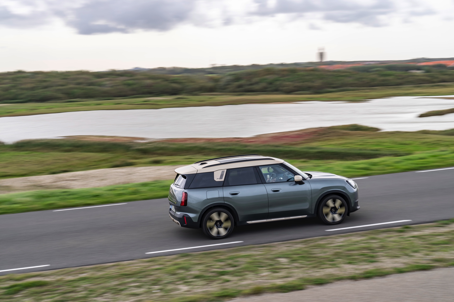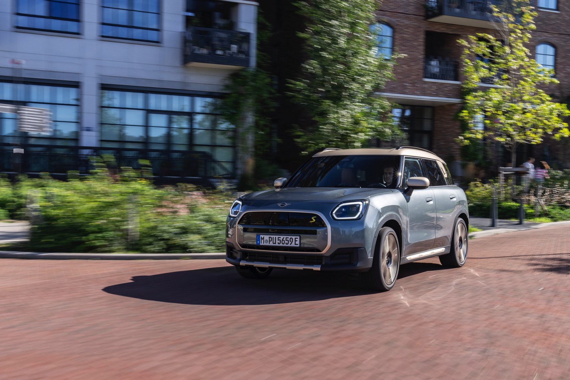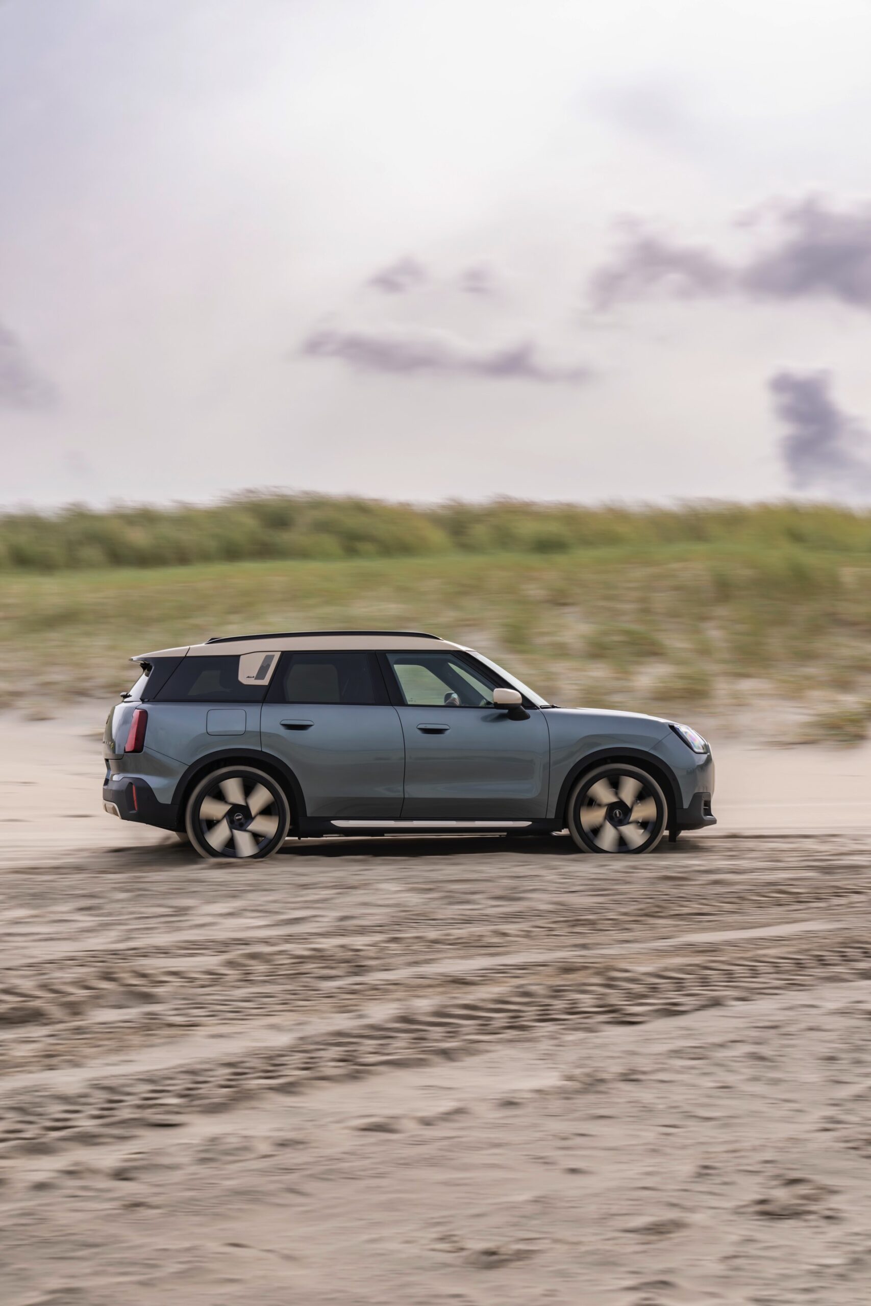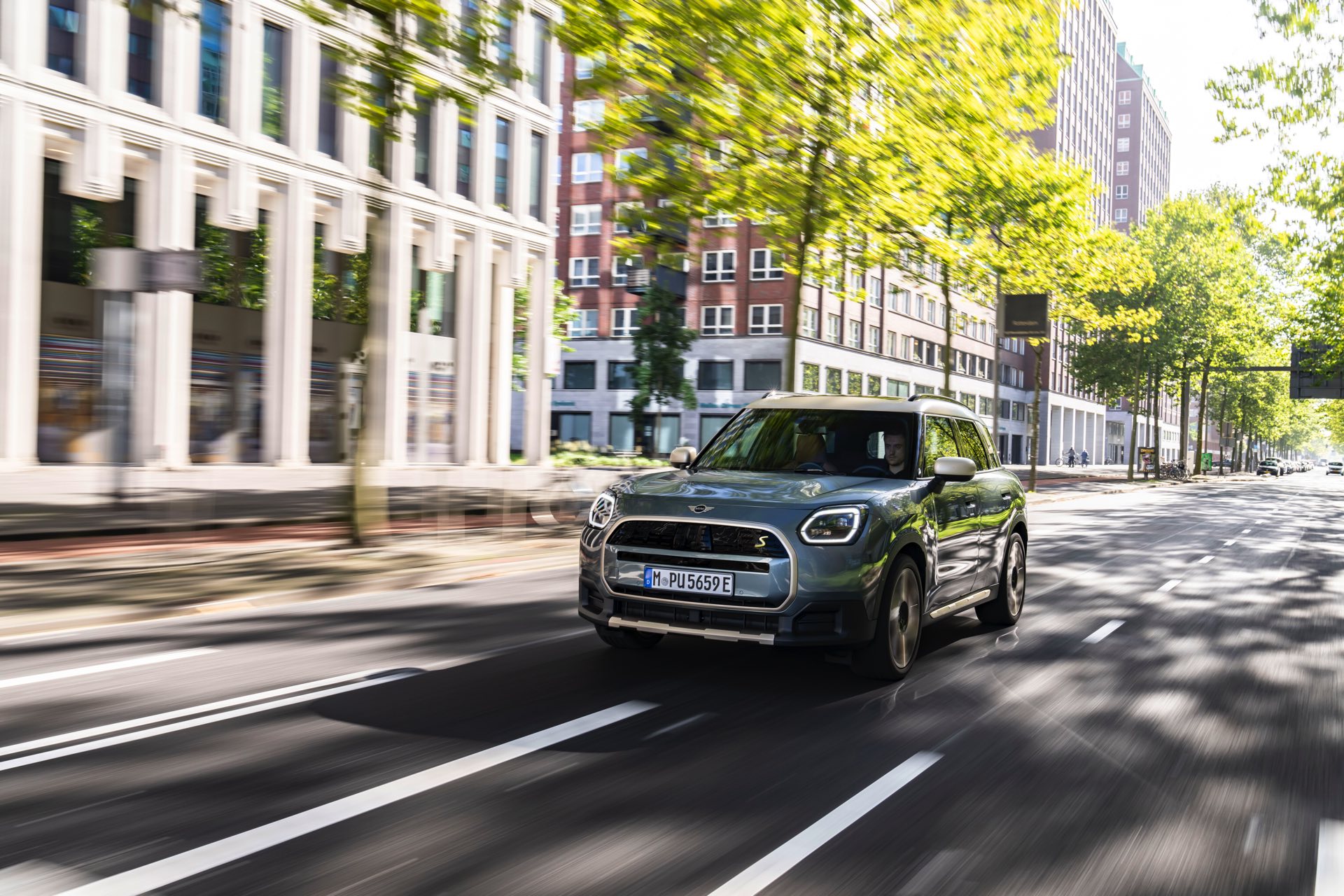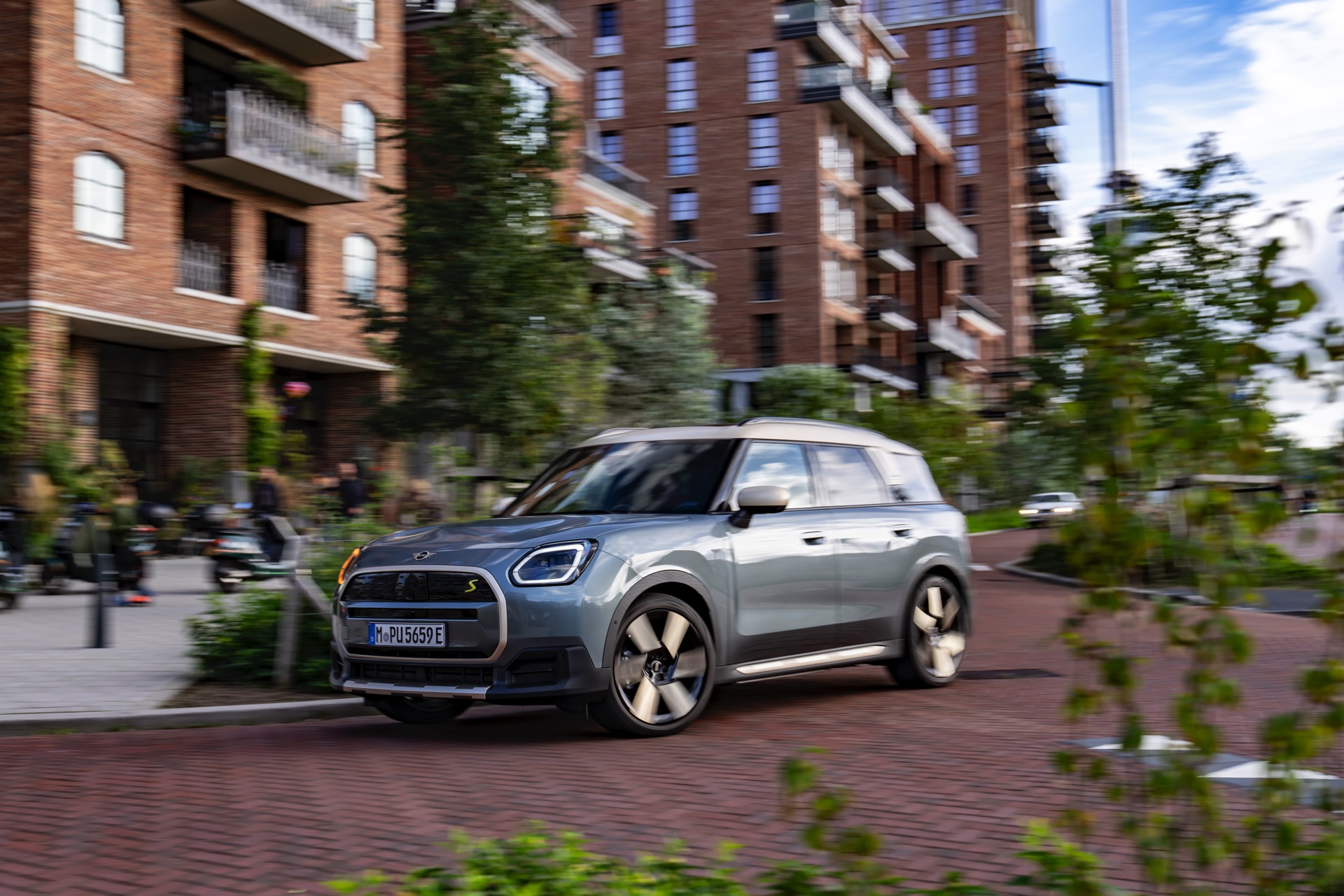 Wie sehr sich mit dem über 300 PS starken Elektro-SUV die elegante Seite betonen lässt, zeigt nun auch ein weiteres Foto-Set vom MINI Countryman in seiner Launch-Farbe Smokey Green. Das Dach, die Außenspiegel, die Einfassung des Kühlergrills und einige weitere Details sind in Vibrant Silver ausgeführt, das seidenmatt glänzt und je nach Lichteinfall durchaus an sanftes Gold erinnern kann. Auch die 20 Zoll großen Felgen greifen den eleganten Farbton auf und tragen zum edlen Gesamtlook bei.