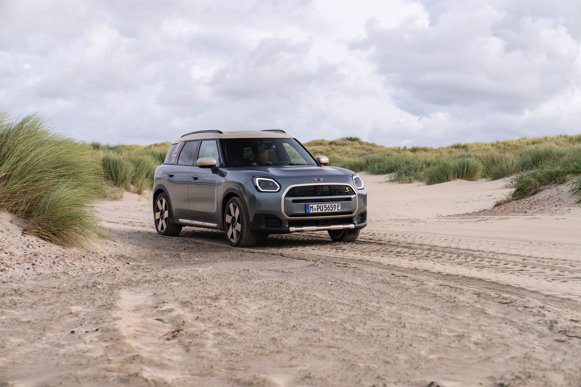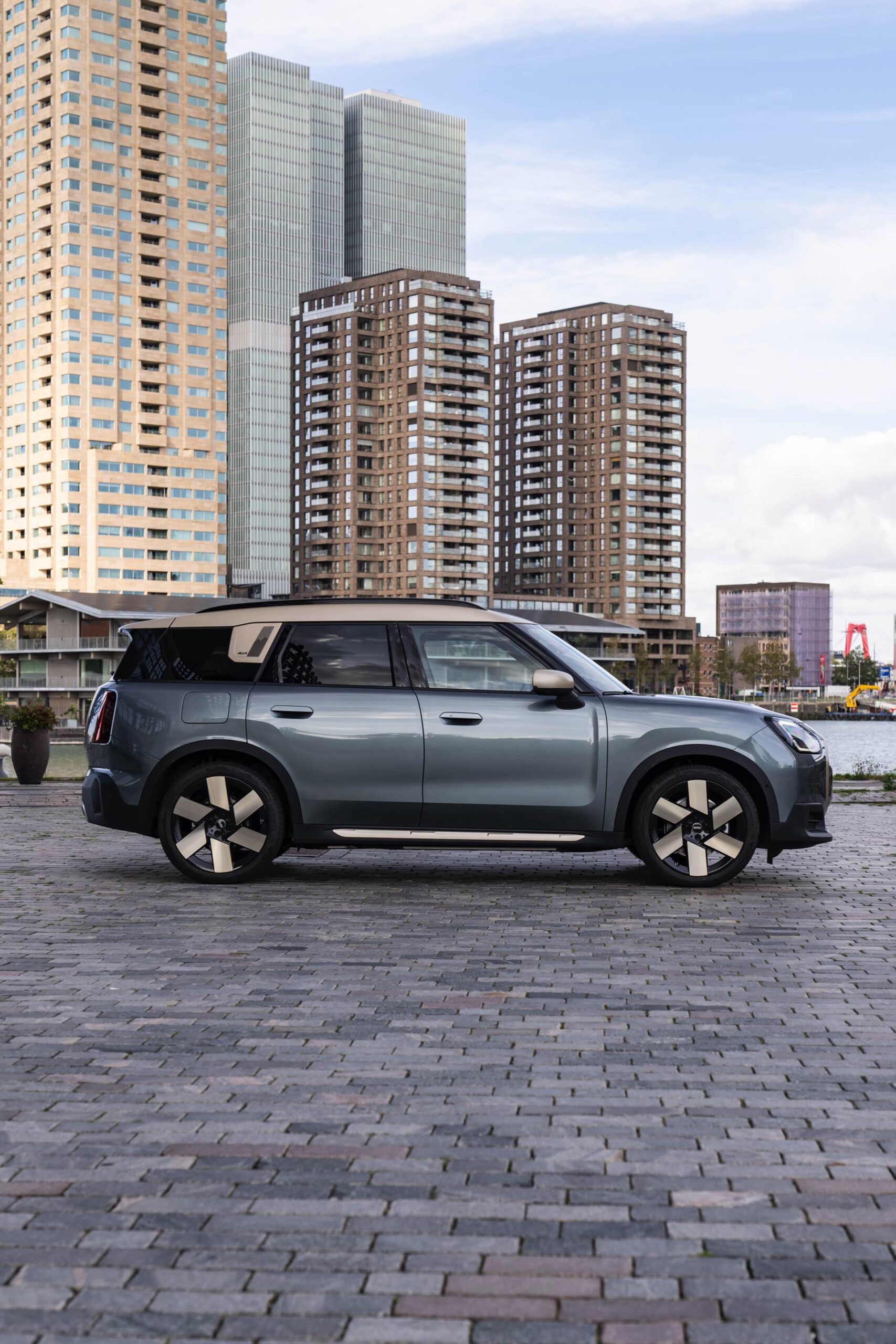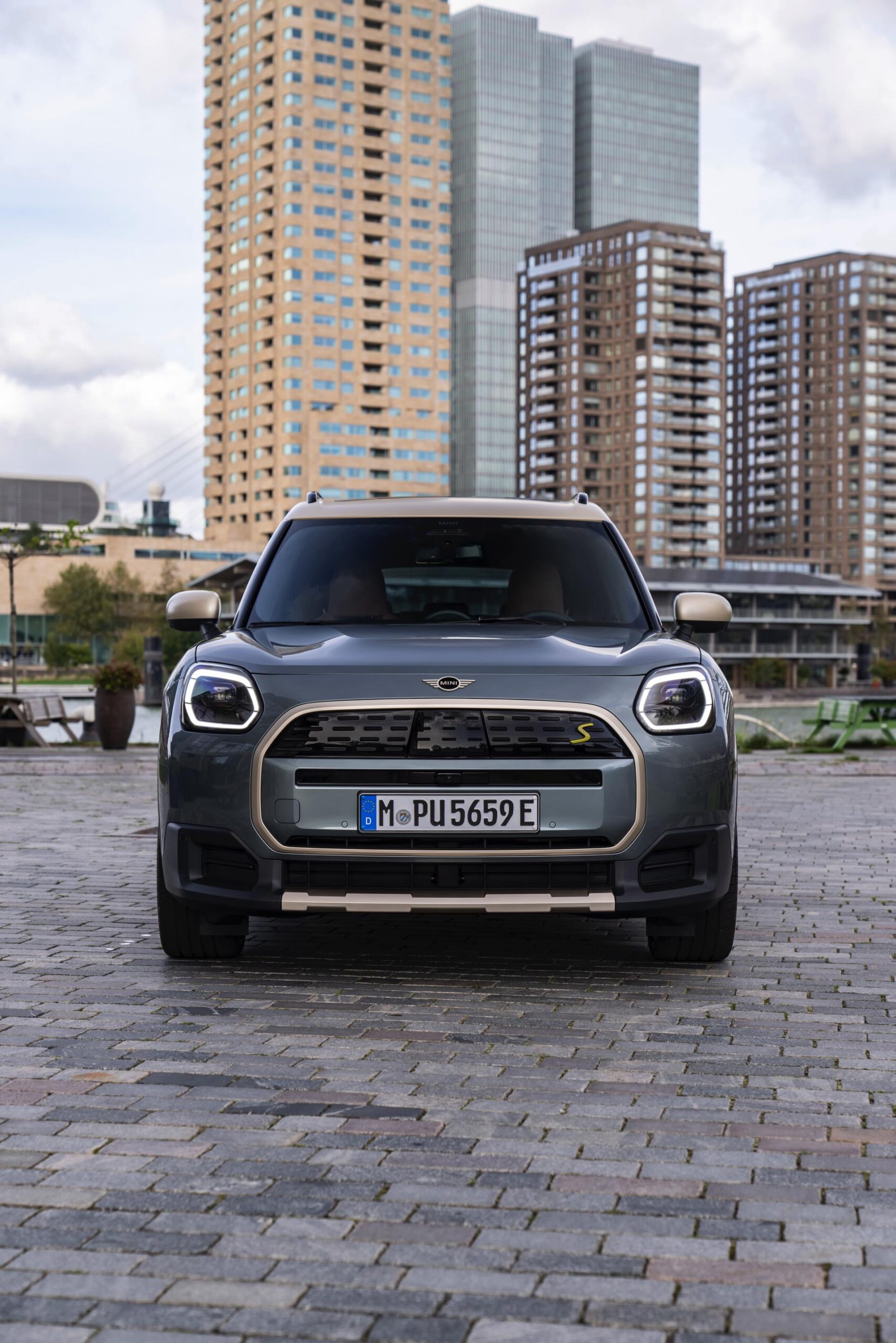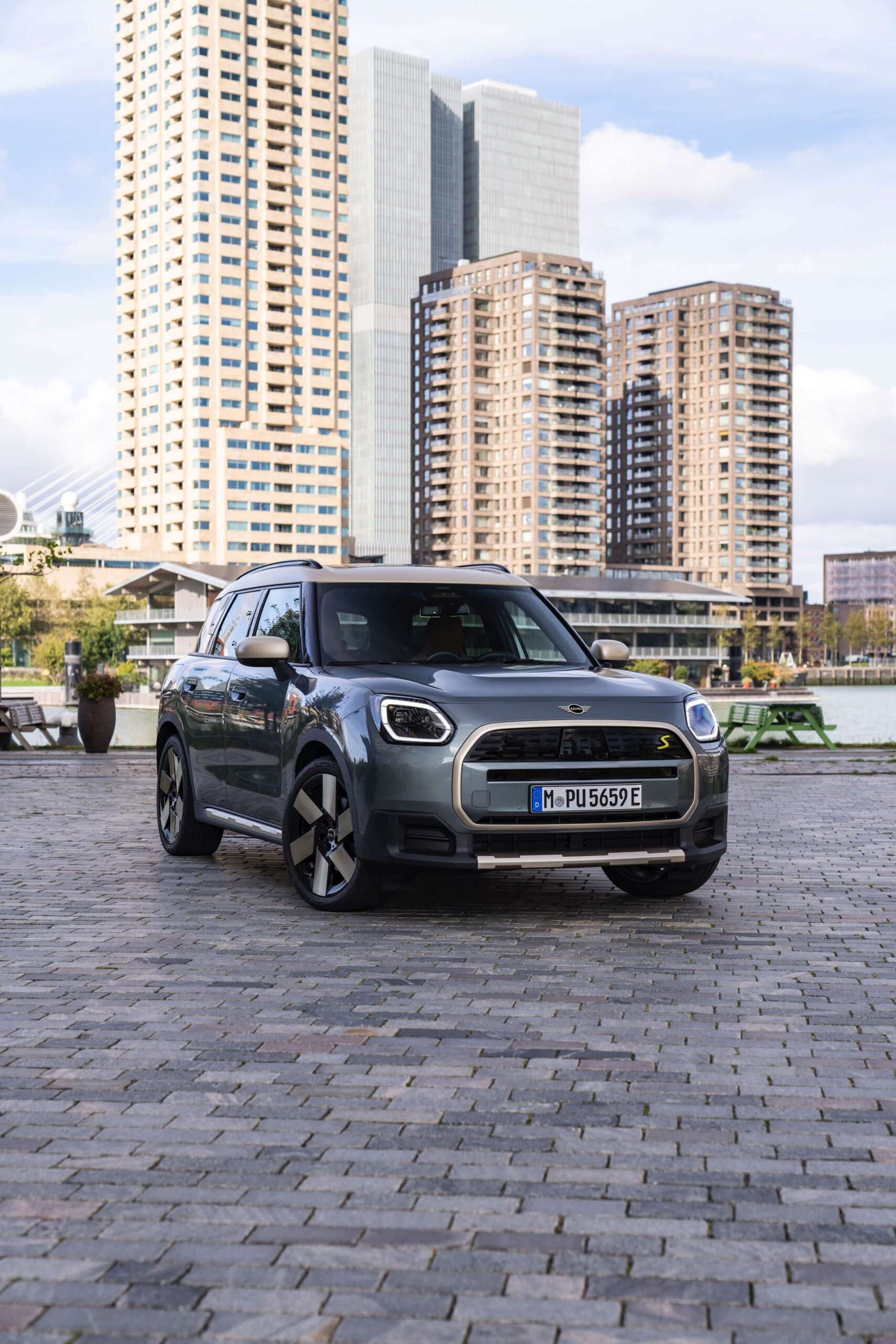 Wie sehr sich mit dem über 300 PS starken Elektro-SUV die elegante Seite betonen lässt, zeigt nun auch ein weiteres Foto-Set vom MINI Countryman in seiner Launch-Farbe Smokey Green. Das Dach, die Außenspiegel, die Einfassung des Kühlergrills und einige weitere Details sind in Vibrant Silver ausgeführt, das seidenmatt glänzt und je nach Lichteinfall durchaus an sanftes Gold erinnern kann. Auch die 20 Zoll großen Felgen greifen den eleganten Farbton auf und tragen zum edlen Gesamtlook bei.