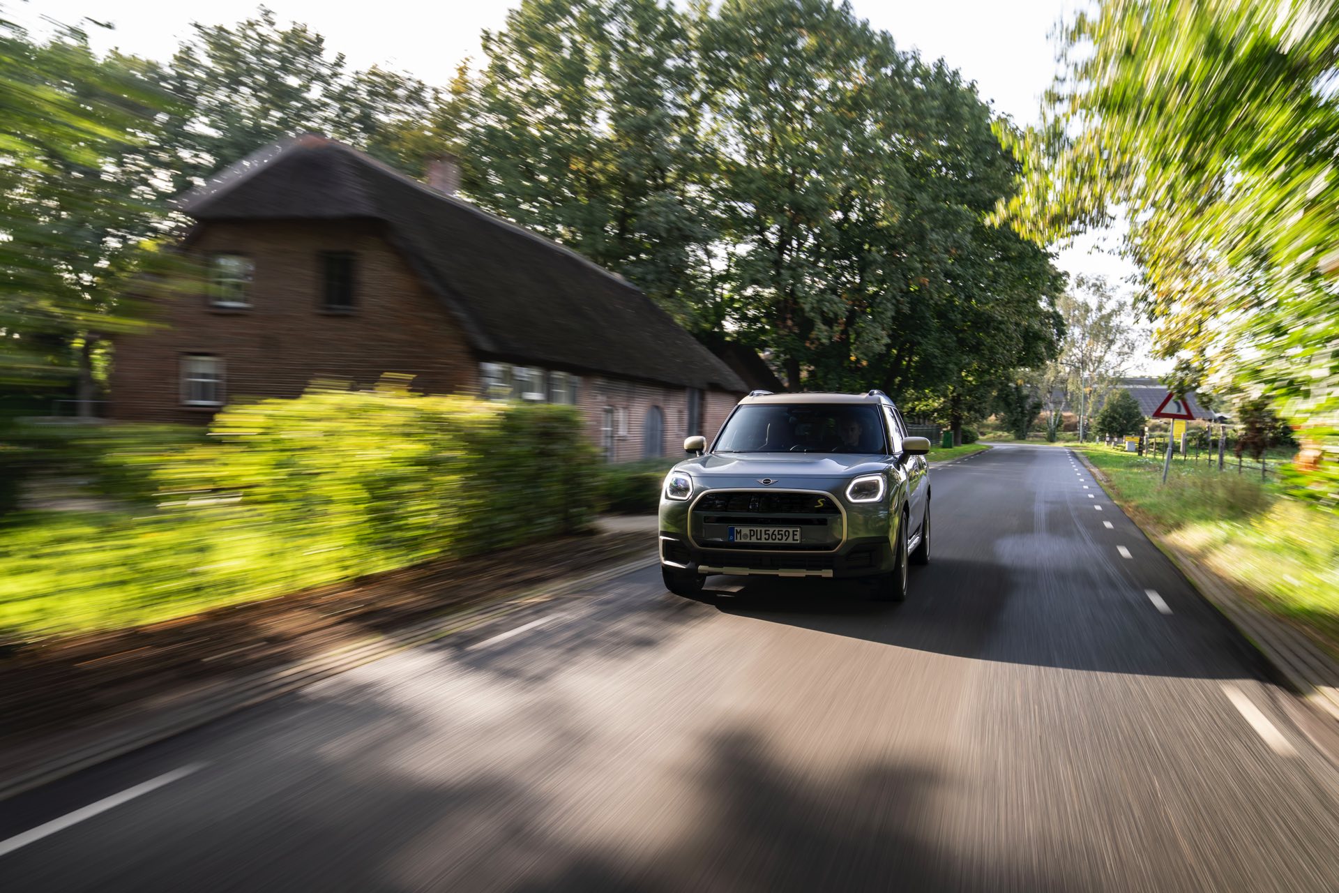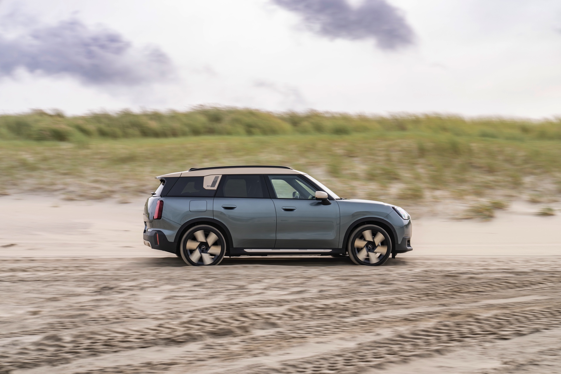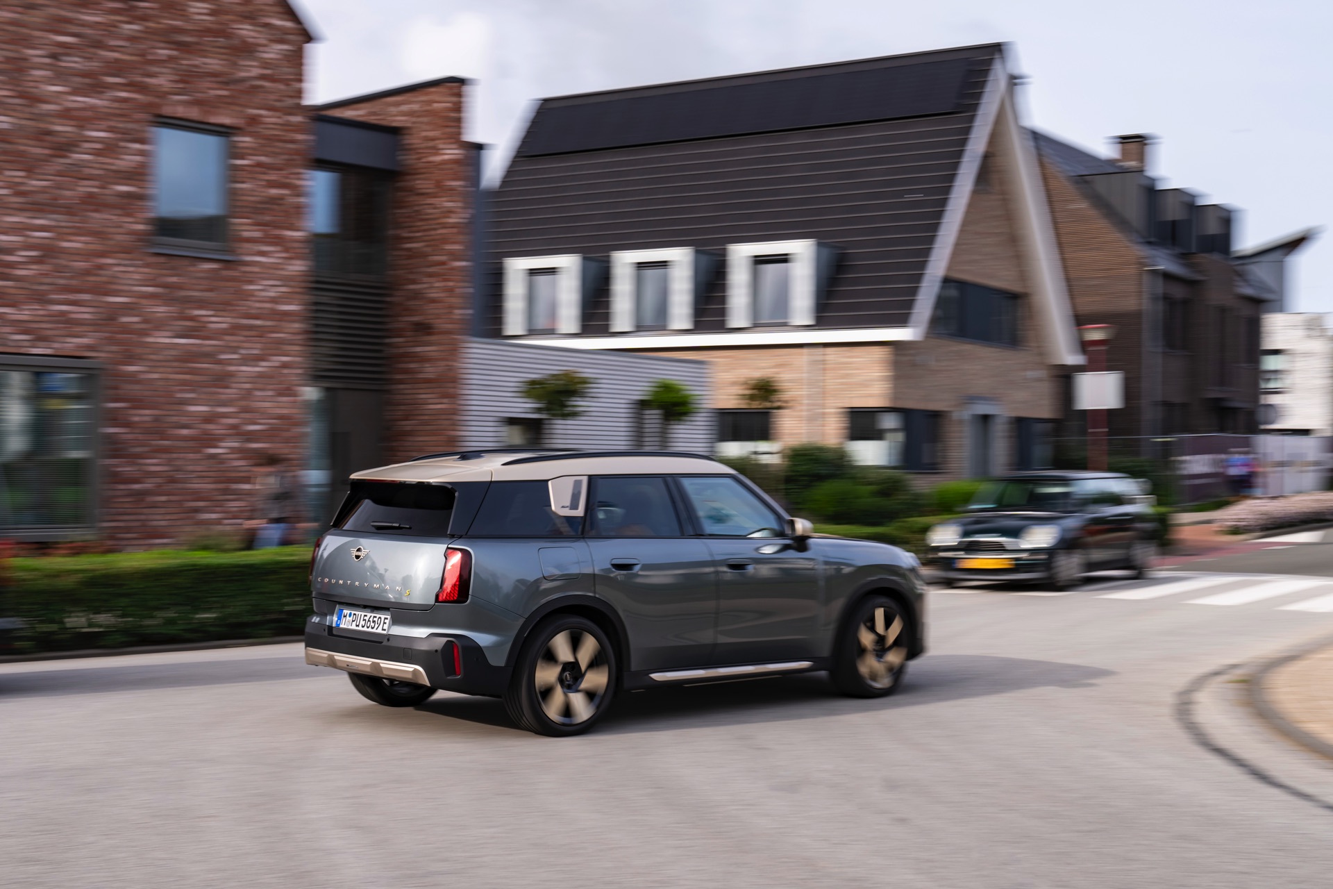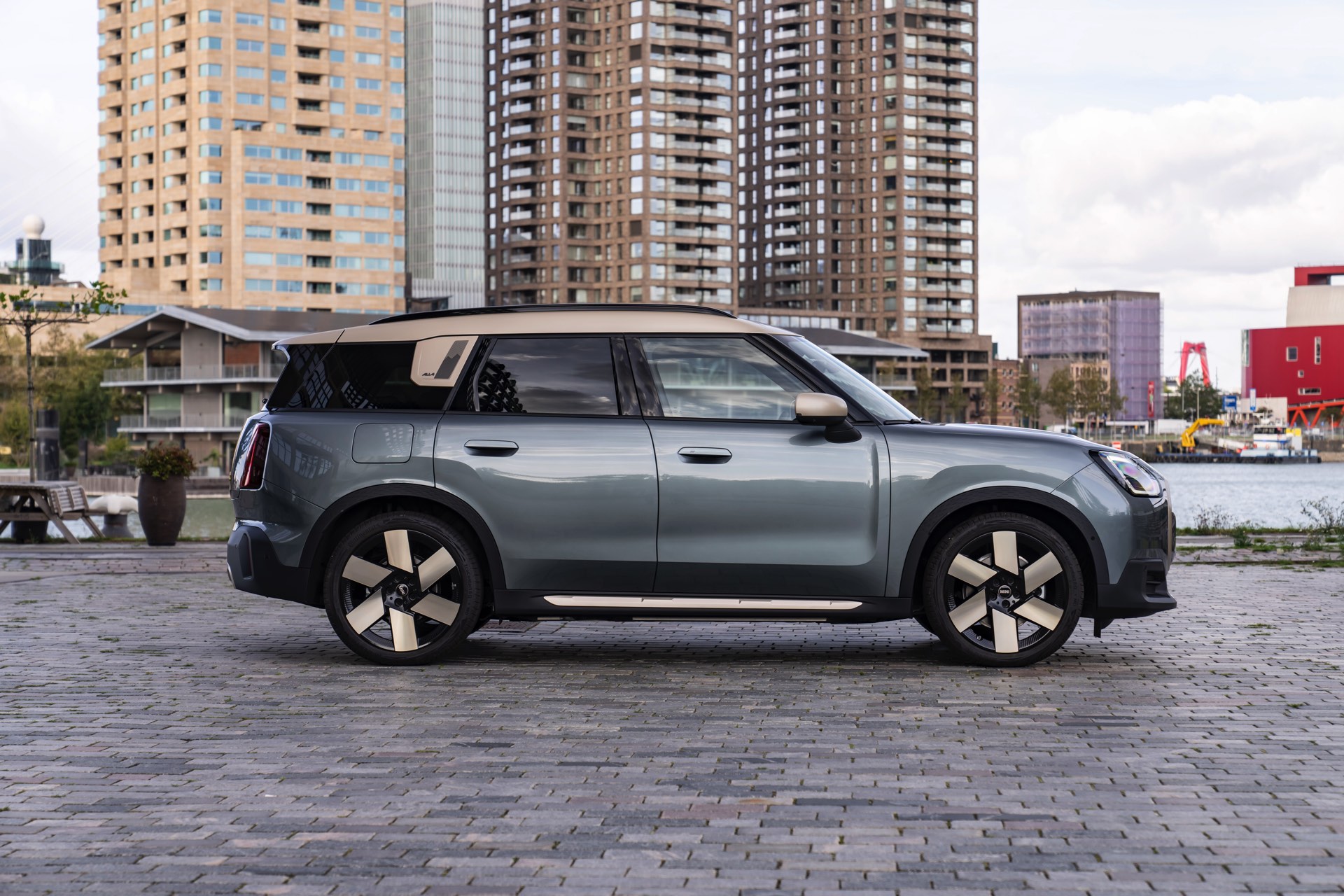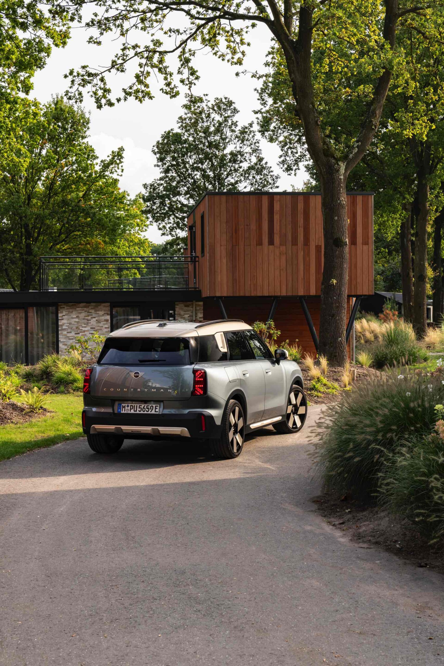 Wie sehr sich mit dem über 300 PS starken Elektro-SUV die elegante Seite betonen lässt, zeigt nun auch ein weiteres Foto-Set vom MINI Countryman in seiner Launch-Farbe Smokey Green. Das Dach, die Außenspiegel, die Einfassung des Kühlergrills und einige weitere Details sind in Vibrant Silver ausgeführt, das seidenmatt glänzt und je nach Lichteinfall durchaus an sanftes Gold erinnern kann. Auch die 20 Zoll großen Felgen greifen den eleganten Farbton auf und tragen zum edlen Gesamtlook bei.