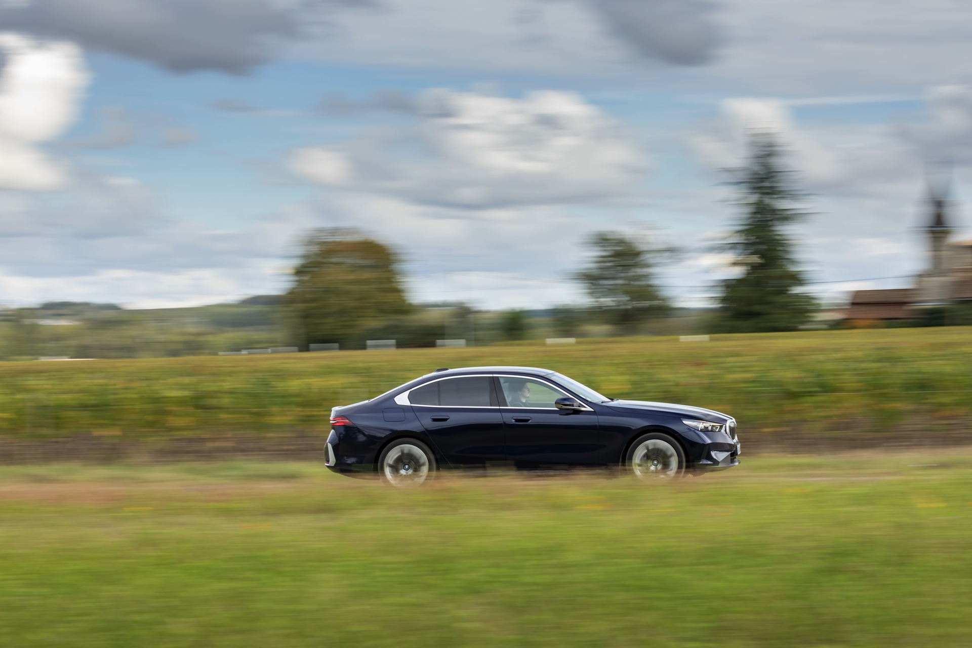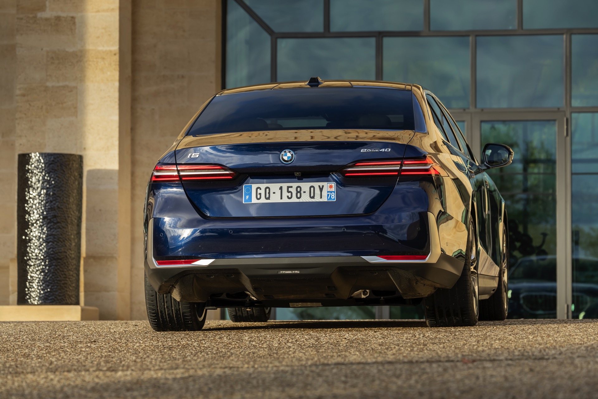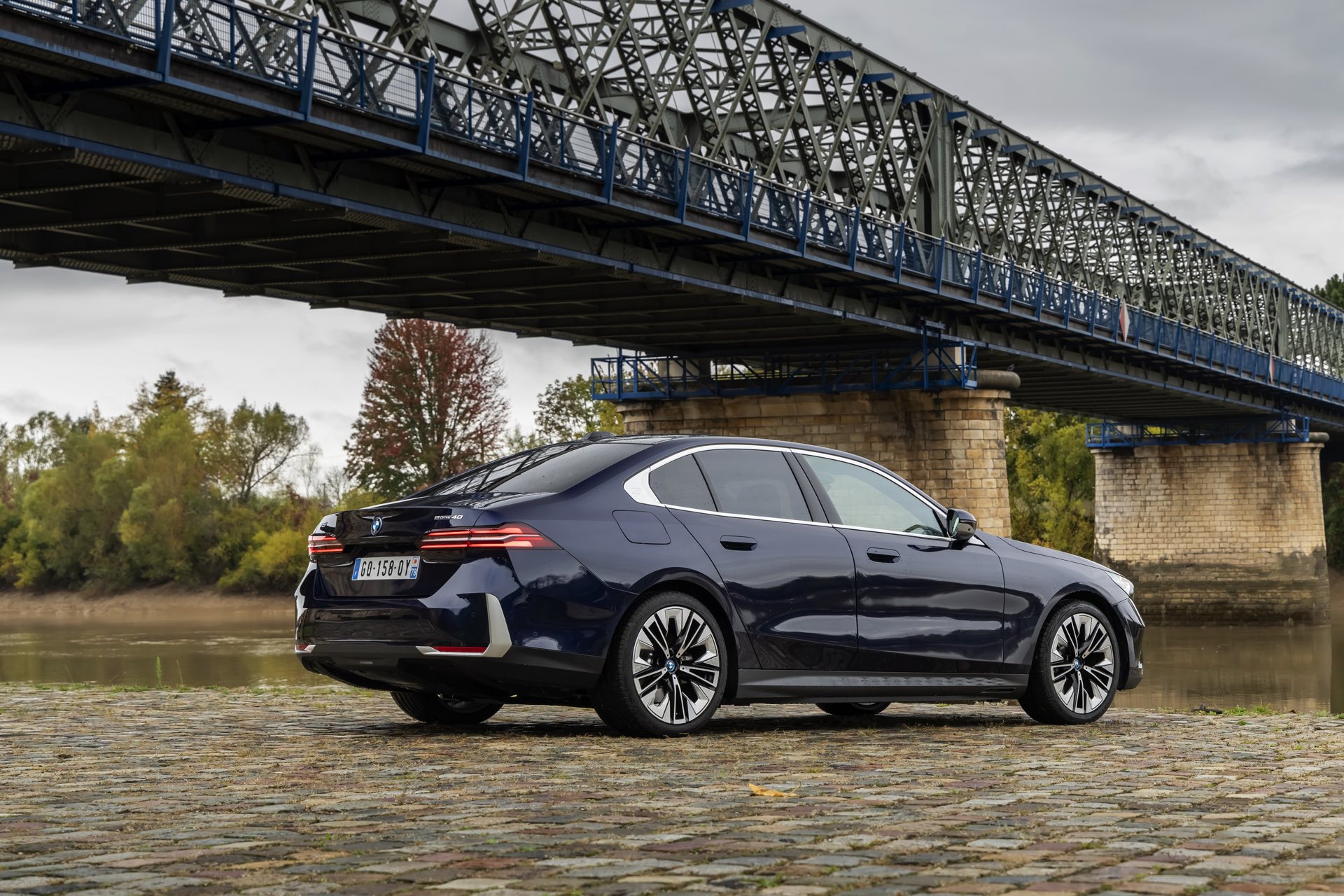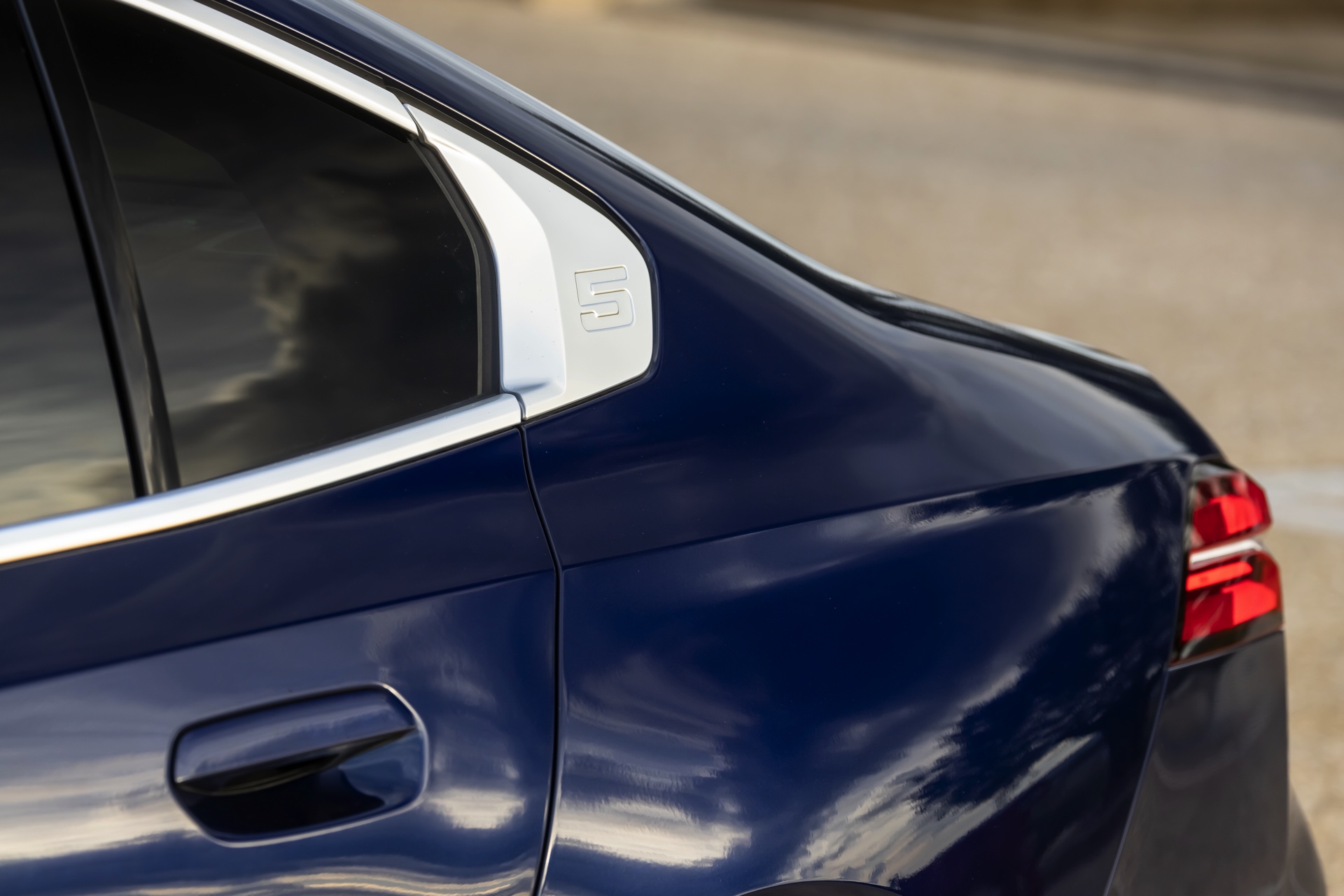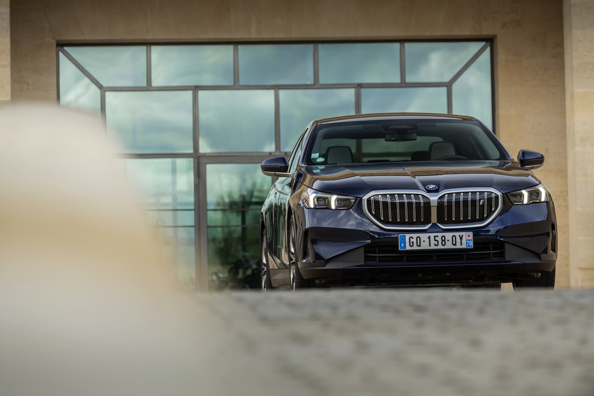 Dass der neue BMW 5er (G60) auch im Basis-Look ohne M Sport-Paket eine gute Figur machen kann, zeigt ein neues Foto-Set zum elektrischen i5. Die in Frankreich fotografierte Business-Limousine trägt die edle Lackierung in Tansanitblau Metallic und kombiniert diese mit diversen Exterieur-Details in satiniertem Aluminium. Hierzu zählen die Einfassungen von Nieren und Seitenfenstern, aber auch zwei L-förmige Elemente an den äußeren unteren Rändern der Heckschürze. Die senkrechten Nieren-Streben sind ebenfalls in einer silbernen Optik gehalten, im Fall des BMW i5 sind sie aber lediglich auf die eigentlich komplett geschlossene und in Schwarz gehaltene Niere aufgezeichnet.