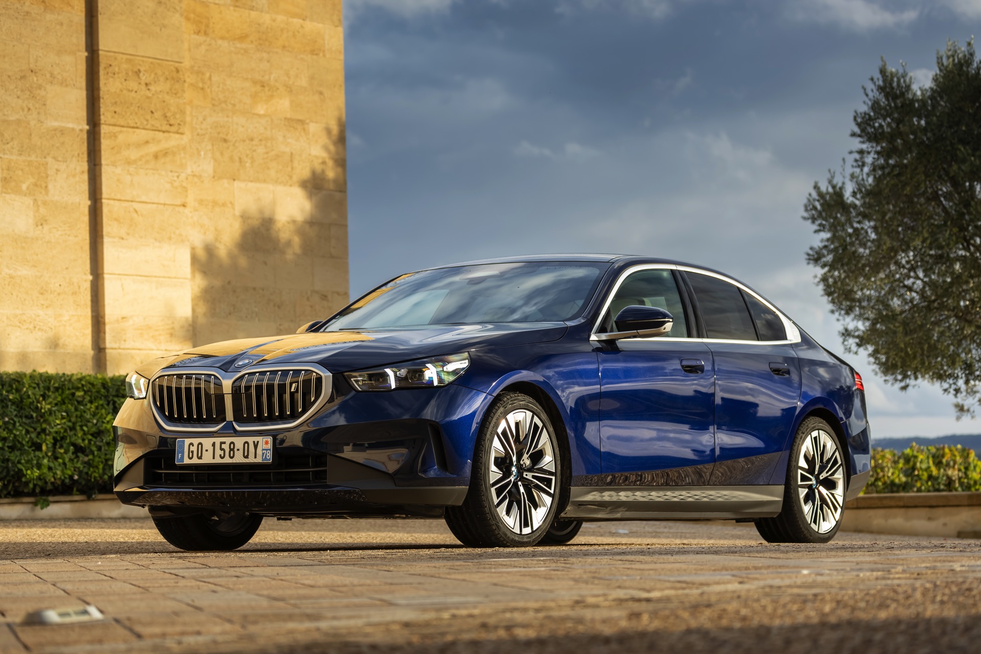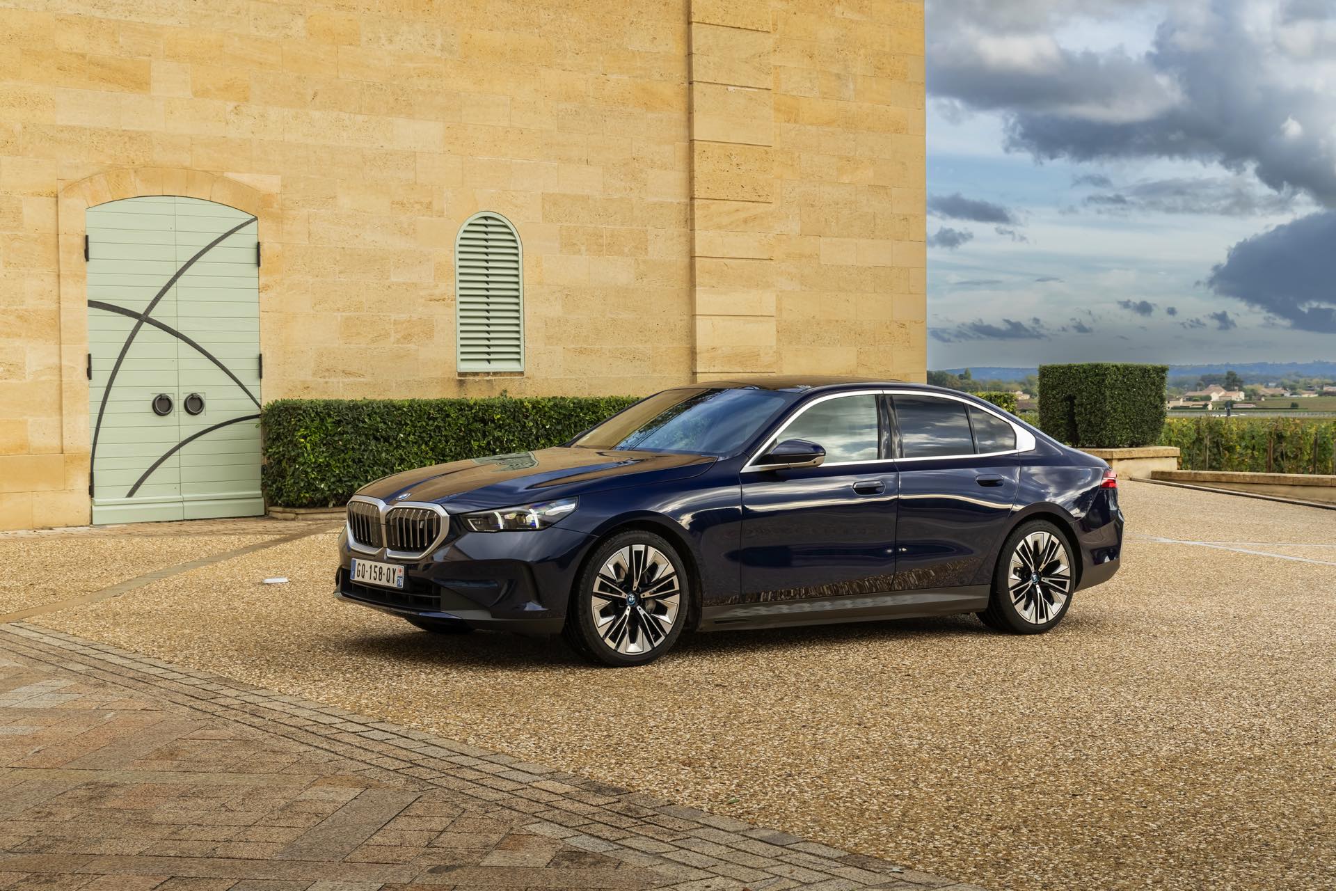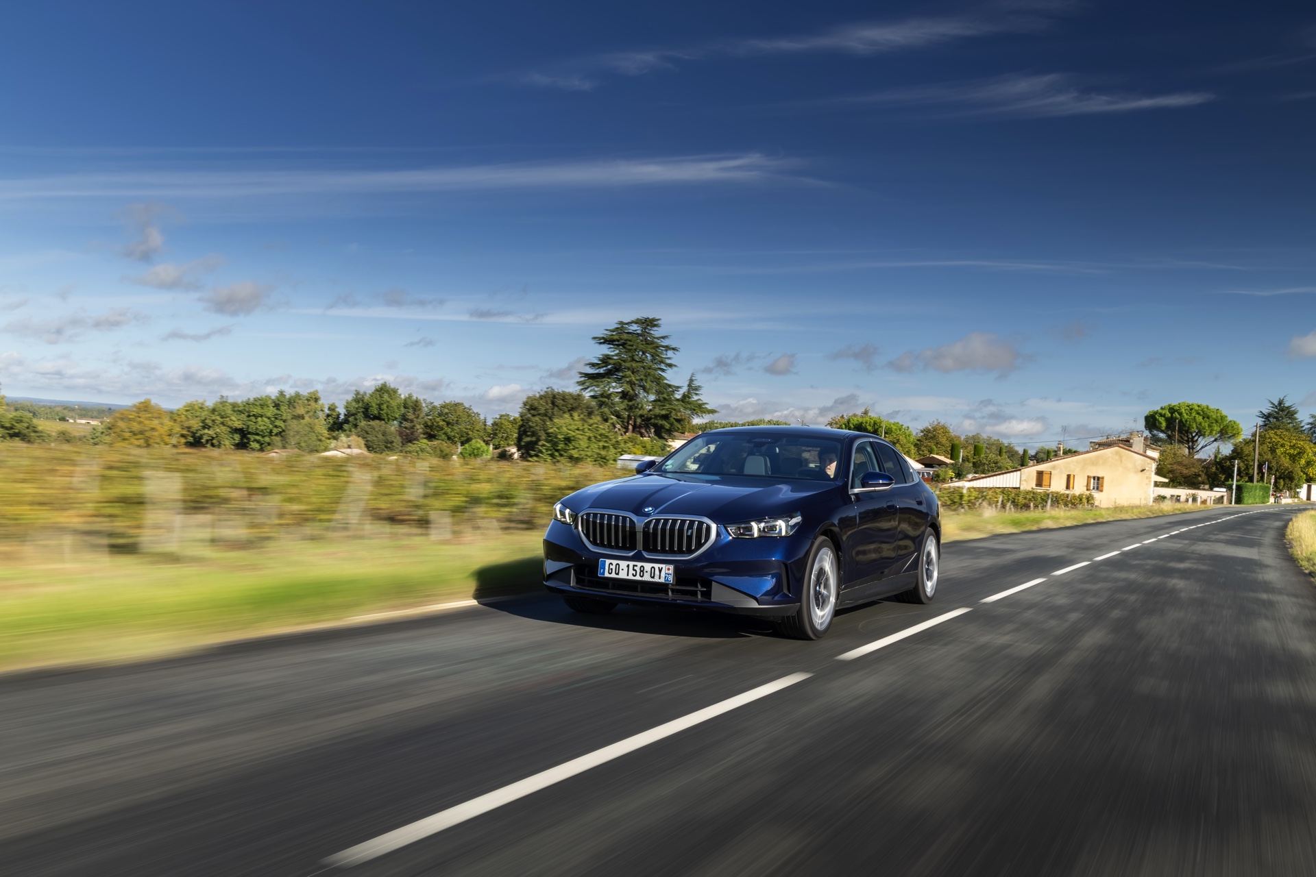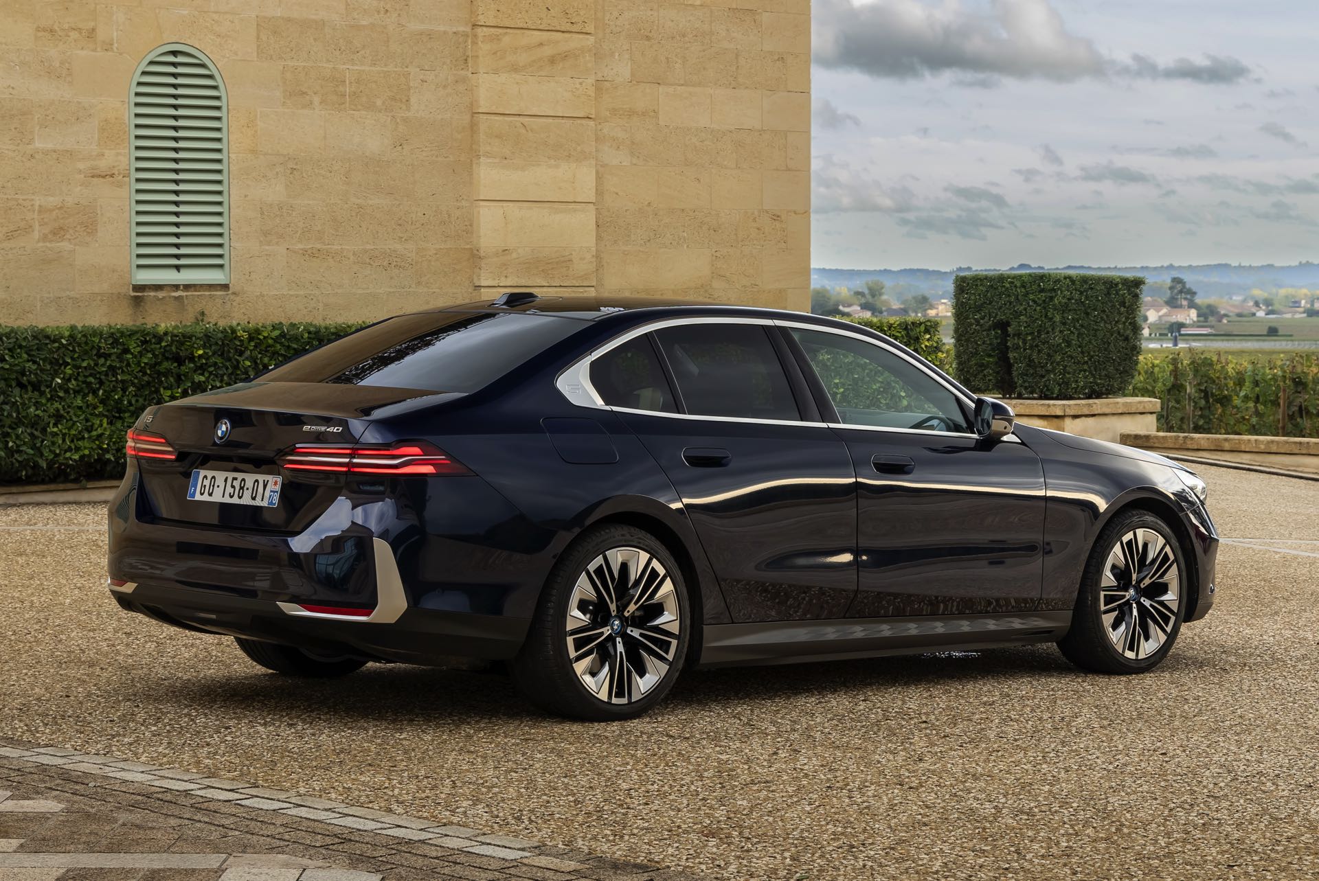 Dass der neue BMW 5er (G60) auch im Basis-Look ohne M Sport-Paket eine gute Figur machen kann, zeigt ein neues Foto-Set zum elektrischen i5. Die in Frankreich fotografierte Business-Limousine trägt die edle Lackierung in Tansanitblau Metallic und kombiniert diese mit diversen Exterieur-Details in satiniertem Aluminium. Hierzu zählen die Einfassungen von Nieren und Seitenfenstern, aber auch zwei L-förmige Elemente an den äußeren unteren Rändern der Heckschürze. Die senkrechten Nieren-Streben sind ebenfalls in einer silbernen Optik gehalten, im Fall des BMW i5 sind sie aber lediglich auf die eigentlich komplett geschlossene und in Schwarz gehaltene Niere aufgezeichnet.