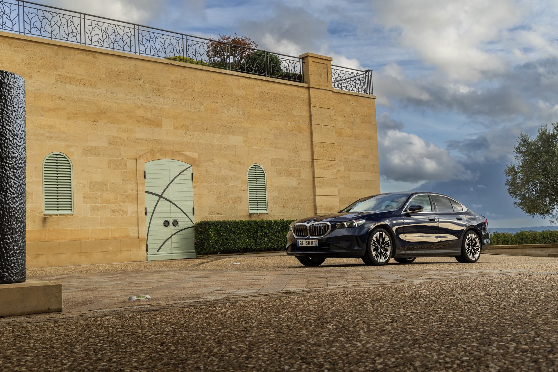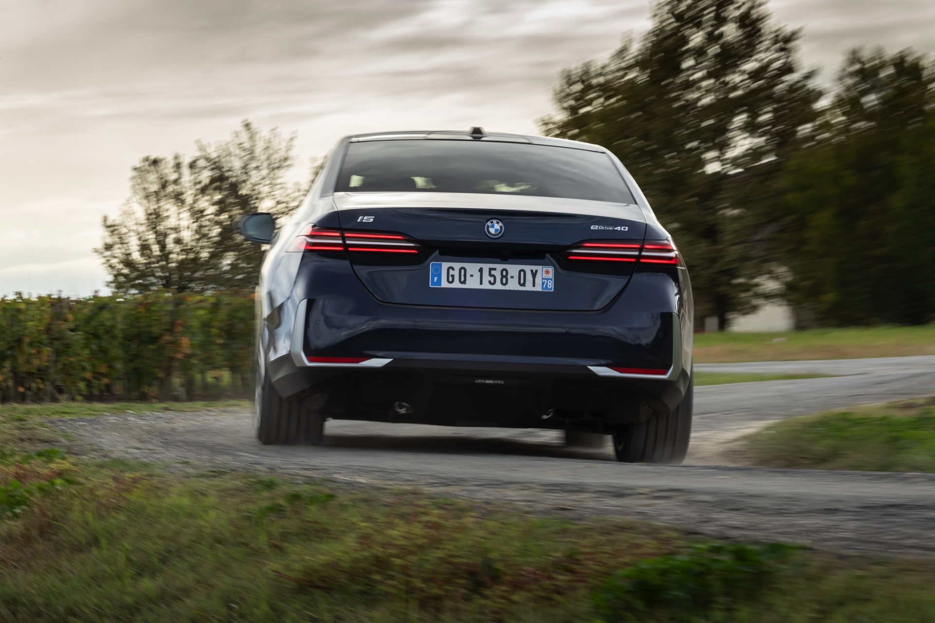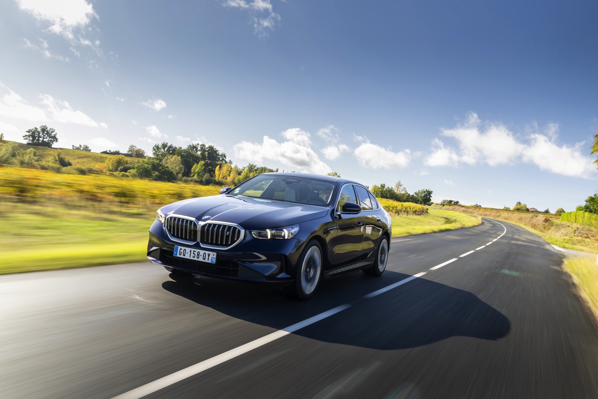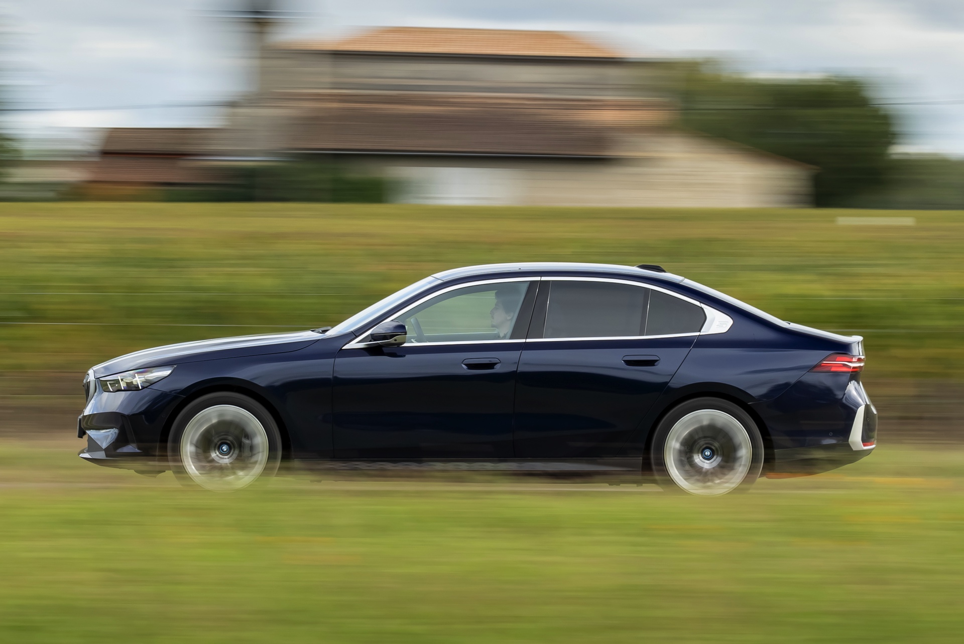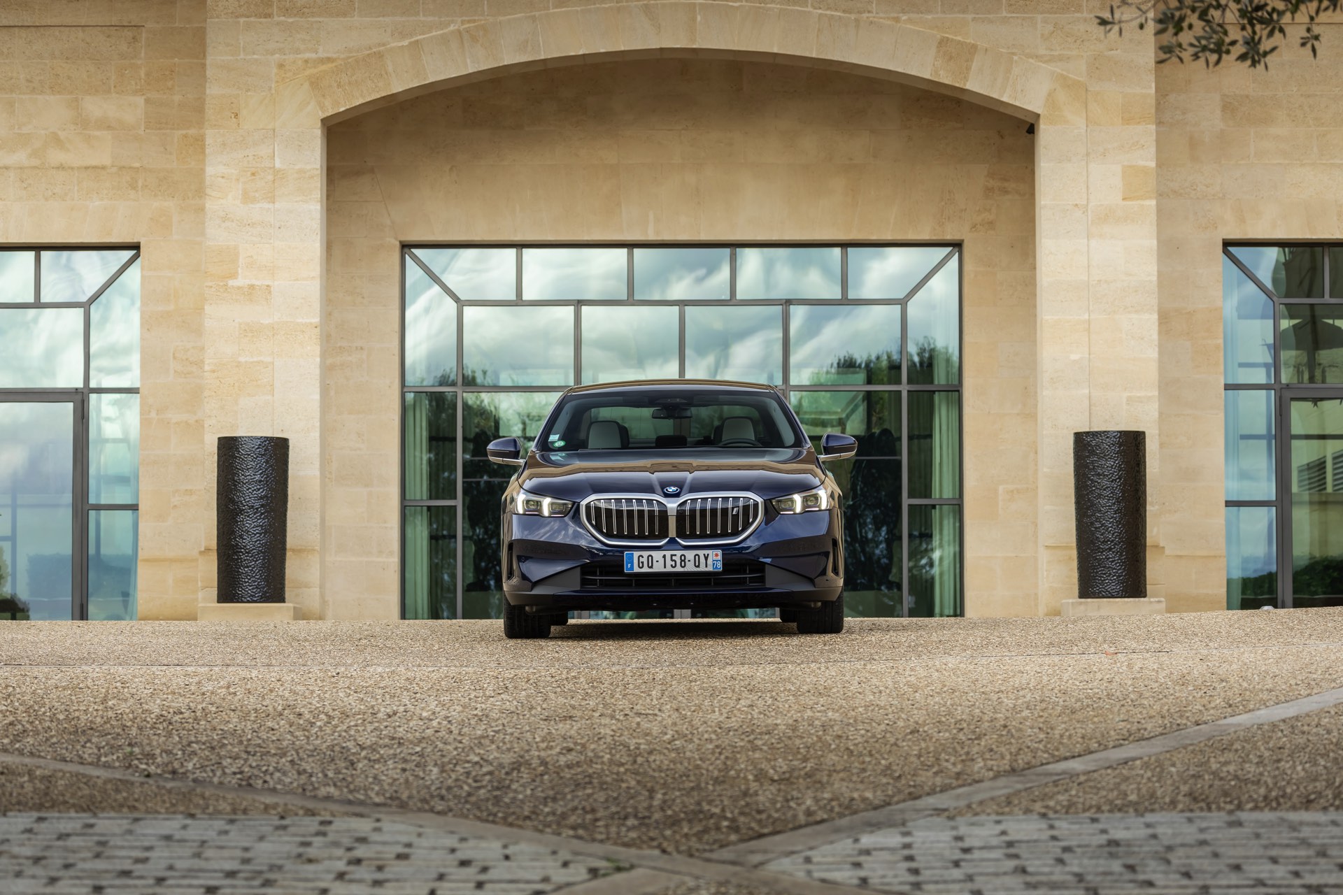 Dass der neue BMW 5er (G60) auch im Basis-Look ohne M Sport-Paket eine gute Figur machen kann, zeigt ein neues Foto-Set zum elektrischen i5. Die in Frankreich fotografierte Business-Limousine trägt die edle Lackierung in Tansanitblau Metallic und kombiniert diese mit diversen Exterieur-Details in satiniertem Aluminium. Hierzu zählen die Einfassungen von Nieren und Seitenfenstern, aber auch zwei L-förmige Elemente an den äußeren unteren Rändern der Heckschürze. Die senkrechten Nieren-Streben sind ebenfalls in einer silbernen Optik gehalten, im Fall des BMW i5 sind sie aber lediglich auf die eigentlich komplett geschlossene und in Schwarz gehaltene Niere aufgezeichnet.