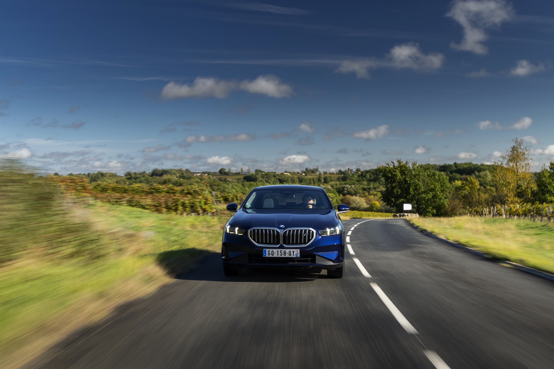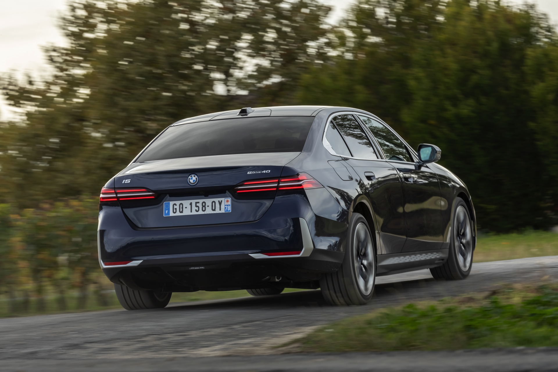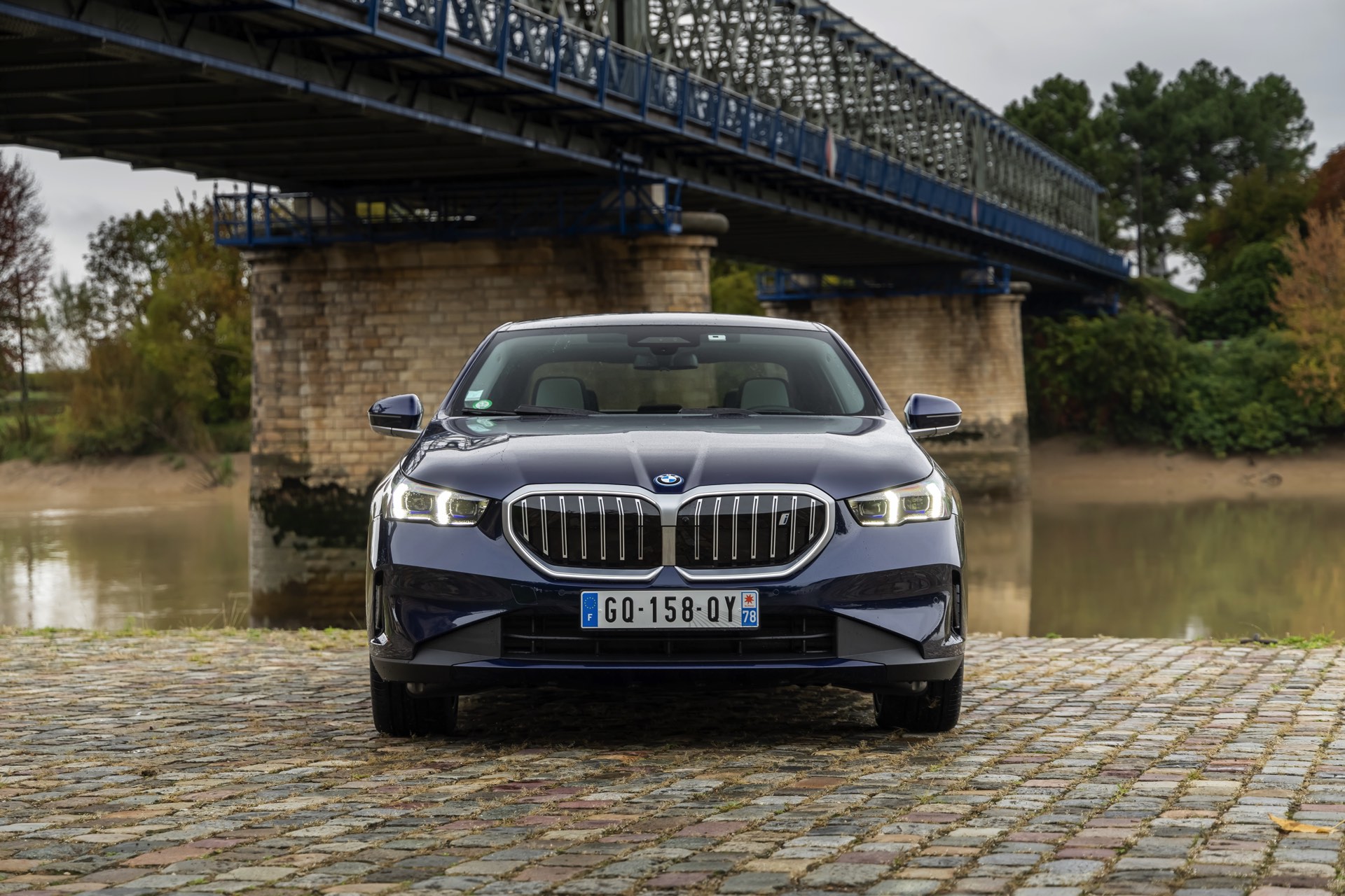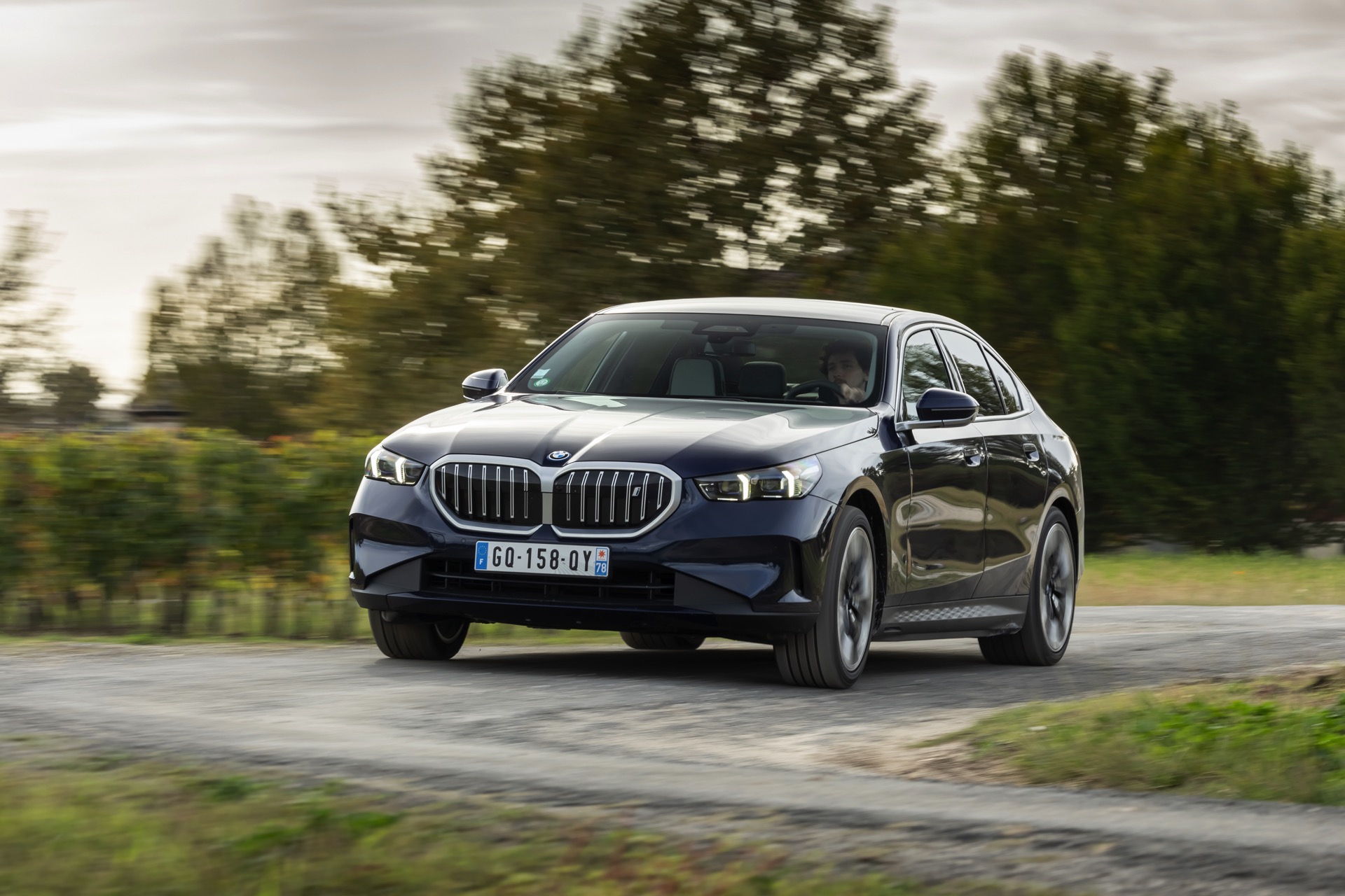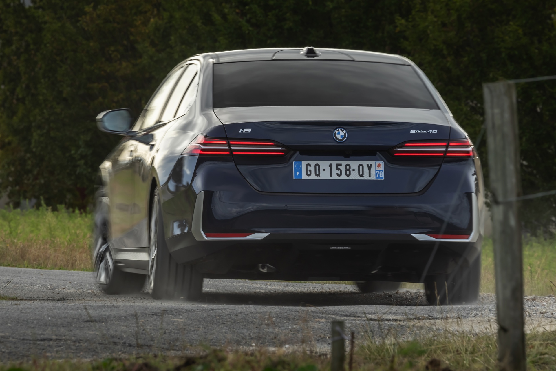 Dass der neue BMW 5er (G60) auch im Basis-Look ohne M Sport-Paket eine gute Figur machen kann, zeigt ein neues Foto-Set zum elektrischen i5. Die in Frankreich fotografierte Business-Limousine trägt die edle Lackierung in Tansanitblau Metallic und kombiniert diese mit diversen Exterieur-Details in satiniertem Aluminium. Hierzu zählen die Einfassungen von Nieren und Seitenfenstern, aber auch zwei L-förmige Elemente an den äußeren unteren Rändern der Heckschürze. Die senkrechten Nieren-Streben sind ebenfalls in einer silbernen Optik gehalten, im Fall des BMW i5 sind sie aber lediglich auf die eigentlich komplett geschlossene und in Schwarz gehaltene Niere aufgezeichnet.