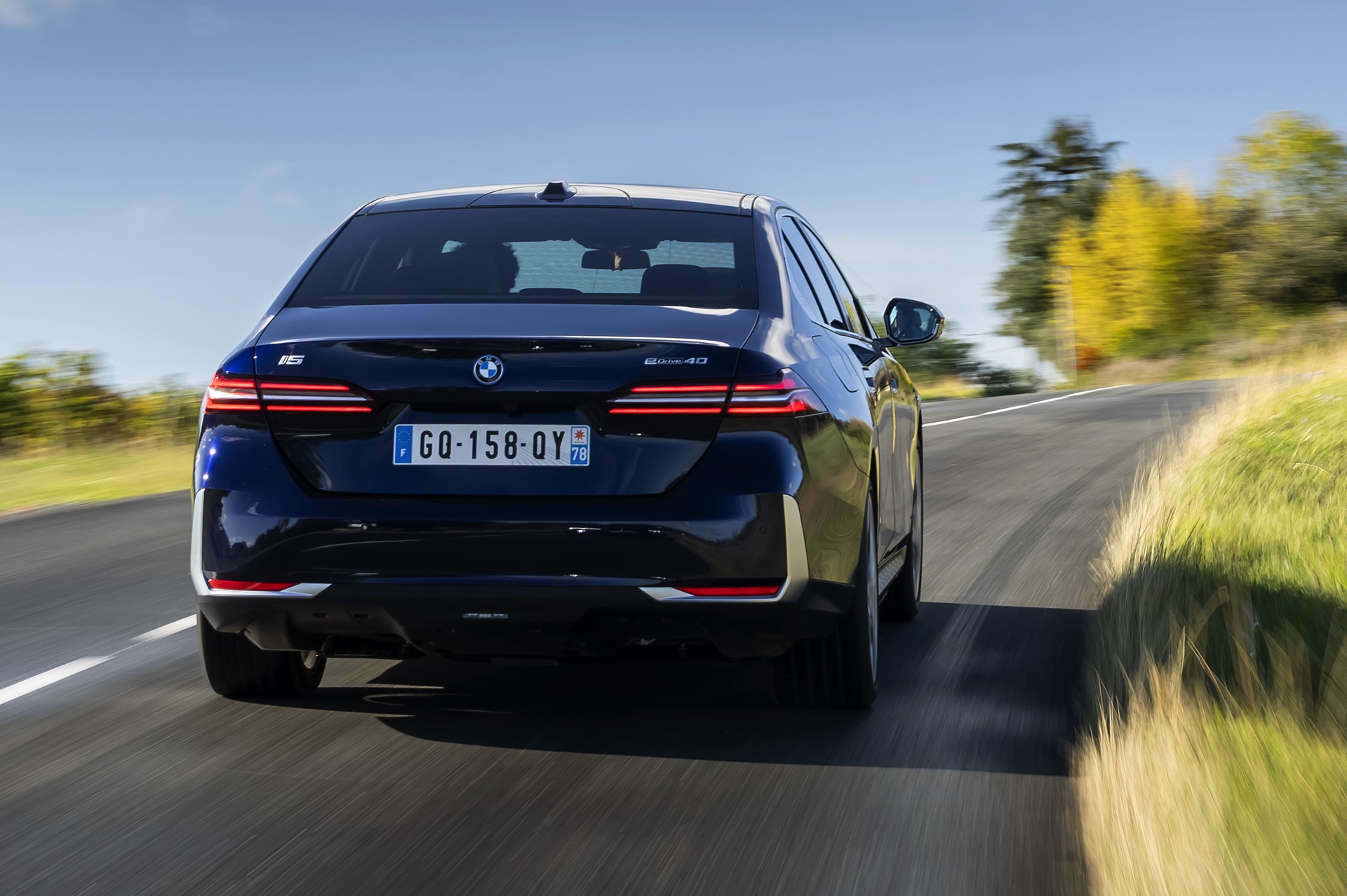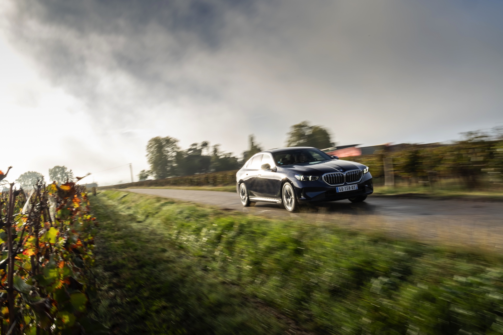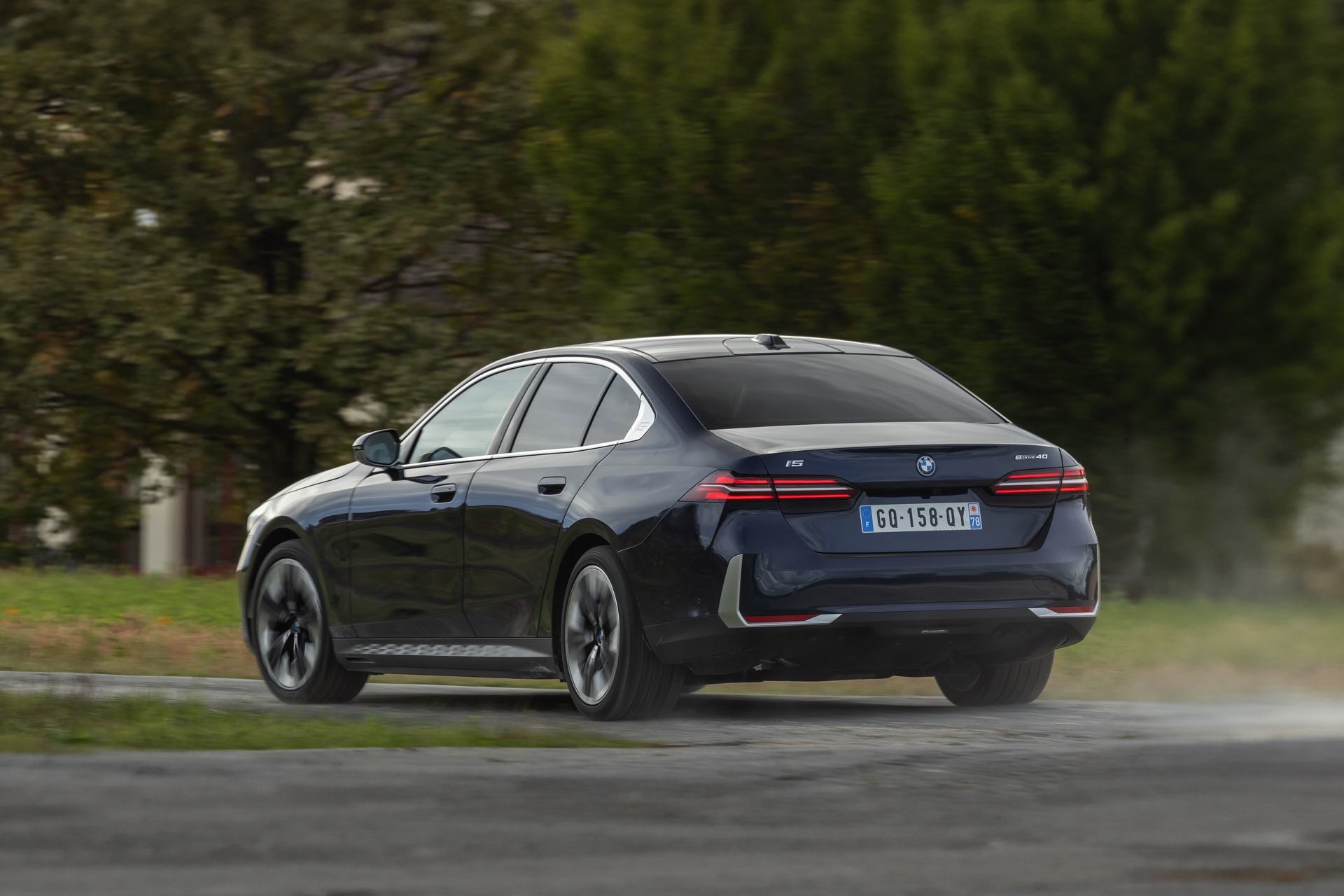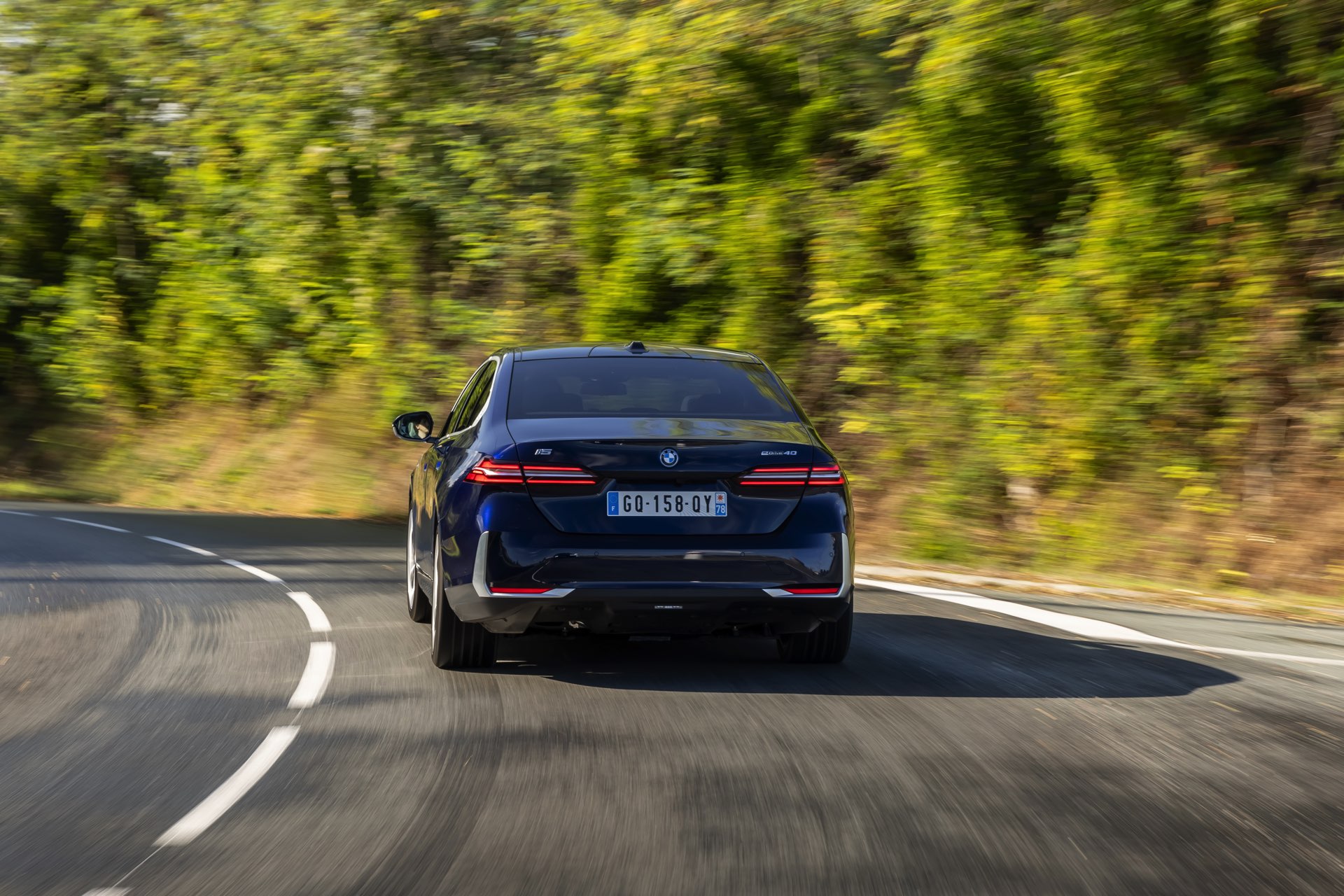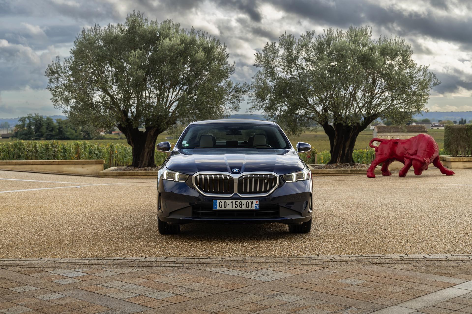Dass der neue BMW 5er (G60) auch im Basis-Look ohne M Sport-Paket eine gute Figur machen kann, zeigt ein neues Foto-Set zum elektrischen i5. Die in Frankreich fotografierte Business-Limousine trägt die edle Lackierung in Tansanitblau Metallic und kombiniert diese mit diversen Exterieur-Details in satiniertem Aluminium. Hierzu zählen die Einfassungen von Nieren und Seitenfenstern, aber auch zwei L-förmige Elemente an den äußeren unteren Rändern der Heckschürze. Die senkrechten Nieren-Streben sind ebenfalls in einer silbernen Optik gehalten, im Fall des BMW i5 sind sie aber lediglich auf die eigentlich komplett geschlossene und in Schwarz gehaltene Niere aufgezeichnet.