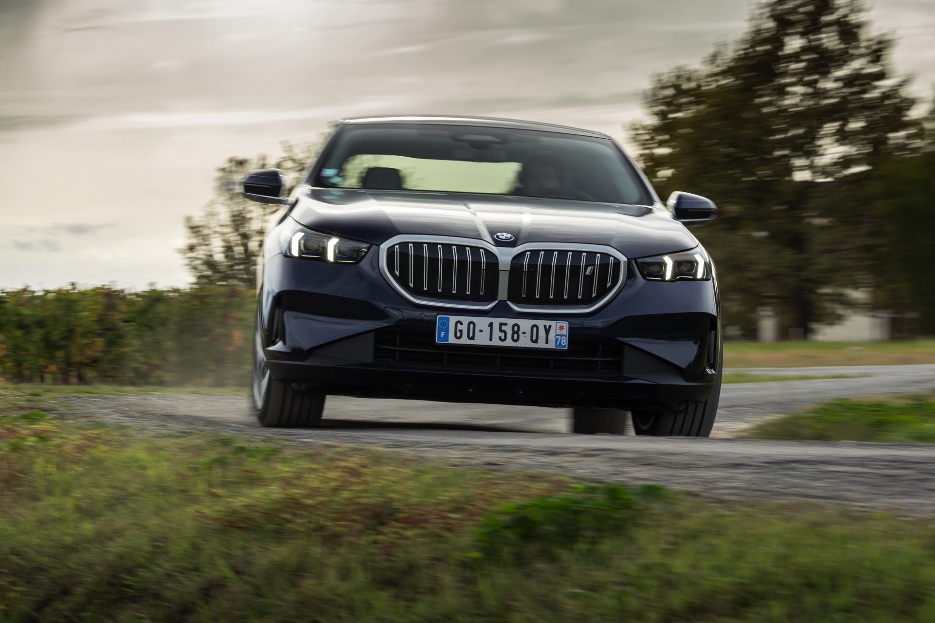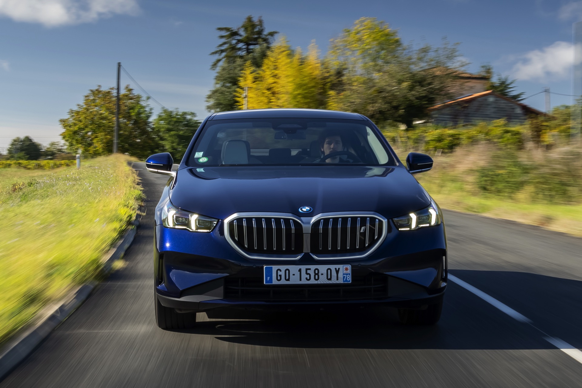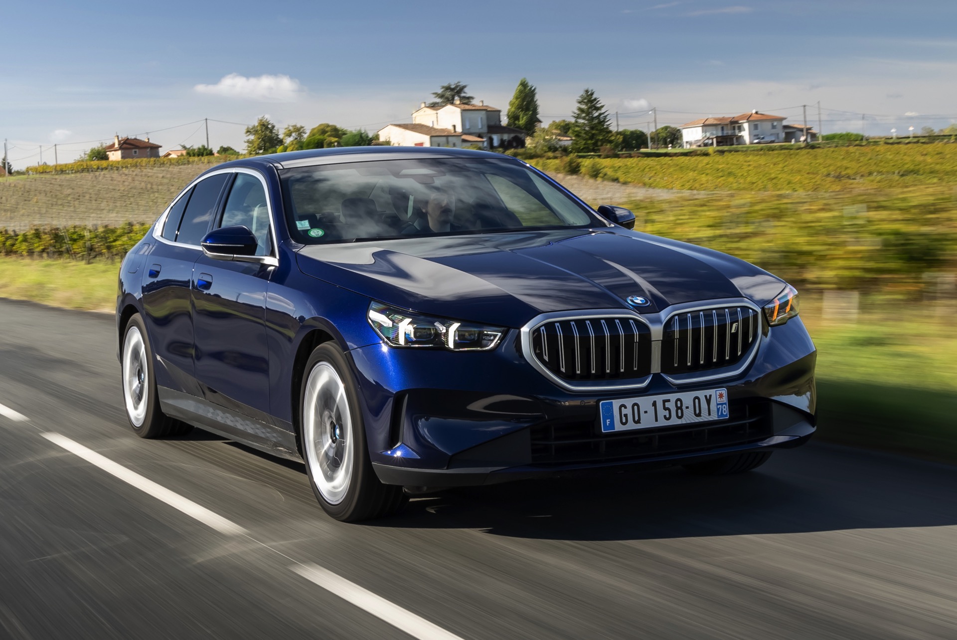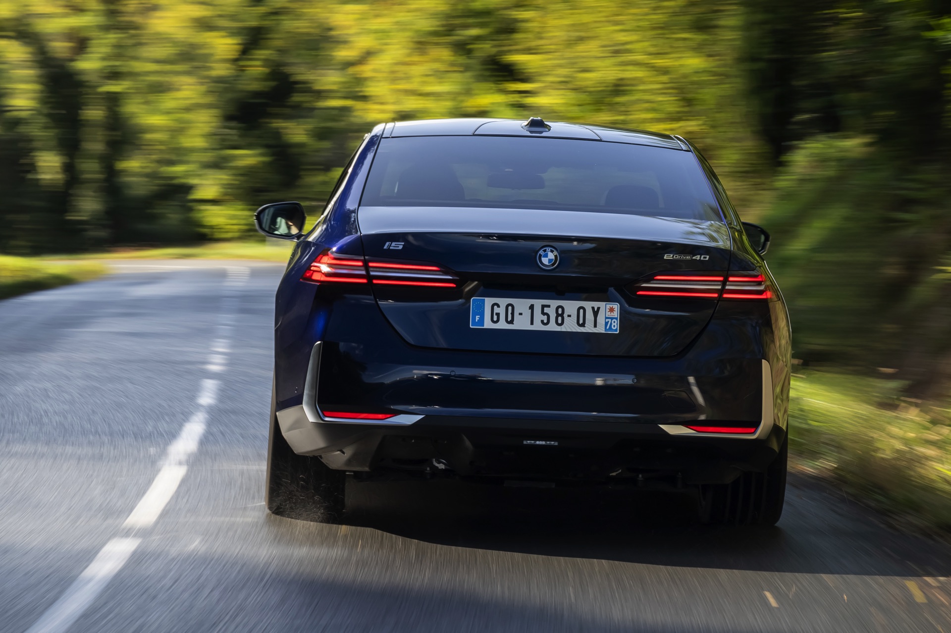 Dass der neue BMW 5er (G60) auch im Basis-Look ohne M Sport-Paket eine gute Figur machen kann, zeigt ein neues Foto-Set zum elektrischen i5. Die in Frankreich fotografierte Business-Limousine trägt die edle Lackierung in Tansanitblau Metallic und kombiniert diese mit diversen Exterieur-Details in satiniertem Aluminium. Hierzu zählen die Einfassungen von Nieren und Seitenfenstern, aber auch zwei L-förmige Elemente an den äußeren unteren Rändern der Heckschürze. Die senkrechten Nieren-Streben sind ebenfalls in einer silbernen Optik gehalten, im Fall des BMW i5 sind sie aber lediglich auf die eigentlich komplett geschlossene und in Schwarz gehaltene Niere aufgezeichnet.