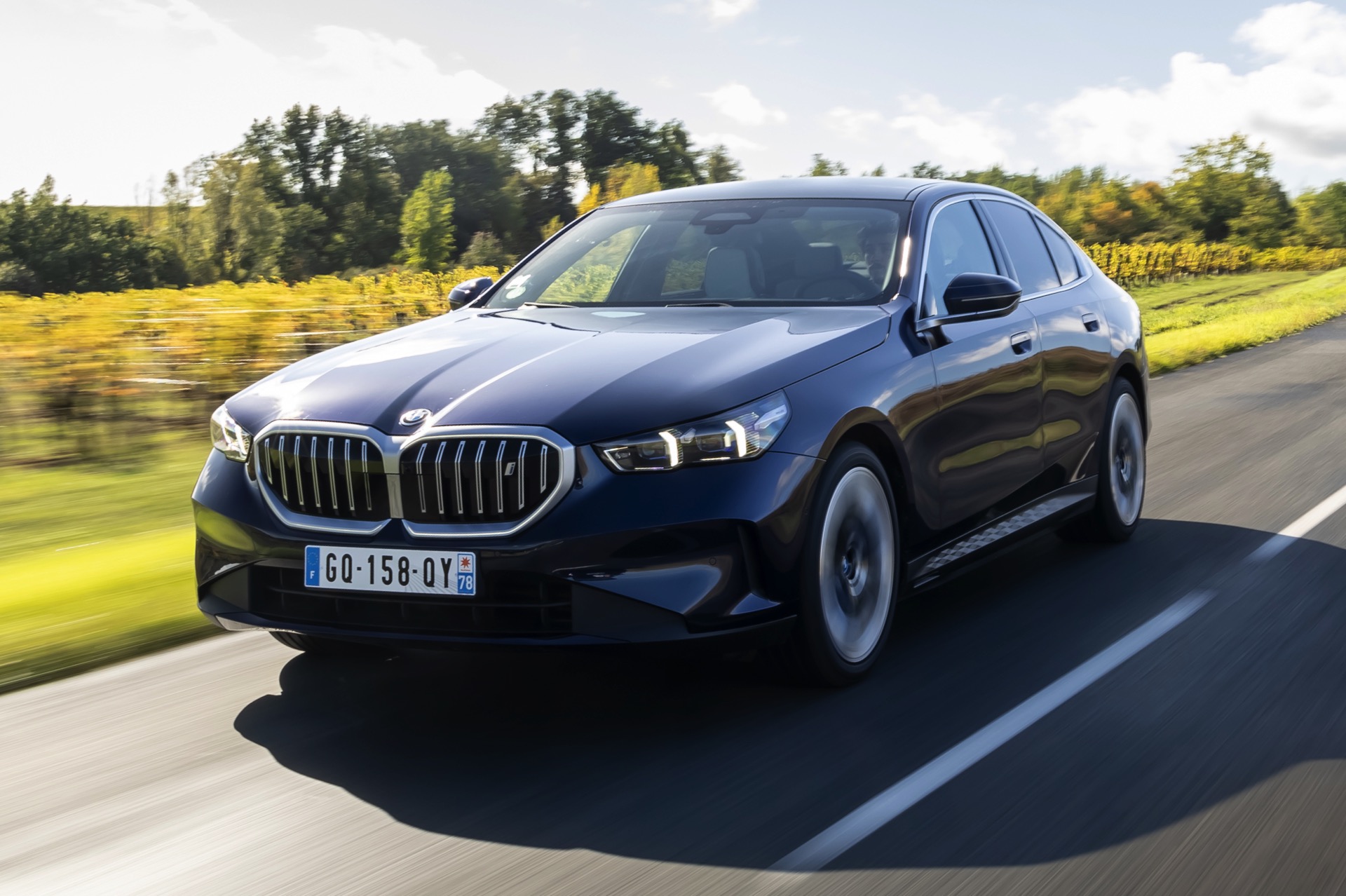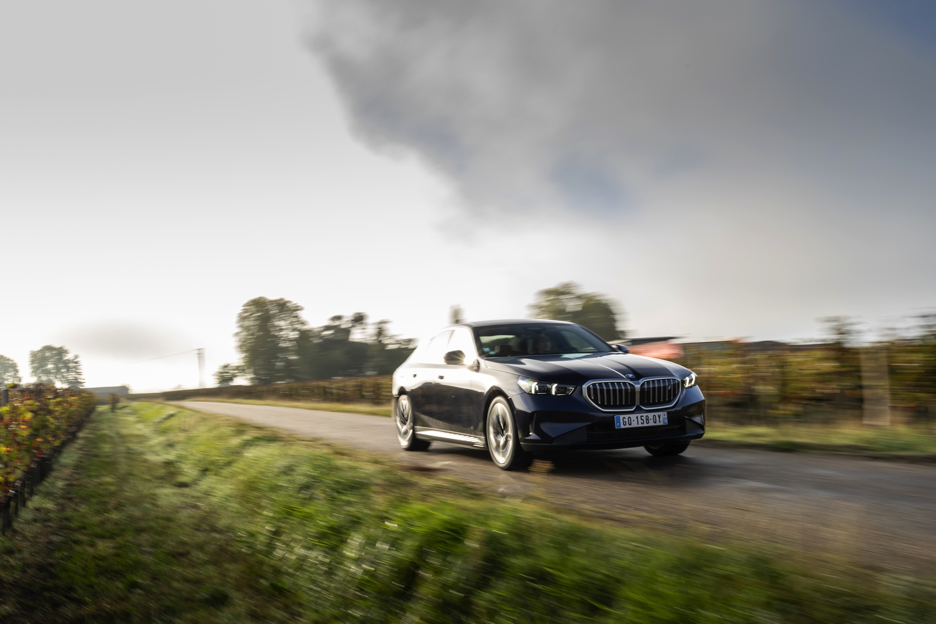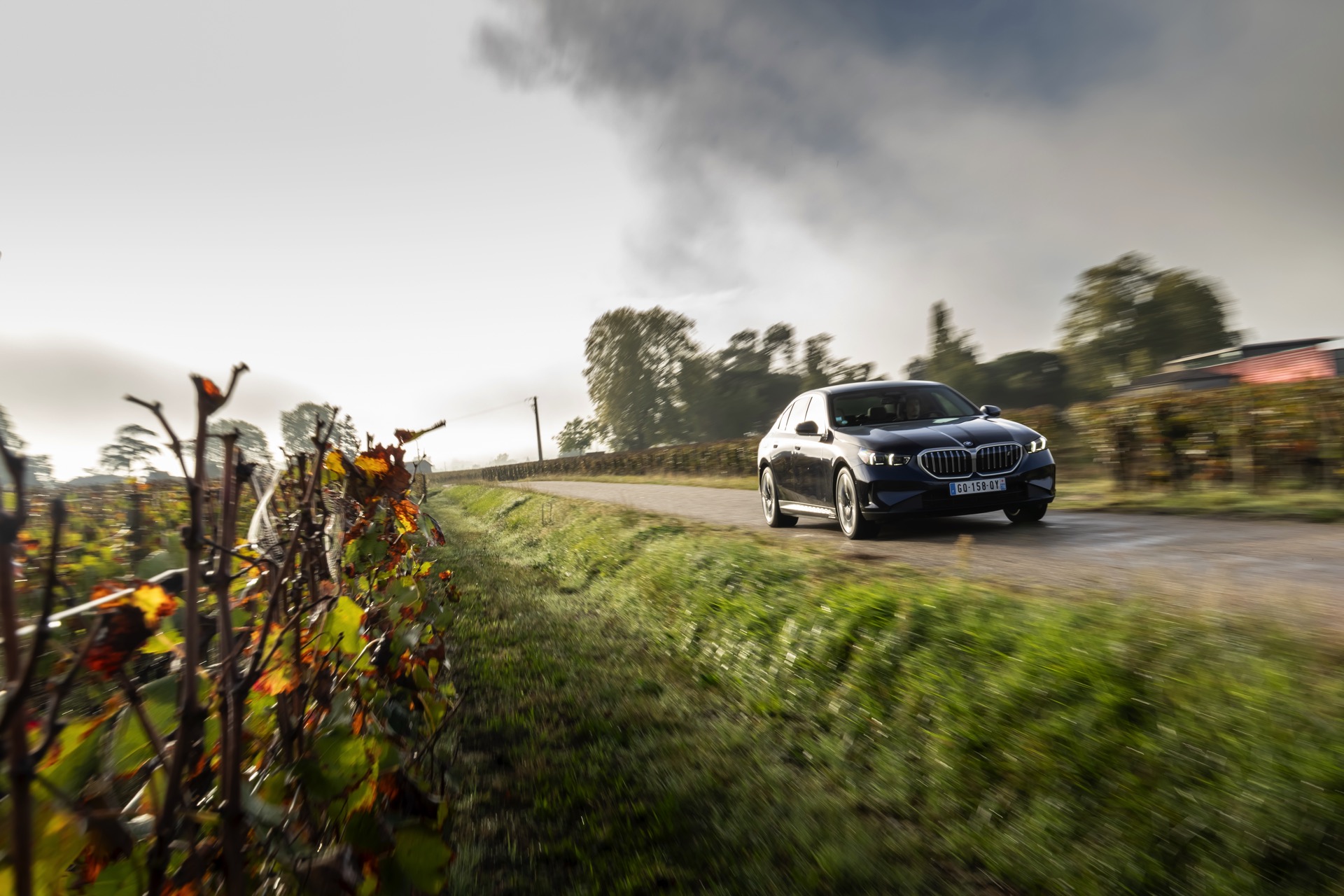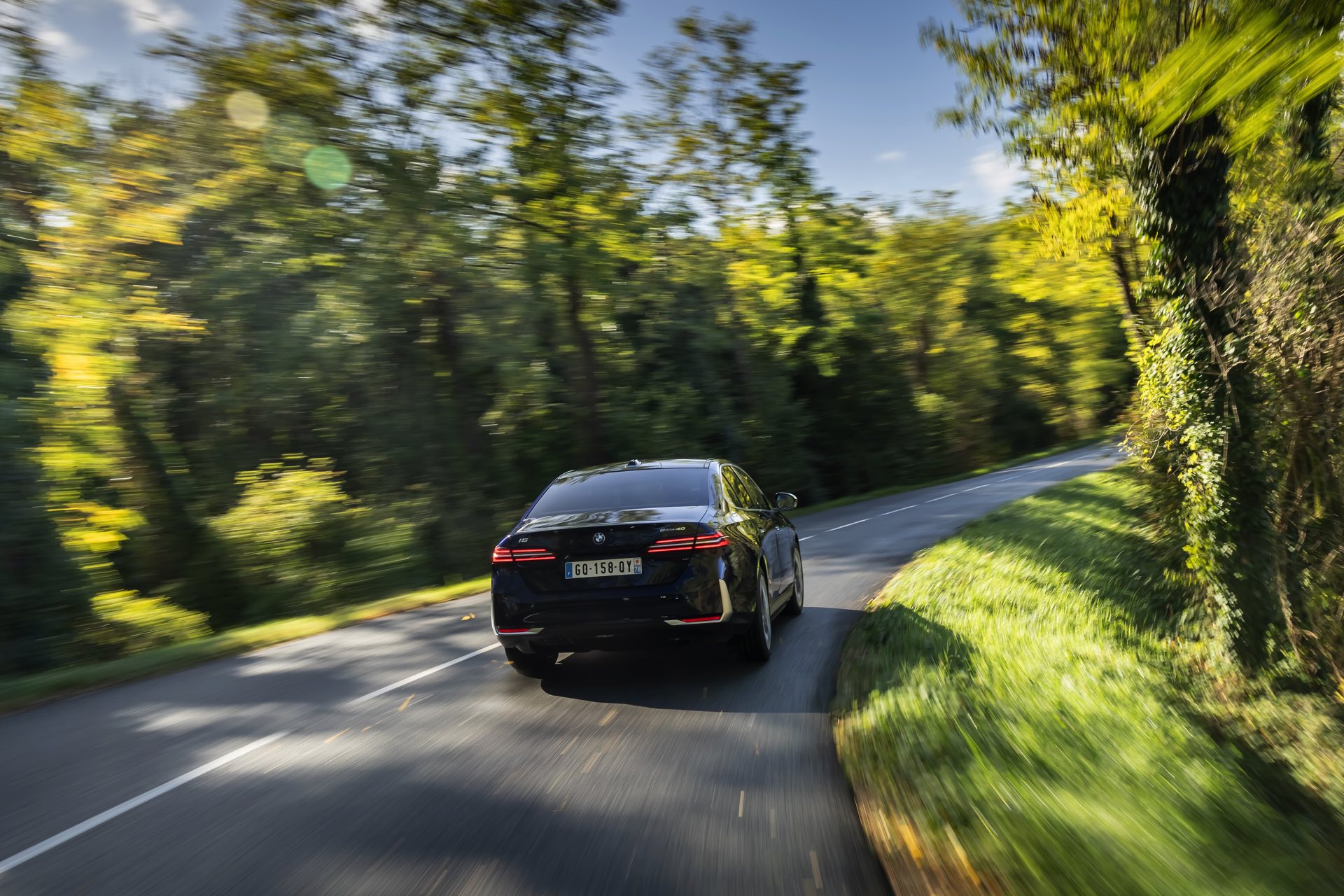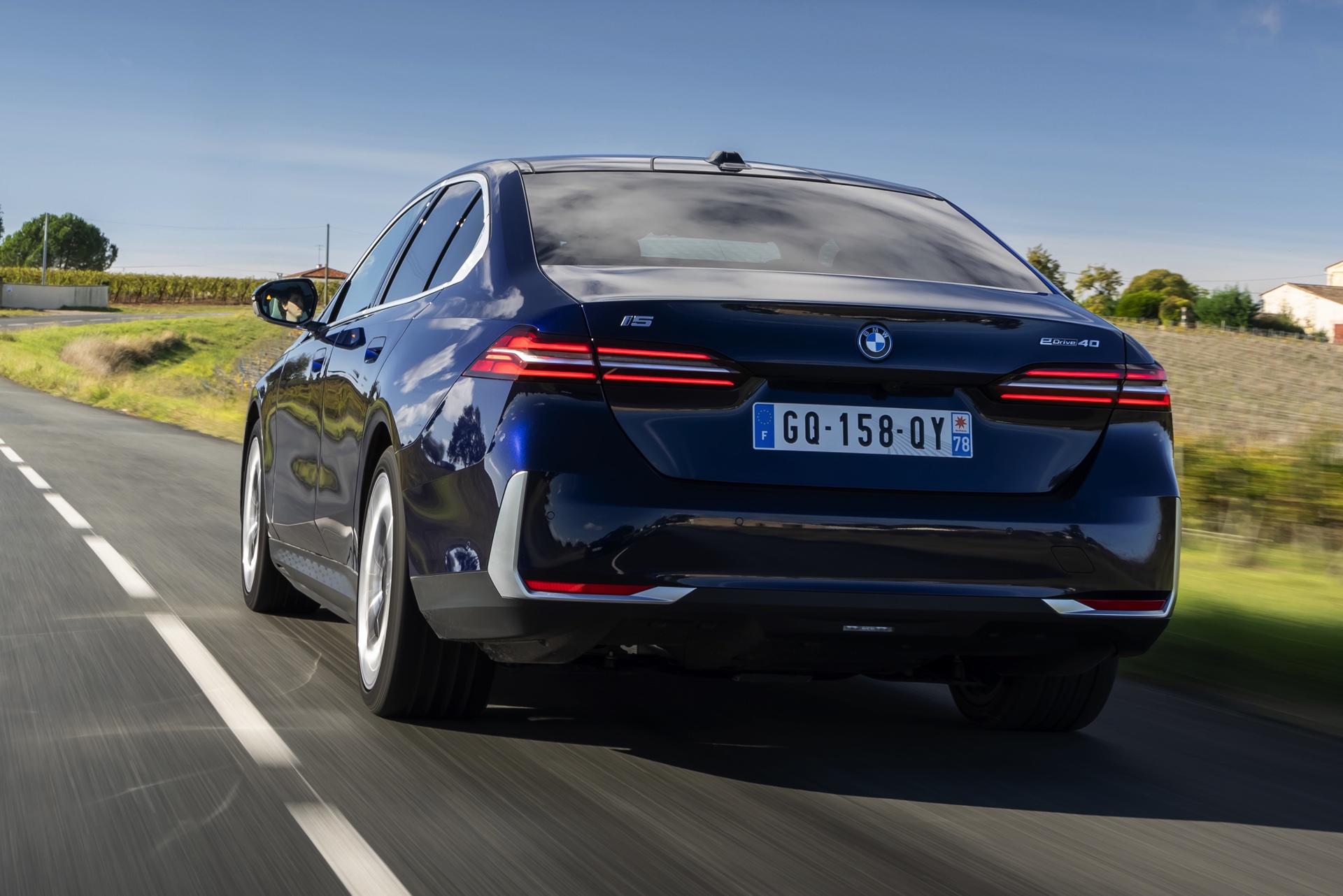 Dass der neue BMW 5er (G60) auch im Basis-Look ohne M Sport-Paket eine gute Figur machen kann, zeigt ein neues Foto-Set zum elektrischen i5. Die in Frankreich fotografierte Business-Limousine trägt die edle Lackierung in Tansanitblau Metallic und kombiniert diese mit diversen Exterieur-Details in satiniertem Aluminium. Hierzu zählen die Einfassungen von Nieren und Seitenfenstern, aber auch zwei L-förmige Elemente an den äußeren unteren Rändern der Heckschürze. Die senkrechten Nieren-Streben sind ebenfalls in einer silbernen Optik gehalten, im Fall des BMW i5 sind sie aber lediglich auf die eigentlich komplett geschlossene und in Schwarz gehaltene Niere aufgezeichnet.