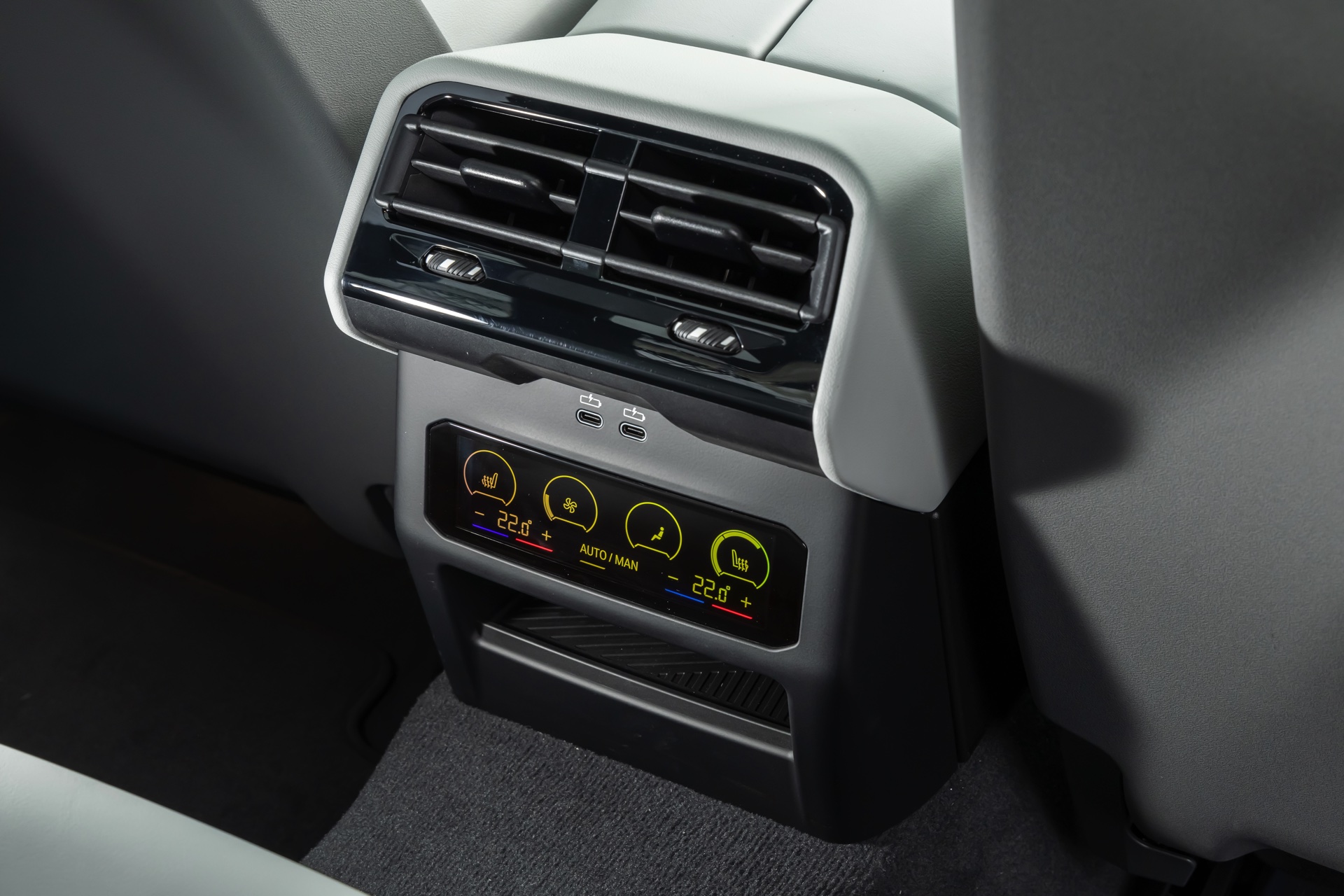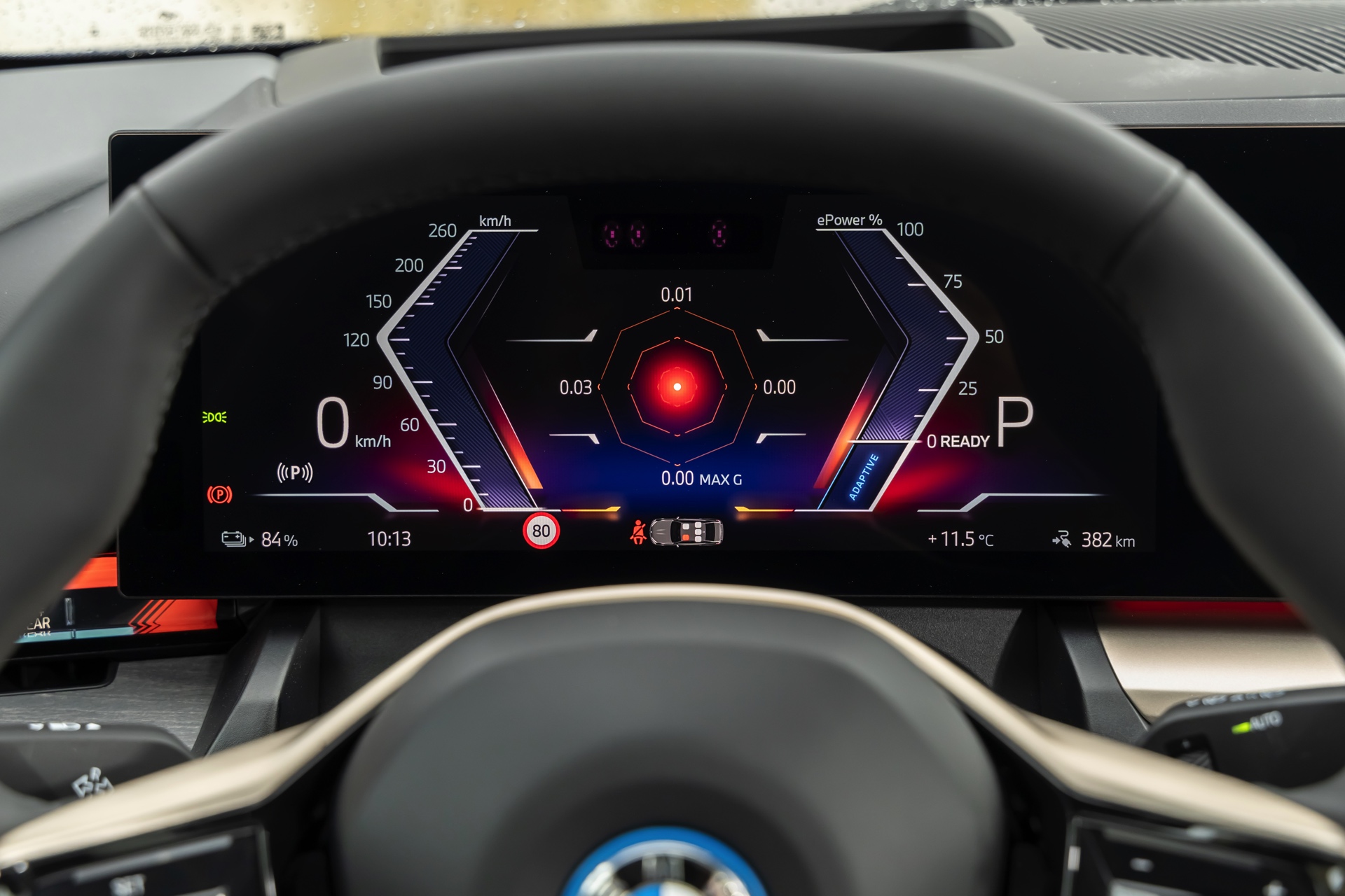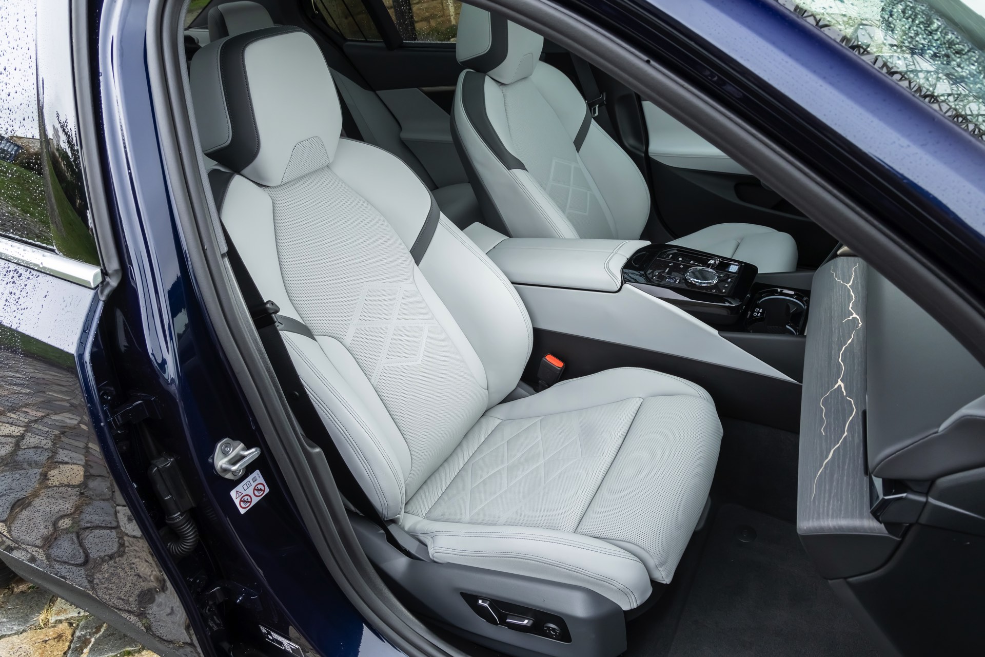 Zum eleganten Auftritt tragen die 20 Zoll großen Aerodynamikräder 937 Multicolor Silber bei, die beim Basis-5er gegen 1.890 Euro Aufpreis erhältlich sind. Das weitgehend geschlossene Felgen-Design ist aerodynamisch günstig und sorgt so im Vergleich zu den serienmäßigen 19-Zöllern trotz breiterer Reifen sogar für einen zusätzlichen Kilometer WLTP-Reichweite. Wer die gleichen 20-Zöller allerdings mit den griffigeren Sportreifen bestellt, verliert im Normzyklus satte 43 Kilometer Reichweite.
