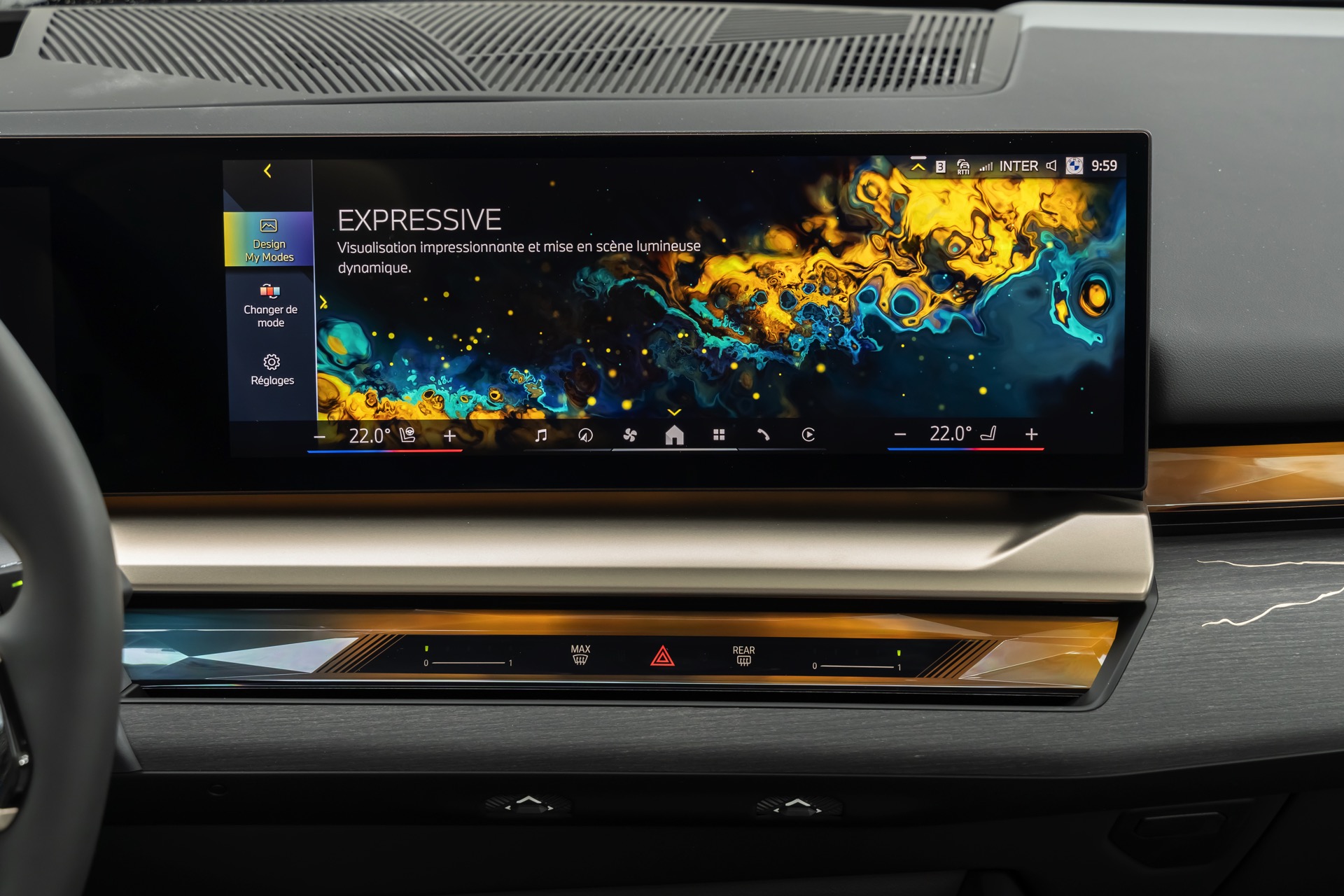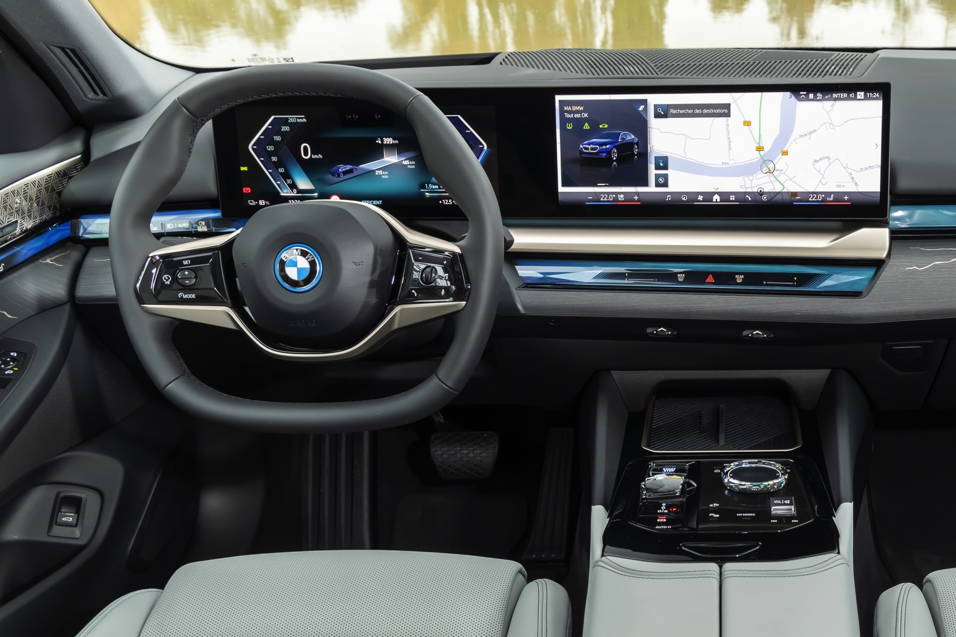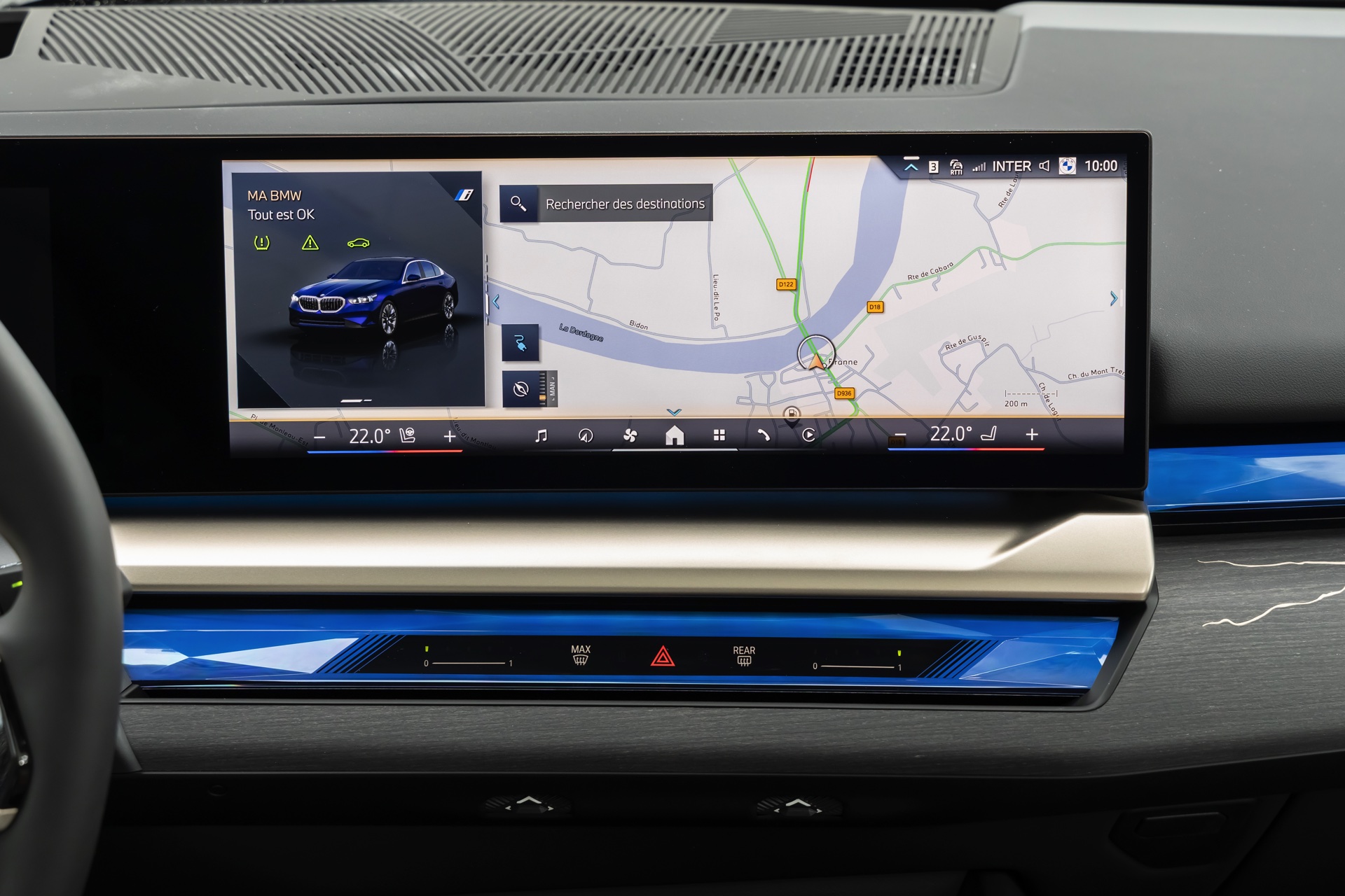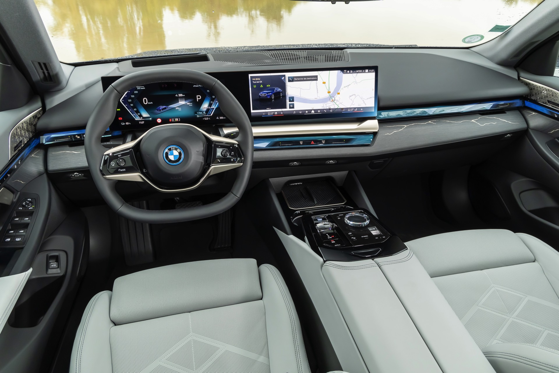 Einen genaueren Blick verdienen auch die Innenraum-Fotos aus Frankreich, denn wir sehen das Interieur Veganza perforiert und gesteppt im hellen Farbton Rauchweiß. Außerdem trägt der Basis-5er das serienmäßige Zwei-Speichen-Lenkrad, das bisher noch nicht auf sonderlich vielen Fotos zu sehen war. Beim Curved-Display und der darunter verlaufenden Interaction Bar, deren Beleuchtung sich sowohl durch den gewählten Fahrmodus als auch individuell einstellen lässt, gibt es hingegen keine Unterschiede zu teureren Konfigurationen mit M Paket.