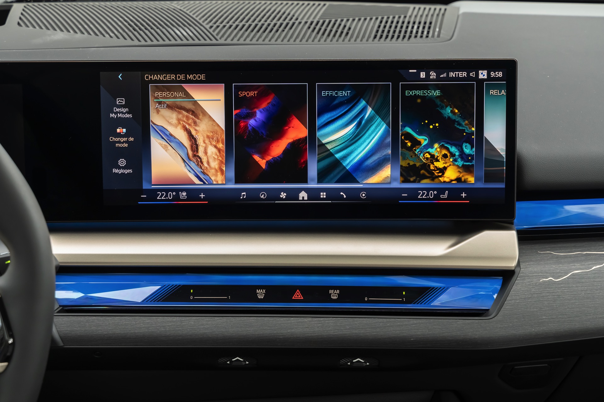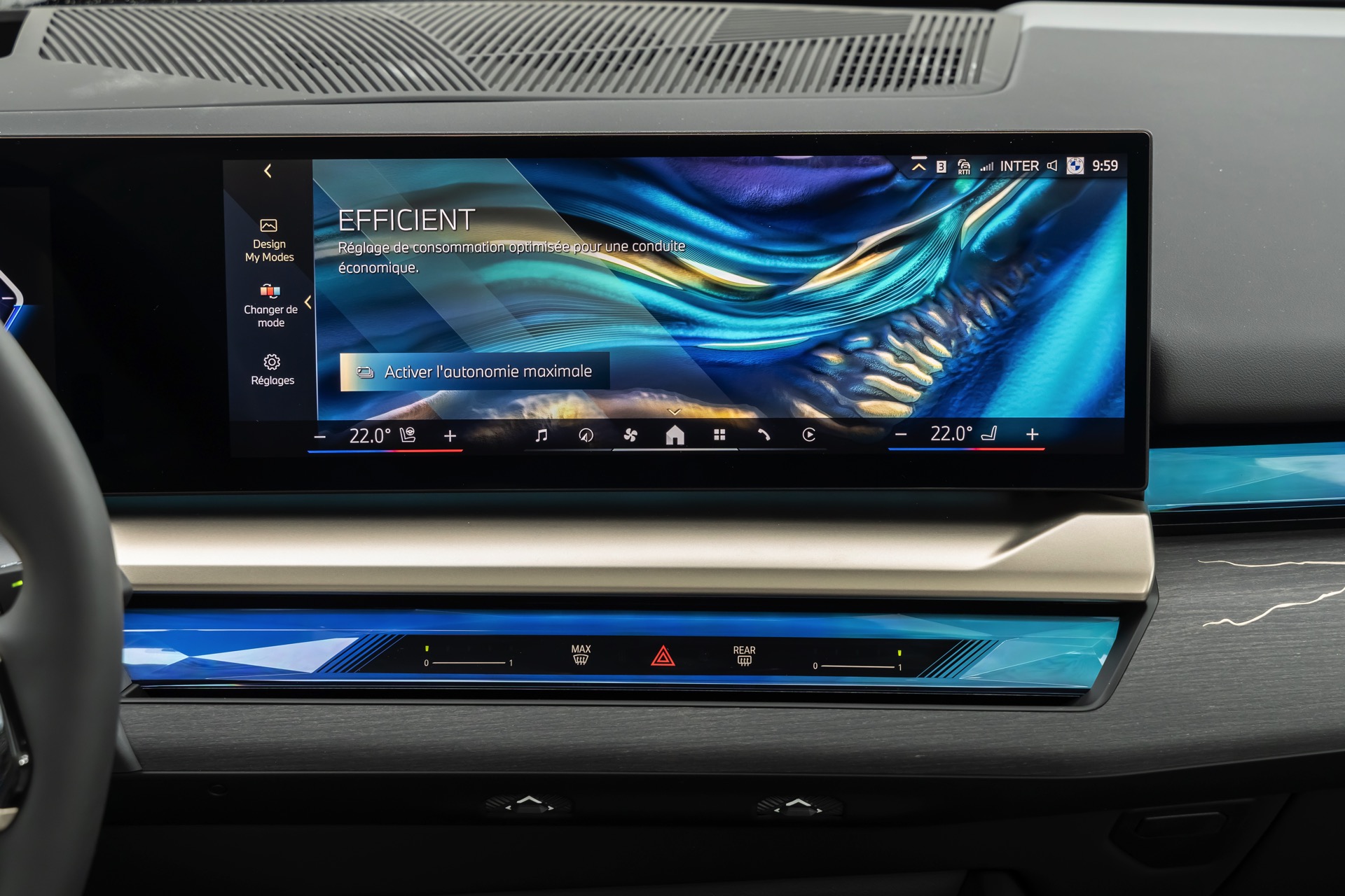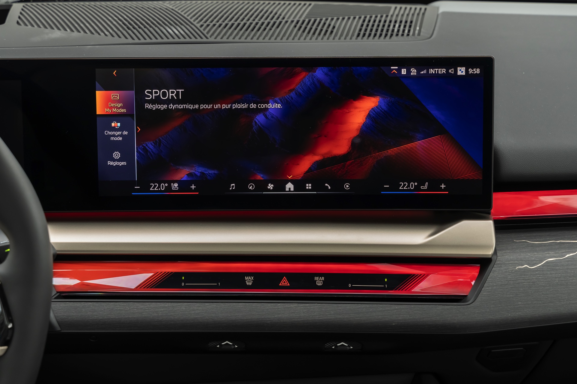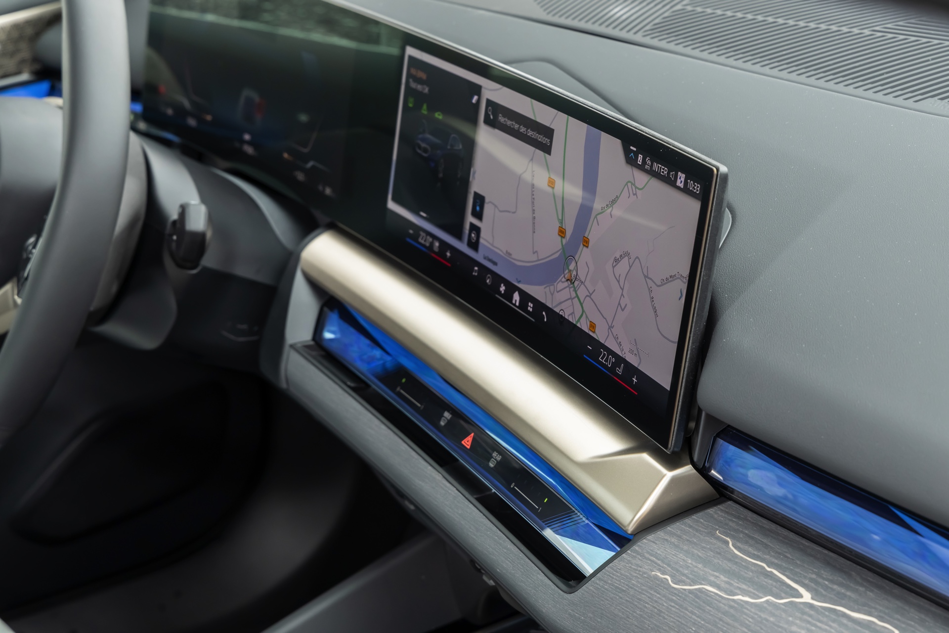Einen genaueren Blick verdienen auch die Innenraum-Fotos aus Frankreich, denn wir sehen das Interieur Veganza perforiert und gesteppt im hellen Farbton Rauchweiß. Außerdem trägt der Basis-5er das serienmäßige Zwei-Speichen-Lenkrad, das bisher noch nicht auf sonderlich vielen Fotos zu sehen war. Beim Curved-Display und der darunter verlaufenden Interaction Bar, deren Beleuchtung sich sowohl durch den gewählten Fahrmodus als auch individuell einstellen lässt, gibt es hingegen keine Unterschiede zu teureren Konfigurationen mit M Paket.