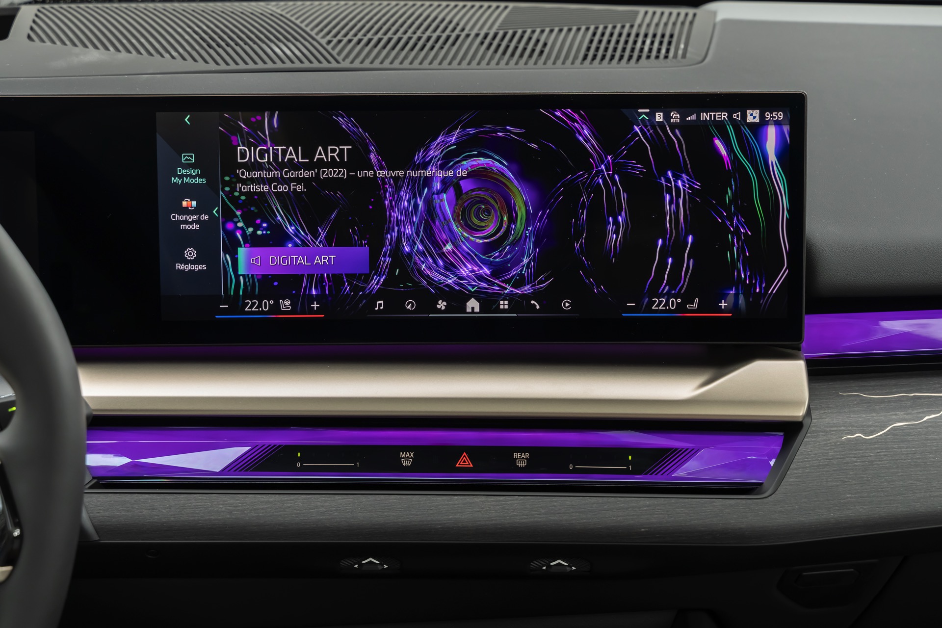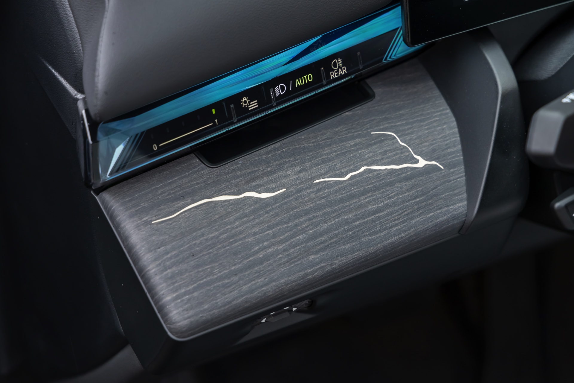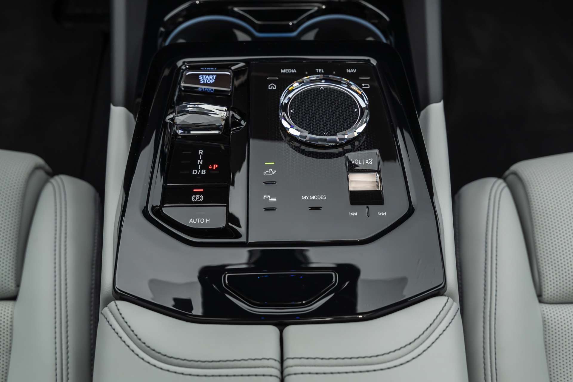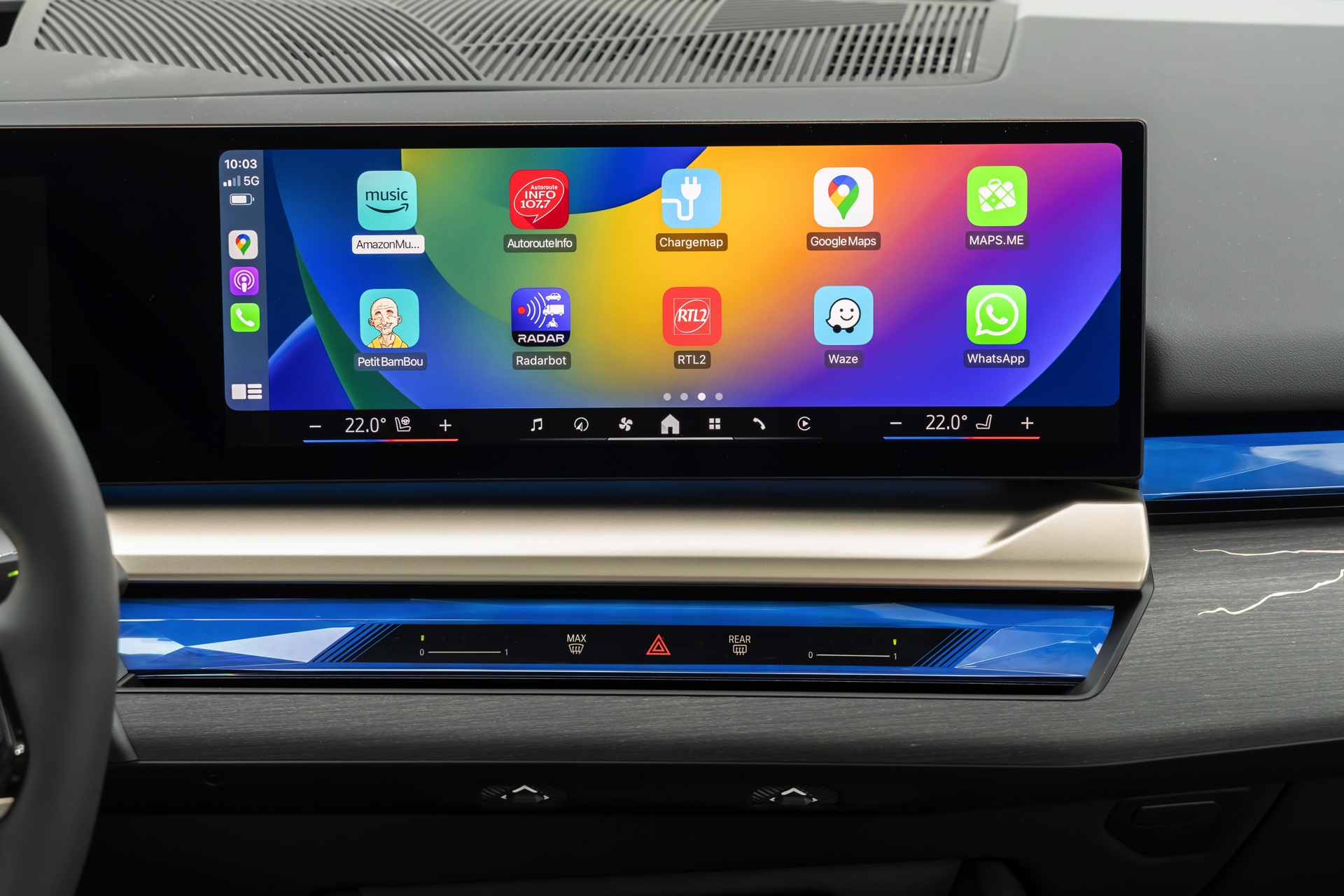 Einen genaueren Blick verdienen auch die Innenraum-Fotos aus Frankreich, denn wir sehen das Interieur Veganza perforiert und gesteppt im hellen Farbton Rauchweiß. Außerdem trägt der Basis-5er das serienmäßige Zwei-Speichen-Lenkrad, das bisher noch nicht auf sonderlich vielen Fotos zu sehen war. Beim Curved-Display und der darunter verlaufenden Interaction Bar, deren Beleuchtung sich sowohl durch den gewählten Fahrmodus als auch individuell einstellen lässt, gibt es hingegen keine Unterschiede zu teureren Konfigurationen mit M Paket.