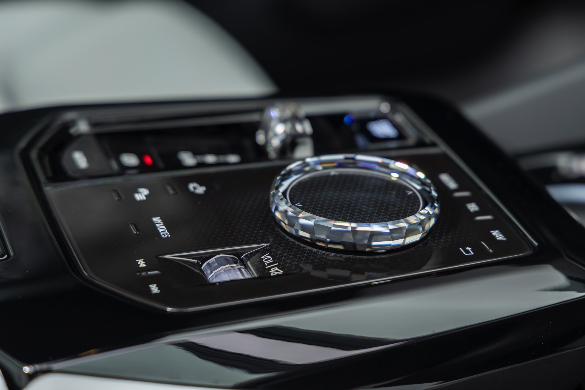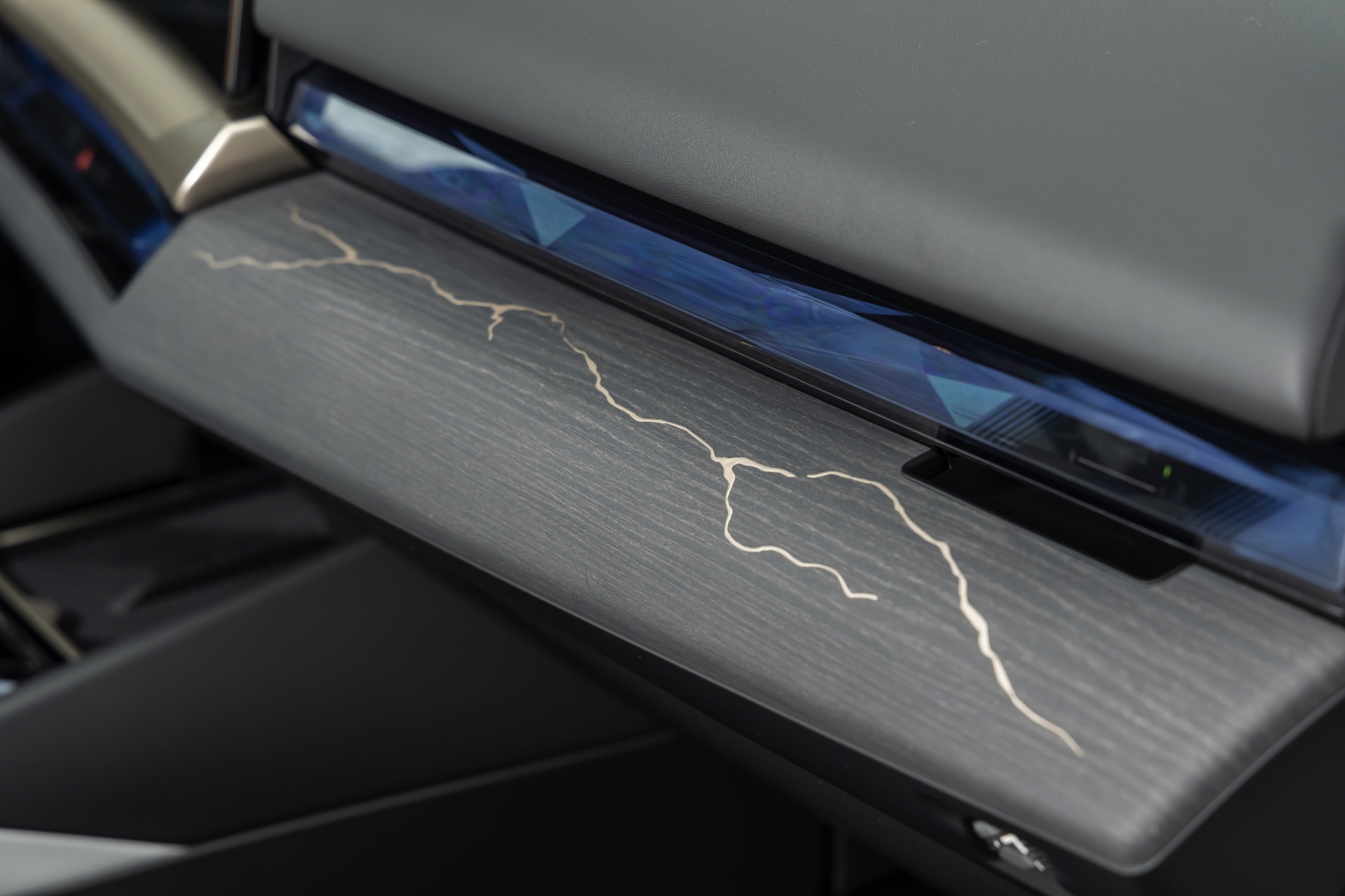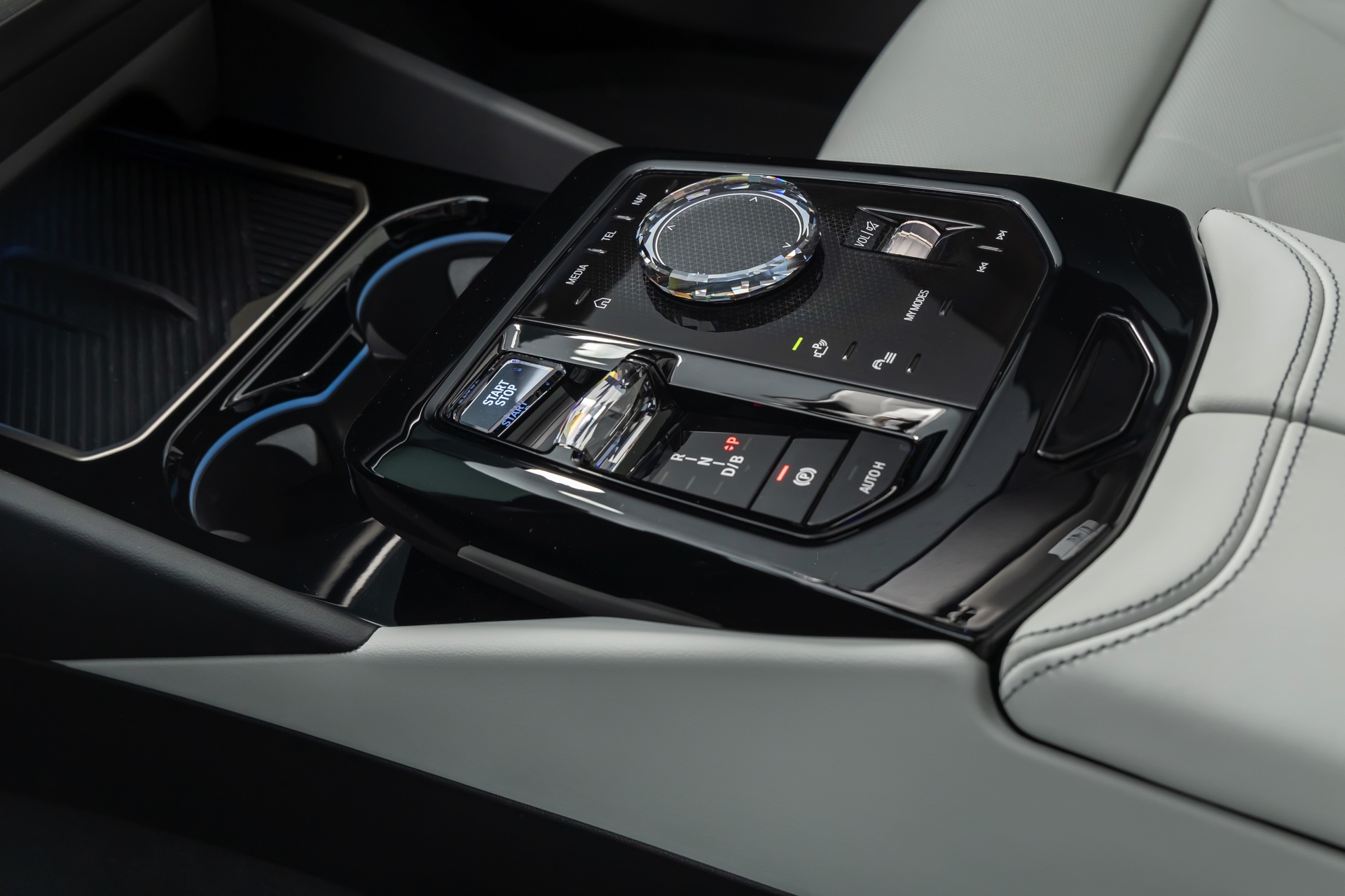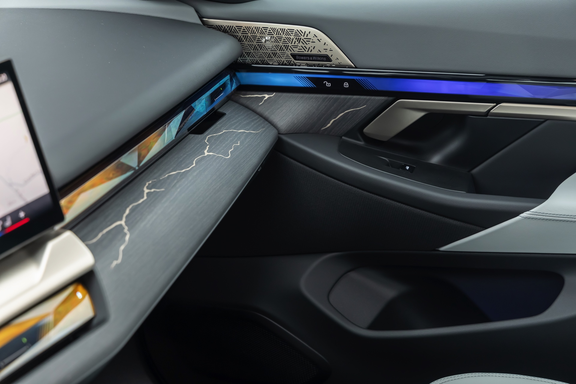 Einen genaueren Blick verdienen auch die Innenraum-Fotos aus Frankreich, denn wir sehen das Interieur Veganza perforiert und gesteppt im hellen Farbton Rauchweiß. Außerdem trägt der Basis-5er das serienmäßige Zwei-Speichen-Lenkrad, das bisher noch nicht auf sonderlich vielen Fotos zu sehen war. Beim Curved-Display und der darunter verlaufenden Interaction Bar, deren Beleuchtung sich sowohl durch den gewählten Fahrmodus als auch individuell einstellen lässt, gibt es hingegen keine Unterschiede zu teureren Konfigurationen mit M Paket.