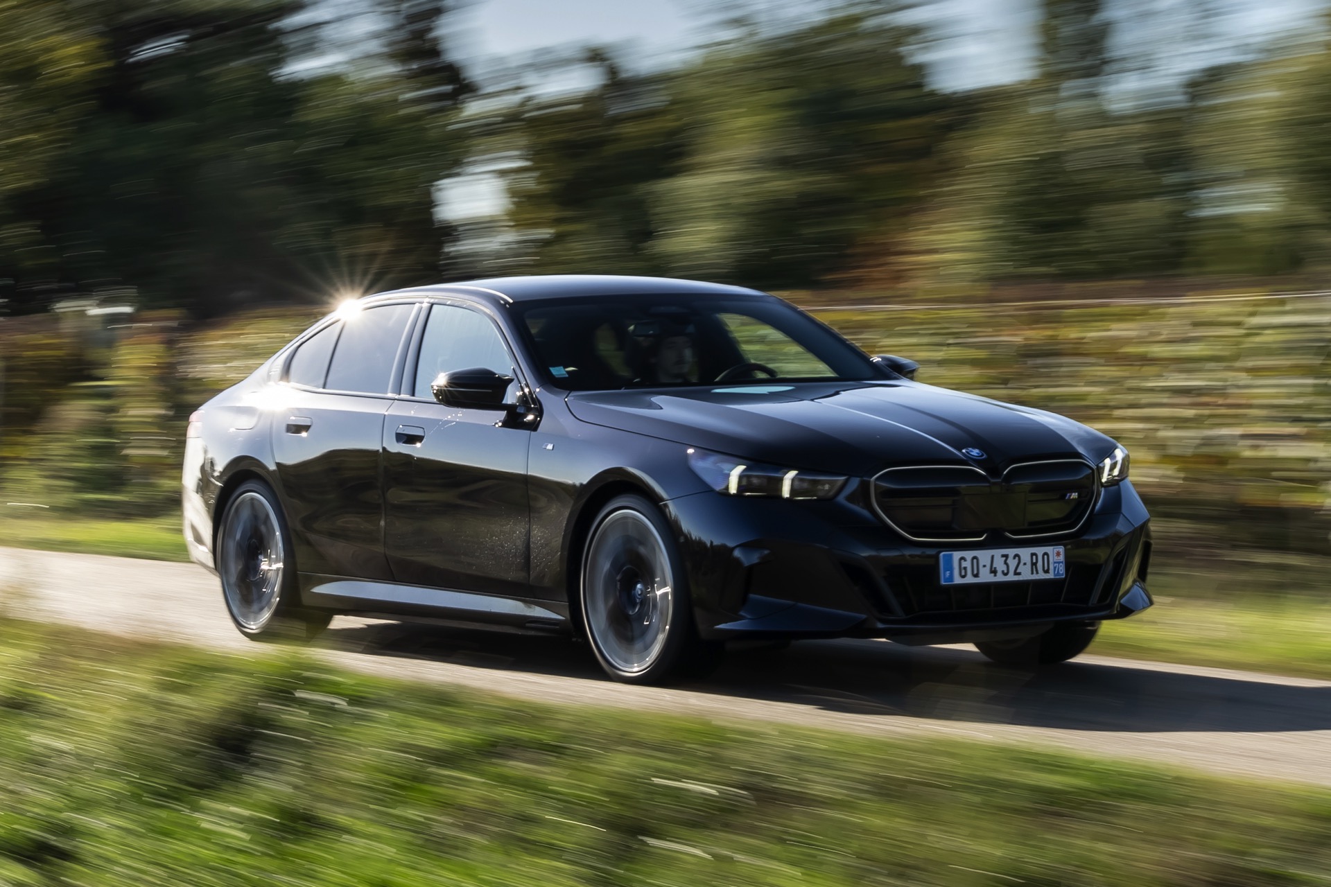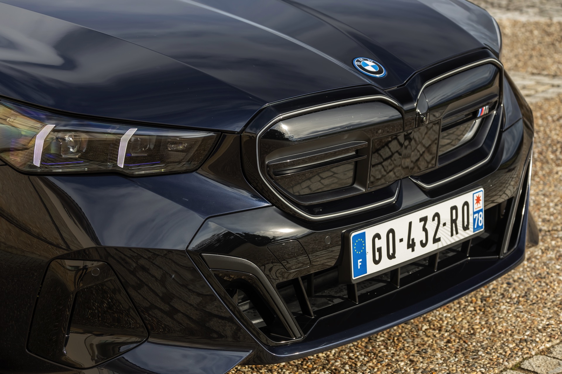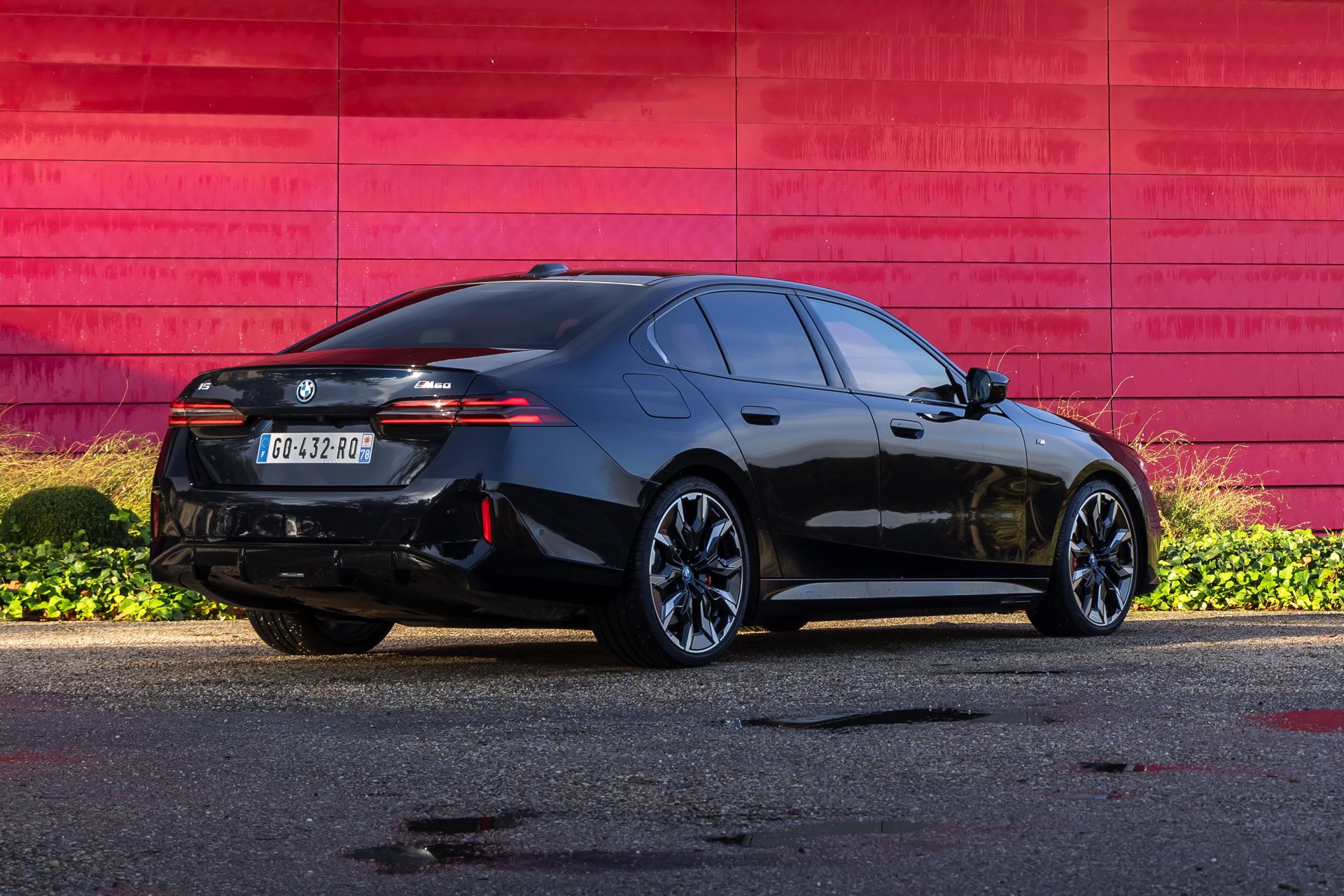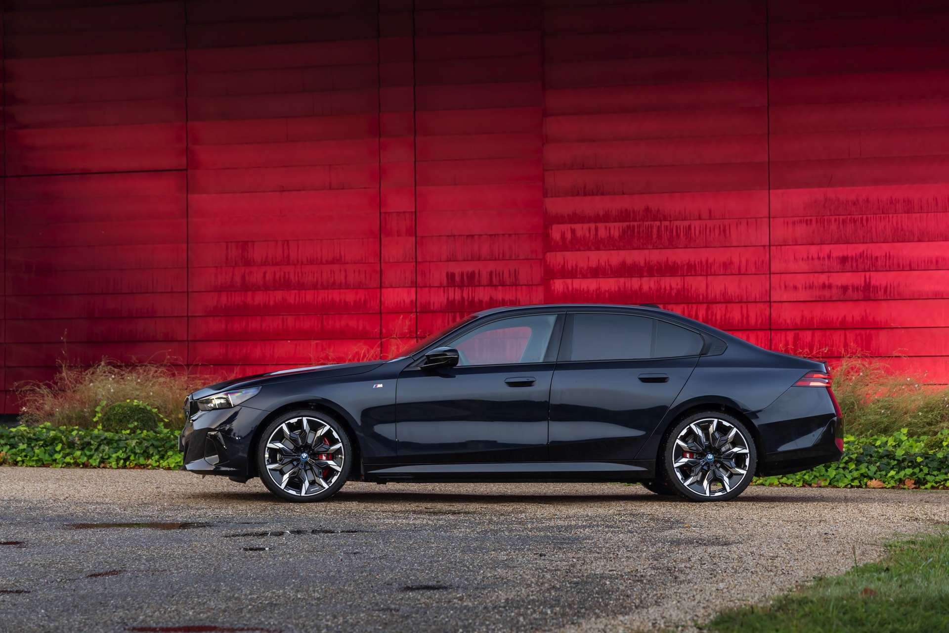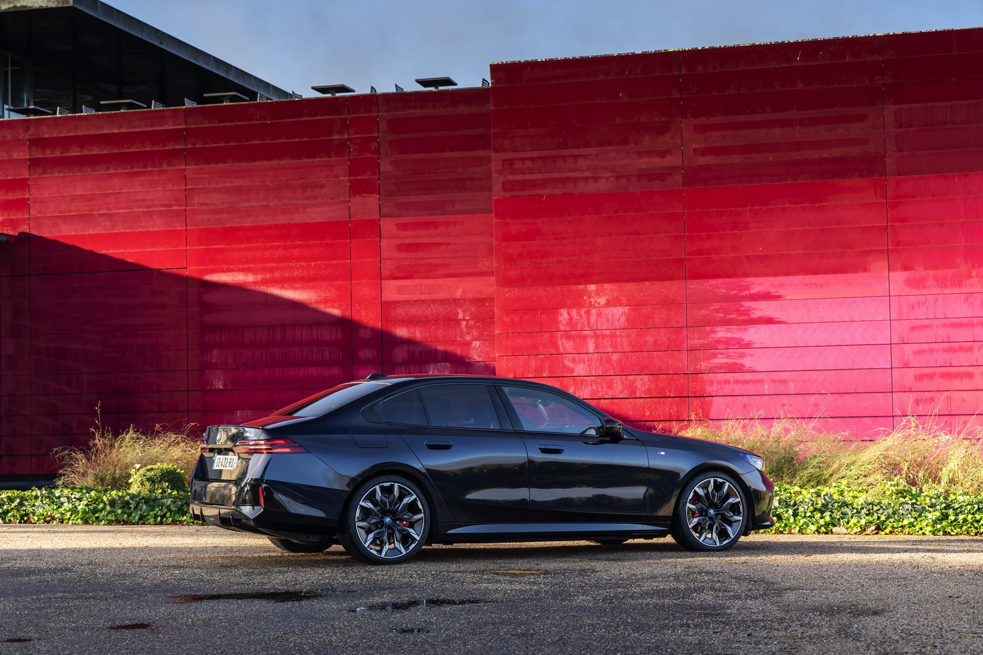 Dass Schwarz nicht gleich Schwarz ist, zeigt ein aktuelles Foto-Set vom neuen BMW i5 M60 in Carbonschwarz Metallic. Der Elektro-5er trägt insgesamt gleich drei unterschiedliche Schwarz-Töne, was bei genauerem Hinsehen und im richtigen Licht auch gut erkennbar ist. Am klarsten ist der Kontrast zwischen dem im Sonnenlicht dezent dunkelblau schimmernden Carbonschwarz und dem deutlich intensiveren Hochglanzschwarz von Lufteinlass-Blenden, Seitenschwellern, Heckschürzen-Einsatz sowie Nieren und Fenster-Einfassungen der Shadow Line mit erweiterten Umfängen, eine dritte Schattierung bringen die schwarzen Elemente der 21 Zoll großen BMW Individual Aerodynamikräder 954 I Bicolor Jetblack.