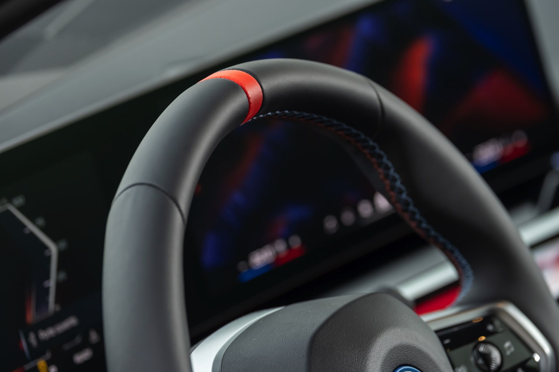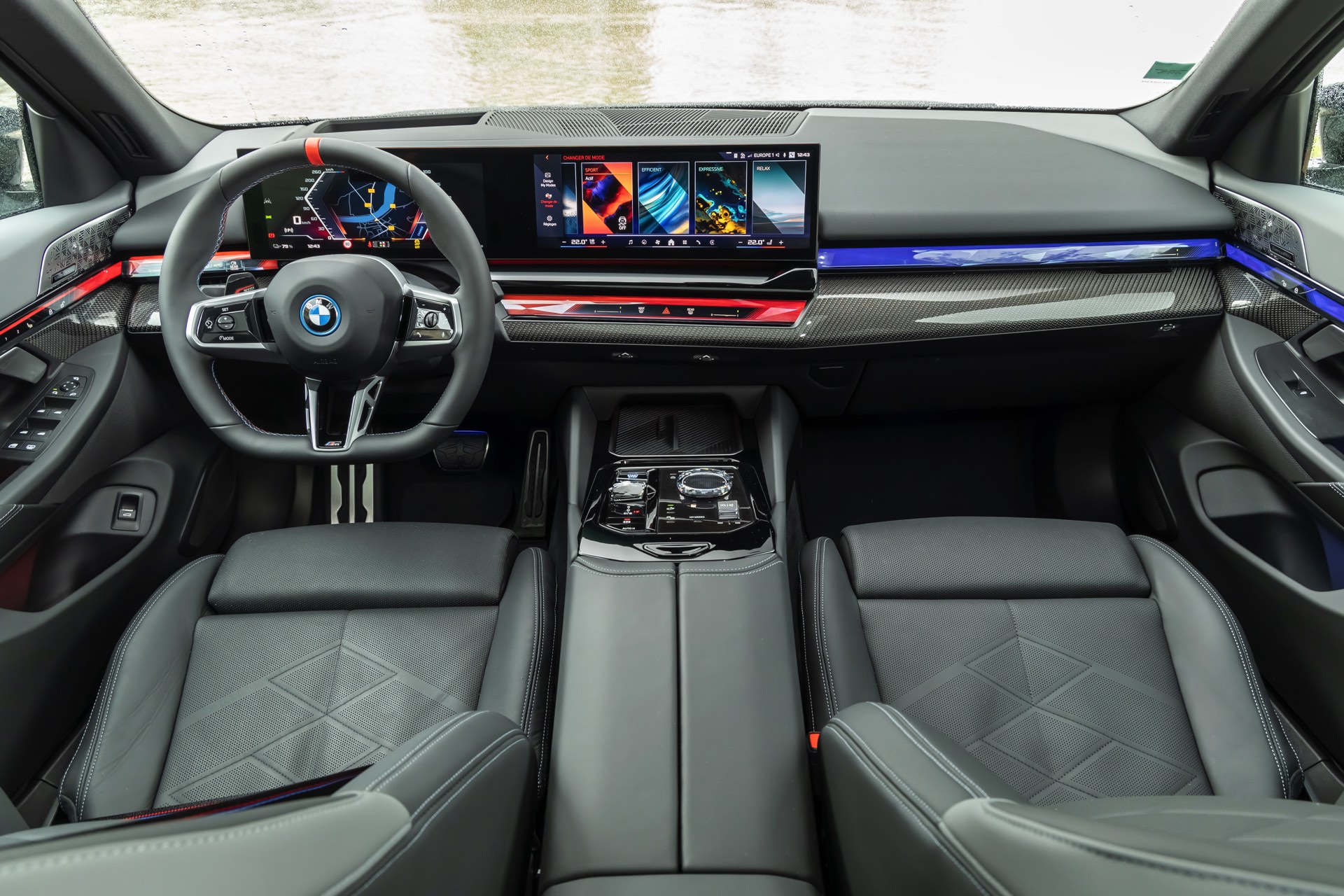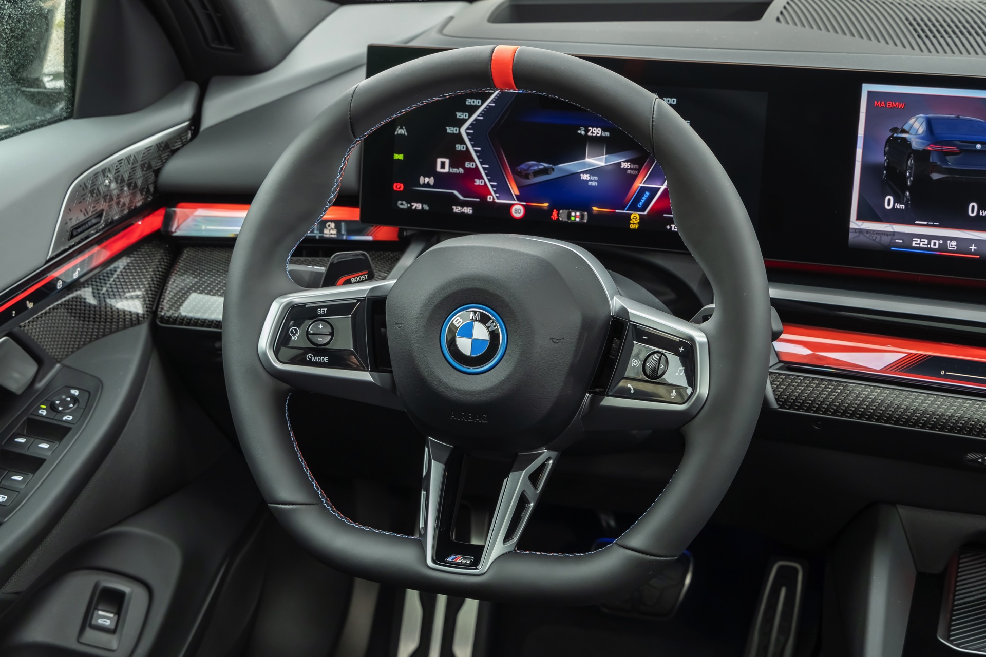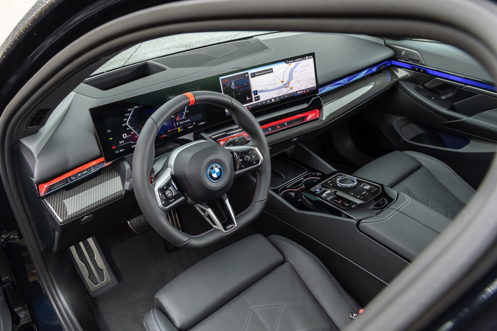 Die auf den meisten Fotos im Rot und Blau des Sport-Modus leuchtende Interaction Bar kann je nach Geschmack natürlich auch in zahlreichen anderen Farben und Farbkombinationen beleuchtet werden. Keine Wahlmöglichkeiten gibt es hingegen beim Lenkrad: Wer sich für den BMW i5 M60 entscheidet, erhält immer die Variante mit roter 12-Uhr-Markierung – für alle anderen 5er und i5 steht diese Version des M Lenkrads ab Werk nicht zur Wahl.