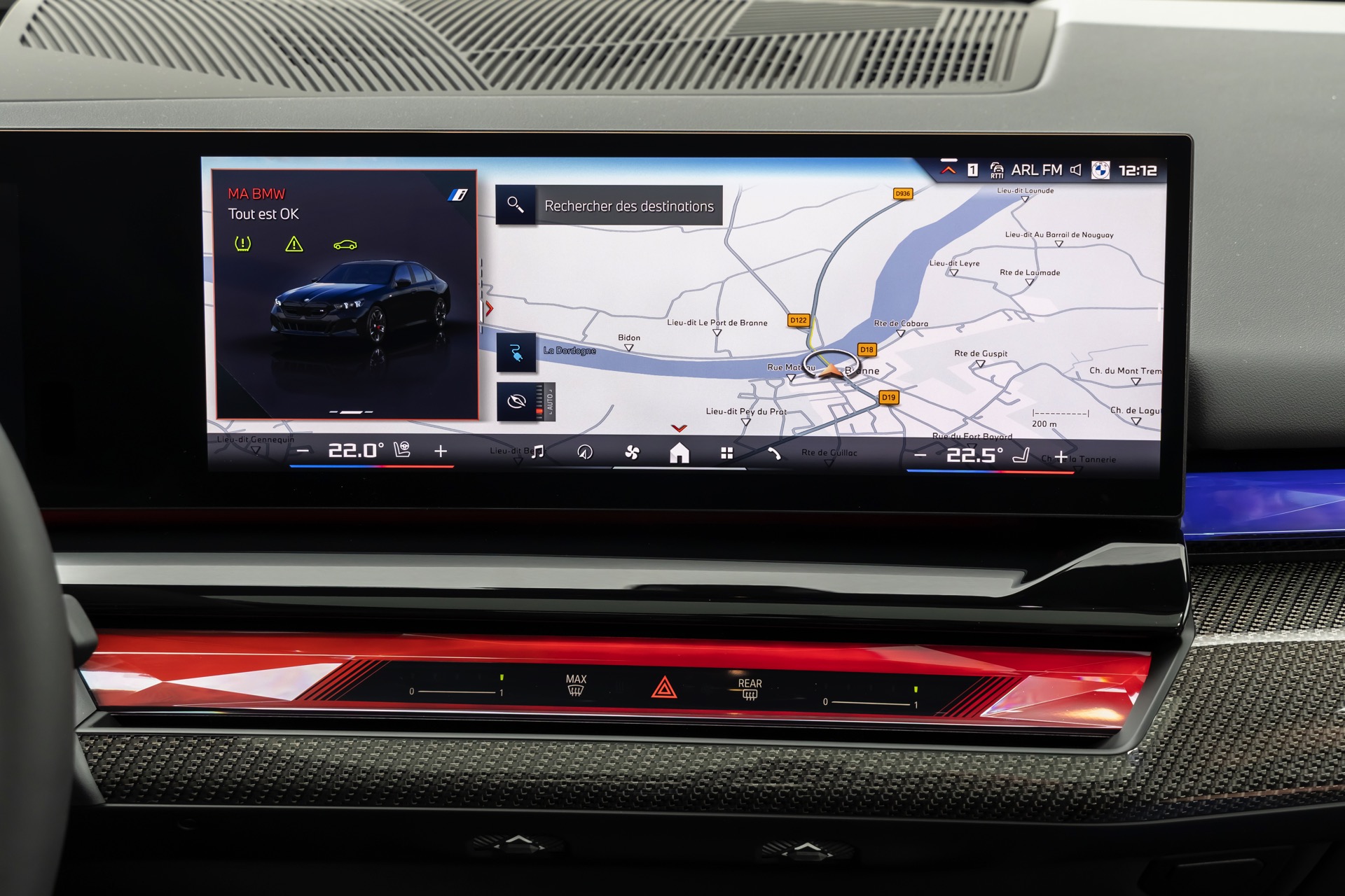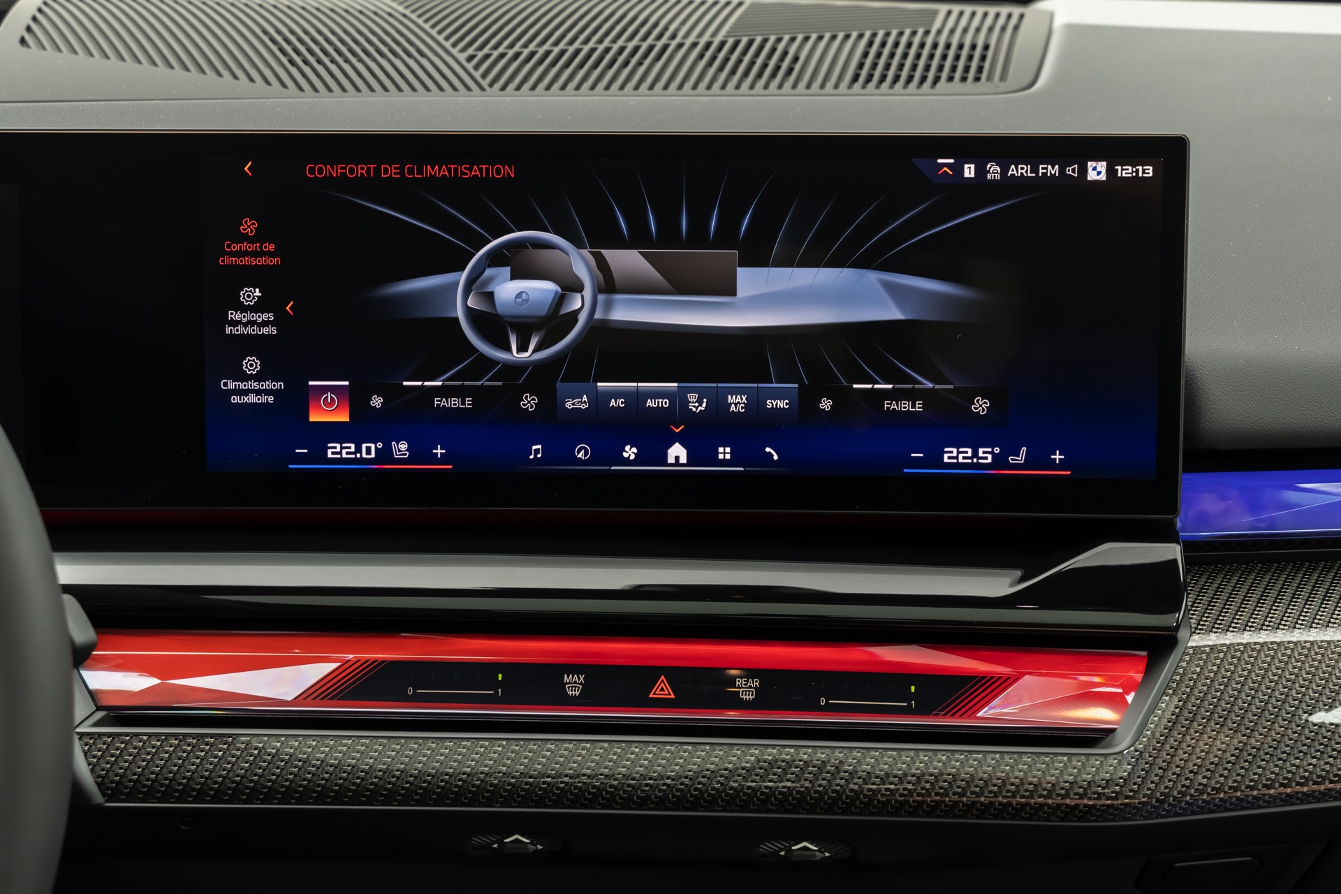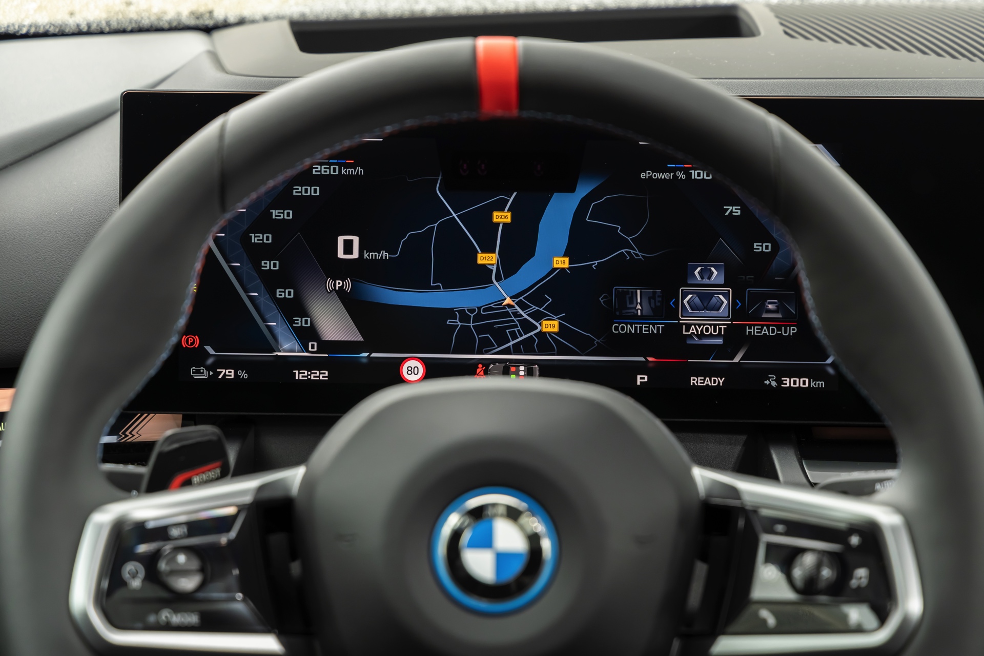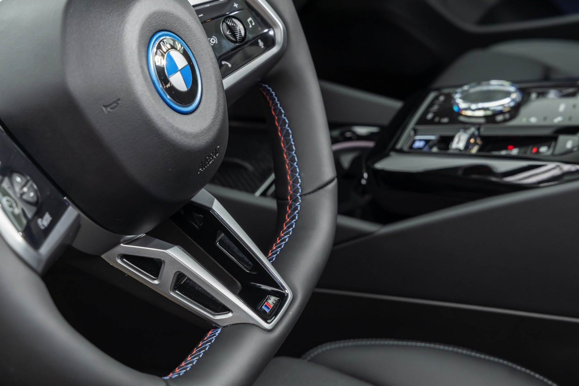 Die auf den meisten Fotos im Rot und Blau des Sport-Modus leuchtende Interaction Bar kann je nach Geschmack natürlich auch in zahlreichen anderen Farben und Farbkombinationen beleuchtet werden. Keine Wahlmöglichkeiten gibt es hingegen beim Lenkrad: Wer sich für den BMW i5 M60 entscheidet, erhält immer die Variante mit roter 12-Uhr-Markierung – für alle anderen 5er und i5 steht diese Version des M Lenkrads ab Werk nicht zur Wahl.