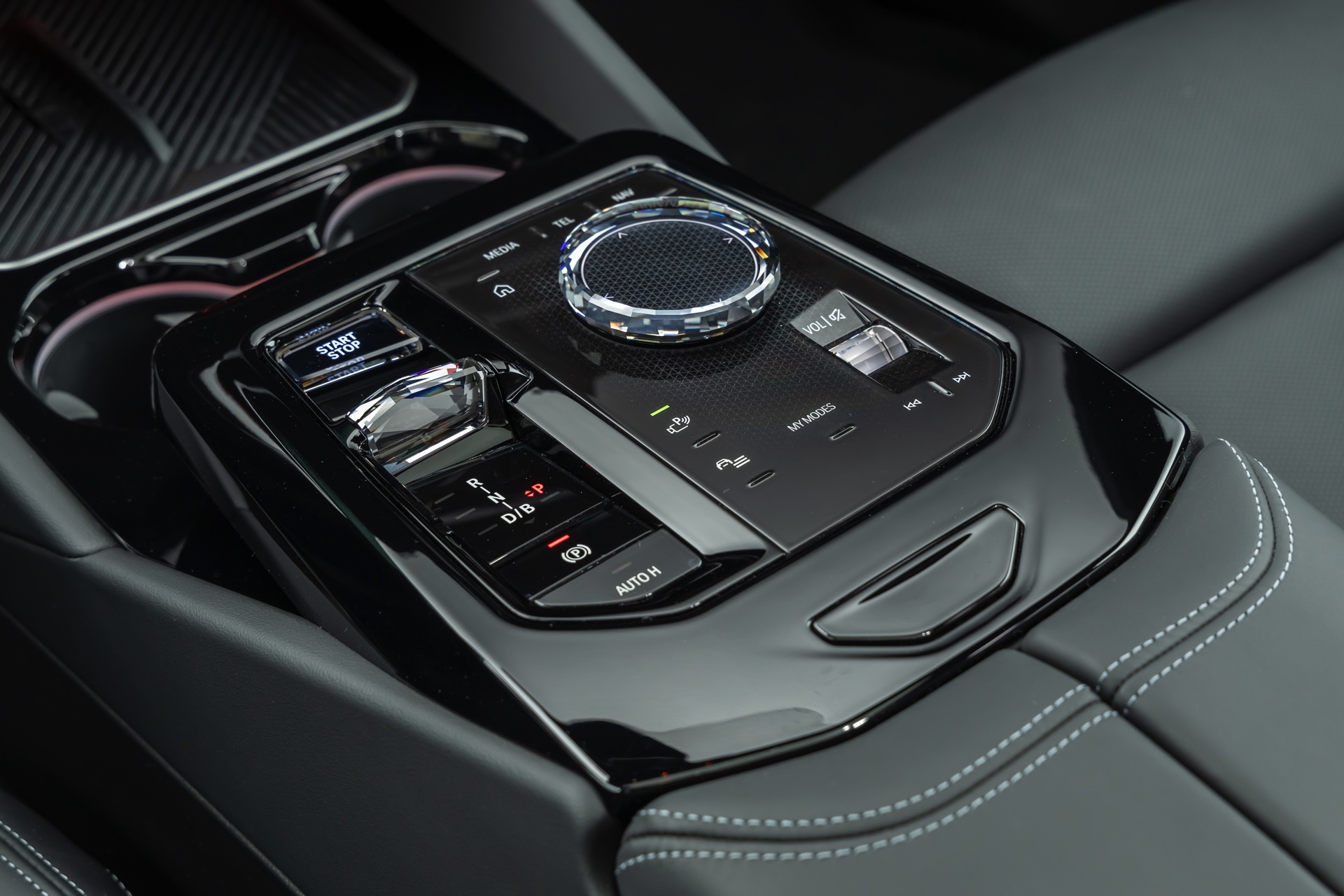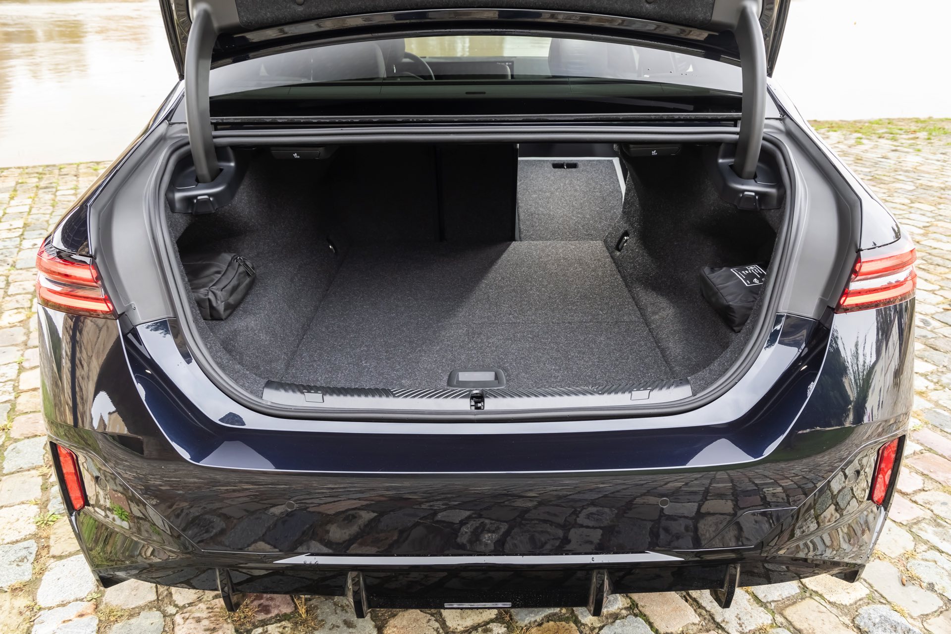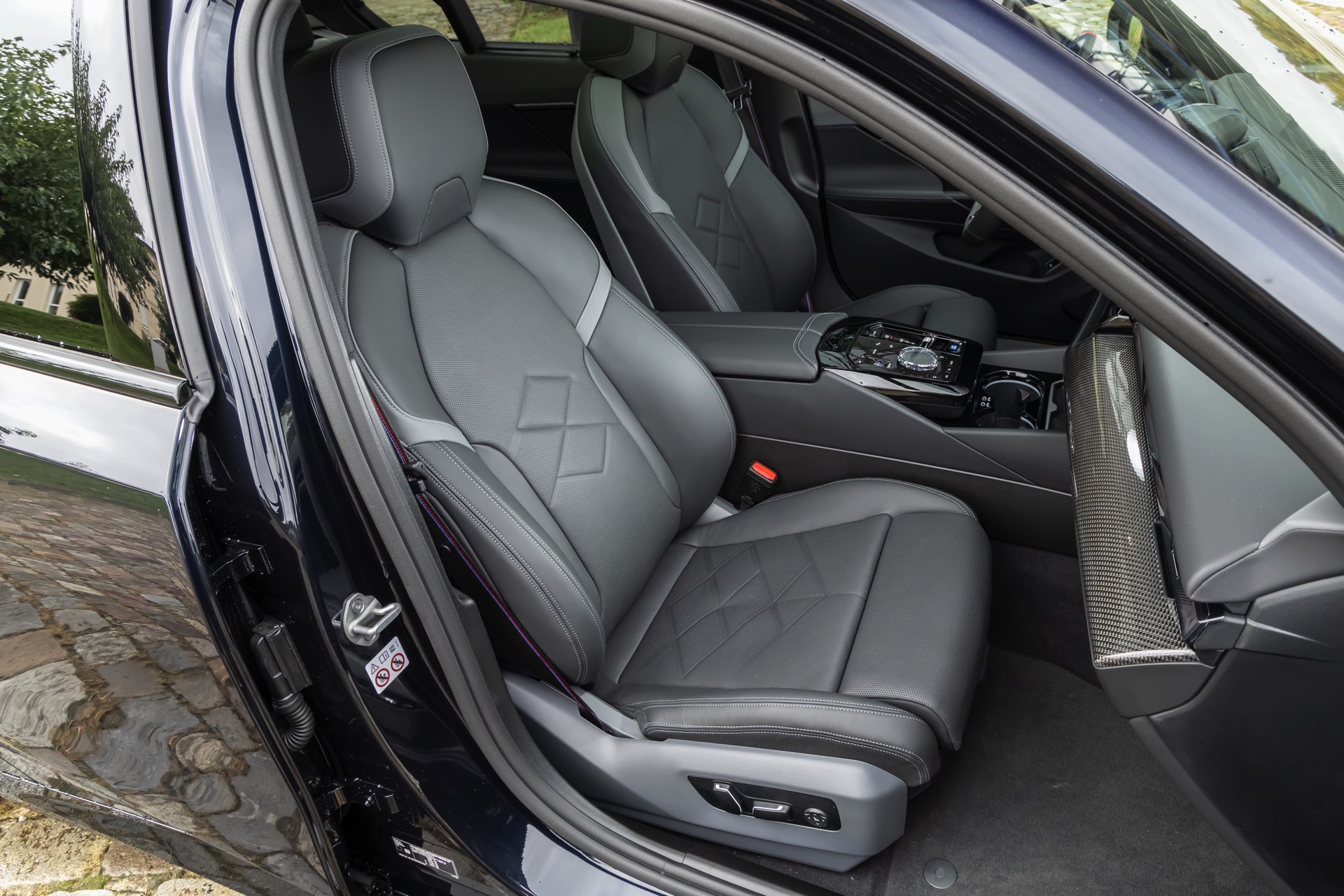 Genau wie das Exterieur setzt auch der Innenraum des gezeigten BMW i5 M60 ganz überwiegend auf Schwarz: Wir sehen die Ausstattung M Leder Merino Schwarz Atlasgrau, die für 2.200 Euro Aufpreis verbaut wird und im Gegensatz zu den serienmäßigen Veganza-Bezügen aus der Haut echter Tiere besteht. Kombiniert wird das schwarze Leder mit den Interieurleisten ‘Carbon Fibre’, deren Optik für einen sportlichen Touch sorgt.