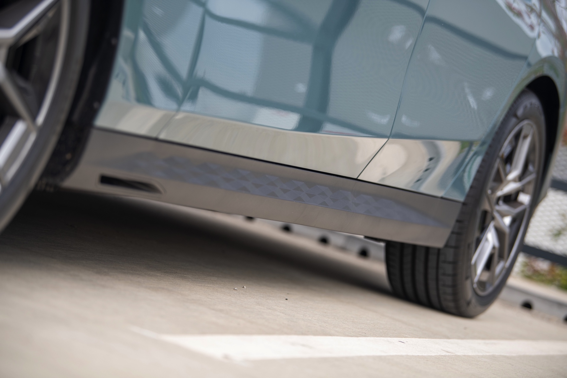 In der Serien-Optik kombiniert der neue BMW 5er seine Lackierung mit diversen Elementen in satiniertem Aluminium, darunter neben der prominenten Doppel-Niere auch die Fenster-Einfassung und zwei L-förmige Zierelemente in der Heckschürze. Vergleichsweise unspektakulär wirken die Leichtmetallräder Triplex-Speiche 933 Silber, die trotz ihrer durchaus stattlichen Größe von 19 Zoll keinesfalls überdimensioniert erscheinen. Feine Details wie die tief eingeprägte 5 im Bereich des Hofmeister-Knicks trägt der 5er auch im Serien-Look, weniger hochwertig wirken hingegen die Kunststoff-Elemente im unteren Bereich der Frontschürze.