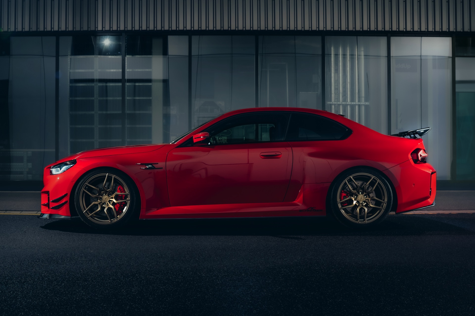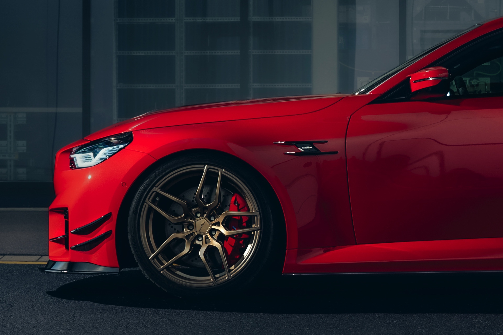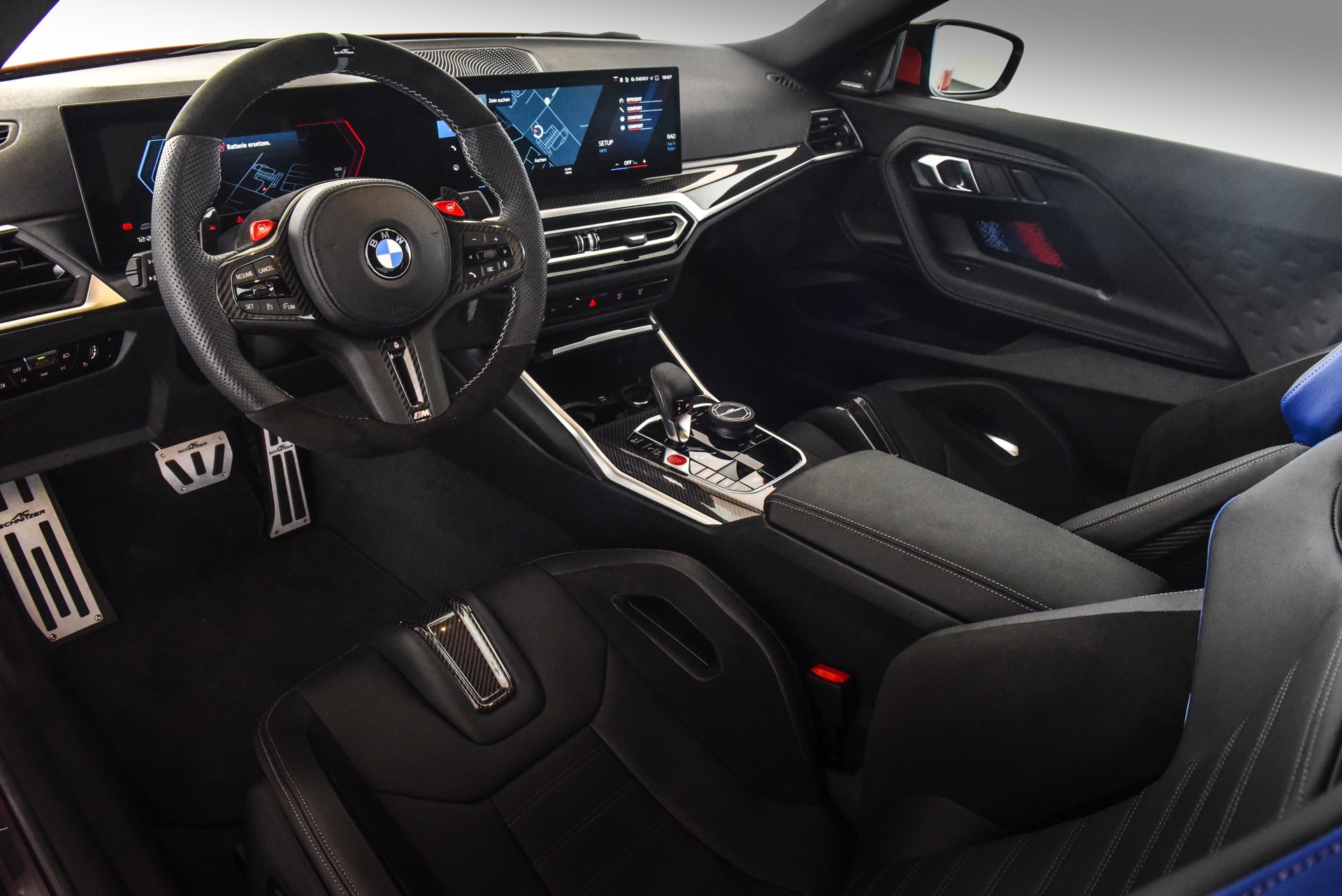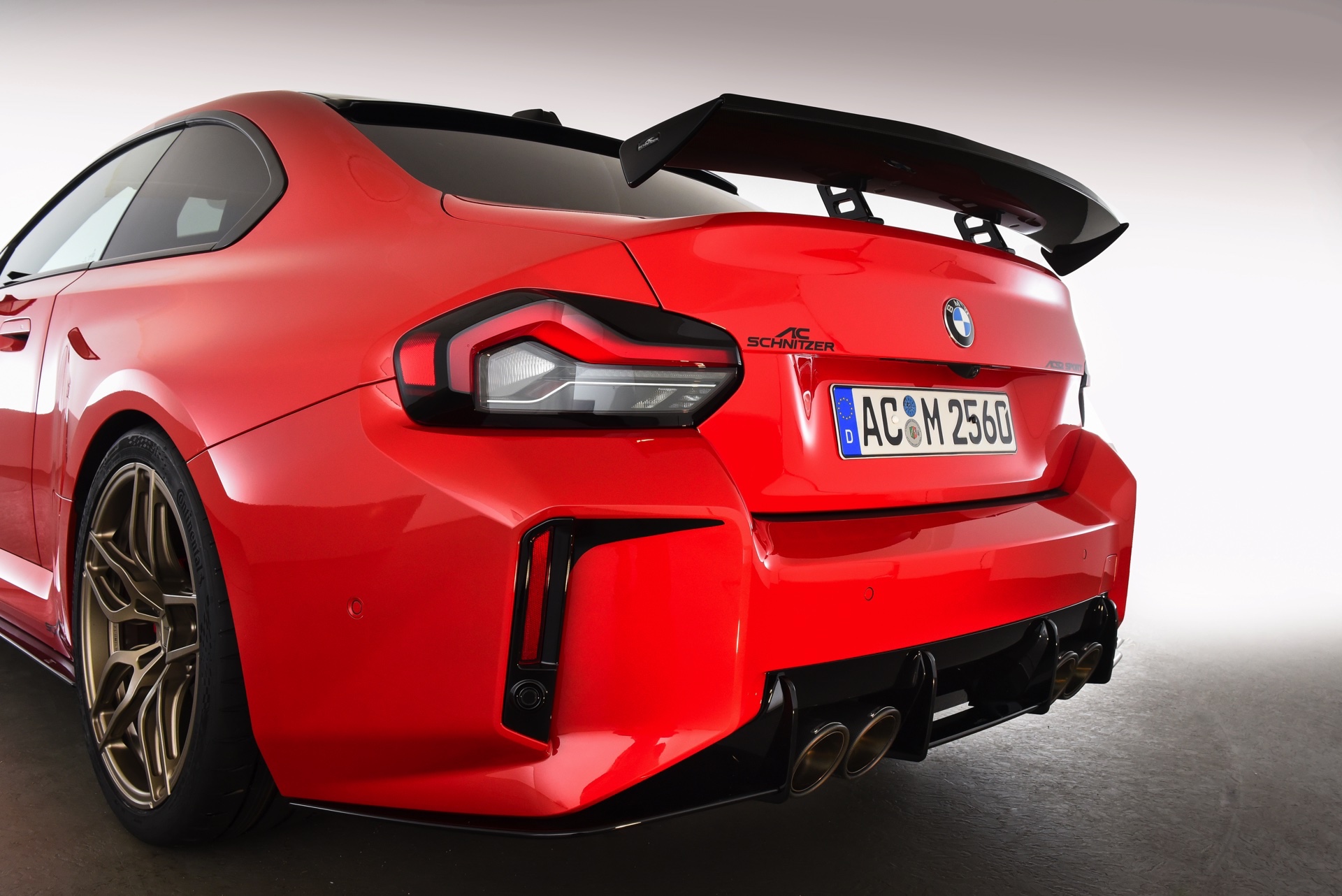 In der Seitenansicht profitiert der BMW M2 (G87) vor allem von den in 20 und 21 Zoll erhältlichen Felgen, die in verschiedenen Designs und Farben erhältlich sind. Wer keinen Zollsprung zwischen Vorder- und Hinterachse wünscht, kann statt vorne 20 und hinten 21 Zoll auch vier Felgen mit 20 Zoll Durchmesser montieren. Noch besser zur Geltung kommen die Räder in Verbindung mit einer Tieferlegung, wobei AC Schnitzer sowohl simple Fahrwerksfedern für 15 bis 25 Millimeter als auch ein vielfach einstellbares Gewindefahrwerk mit 20 bis 35 Millimeter Tieferlegung anbietet.