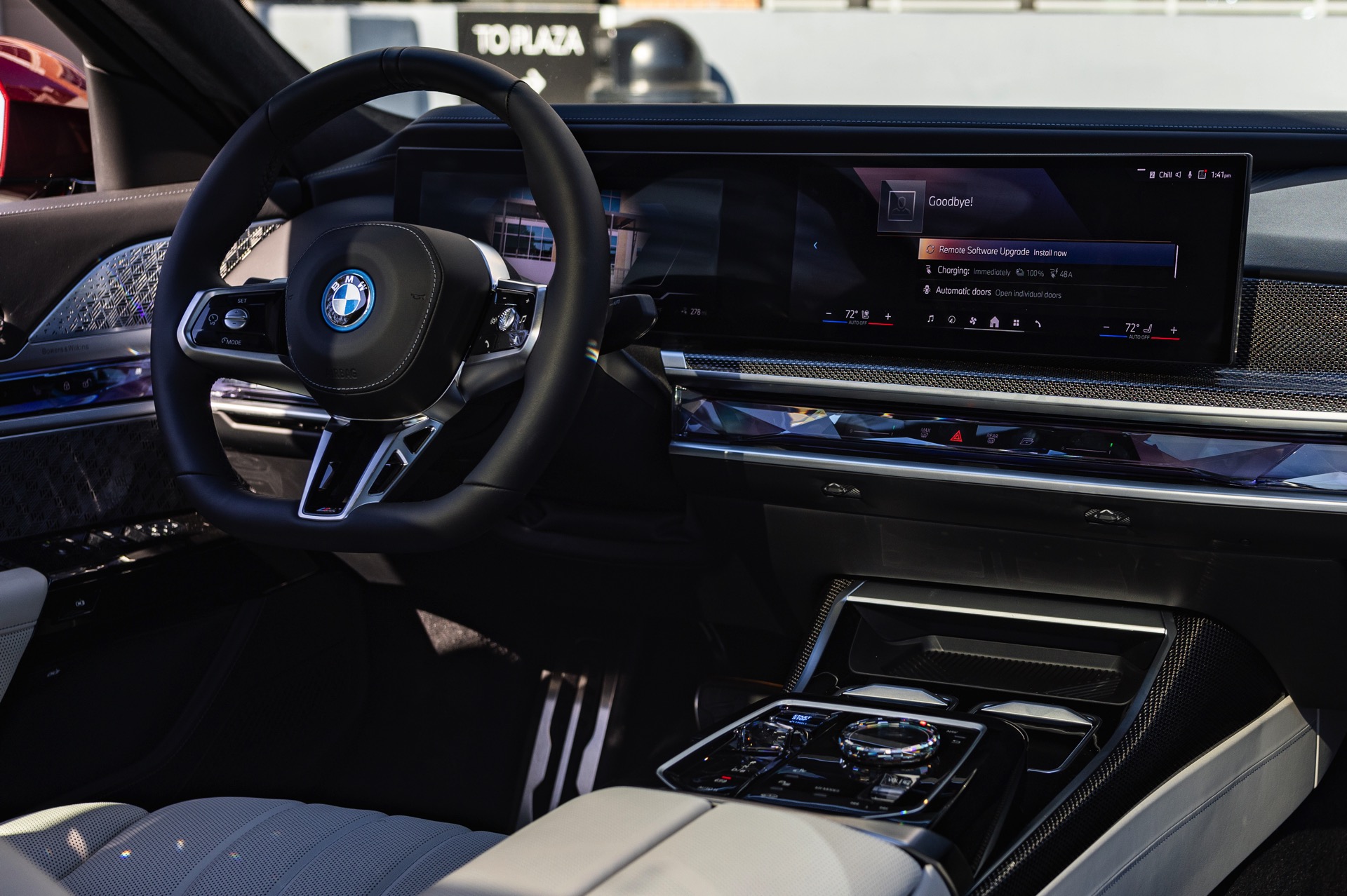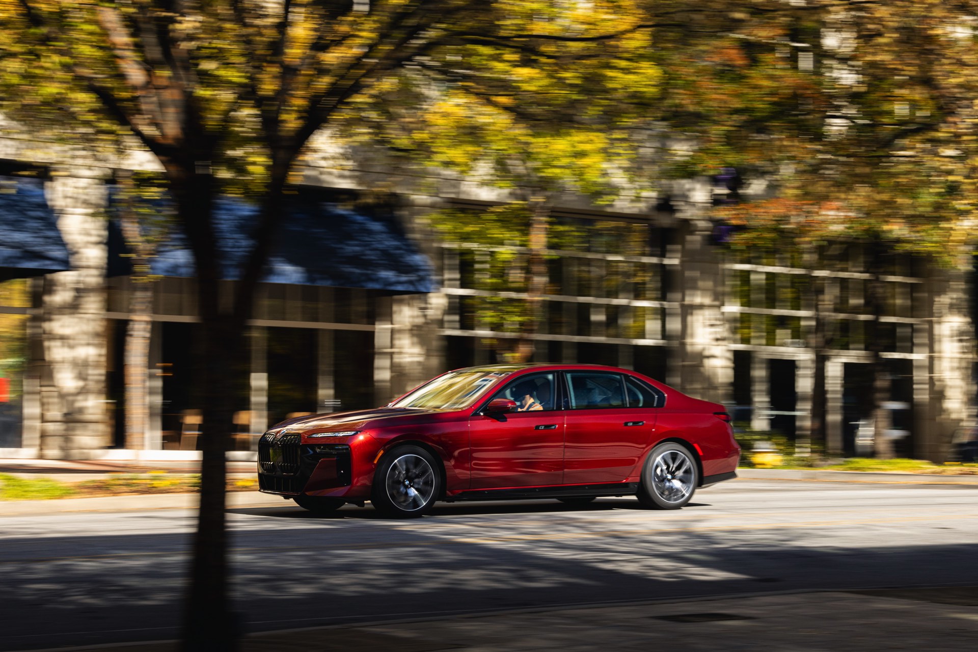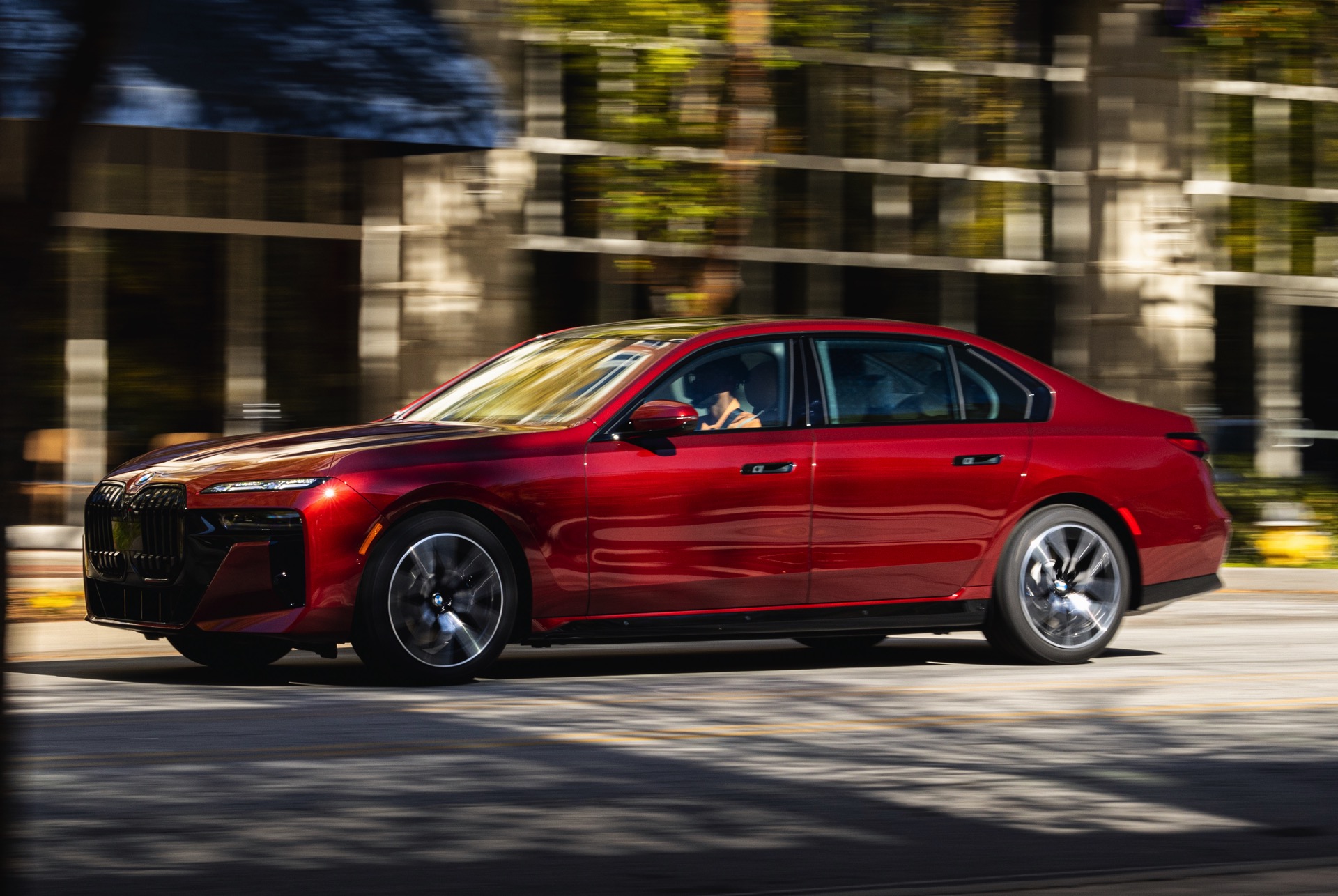 In der Seitenansicht des fast 5,40 Meter langen Elektro-7ers sehen wir die 20 Zoll  großen M Aerodynamikräder 907 M Bicolor, die in diesem Kontext keinesfalls überdimensioniert wirken. Auch in diesem Detail zeigt sich: Selbst wenn es sich beim BMW i7 eDrive50 formal betrachtet um das Einstiegsmodell der elektrischen 7er-Reihe handelt, ist die Luxuslimousine in jeder Variante deutlich oberhalb gewöhnlicher Automobile unterwegs. Auch seine 455 PS und 650 Newtonmeter Drehmoment klingen kaum nach Basismodell, auch wenn die beiden übrigen Varianten i7 xDrive60 und i7 M70 noch weitaus stärker motorisiert sind. "
