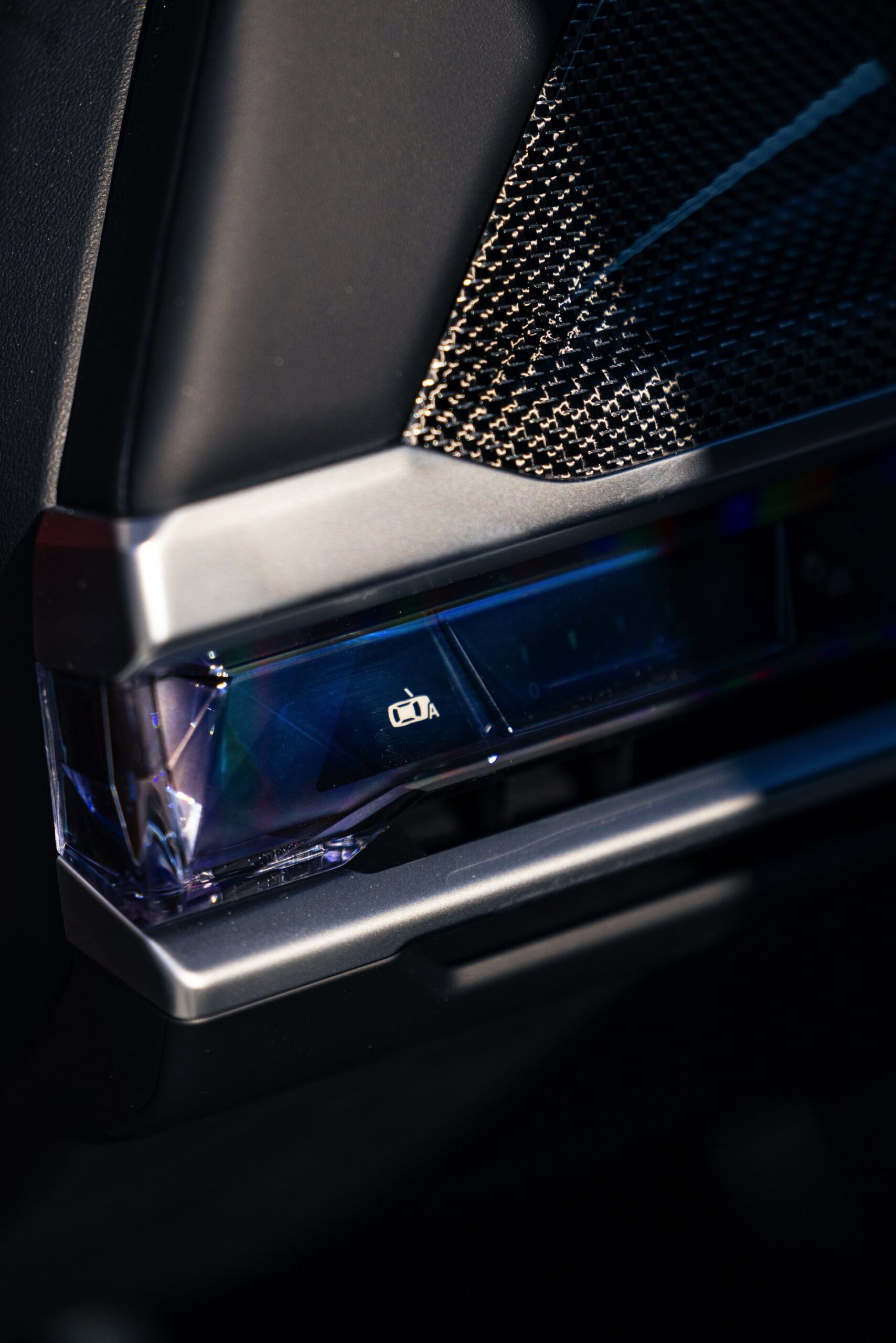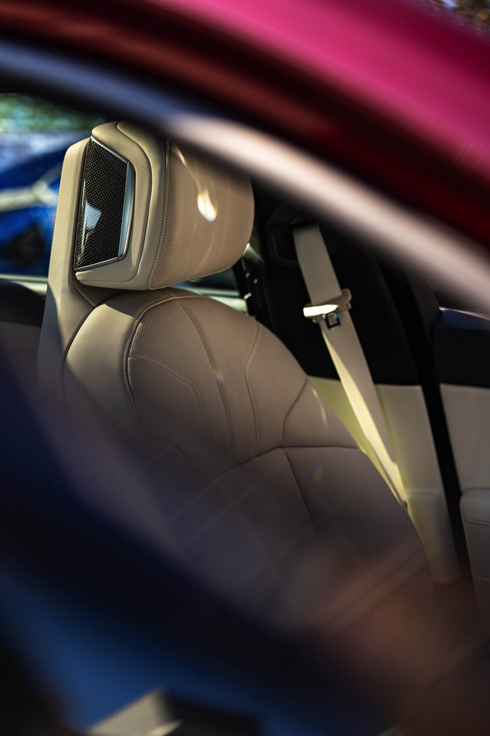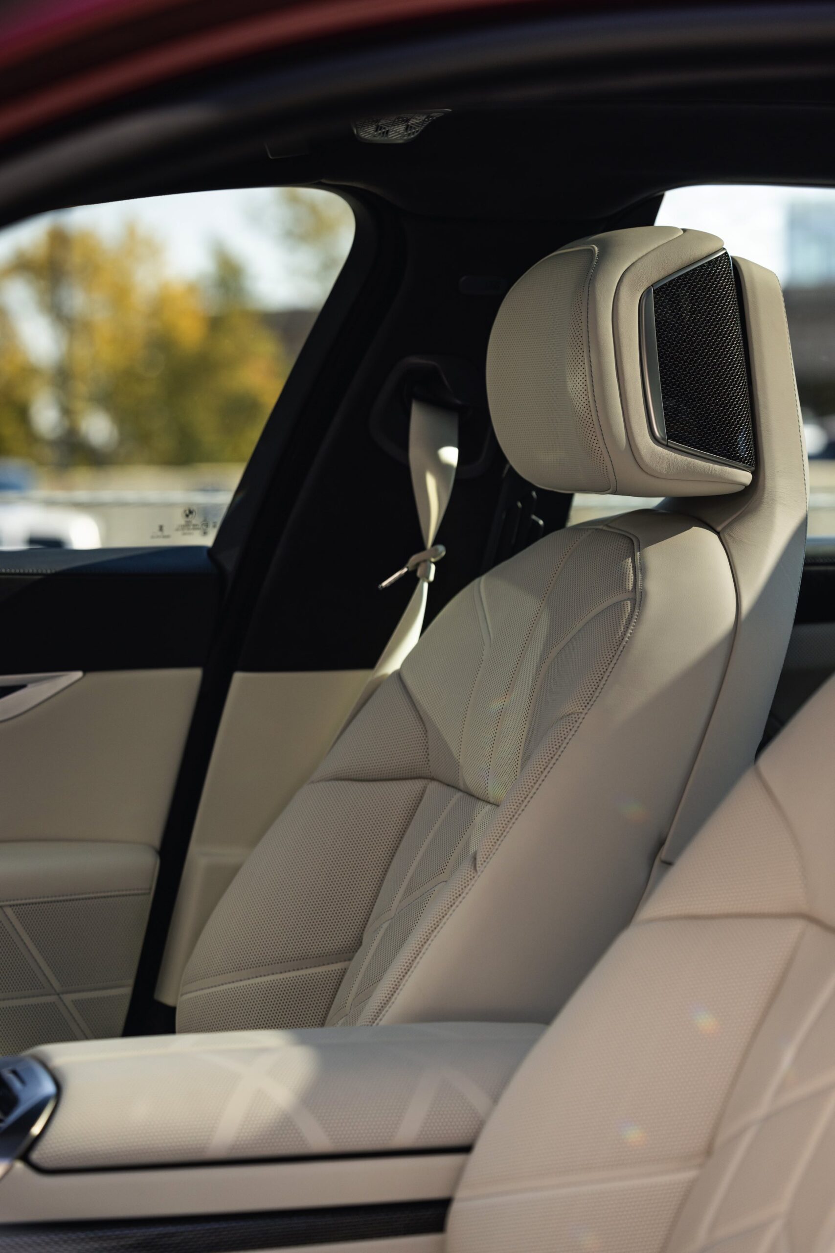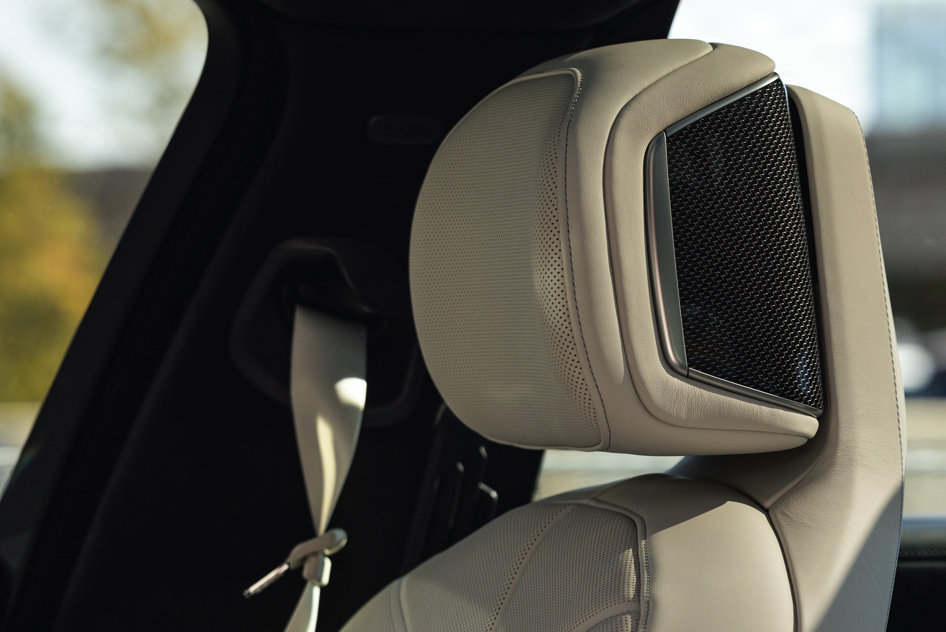 Im Innenraum sehen wir eine edle Ausstattung in Rauchweiß, die mit den dunklen Interieurleisten ‘Carbon Fibre’ als sportlichem Kontrast kombiniert wird. Genau wie die Materialien der übrigen Zierleisten werden auch die Carbon-Bauteile in den vorderen Kopfstützen aufgegriffen.