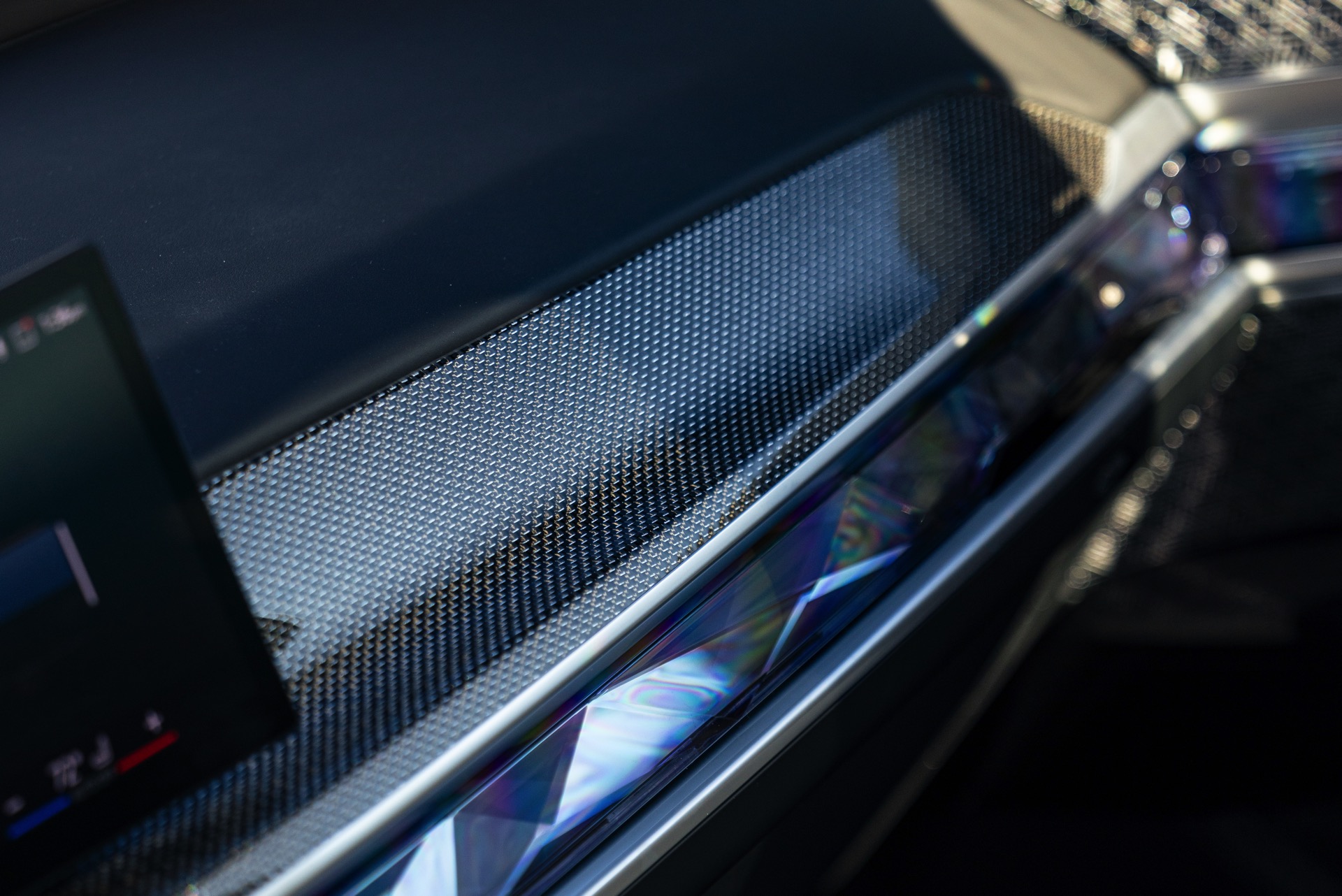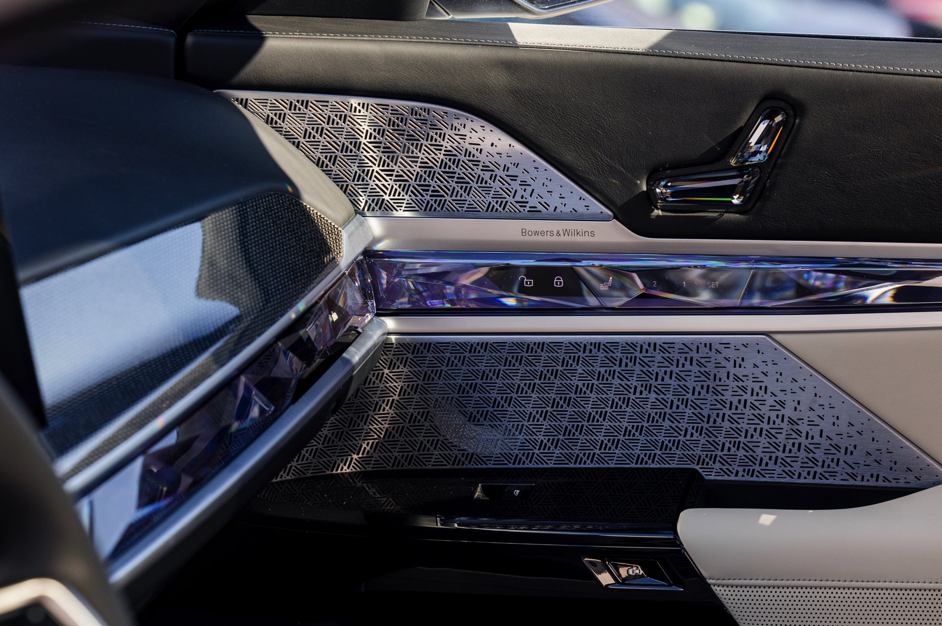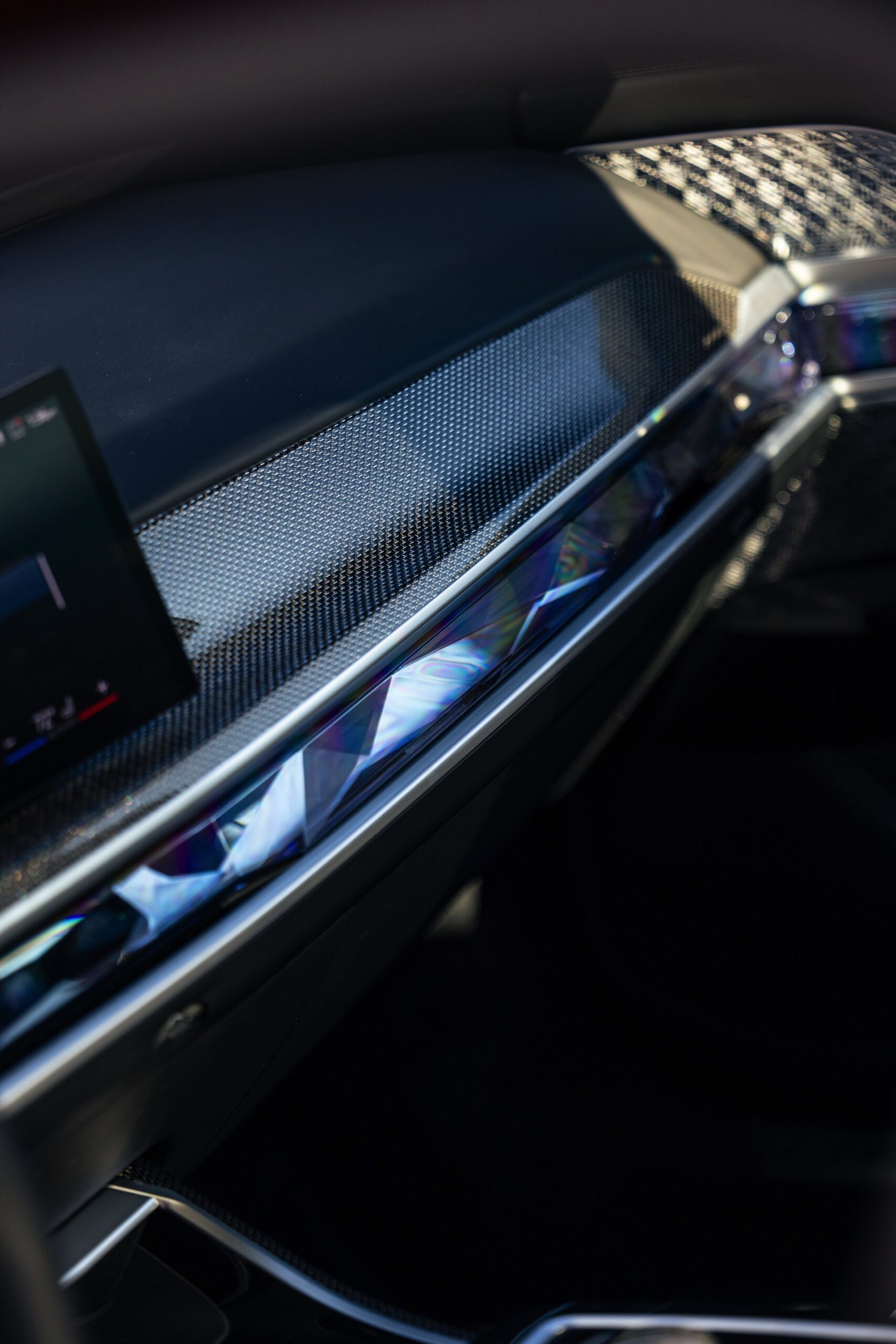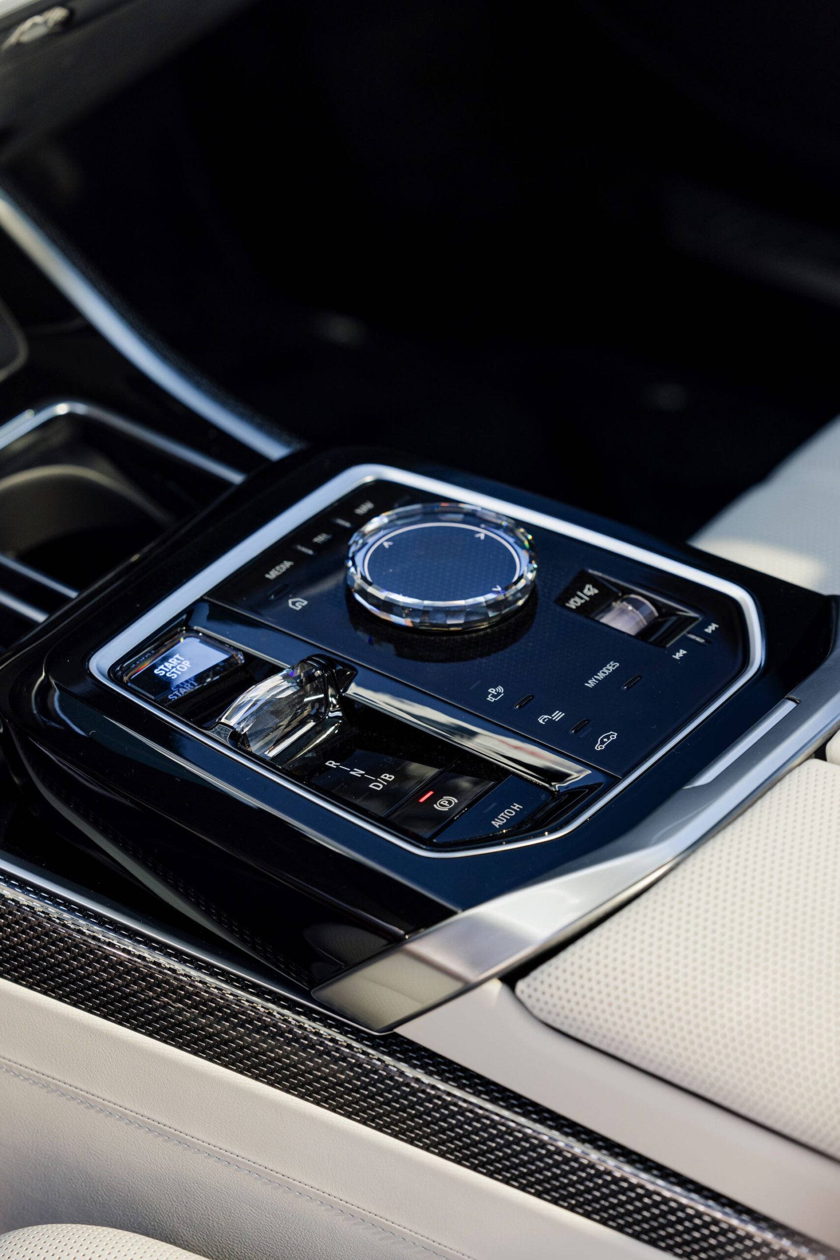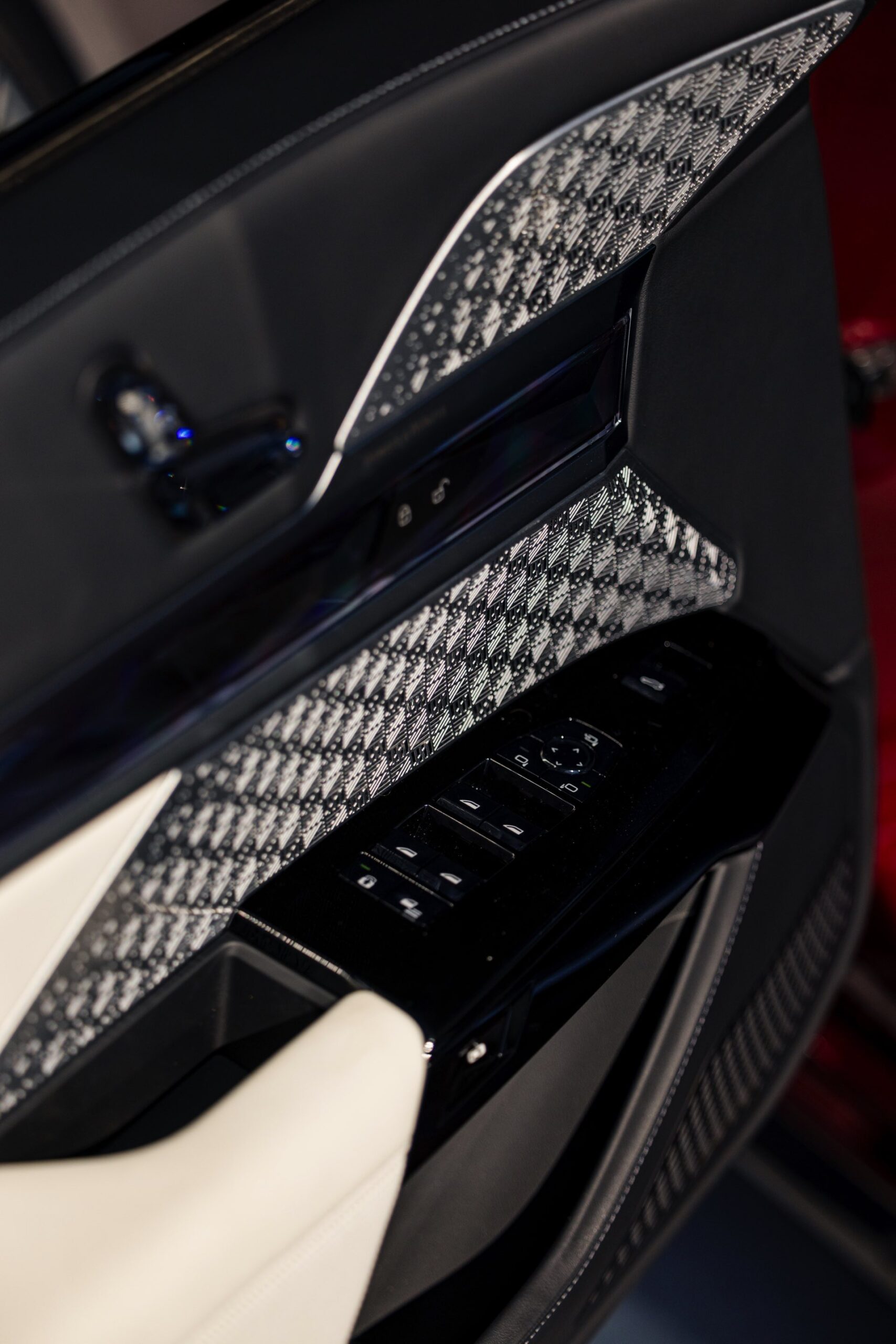 Im Innenraum sehen wir eine edle Ausstattung in Rauchweiß, die mit den dunklen Interieurleisten ‘Carbon Fibre’ als sportlichem Kontrast kombiniert wird. Genau wie die Materialien der übrigen Zierleisten werden auch die Carbon-Bauteile in den vorderen Kopfstützen aufgegriffen.