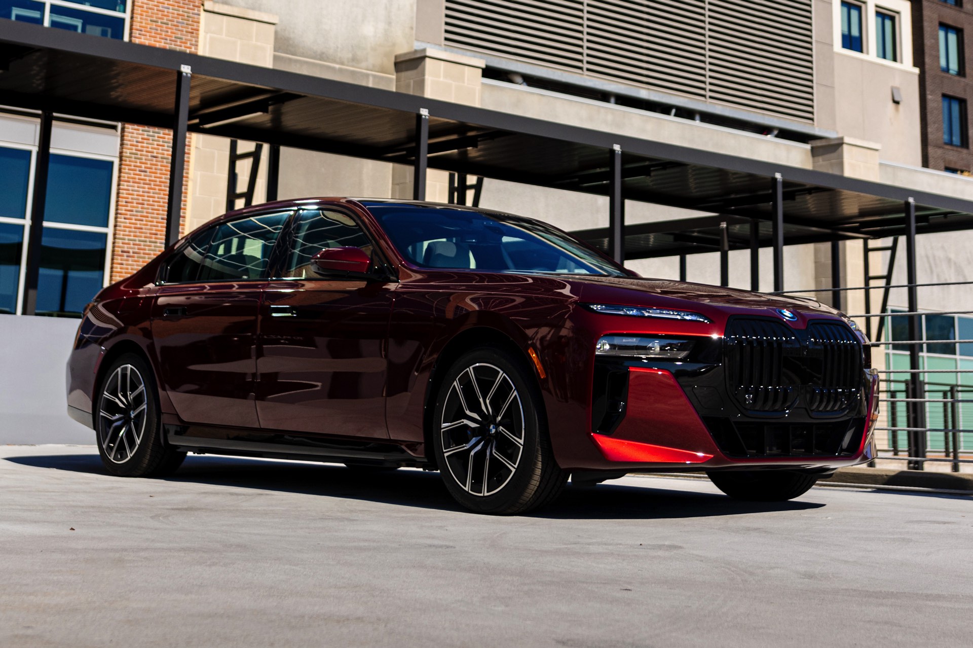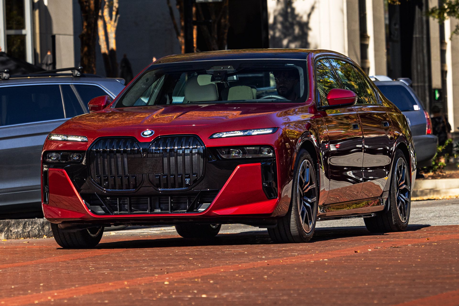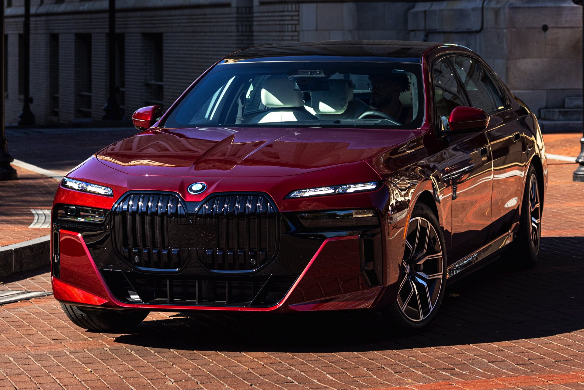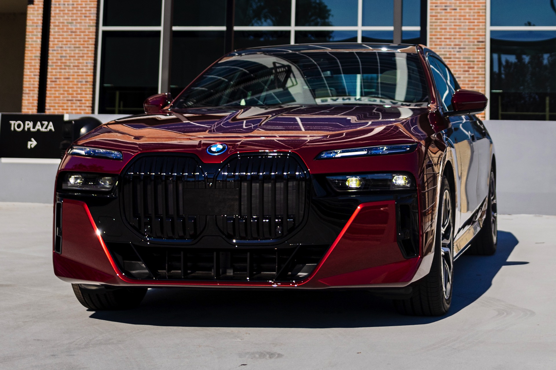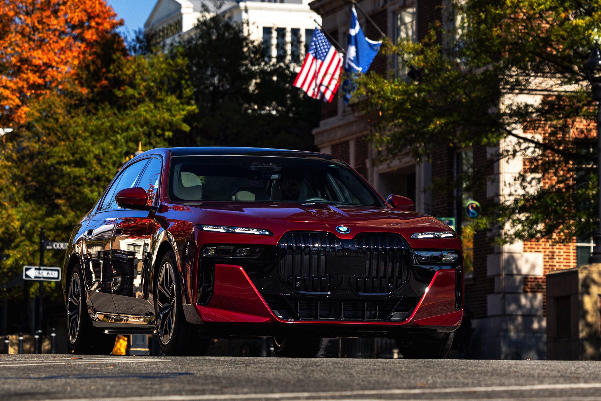 Noch mächtiger als bei uns wirkt die Niere der neuen BMW 7er-Reihe (G70) in der US-Version ohne vorderes Kennzeichen. Aktuelle Fotos zeigen uns einen amerikanischen BMW i7 eDrive50 mit M Sport Pro-Paket, der dank seiner Lackierung in Aventurinrot Metallic ein absoluter Hingucker ist. Die schwarzen Details der Shadow Line mit erweiterten Umfängen sorgen dabei für einen deutlichen Kontrast zur roten Lackierung und verleihen der Luxuslimousine einen sportlichen Touch. Bemerkenswert ist auch, wie sehr die unteren Elemente der horizontal geteilten Scheinwerfer bei einer solchen Konfiguration in den Hintergrund treten.