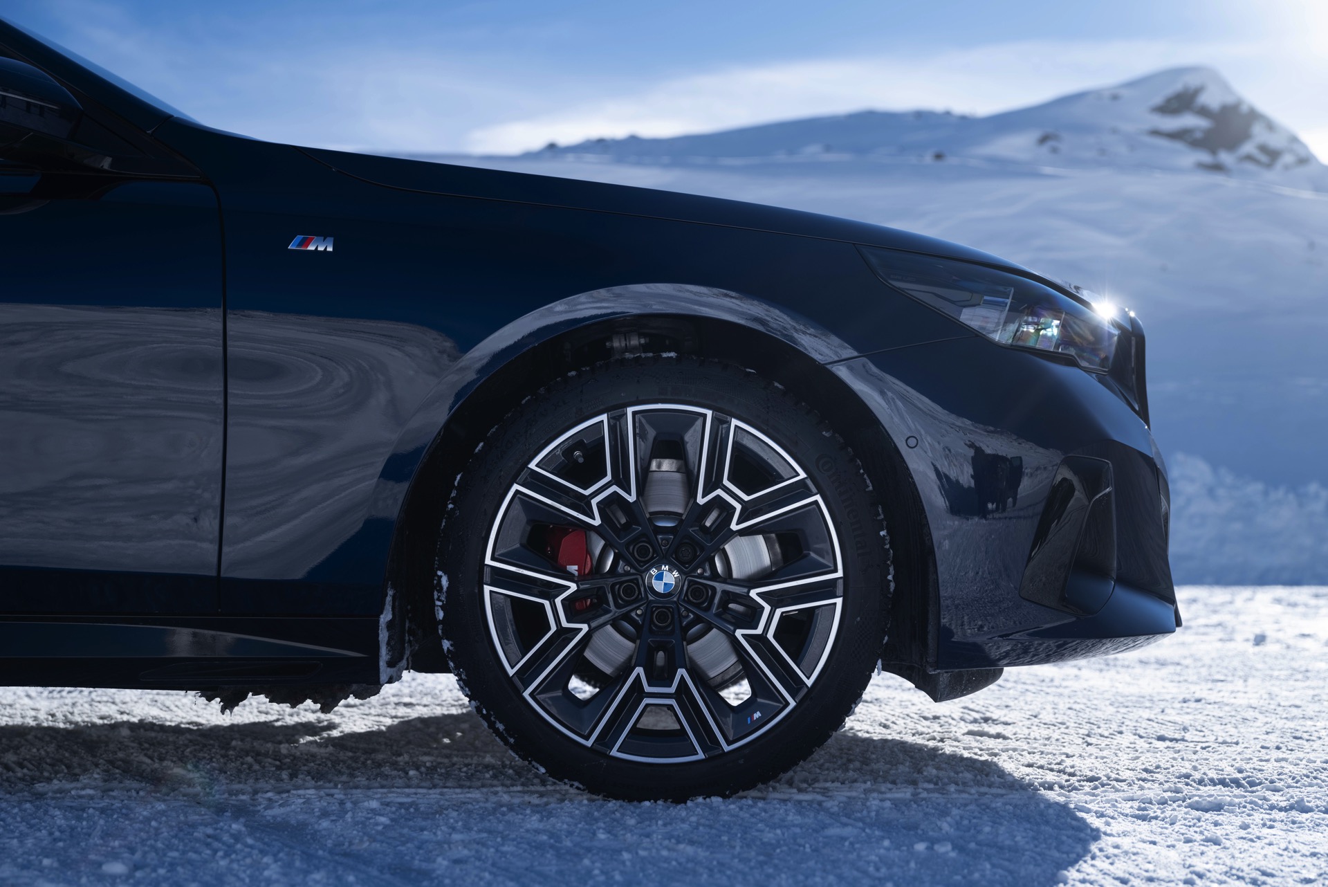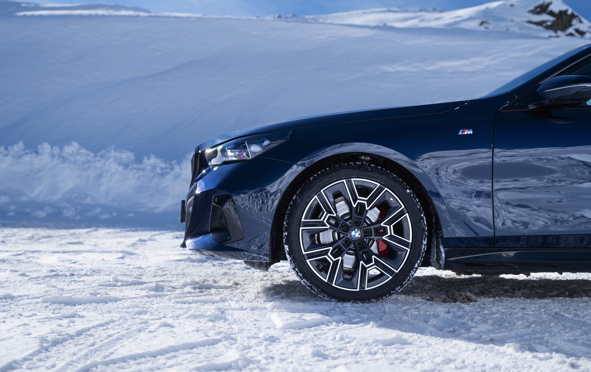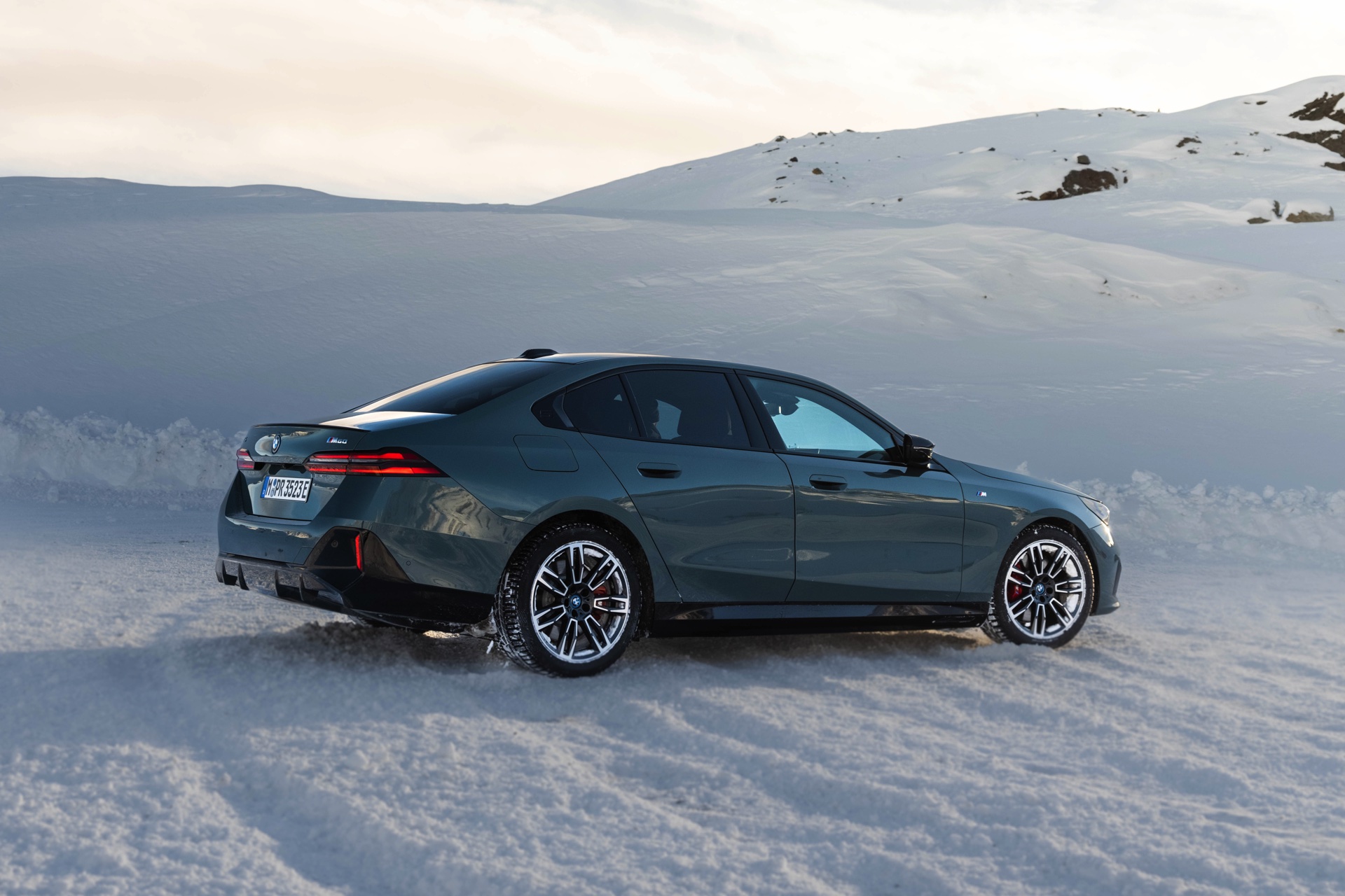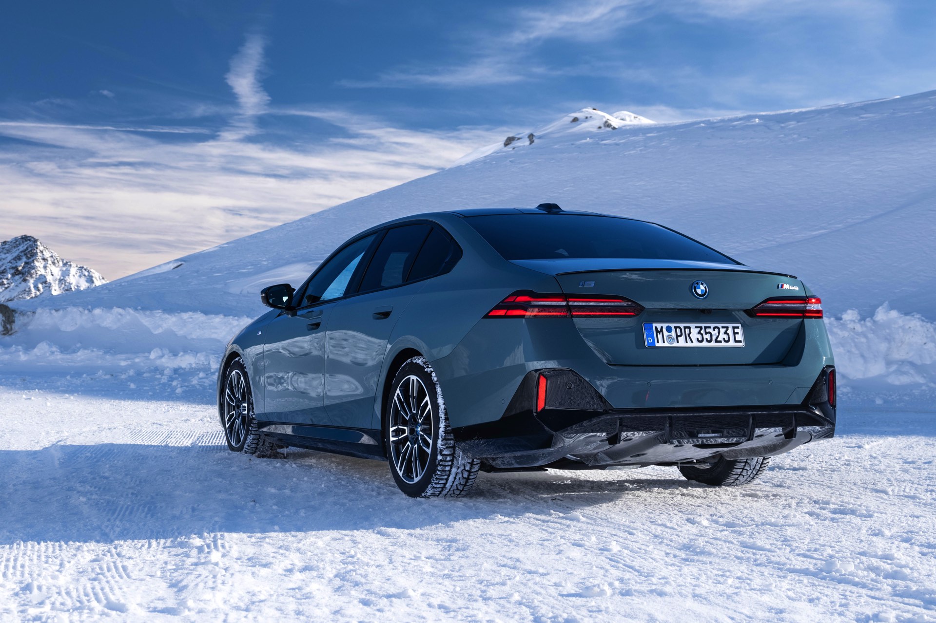 Während die Business-Limousine bisher meist auf großen Felgen mit Sommerbereifung zu sehen war, erhalten wir nun auch einen Eindruck vom weniger imposanten Look auf Winterrädern: Der BMW i5 M60 in Cape York Green trägt “nur” die 19 Zoll großen Leichtmetallräder Doppelspeiche 935 M Bicolor, die gewissermaßen die Serien-Felgen des M Sport-Pakets darstellen. Im direkten Vergleich ist der erheblich schwächere 520d xDrive, der nur knapp ein Drittel der Leistung bietet, auf größerem Fuß unterwegs: Er trägt die 20 Zoll großen Aerodynamikräder 939 M Bicolor Schwarzgrau.
