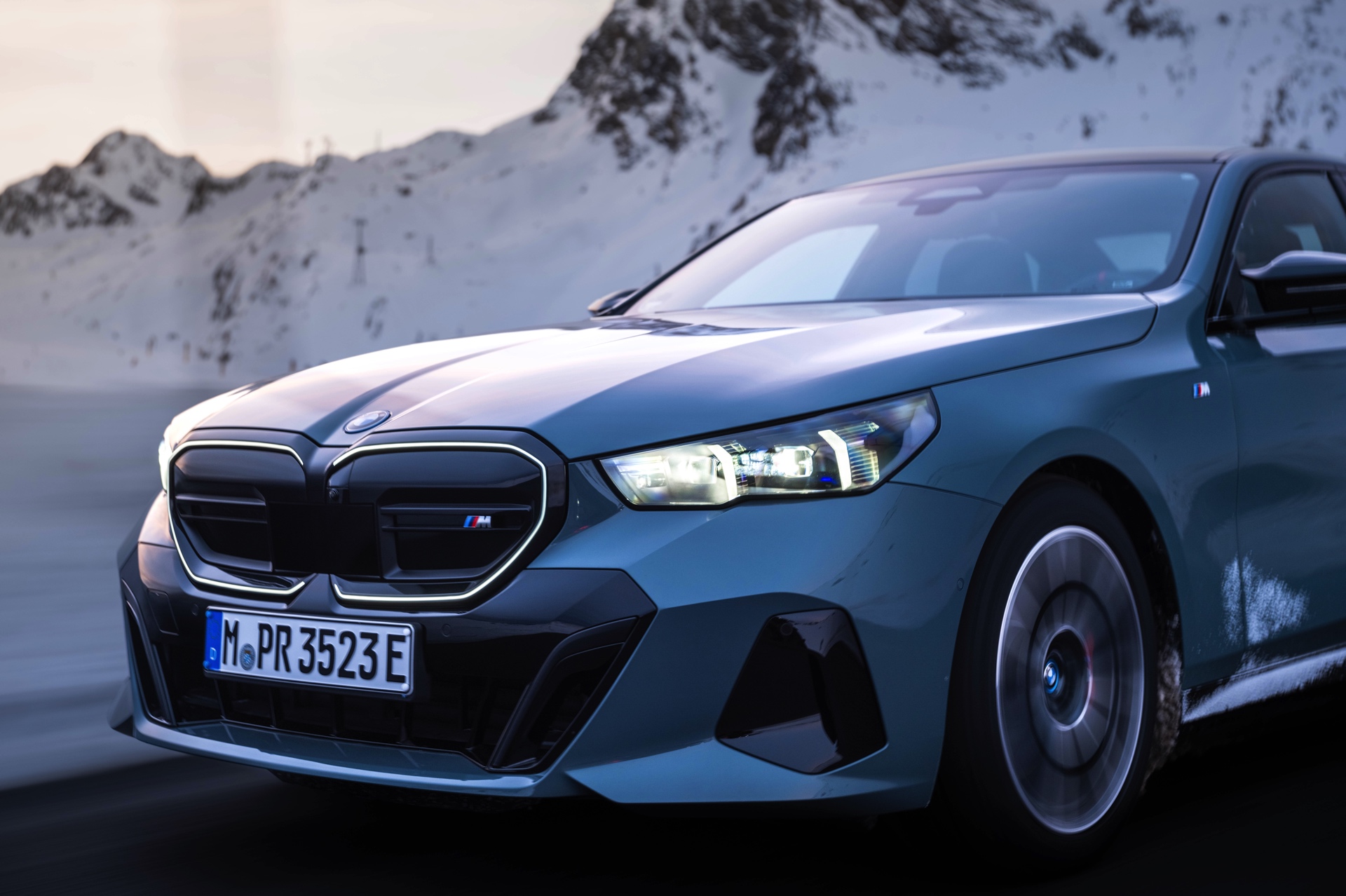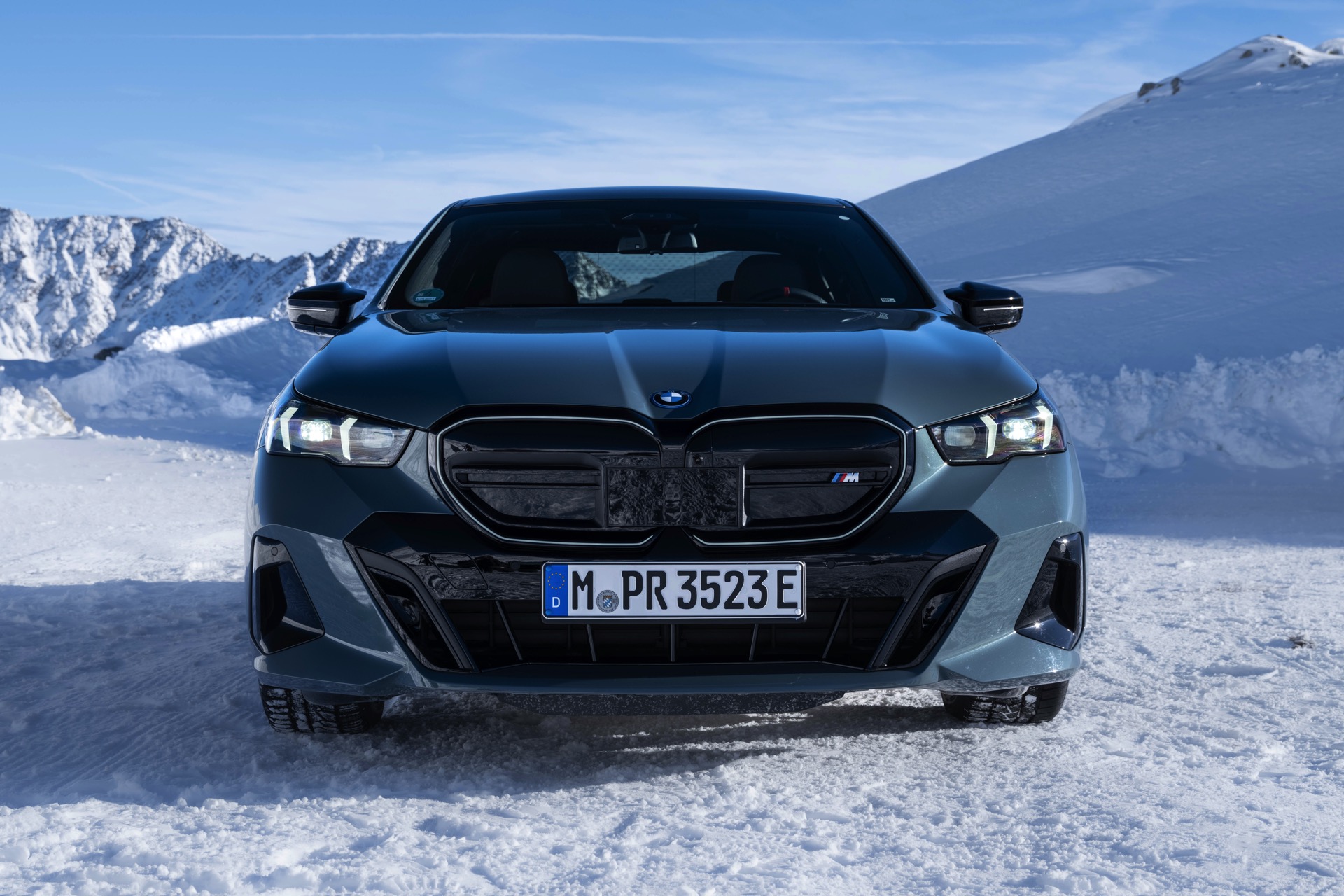 Auf den Fotos sehen wir einen BMW i5 M60 in Cape York Green und einen neuen BMW 520d mit M Sport Pro-Paket in Tansanitblau Metallic. Beide Modelle tragen die M-Optik und liegen trotz vollkommen unterschiedlicher Positionierung optisch eng beieinander: Wichtigstes Erkennungszeichen des i5 M60 ist die Niere mit horizontalen Streben, die das knapp über 600 PS starke Topmodell vom Rest der 5er-Palette unterscheidet.