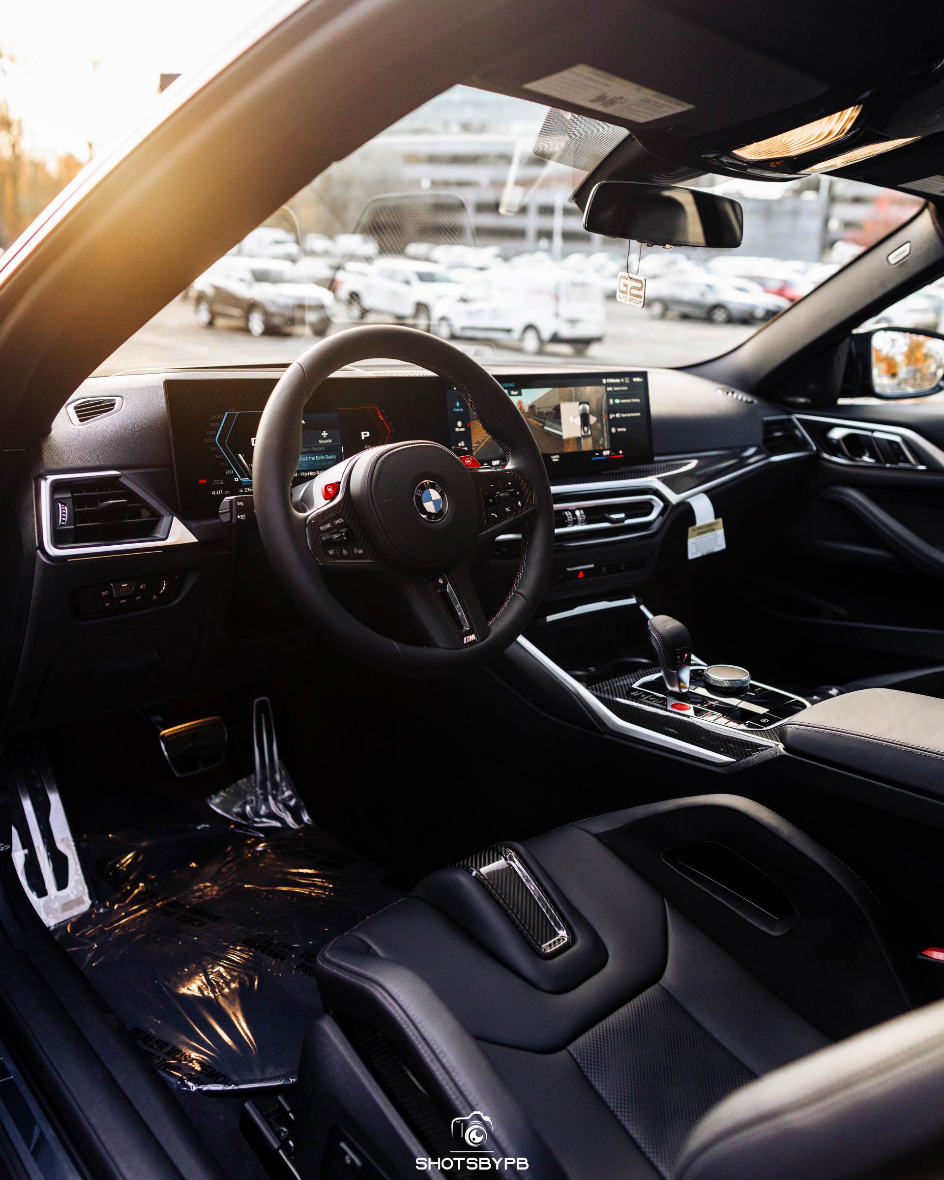 Dass der Innenraum bei einem derart speziellen Exterieur fast ein bisschen gewöhnlich wirkt, lässt sich allerdings kaum vermeiden: Das Cockpit mit Curved Display und den Interieurleisten ‘Carbon Fibre’ bleibt auch deshalb vergleichsweise nah am Serien-Lookl, weil bei der Konfiguration auf simples Schwarz statt auffälligere Farben gesetzt wurde. Als zupackender Hingucker fungieren hier lediglich die M Carbon Schalensitze, die mit ihren hohen Sitzwangen bei jedem Ein- und Aussteigen an das fahrdynamische Potenzial des M4 Competition erinnern.