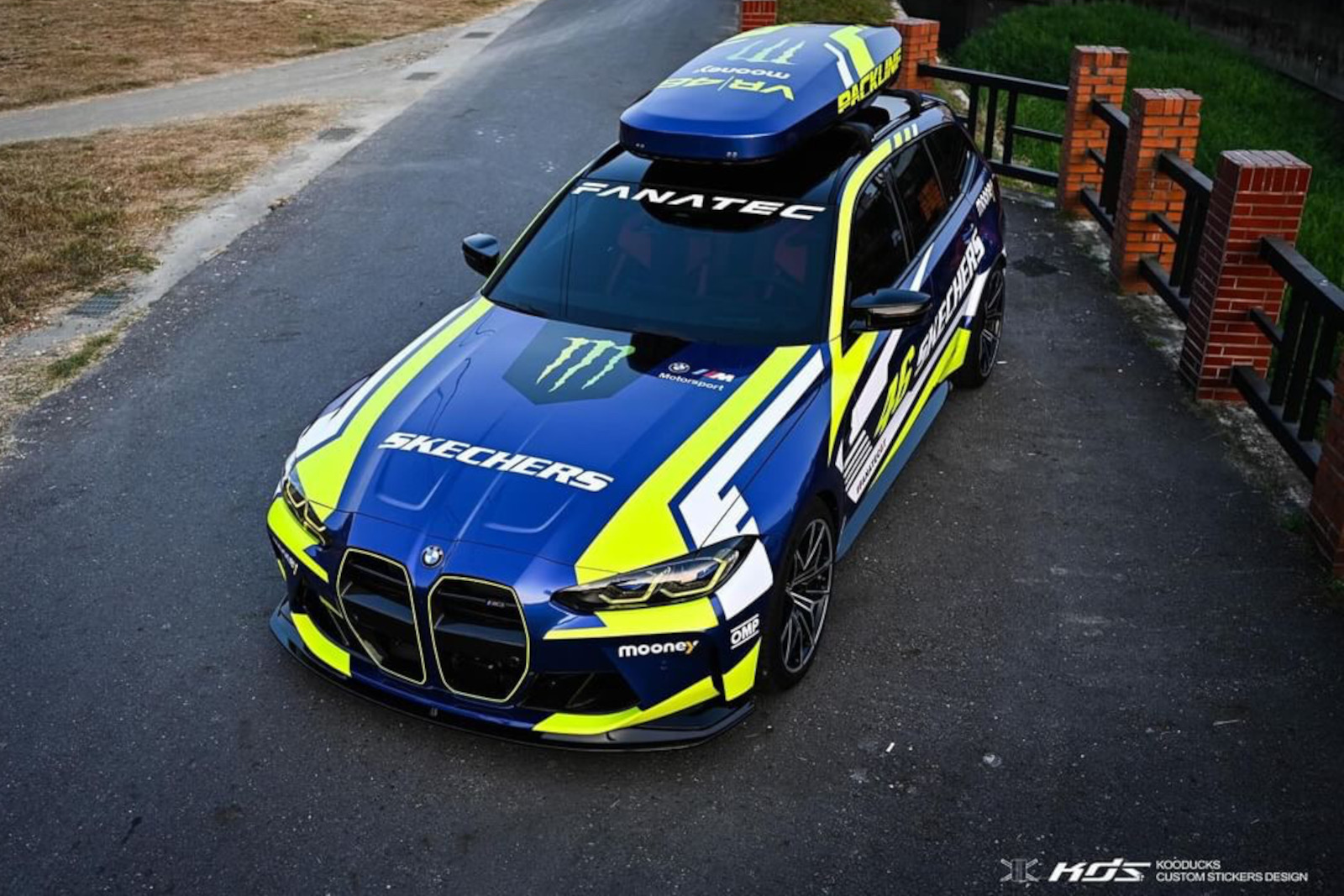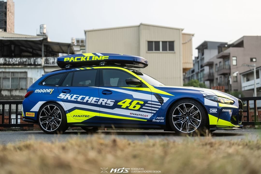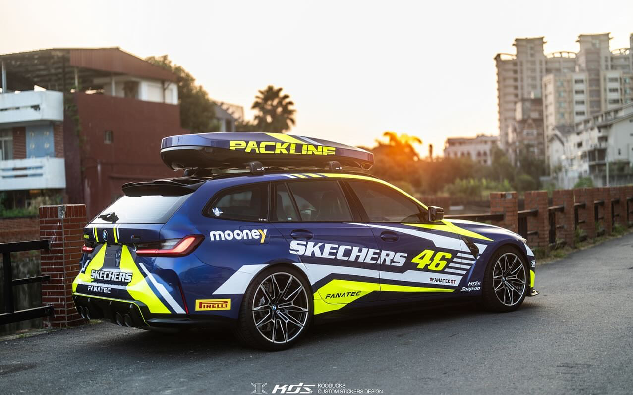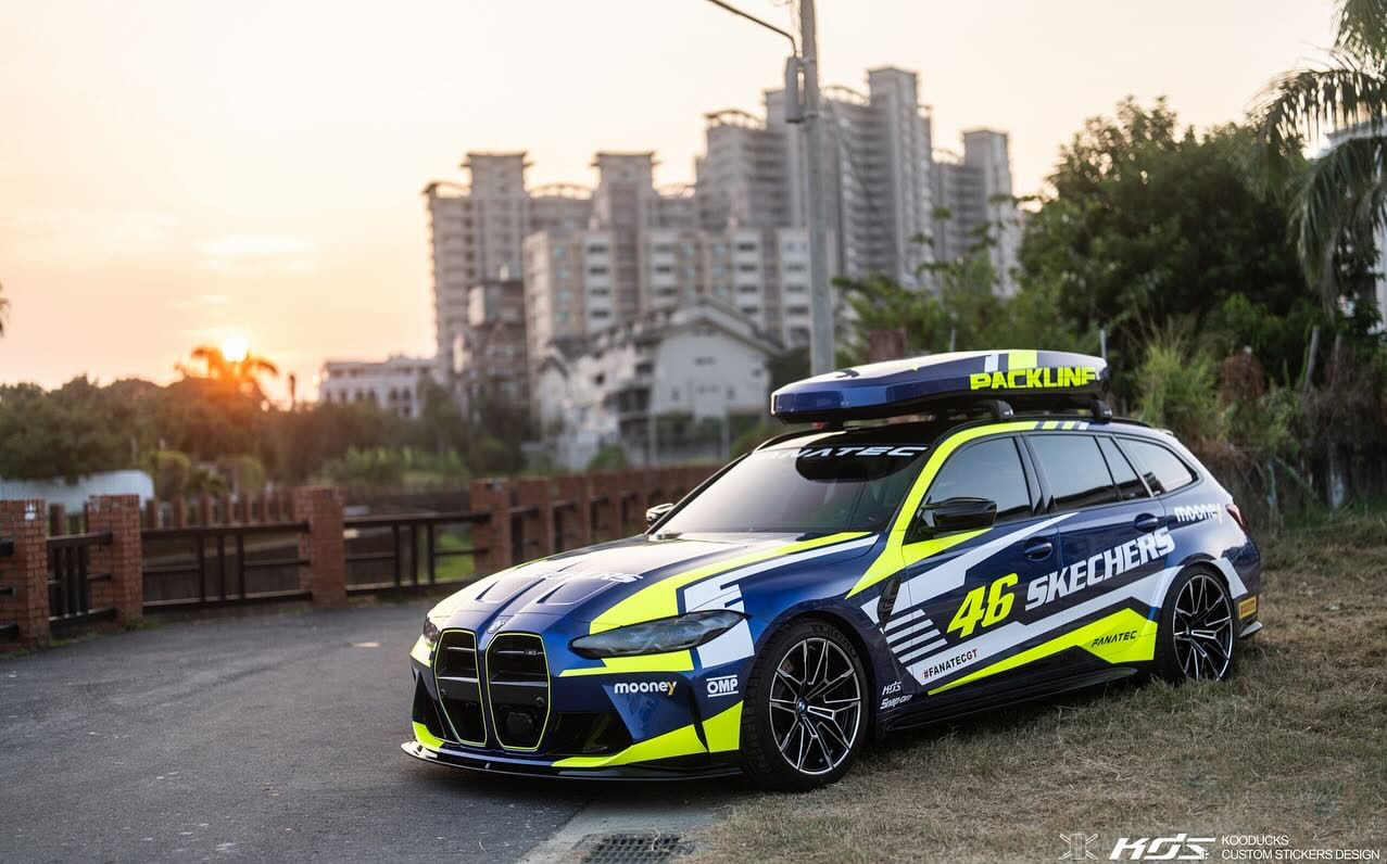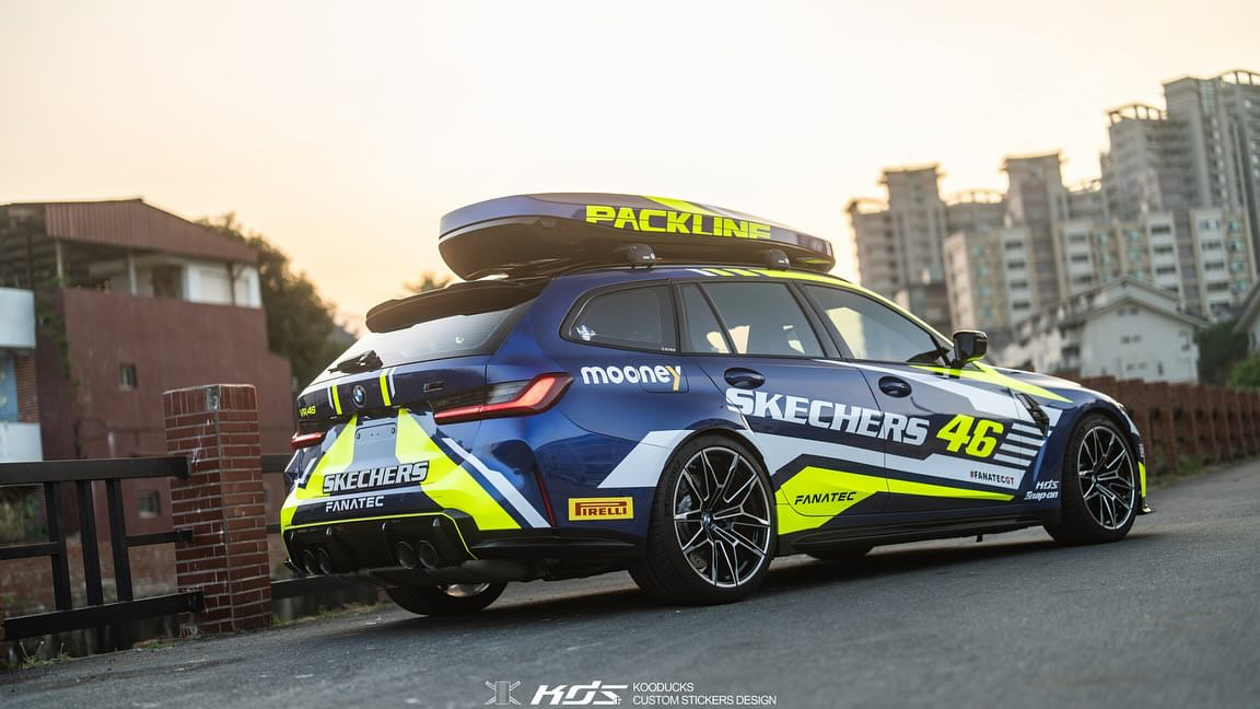 Der G81 von Jimmy Hsieh ist in Taiwan unterwegs und ist zweifellos auch mit seiner regulären Lackierung in Portimao Blau ein absoluter Hingucker, aber im Look der Rennwagen von Valentino Rossi steigt der Aufmerksamkeits-Faktor nochmals deutlich: Mit Design-Akzenten und Schriftzügen in Neongelb und Weiß wirkt der BMW M3 Touring auf den ersten Blick wie frisch von der Rennstrecke, obwohl er sogar eine Dachbox trägt und damit noch etwas mehr Platz als üblich bietet.