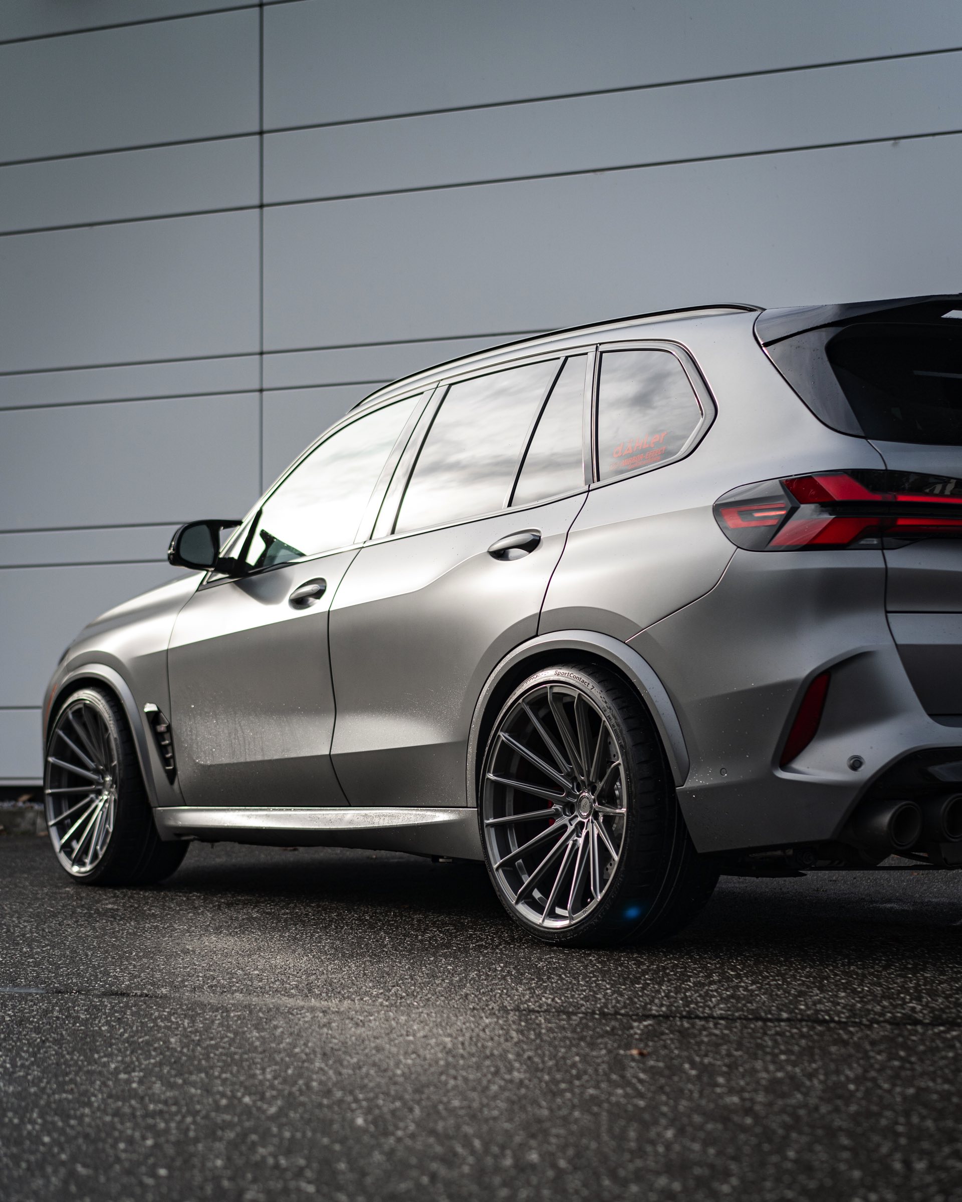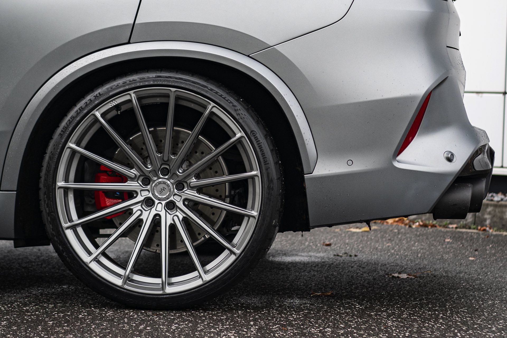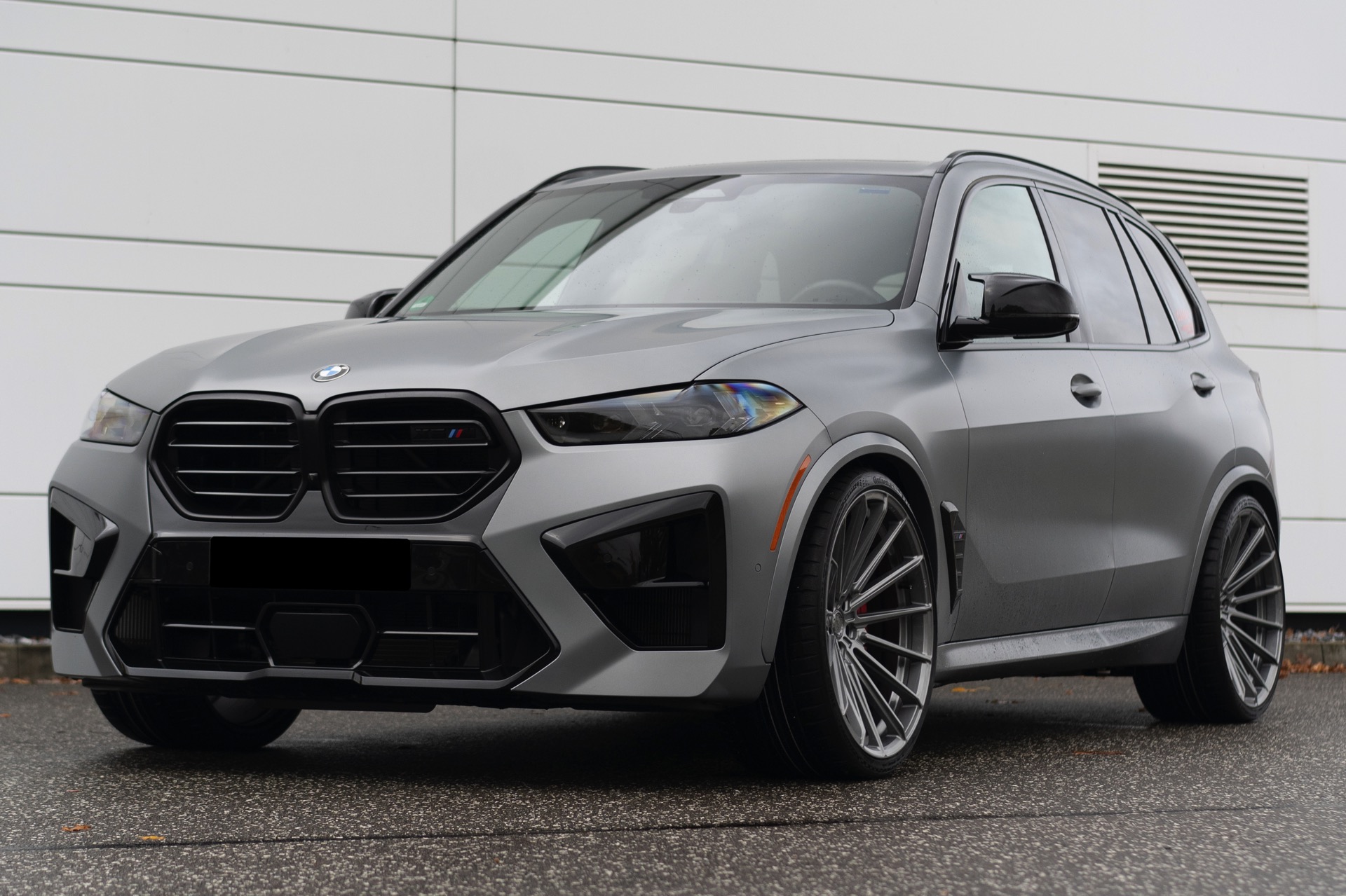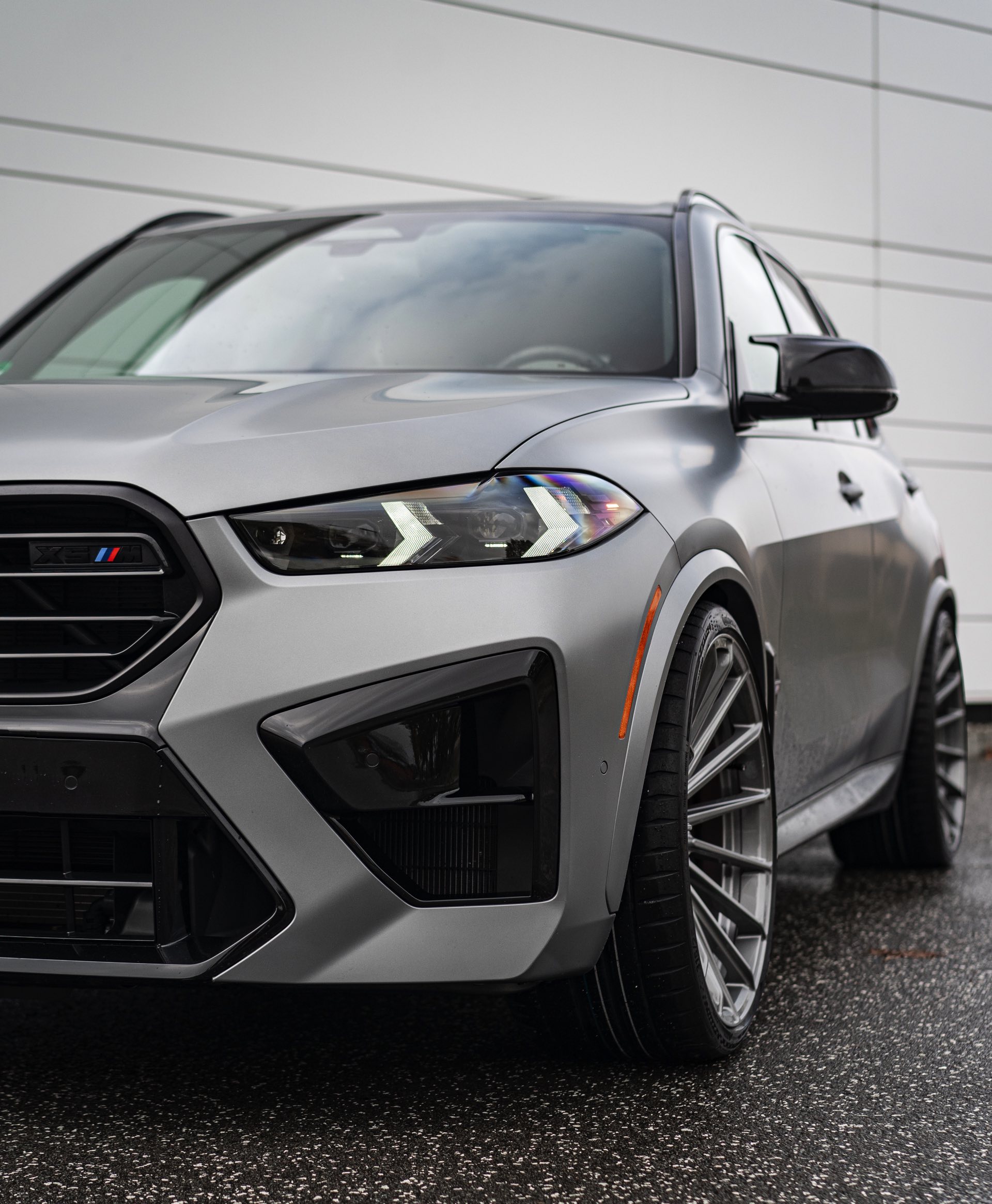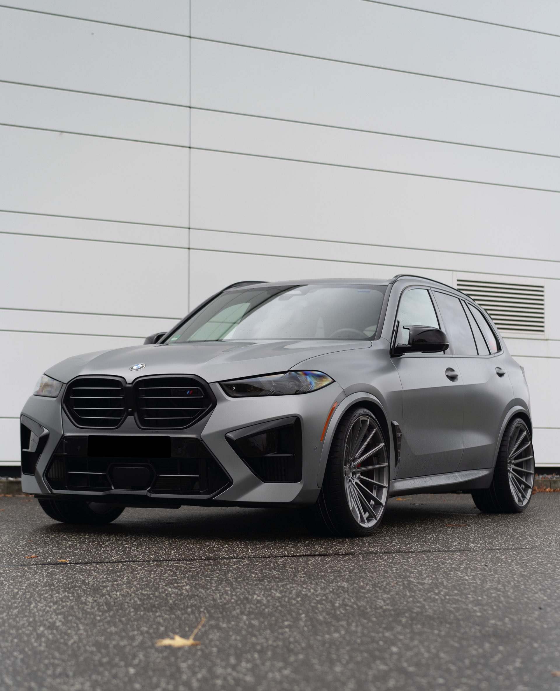 Auf den uns von Elferwerk zur Verfügung gestellten Fotos sehen wir die 23-Zöller auf einem X5 M in Frozen Pure Grey Metallic, sodass sich ein extrem imposanter Auftritt ergibt: Die beeindruckenden Abmessungen des kürzlich überarbeiteten X5 (G05 LCI) werden mit dem brutalen Selbstbewusstsein der High Performance-Variante kombiniert, vor allem die Front mit ihrer eigenständigen M-Niere samt horizontalen Streben und dem riesigen Lufteinlass darunter verzichtet auf jede Zurückhaltung. Die seit dem Facelift schmaler gezeichneten Scheinwerfer und die M-Außenspiegel tragen ebenfalls dazu bei, dass es diesem SUV ganz sicher nicht an Überholprestige mangelt. "