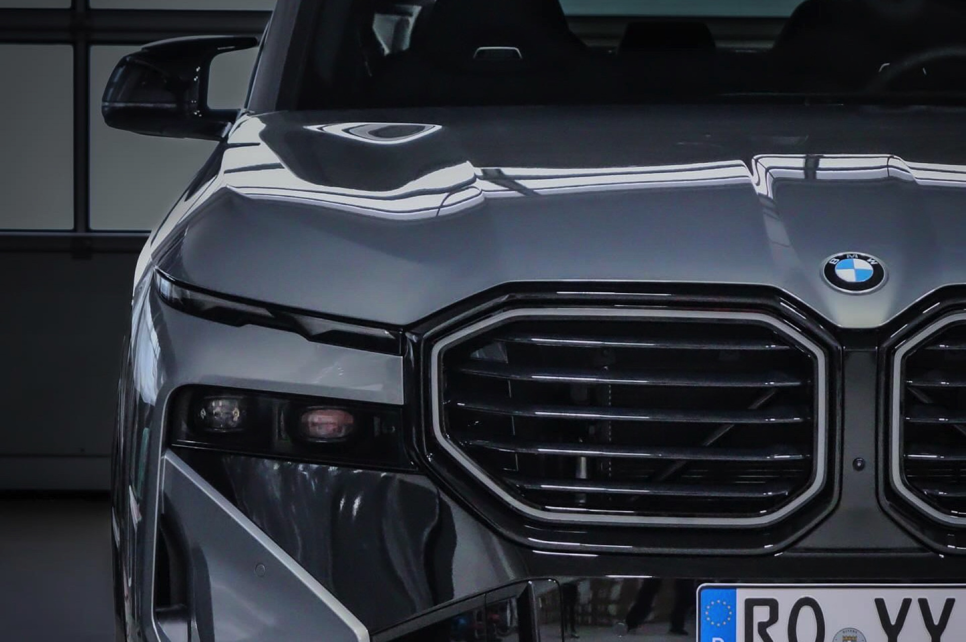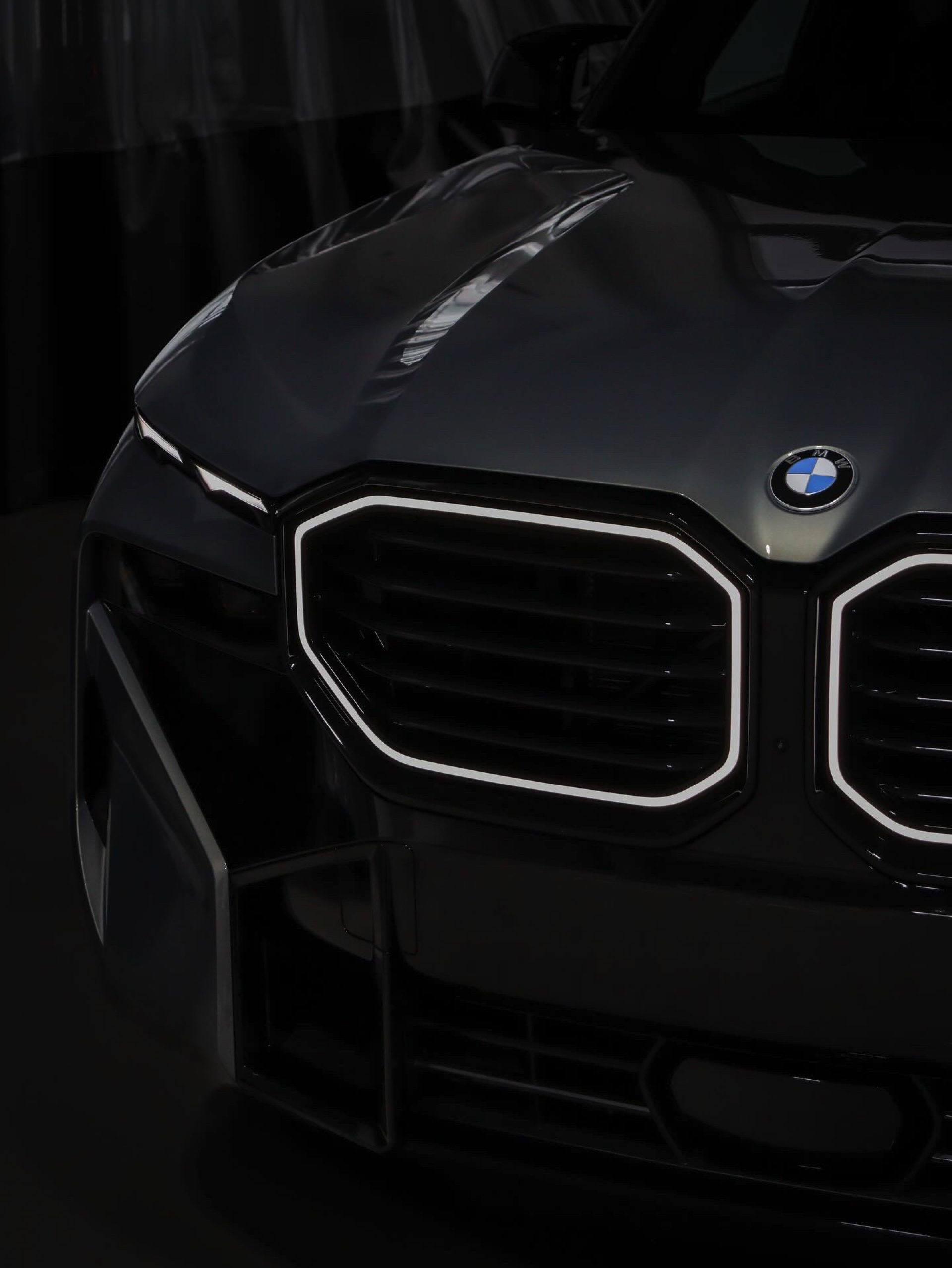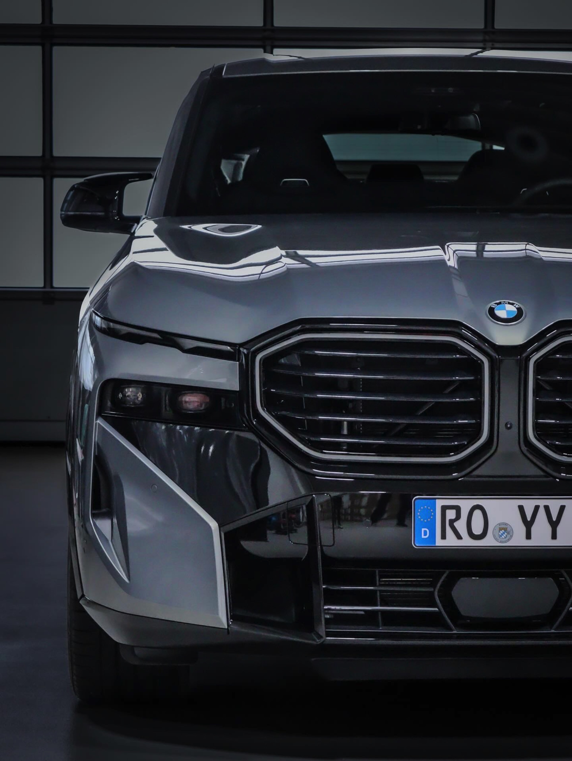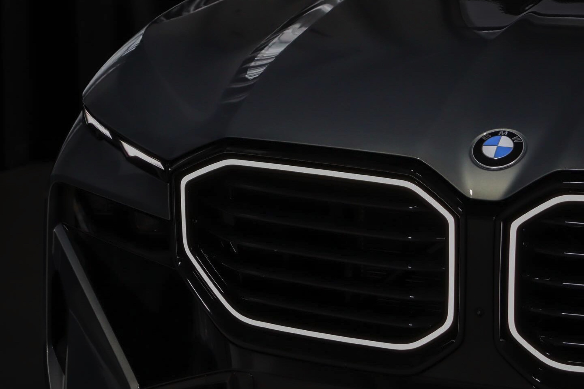 Die Lackierung in Stratusgrau (Farbcode 440) wird bei seinem Fahrzeug mit der Shadow Line mit erweiterten Umfängen kombiniert, sodass fast alle serienmäßig goldenen Details in Hochglanz-Schwarz gehalten sind. Hierzu zählen insbesondere die Einfassungen von Nieren und Fenstern, die mit einem Finish in Gold für einen ganz anderen Auftritt sorgen würden, der gerade in Europa nicht jedermanns Geschmack trifft. Auch ohne goldene Details ist der BMW XM alles andere als ein unauffälliges Fahrzeug, schon allein die beleuchteten Iconic Glow-Nieren und die ohne aktiviertes Abblend- oder Fernlicht extrem schmal wirkenden Scheinwerfer heben das Power-SUV klar vom Rest der Modellpalette ab.