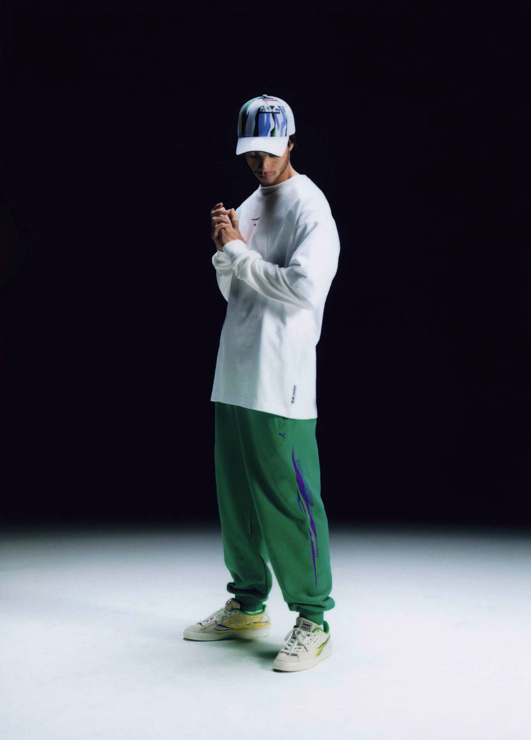 Wer sich komplett einkleiden möchte, muss exakt 560 Euro in die Hand nehmen: Cap und T-Shirt kosten 50 und 70 Euro, Sneaker und Hose kosten jeweils 120 Euro und die Bomber Jacke schlägt mit 200 Euro zu Buche.