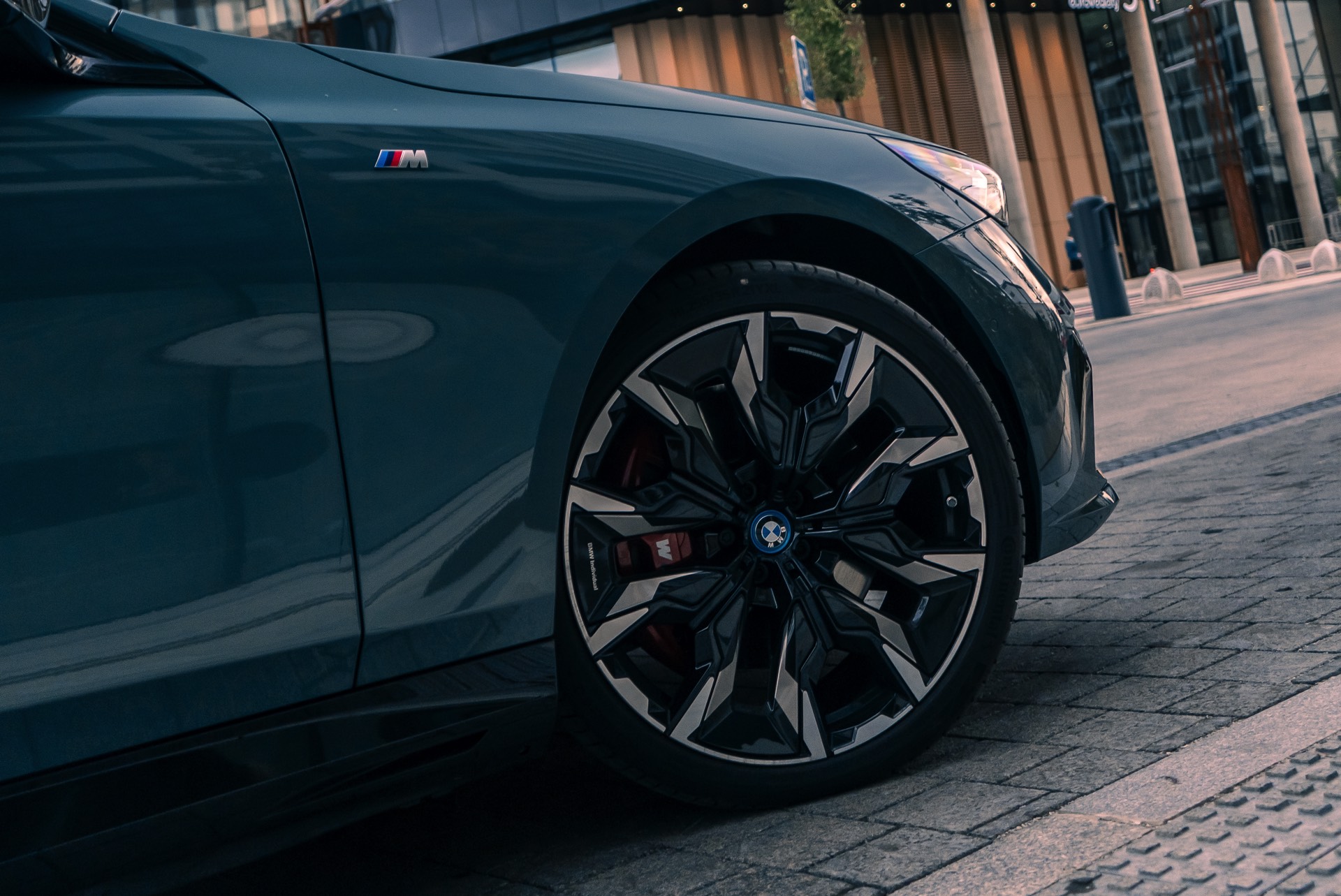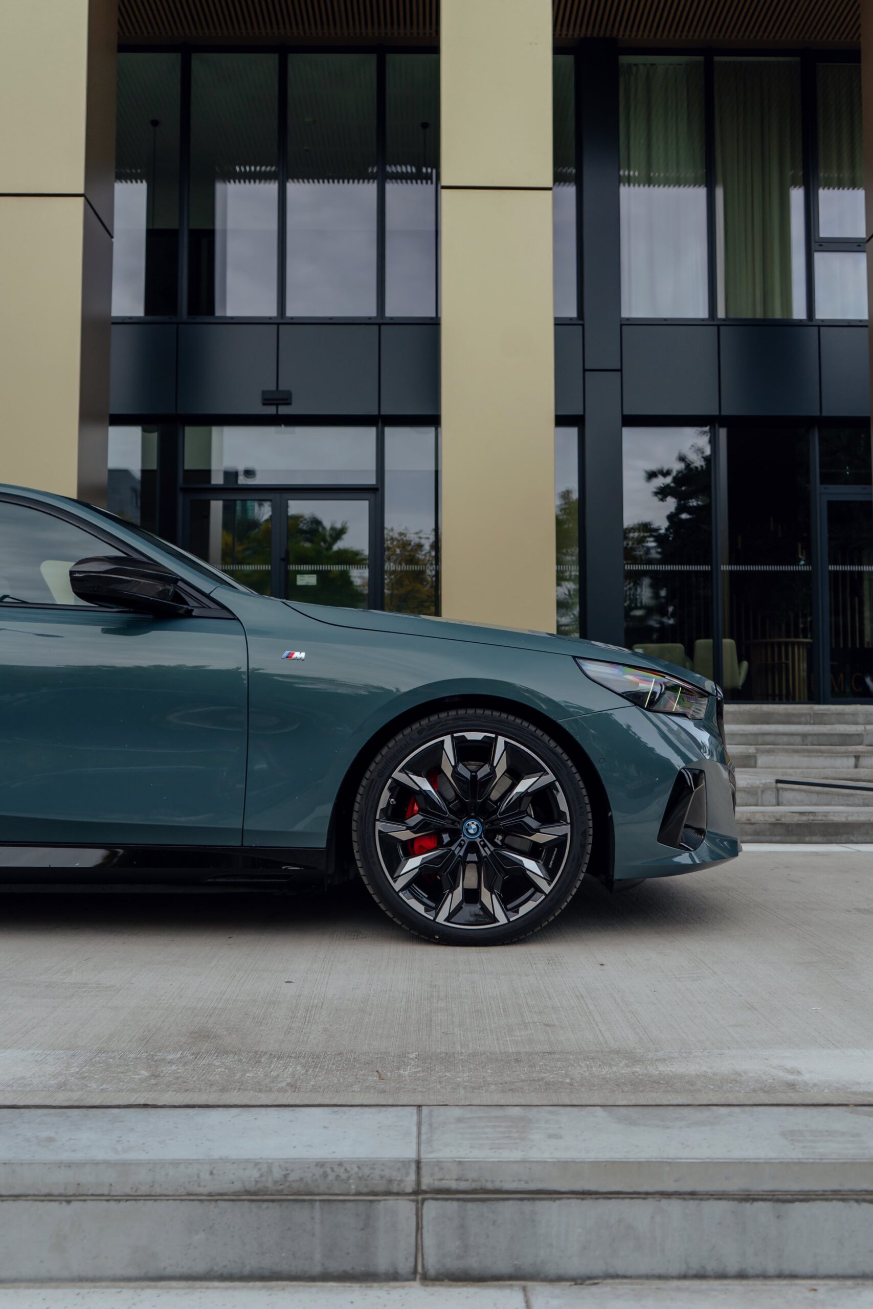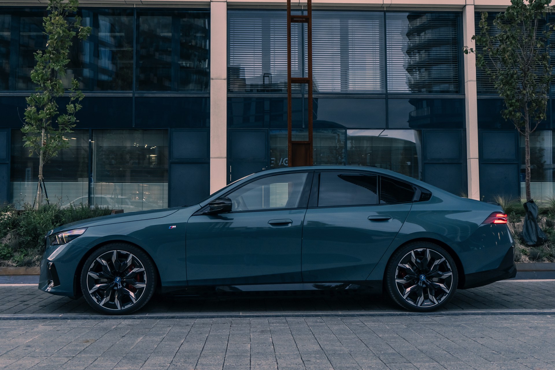 In der Seitenansicht profitiert der gezeigte i5 M60 von den 21 Zoll großen BMW Individual Aerodynamikrädern 954 I Bicolor Jetblack, bei denen es sich derzeit um die größten ab Werk für den G60 erhältlichen Felgen handelt. Die Fenster-Einfassungen samt der im Bereich des Hofmeister-Knicks eingeprägten 5 glänzen dank erweiterter Shadow Line in Schwarz, was gemeinsam mit den ab der B-Säule abgedunkelten Scheiben der Sonnenschutzverglasung zu einem coolen Look beiträgt.