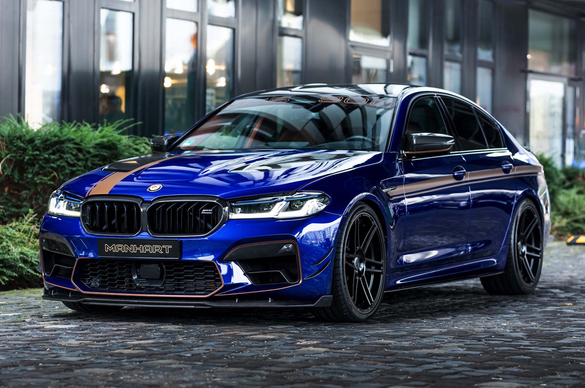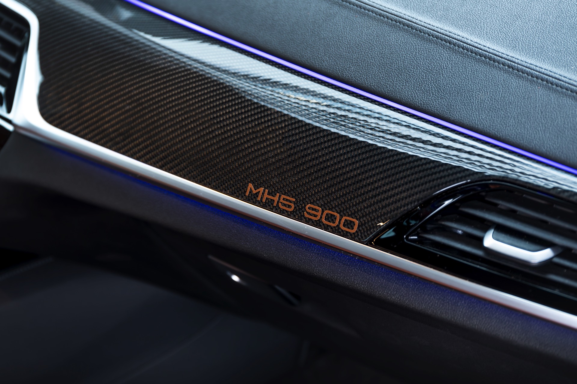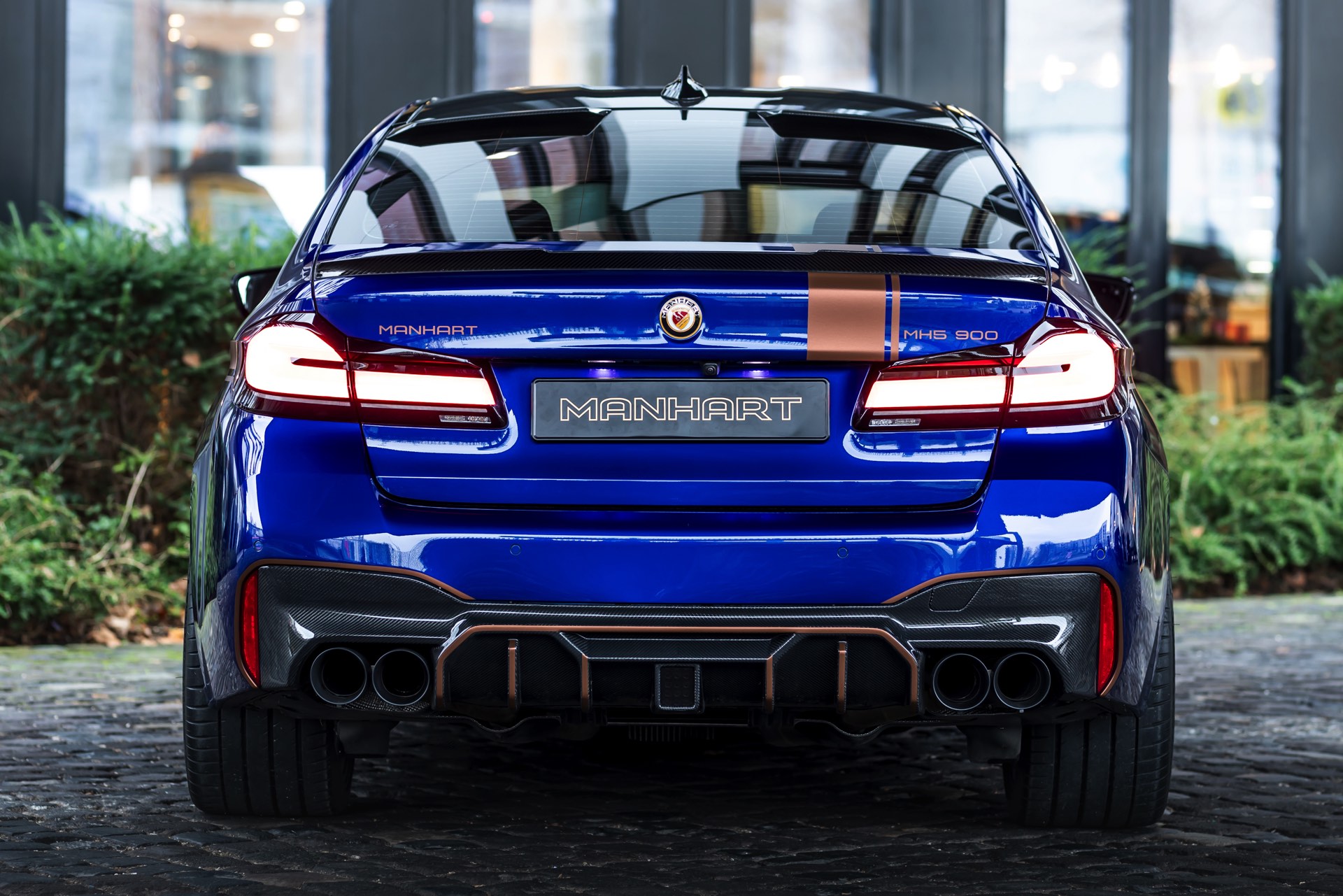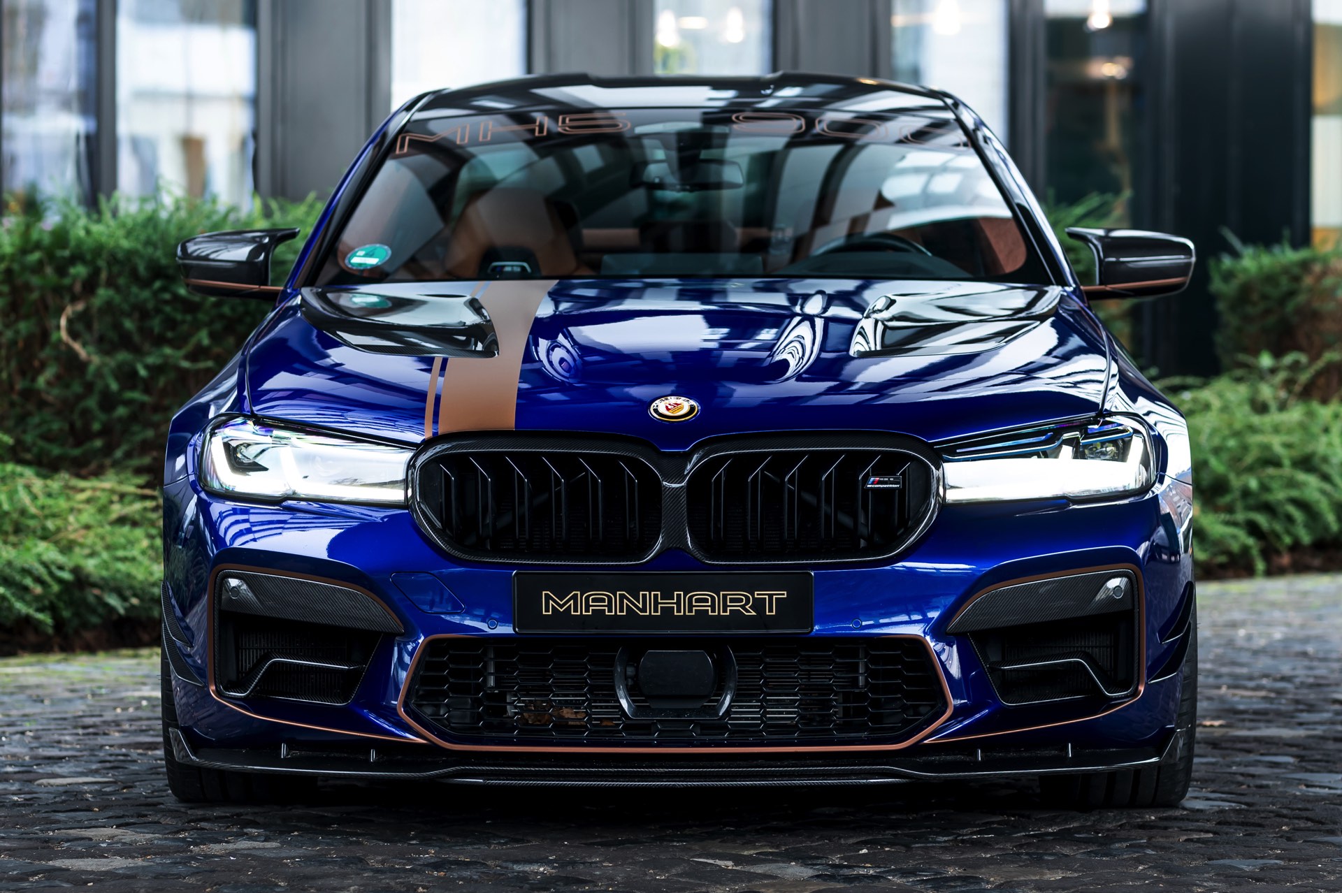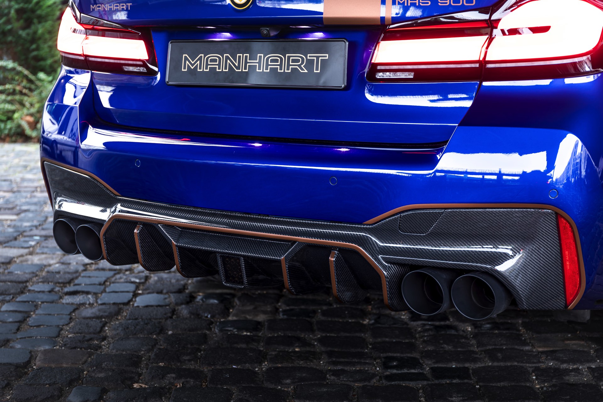 Mit Blick auf die enorme Leistung liegt auf der Hand, dass sich der Manhart MH5 900 01/05 auch einen außergewöhnlichen Auftritt erlauben kann: Die Power-Limousine strotzt vor Carbon-Anbauteilen von der Motorhaube bis zum Diffusor und glänzt zudem mit einer kupferfarbenen Dekor-Beklebung, die einen spannenden Akzent zur tiefblauen Lackierung setzt.
