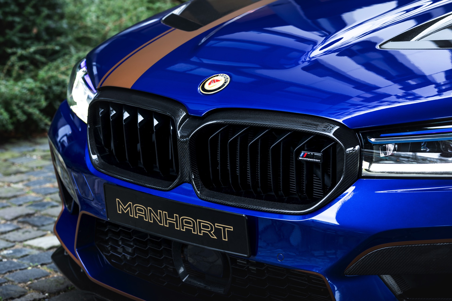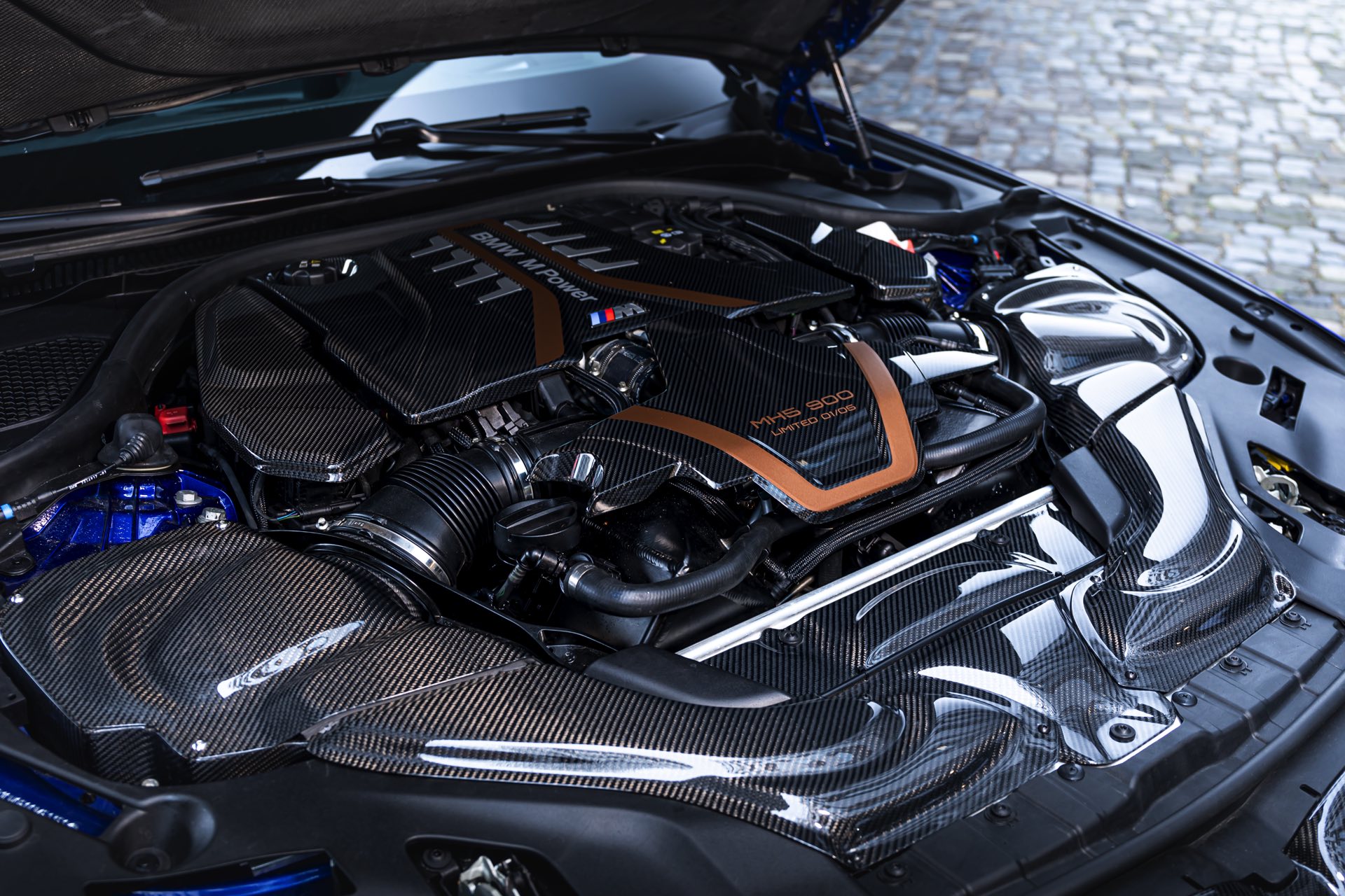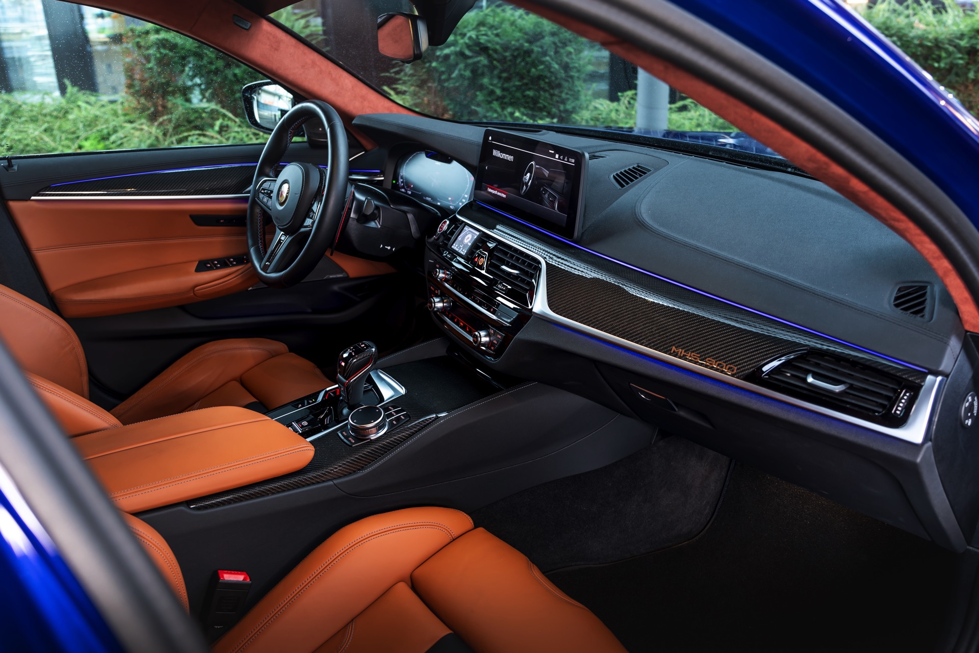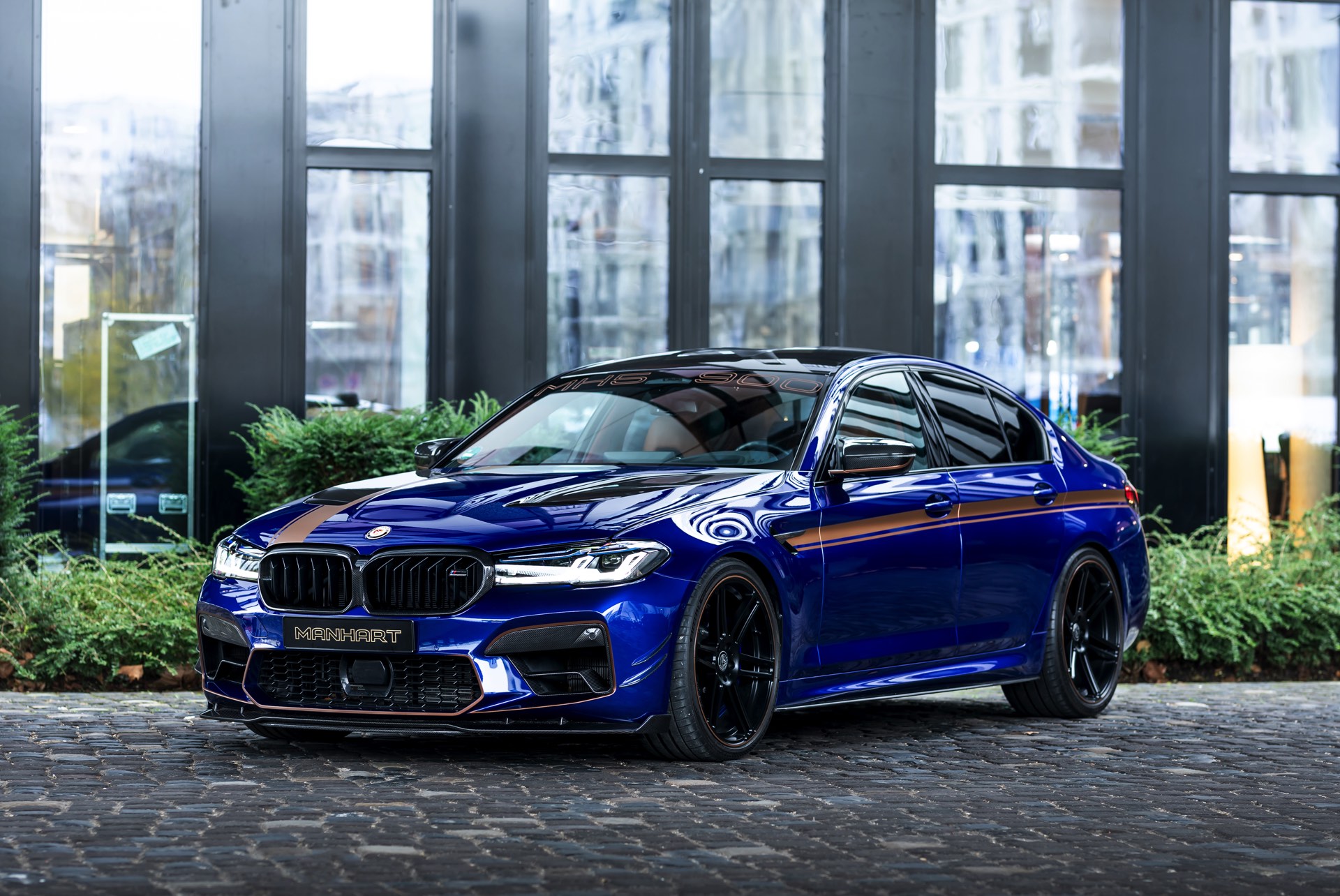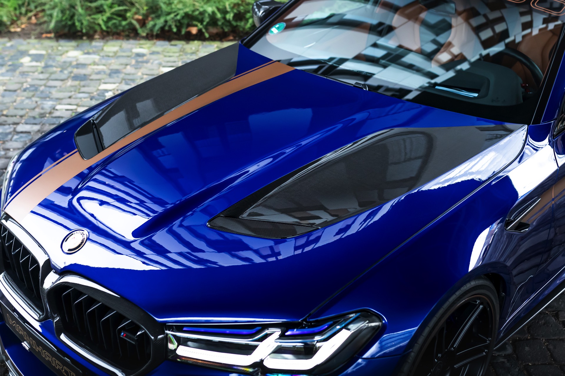 Mit Blick auf die enorme Leistung liegt auf der Hand, dass sich der Manhart MH5 900 01/05 auch einen außergewöhnlichen Auftritt erlauben kann: Die Power-Limousine strotzt vor Carbon-Anbauteilen von der Motorhaube bis zum Diffusor und glänzt zudem mit einer kupferfarbenen Dekor-Beklebung, die einen spannenden Akzent zur tiefblauen Lackierung setzt.
