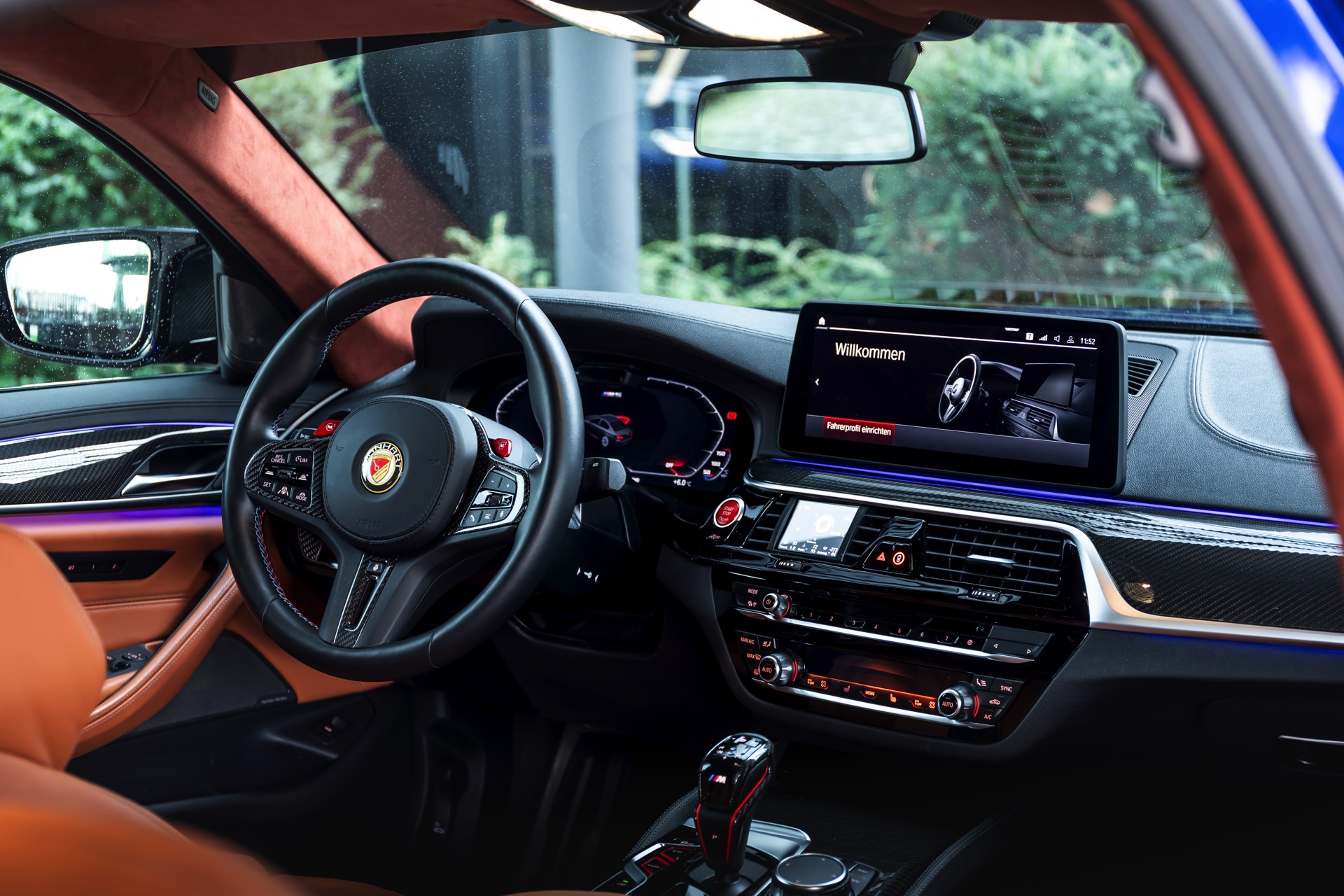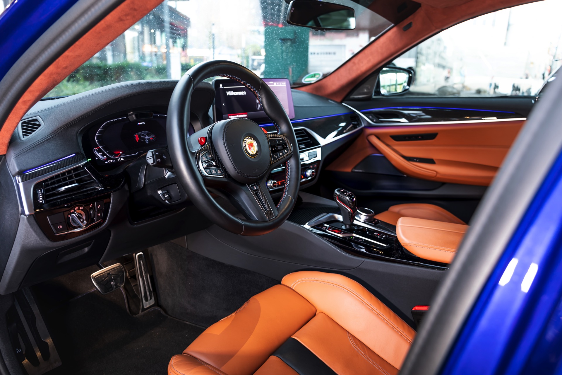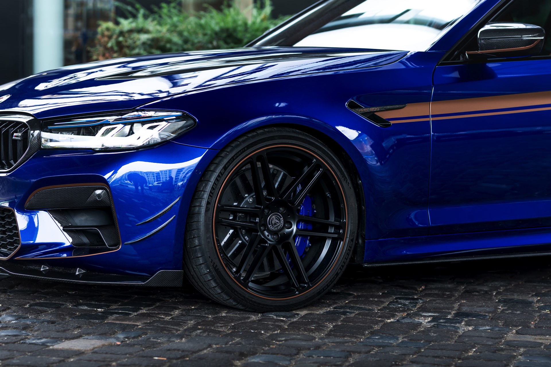 Hinter den 21 Zoll großen Leichtmetallrädern, die dank eines Gewindefahrwerks von KW noch besser zur Geltung kommen, ist eines der wenigen verbliebenen Serien-Bauteile zu sehen: Die M Carbon-Keramik-Bremse hat lediglich eine blaue Lackierung für ihre Bremssättel erhalten, entspricht aber technisch den ab Werk erhältlichen Komponenten.