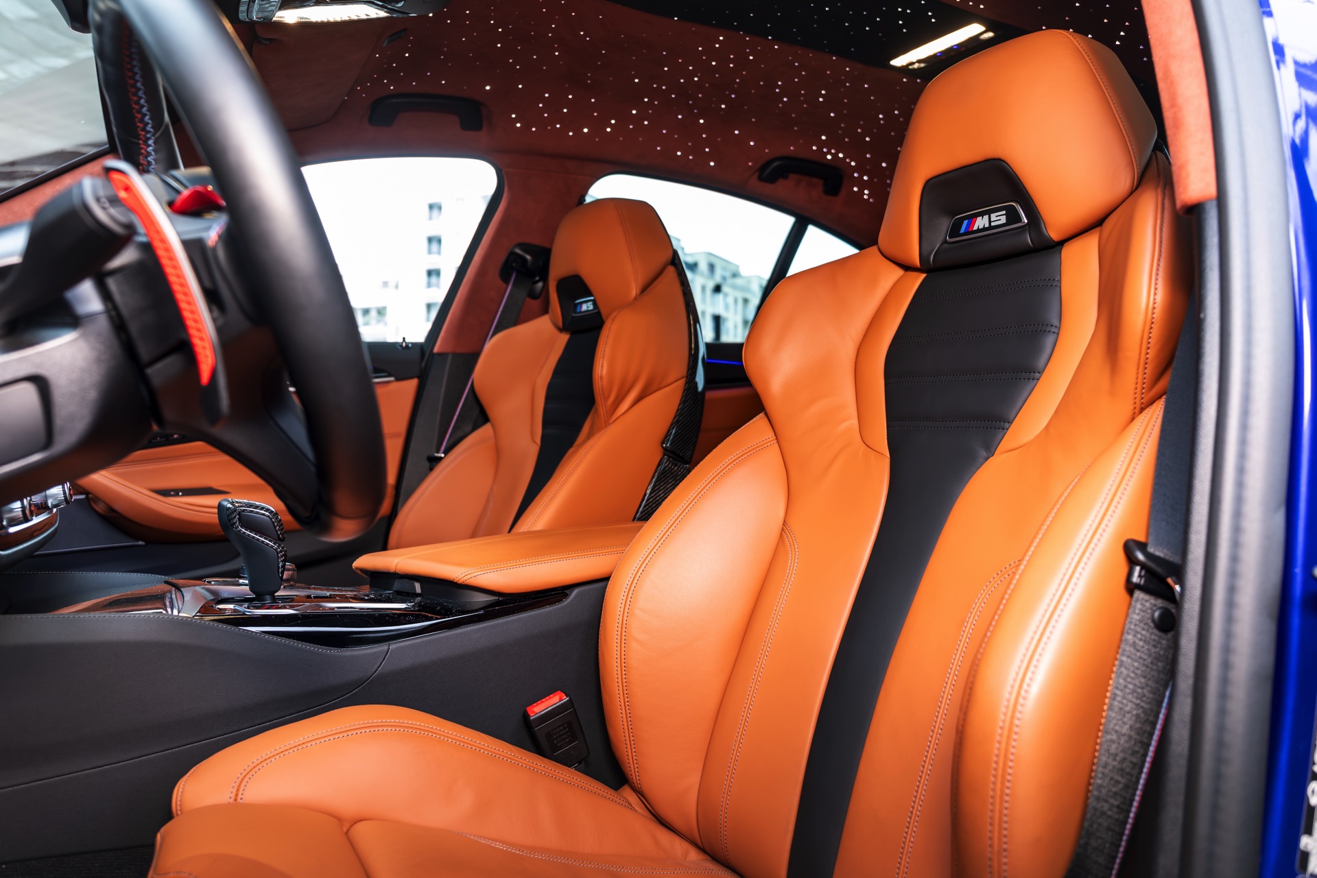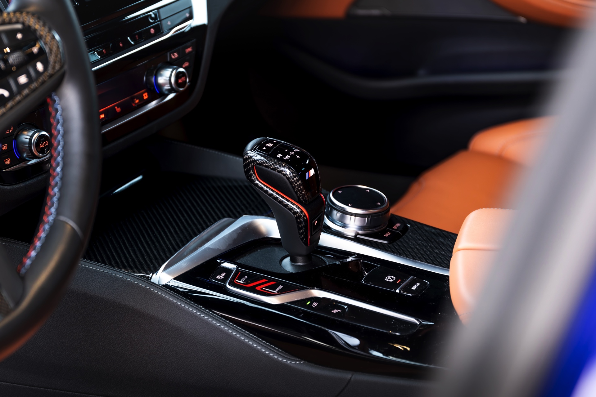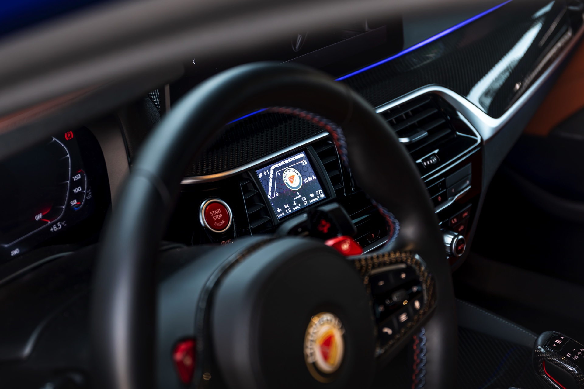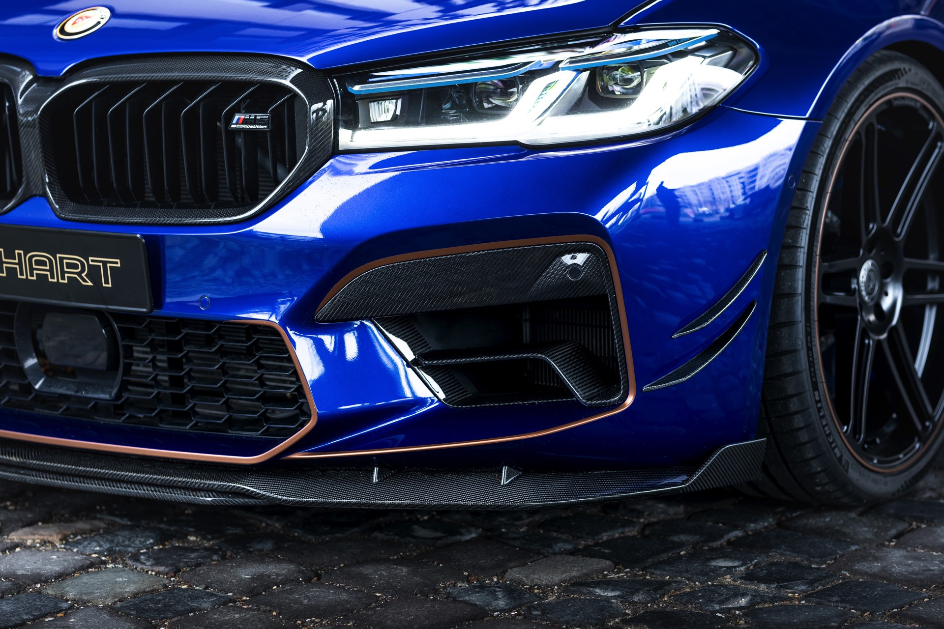 Hinter den 21 Zoll großen Leichtmetallrädern, die dank eines Gewindefahrwerks von KW noch besser zur Geltung kommen, ist eines der wenigen verbliebenen Serien-Bauteile zu sehen: Die M Carbon-Keramik-Bremse hat lediglich eine blaue Lackierung für ihre Bremssättel erhalten, entspricht aber technisch den ab Werk erhältlichen Komponenten.