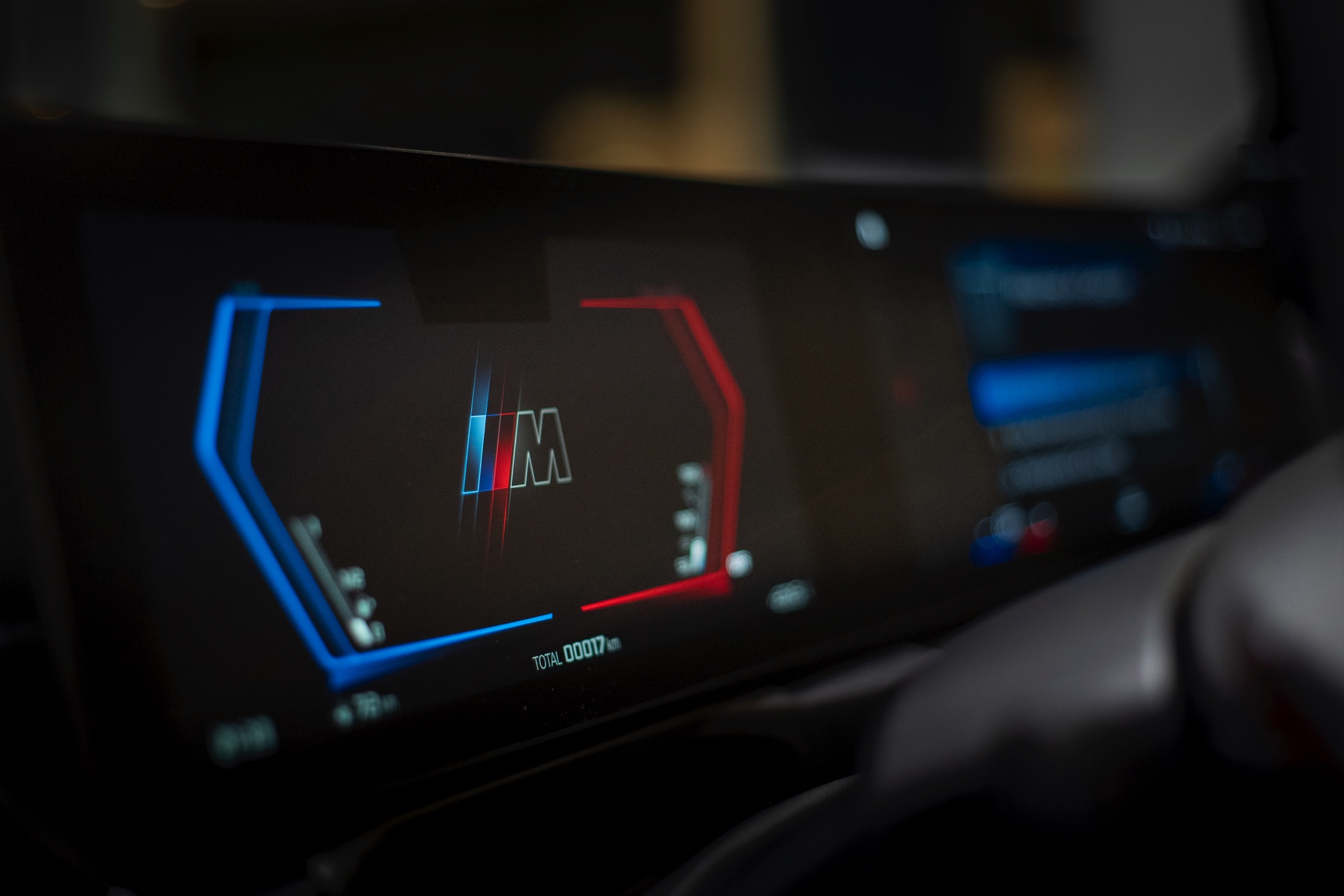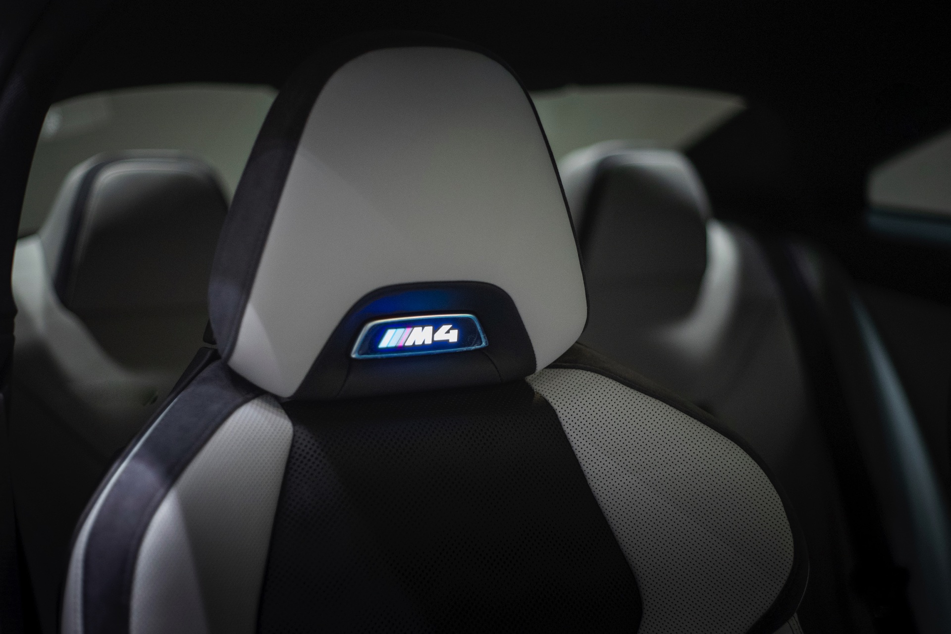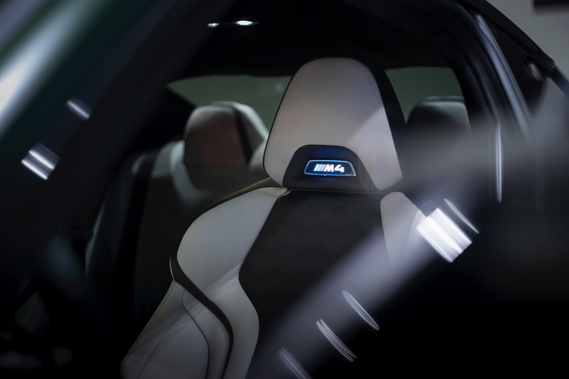 Edel und exklusiv geht es auch im Innenraum zu: Die äußere Lackierung in Frozen Deep Green wird beim gezeigten M4 mit der Bicolor Vollleder-Ausstattung Merino in Silverstone und Schwarz kombiniert, dazu kommen die Interieurleisten ‘Carbon Fibre’. Dass dem M4 Competition volle 125 PS zum M5 CS fehlen, dürfte sich in dieser Umgebung leicht verschmerzen lassen.